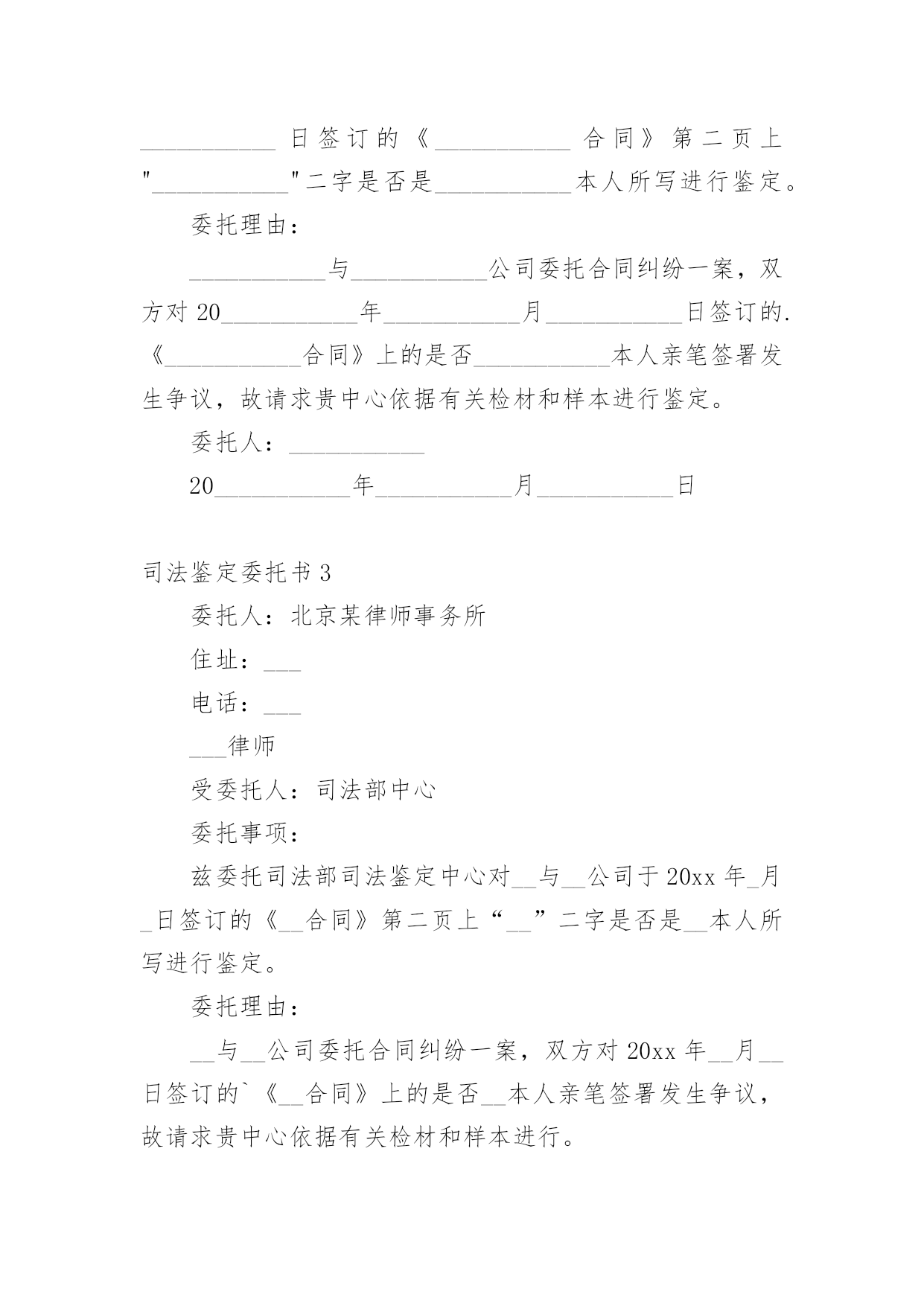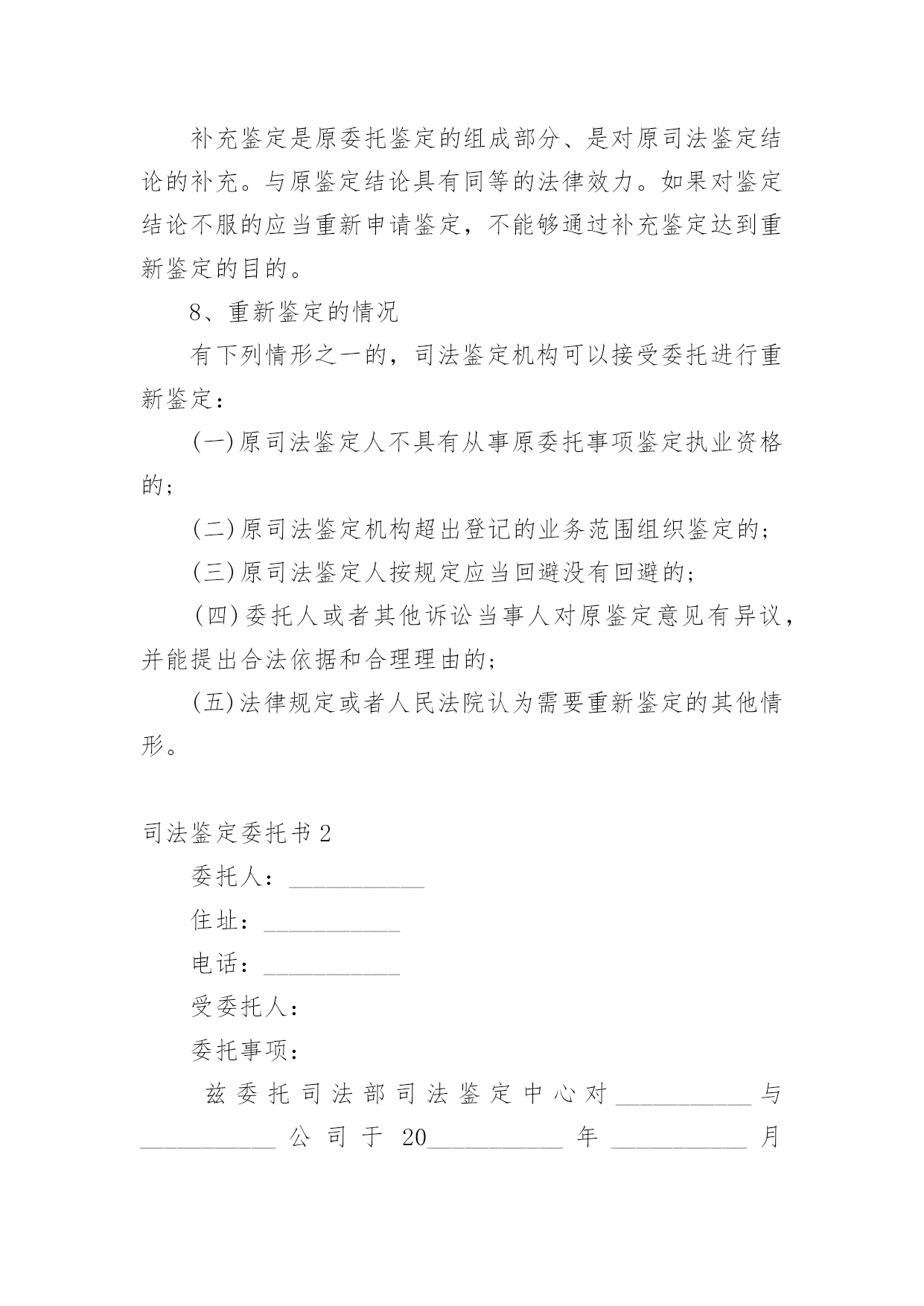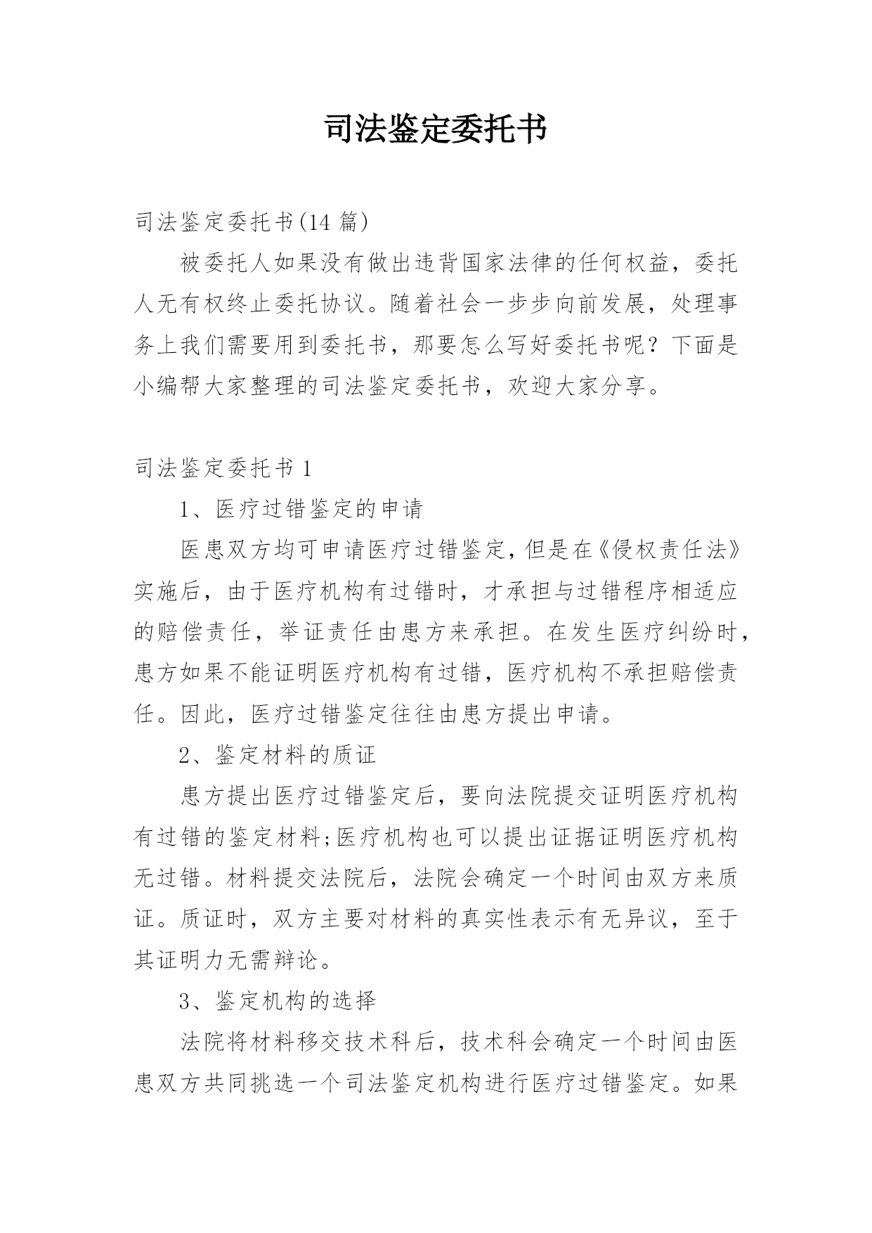 司法鉴定委托书司法鉴定委托书(14篇)被委托人如果没有做出违背国家法律的任何权益,委托人无有权终止委托协议。随着社会一步步向前发展,处理事务上我们需要用到委托书,那要怎么写好委托书呢?下面是小编帮大家整理的司法鉴定委托书,欢迎大家分享。司法鉴定委托书11、医疗过错鉴定的申请医患双方均可申请医疗过错鉴定,但是在《侵权责任法》实施后,由于医疗机构有过错时,才承担与过错程序相适应的赔偿责任,举证责任由患方来承担。在发生医疗纠纷时,患方如果不能证明医疗机构有过错,医疗机构不承担赔偿责任。因此,医疗过错鉴定往往由患方提出申请。2、鉴定材料的质证患方提出医疗过错鉴定后,要向法院提交证明医疗机构有过错的鉴定材料;医疗机构也可以提出证据证明医疗机构无过错。材料提交法院后,法院会确定一个时间由双方来质证。质证时,双方主要对材料的真实性表示有无异议,至于其证明力无需辩论。3、鉴定机构的选择法院将材料移交技术科后,技术科会确定一个时间由医患双方共同挑选一个司法鉴定机构进行医疗过错鉴定。如果医患双方不能达成一致意见,可以通过抽签、摇号的方式来决定鉴定机构。4、鉴定前的听证法院技术科选定鉴定机构后,会将鉴定材料移送鉴定机构,鉴定机构接到鉴定材料后通过审查决定是否受理。鉴定机构决定受理后,在鉴定前会组织医患双方听证会,由医患双方提交材料陈述各自意见。5、鉴定材料的'补充鉴定机构在鉴定过程中,如果认为双方所提交的材料有所遗漏的,可以通知法院要求医患双方提交鉴定所需要的补充材料。法院会通知医患双方提交鉴定所需补充材料,然后经质证后的材料移交技术科,由技术科移送鉴定机构。6、鉴定结果的出具鉴定机构根据医患双方所提交的材料和陈述,组织专家进行鉴定,然后出具司法鉴定书载明医疗机构是否有过错及过错参与度。7、补充鉴定的情况如果在鉴定的过程中,有下列情形之一的,司法鉴定机构可以根据委托人的请求进行补充鉴定:(一)委托人增加新的鉴定要求的;(二)委托人发现委托的鉴定事项有遗漏的;(三)委托人在鉴定过程中又提供或者补充了新的鉴定材料的;(四)其他需要补充鉴定的情形。补充鉴定是原委托鉴定的组成部分、是对原司法鉴定结论的补充。与原鉴定结论具有同等的法律效力。如果对鉴定结论不服的应当重新申请鉴定,不能够通过补充鉴定达到重新鉴定的目的。8、重新鉴定的情况有下列情形之一的,司法鉴定机构可以接受委托进行重新鉴定:(一)原司法鉴定人不具有从事原委托事项鉴定执业资格的;(二)原司法鉴定机构超出登记的业务范围组织鉴定的;(三)原司法鉴定人按规定应当回避没有回避的;(四)委托人或者其他诉讼当事人对原鉴定意见有异议,并能提出合法依据和合理理由的;(五)法律规定或者人民法院认为需要重新鉴定的其他情形。司法鉴定委托书2委托人:___________住址:___________电话:___________受委托人:委托事项:兹委托司法部司法鉴定中心对___________与___________公司于20___________年___________月___________日签订的《___________合同》第二页上"___________"二字是否是___________本人所写进行鉴定。委托理由:___________与___________公司委托合同纠纷一案,双方对20___________年___________月___________日签订的.《___________合同》上的是否___________本人亲笔签署发生争议,故请求贵中心依据有关检材和样本进行鉴定。委托人:___________20___________年___________月___________日司法鉴定委托书3委托人:北京某律师事务所住址:___电话:______律师受委托人:司法部中心委托事项:兹委托司法部司法鉴定中心对__与__公司于20xx年_月_日签订的《__合同》第二页上“__”二字是否是__本人所写进行鉴定。委托理由:__与__公司委托合同纠纷一案,双方对20xx年__月__日签订的`《__合同》上的是否__本人亲笔签署发生争议,故请求贵中心依据有关检材和样本进行。20__年__月__日司法鉴定委托书4编号:_____________________________委托方:_____________________________受托方:_____________________________兹有我单位建筑工程现存在_______________问题,特委托进行鉴定。一、工程概况1、工程名称、见委托鉴定项目清单。2、工程地址、见委托鉴定项目清单。3、建造年份、见委托鉴定项目清单。4、设计单位、见委托鉴定项目清单。5、施工单位、见委托鉴定项目清单。6、建筑面积、层数、见委托鉴定项目清单。7、结构类