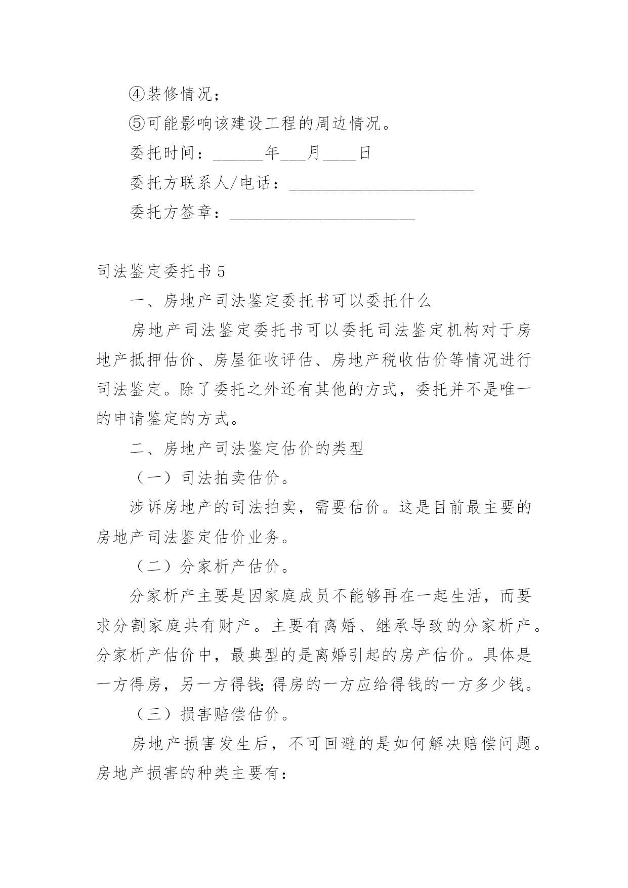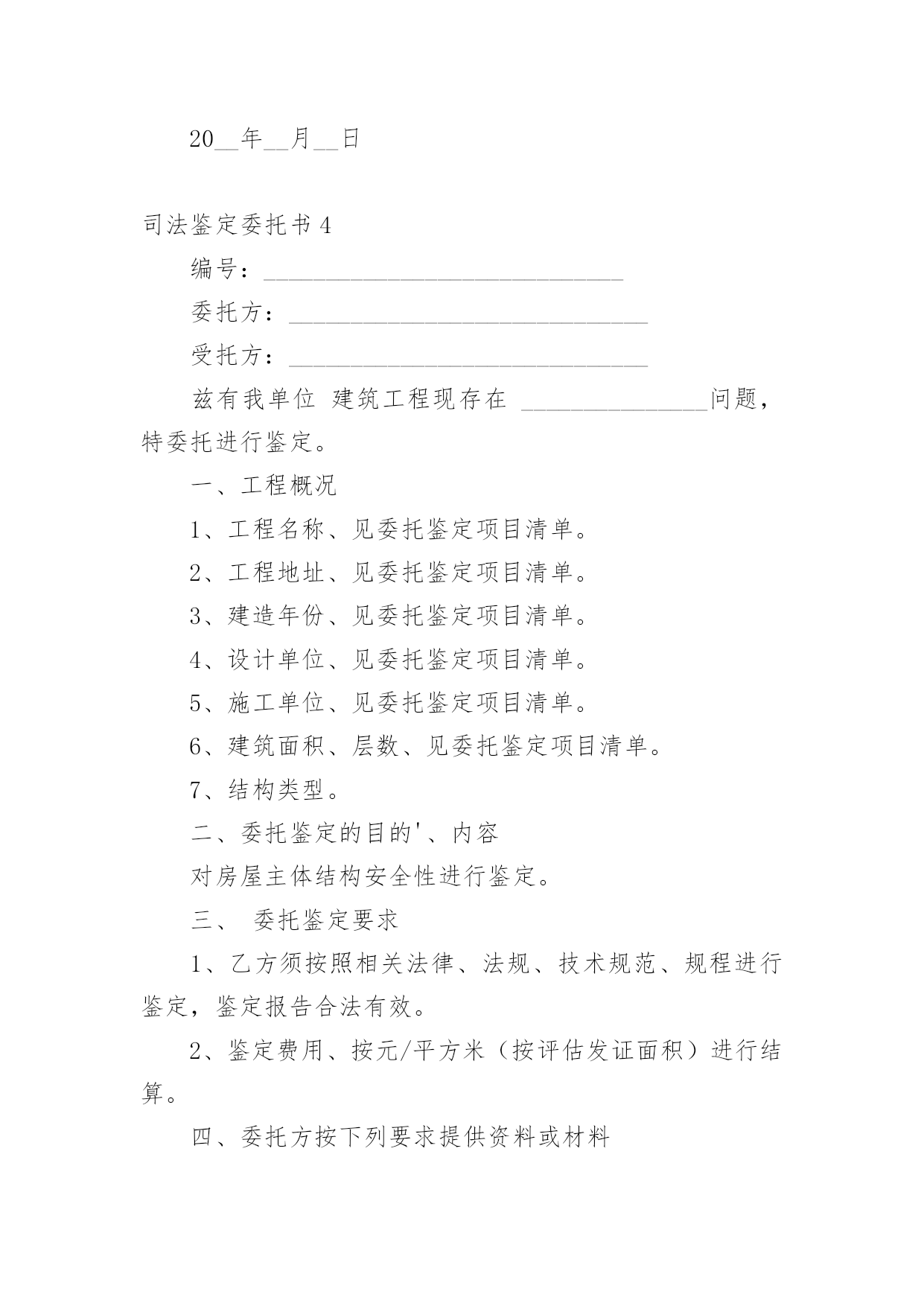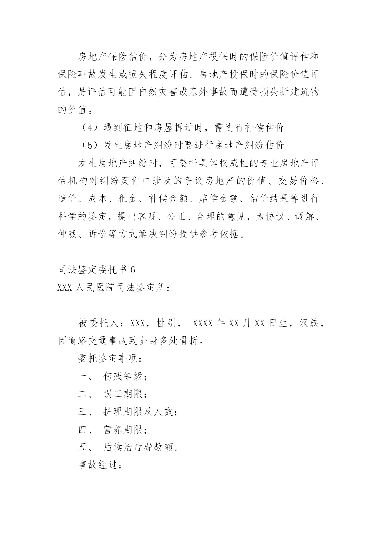 司法鉴定委托书司法鉴定委托书(14篇)被委托人如果没有做出违背国家法律的任何权益,委托人无有权终止委托协议。随着社会一步步向前发展,处理事务上我们需要用到委托书,那要怎么写好委托书呢?下面是小编帮大家整理的司法鉴定委托书,欢迎大家分享。司法鉴定委托书11、医疗过错鉴定的申请医患双方均可申请医疗过错鉴定,但是在《侵权责任法》实施后,由于医疗机构有过错时,才承担与过错程序相适应的赔偿责任,举证责任由患方来承担。在发生医疗纠纷时,患方如果不能证明医疗机构有过错,医疗机构不承担赔偿责任。因此,医疗过错鉴定往往由患方提出申请。2、鉴定材料的质证患方提出医疗过错鉴定后,要向法院提交证明医疗机构有过错的鉴定材料;医疗机构也可以提出证据证明医疗机构无过错。材料提交法院后,法院会确定一个时间由双方来质证。质证时,双方主要对材料的真实性表示有无异议,至于其证明力无需辩论。3、鉴定机构的选择法院将材料移交技术科后,技术科会确定一个时间由医患双方共同挑选一个司法鉴定机构进行医疗过错鉴定。如果医患双方不能达成一致意见,可以通过抽签、摇号的方式来决定鉴定机构。4、鉴定前的听证法院技术科选定鉴定机构后,会将鉴定材料移送鉴定机构,鉴定机构接到鉴定材料后通过审查决定是否受理。鉴定机构决定受理后,在鉴定前会组织医患双方听证会,由医患双方提交材料陈述各自意见。5、鉴定材料的'补充鉴定机构在鉴定过程中,如果认为双方所提交的材料有所遗漏的,可以通知法院要求医患双方提交鉴定所需要的补充材料。法院会通知医患双方提交鉴定所需补充材料,然后经质证后的材料移交技术科,由技术科移送鉴定机构。6、鉴定结果的出具鉴定机构根据医患双方所提交的材料和陈述,组织专家进行鉴定,然后出具司法鉴定书载明医疗机构是否有过错及过错参与度。7、补充鉴定的情况如果在鉴定的过程中,有下列情形之一的,司法鉴定机构可以根据委托人的请求进行补充鉴定:(一)委托人增加新的鉴定要求的;(二)委托人发现委托的鉴定事项有遗漏的;(三)委托人在鉴定过程中又提供或者补充了新的鉴定材料的;(四)其他需要补充鉴定的情形。补充鉴定是原委托鉴定的组成部分、是对原司法鉴定结论的补充。与原鉴定结论具有同等的法律效力。如果对鉴定结论不服的应当重新申请鉴定,不能够通过补充鉴定达到重新鉴定的目的。8、重新鉴定的情况有下列情形之一的,司法鉴定机构可以接受委托进行重新鉴定:(一)原司法鉴定人不具有从事原委托事项鉴定执业资格的;(二)原司法鉴定机构超出登记的业务范围组织鉴定的;(三)原司法鉴定人按规定应当回避没有回避的;(四)委托人或者其他诉讼当事人对原鉴定意见有异议,并能提出合法依据和合理理由的;(五)法律规定或者人民法院认为需要重新鉴定的其他情形。司法鉴定委托书2委托人:___________住址:___________电话:___________受委托人:委托事项:兹委托司法部司法鉴定中心对___________与___________公司于20___________年___________月___________日签订的《___________合同》第二页上"___________"二字是否是___________本人所写进行鉴定。委托理由:___________与___________公司委托合同纠纷一案,双方对20___________年___________月___________日签订的.《___________合同》上的是否___________本人亲笔签署发生争议,故请求贵中心依据有关检材和样本进行鉴定。委托人:___________20___________年___________月___________日司法鉴定委托书3委托人:北京某律师事务所住址:___电话:______律师受委托人:司法部中心委托事项:兹委托司法部司法鉴定中心对__与__公司于20xx年_月_日签订的《__合同》第二页上“__”二字是否是__本人所写进行鉴定。委托理由:__与__公司委托合同纠纷一案,双方对20xx年__月__日签订的`《__合同》上的是否__本人亲笔签署发生争议,故请求贵中心依据有关检材和样本进行。20__年__月__日司法鉴定委托书4编号:_____________________________委托方:_____________________________受托方:_____________________________兹有我单位建筑工程现存在_______________问题,特委托进行鉴定。一、工程概况1、工程名称、见委托鉴定项目清单。2、工程地址、见委托鉴定项目清单。3、建造年份、见委托鉴定项目清单。4、设计单位、见委托鉴定项目清单。5、施工单位、见委托鉴定项目清单。6、建筑面积、层数、见委托鉴定项目清单。7、结构类