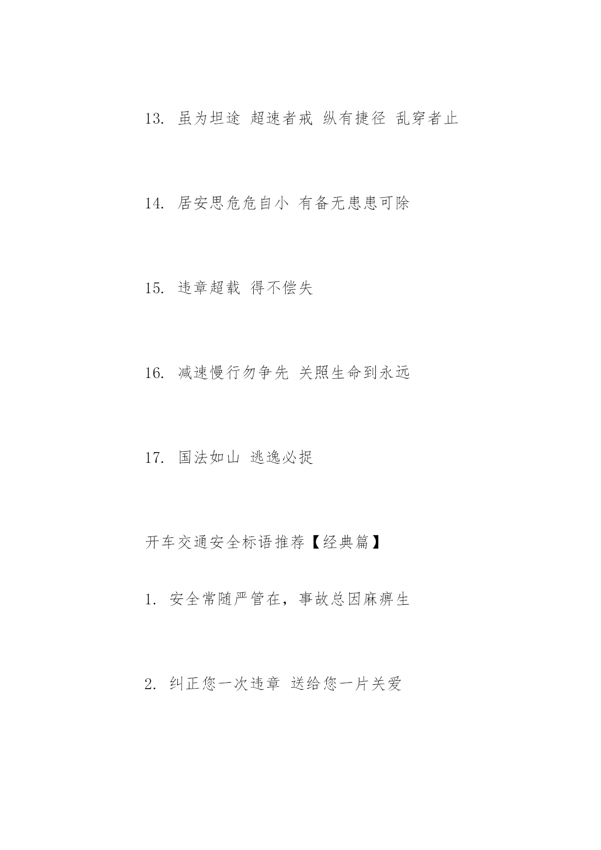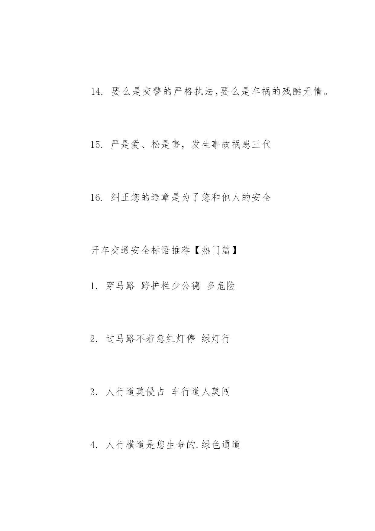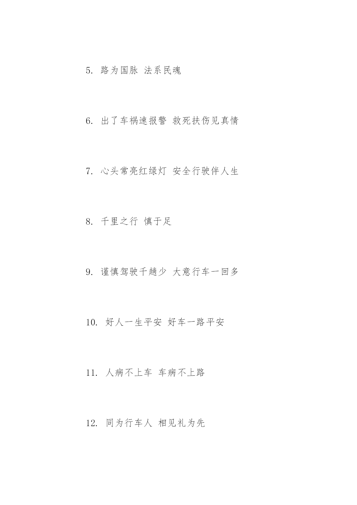 开车交通安全标语开车交通安全标语推荐心头常亮红绿灯,安全行驶伴人生。以下是小编精心整理的开车交通安全标语推荐,希望大家喜欢!开车交通安全标语推荐【精选篇】1.十次肇事九次快摩托车族当自爱2.醉(罪)在酒中毁(悔)在杯中3.酒后驾车生命打折4.酒后开车先醉人后坠车5.酒后驾车拿命赌博6.有酒即无舵早晚要闯祸7.大路朝天请走右边8.两车相遇,请油门松一松、刹车带一带、方向驾一把9.道路连着你我他安全系着千万家10.反违章防事故大家共走平安路11.遵守交通规则,安全伴你到永远。12.朋友,为了您和他人的幸福,理解交警的严格吧!13.要交警事事宽容你吗?死神可对谁都不客气!14.要么是交警的严格执法,要么是车祸的残酷无情。15.严是爱、松是害,发生事故祸患三代16.纠正您的违章是为了您和他人的安全开车交通安全标语推荐【热门篇】1.穿马路跨护栏少公德多危险2.过马路不着急红灯停绿灯行3.人行道莫侵占车行道人莫闯4.人行横道是您生命的.绿色通道5.路为国脉法系民魂6.出了车祸速报警救死扶伤见真情7.心头常亮红绿灯安全行驶伴人生8.千里之行慎于足9.谨慎驾驶千趟少大意行车一回多10.好人一生平安好车一路平安11.人病不上车车病不上路12.同为行车人相见礼为先13.虽为坦途超速者戒纵有捷径乱穿者止14.居安思危危自小有备无患患可除15.违章超载得不偿失16.减速慢行勿争先关照生命到永远17.国法如山逃逸必捉开车交通安全标语推荐【经典篇】1.安全常随严管在,事故总因麻痹生2.纠正您一次违章送给您一片关爱3.处罚违章不留情看似无情最深情4.见了违章严批评道是无情却有情5.为了您和他人的幸福,请自觉遵守交通法规。6.守法的人以教训换流血,违法的人以流血换教训7.不开争气斗强车争做礼让文明人8.开车守规矩安全万里行9.道路万千条安全第一条10.法规在心中安全在手中11.路无规不畅国无法不宁12.一秒钟车祸,一辈子痛苦13.司机同志,请把握好你生命的时速和方向盘14.司机同志,你我后半生握在你手中警示式15.疲劳驾车酿事故精力充沛保平安16.疲劳驾车等于方向失灵17.驾乘二轮摩托车,别忘了戴好安全头盔骑摩托走天下戴上头盔更潇洒