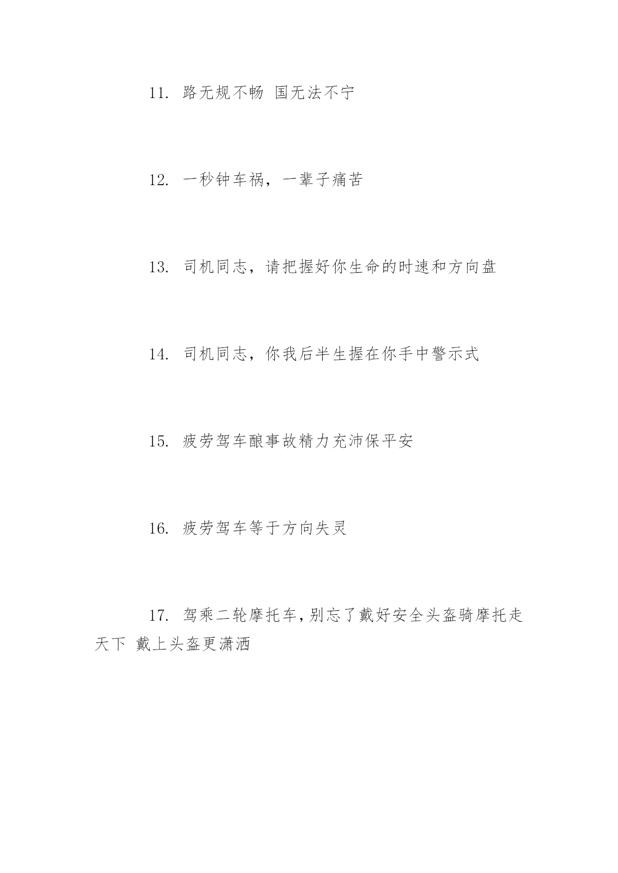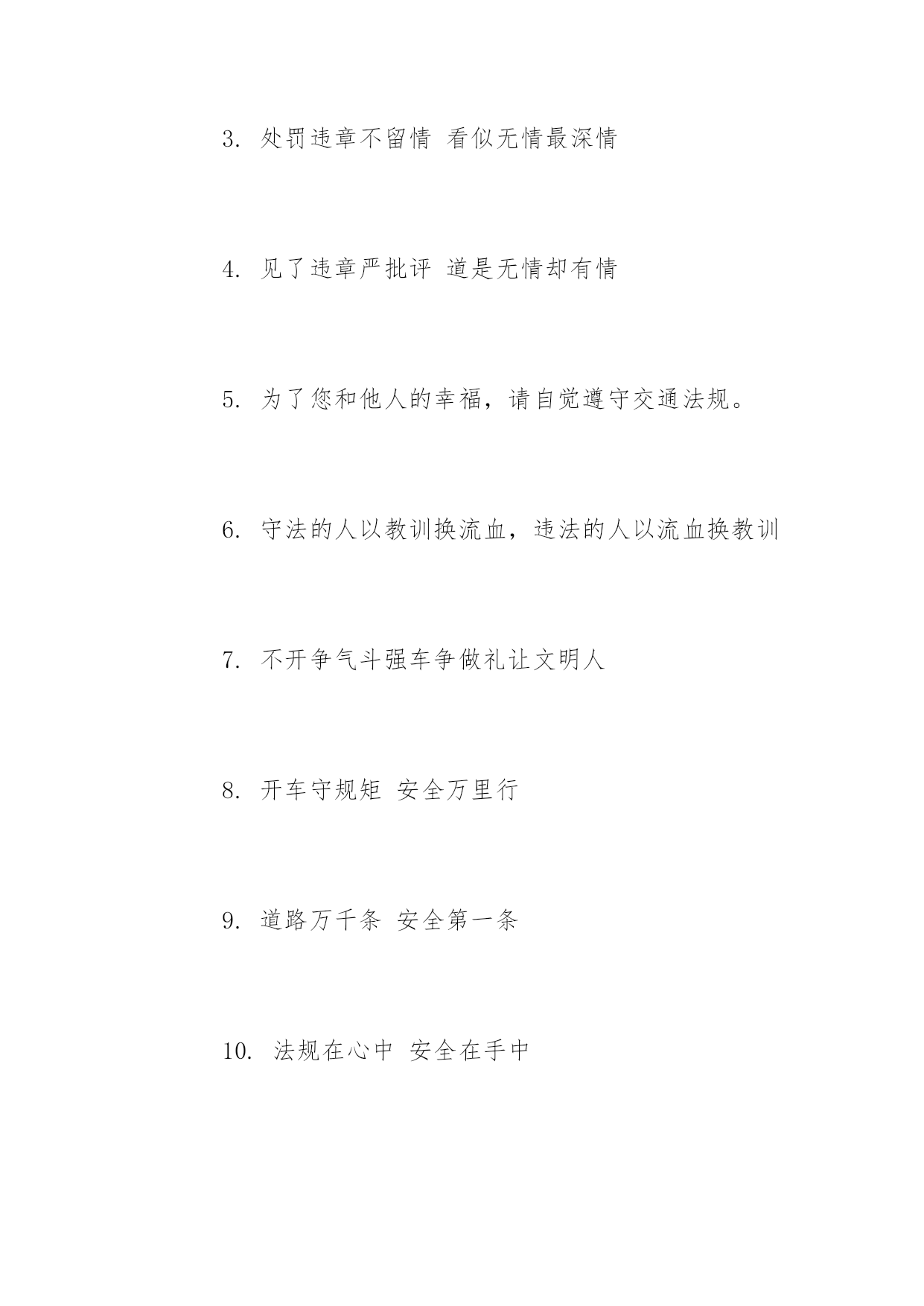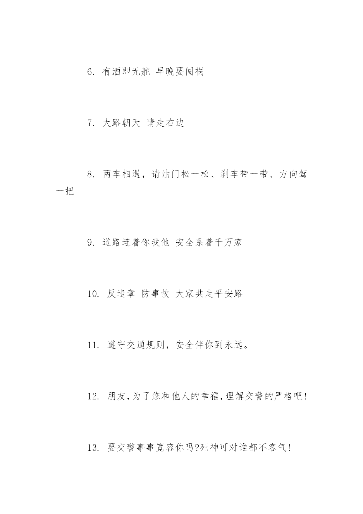 开车交通安全标语开车交通安全标语推荐心头常亮红绿灯,安全行驶伴人生。以下是小编精心整理的开车交通安全标语推荐,希望大家喜欢!开车交通安全标语推荐【精选篇】1.十次肇事九次快摩托车族当自爱2.醉(罪)在酒中毁(悔)在杯中3.酒后驾车生命打折4.酒后开车先醉人后坠车5.酒后驾车拿命赌博6.有酒即无舵早晚要闯祸7.大路朝天请走右边8.两车相遇,请油门松一松、刹车带一带、方向驾一把9.道路连着你我他安全系着千万家10.反违章防事故大家共走平安路11.遵守交通规则,安全伴你到永远。12.朋友,为了您和他人的幸福,理解交警的严格吧!13.要交警事事宽容你吗?死神可对谁都不客气!14.要么是交警的严格执法,要么是车祸的残酷无情。15.严是爱、松是害,发生事故祸患三代16.纠正您的违章是为了您和他人的安全开车交通安全标语推荐【热门篇】1.穿马路跨护栏少公德多危险2.过马路不着急红灯停绿灯行3.人行道莫侵占车行道人莫闯4.人行横道是您生命的.绿色通道5.路为国脉法系民魂6.出了车祸速报警救死扶伤见真情7.心头常亮红绿灯安全行驶伴人生8.千里之行慎于足9.谨慎驾驶千趟少大意行车一回多10.好人一生平安好车一路平安11.人病不上车车病不上路12.同为行车人相见礼为先13.虽为坦途超速者戒纵有捷径乱穿者止14.居安思危危自小有备无患患可除15.违章超载得不偿失16.减速慢行勿争先关照生命到永远17.国法如山逃逸必捉开车交通安全标语推荐【经典篇】1.安全常随严管在,事故总因麻痹生2.纠正您一次违章送给您一片关爱3.处罚违章不留情看似无情最深情4.见了违章严批评道是无情却有情5.为了您和他人的幸福,请自觉遵守交通法规。6.守法的人以教训换流血,违法的人以流血换教训7.不开争气斗强车争做礼让文明人8.开车守规矩安全万里行9.道路万千条安全第一条10.法规在心中安全在手中11.路无规不畅国无法不宁12.一秒钟车祸,一辈子痛苦13.司机同志,请把握好你生命的时速和方向盘14.司机同志,你我后半生握在你手中警示式15.疲劳驾车酿事故精力充沛保平安16.疲劳驾车等于方向失灵17.驾乘二轮摩托车,别忘了戴好安全头盔骑摩托走天下戴上头盔更潇洒