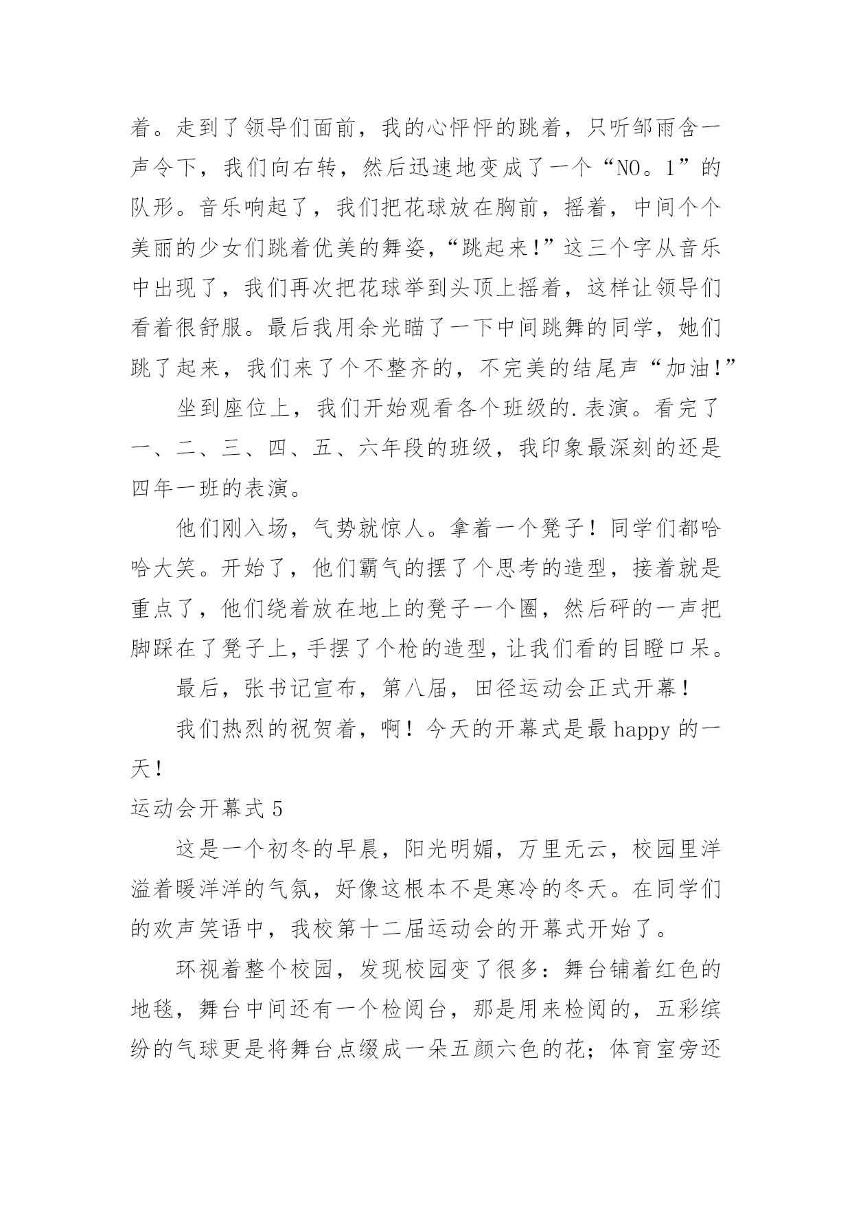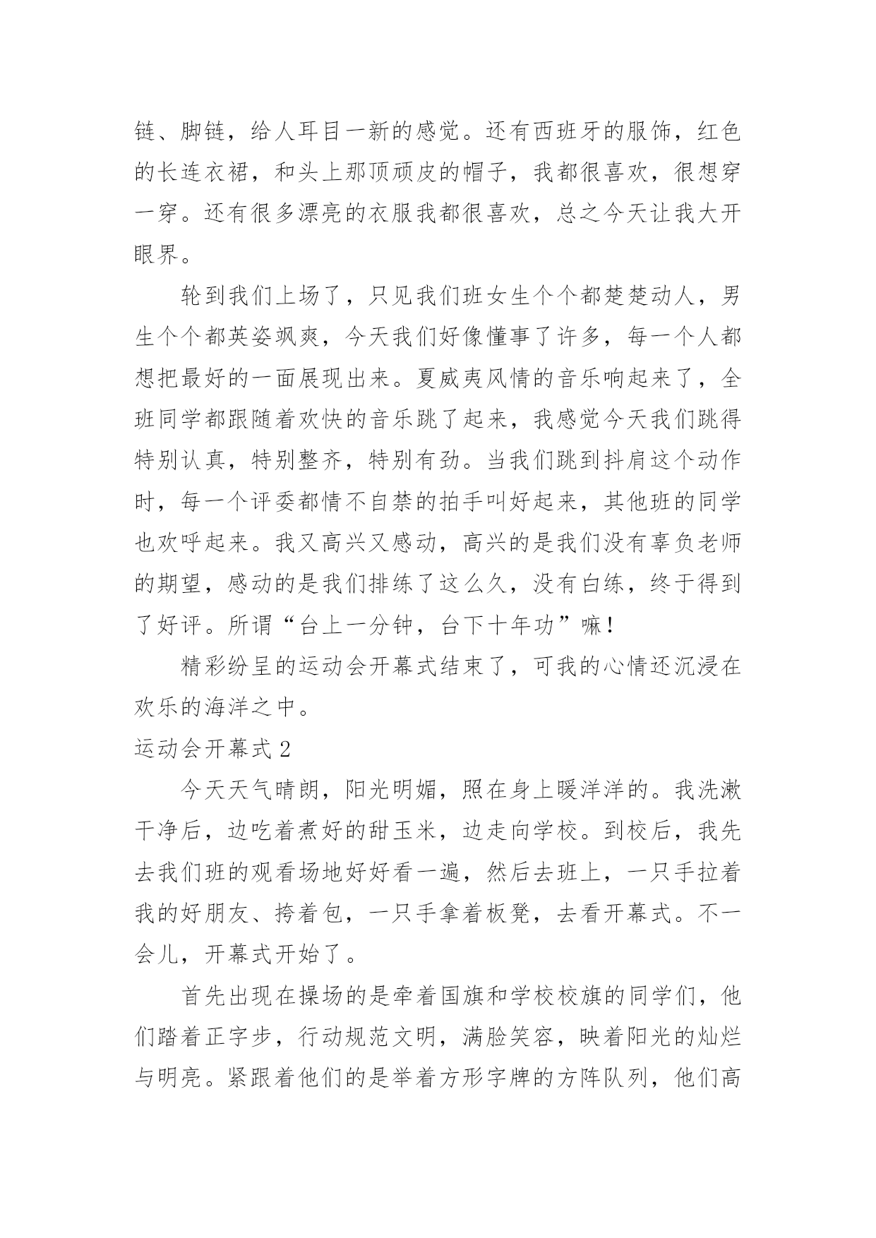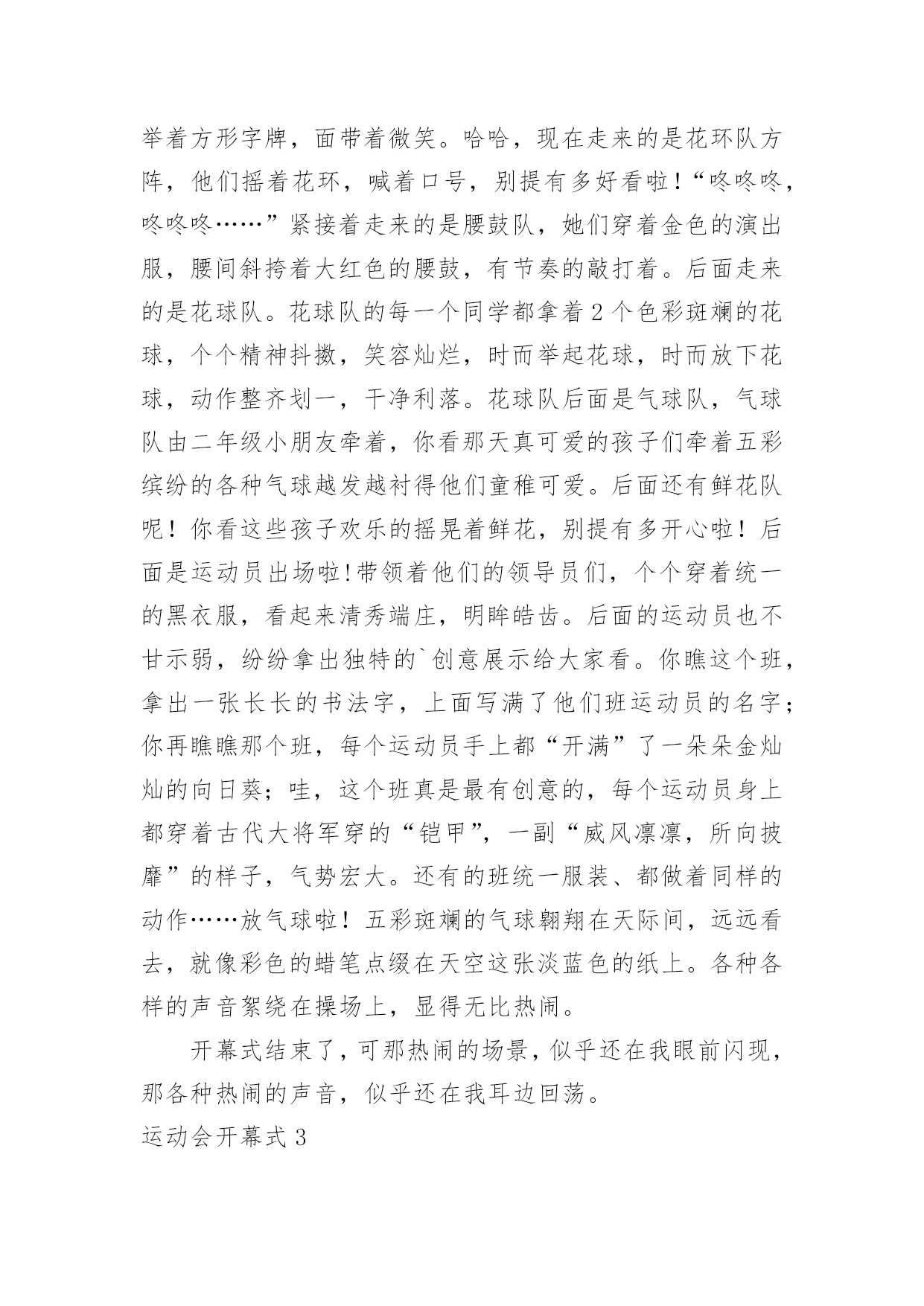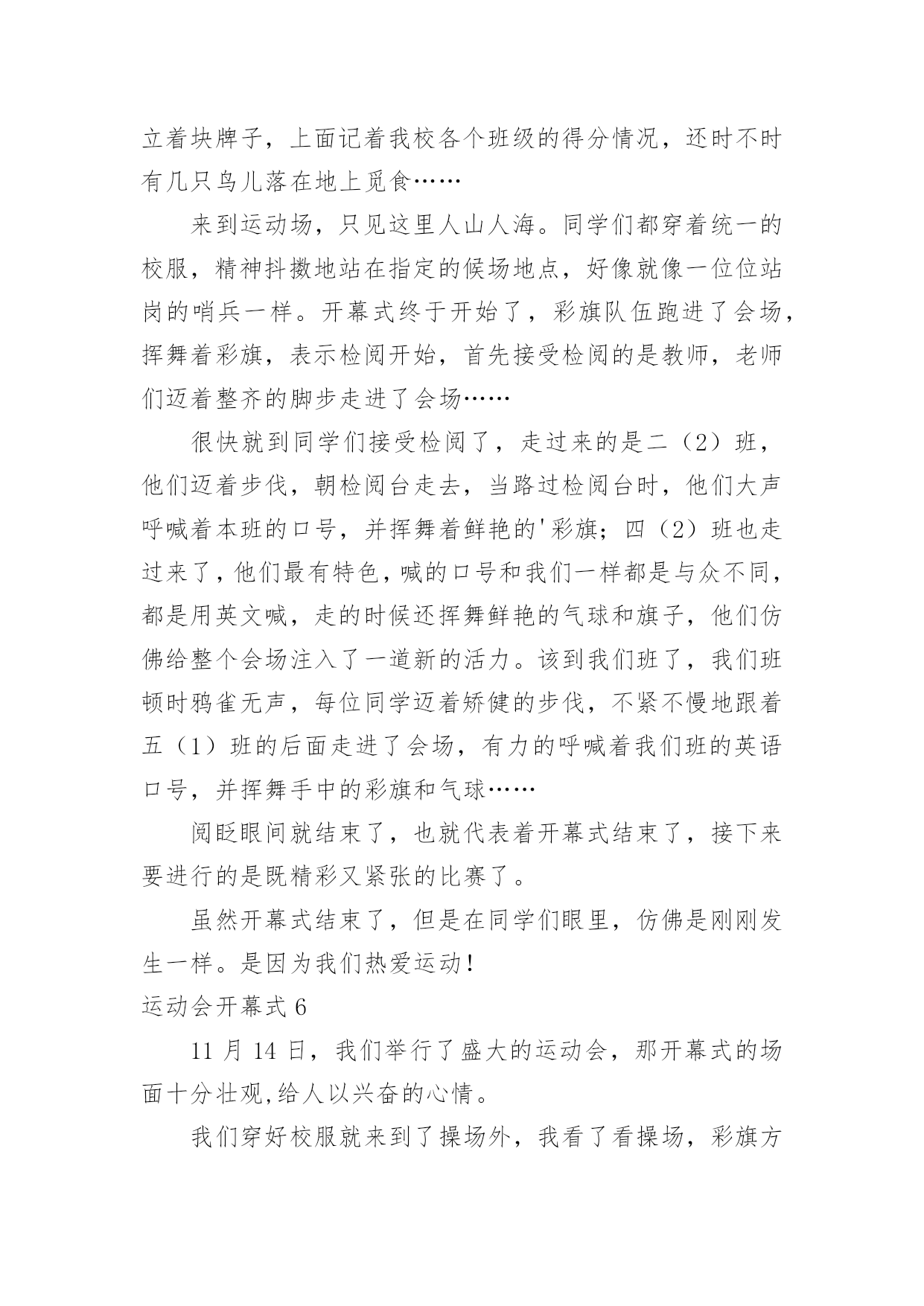 运动会开幕式运动会开幕式运动会开幕式1我们学校的运动会在万物复苏的春天开幕啦!今天的开幕式非常好看,既新颖又独特,全校三十多个班级,每个班都代表一个国家,都身着各个国家的服饰。我们班代表的是夏威夷。今天我们打扮得特别漂亮。女生身着露肚花吊带衫,下身着金色草裙,男生穿椰树图案T恤和同样图案的短裤,化着淡妆,每个人都比平常漂亮了很多,你看着我,我看着你,每个人都兴奋极了,准备工作做好后,我们排着整齐的队伍在篮球场等候。8:30分,开幕式正式开始了,只见四个大哥哥分别拉着国旗的一角,伴随着威武雄壮的乐曲,迈着整齐的步伐走向主席台,既庄严又帅气。接下来是从六年级开始的大检阅了,各种各样美丽的服饰,以及在主席台前各种各样的舞蹈,使人眼花缭乱,让人大饱眼福。顿时,篮球场“焕然一新”,成了花的.海洋,掌声,欢笑声,此起彼伏地响彻在校园的上空。漂亮的服饰太多了,最吸引我的是印度服饰,从头上披到腰的红纱巾,闪着金光的红色衣裤,以及美丽的头饰、手链、脚链,给人耳目一新的感觉。还有西班牙的服饰,红色的长连衣裙,和头上那顶顽皮的帽子,我都很喜欢,很想穿一穿。还有很多漂亮的衣服我都很喜欢,总之今天让我大开眼界。轮到我们上场了,只见我们班女生个个都楚楚动人,男生个个都英姿飒爽,今天我们好像懂事了许多,每一个人都想把最好的一面展现出来。夏威夷风情的音乐响起来了,全班同学都跟随着欢快的音乐跳了起来,我感觉今天我们跳得特别认真,特别整齐,特别有劲。当我们跳到抖肩这个动作时,每一个评委都情不自禁的拍手叫好起来,其他班的同学也欢呼起来。我又高兴又感动,高兴的是我们没有辜负老师的期望,感动的是我们排练了这么久,没有白练,终于得到了好评。所谓“台上一分钟,台下十年功”嘛!精彩纷呈的运动会开幕式结束了,可我的心情还沉浸在欢乐的海洋之中。运动会开幕式2今天天气晴朗,阳光明媚,照在身上暖洋洋的。我洗漱干净后,边吃着煮好的甜玉米,边走向学校。到校后,我先去我们班的观看场地好好看一遍,然后去班上,一只手拉着我的好朋友、挎着包,一只手拿着板凳,去看开幕式。不一会儿,开幕式开始了。首先出现在操场的是牵着国旗和学校校旗的同学们,他们踏着正字步,行动规范文明,满脸笑容,映着阳光的灿烂与明亮。紧跟着他们的是举着方形字牌的方阵队列,他们高举着方形字牌,面带着微笑。哈哈,现在走来的是花环队方阵,他们摇着花环,喊着口号,别提有多好看啦!“咚咚咚,咚咚咚……”紧接着走来的是腰鼓队,她们穿着金色的演出服,腰间斜挎着大红色的腰鼓,有节奏的敲打着。后面走来的是花球队。花球队的每一个同学都拿着2个色彩斑斓的花球,个个精神抖擞,笑容灿烂,时而举起花球,时而放下花球,动作整齐划一,干净利落。花球队后面是气球队,气球队由二年级小朋友牵着,你看那天真可爱的孩子们牵着五彩缤纷的各种气球越发越衬得他们童稚可爱。后面还有鲜花队呢!你看这些孩子欢乐的摇晃着鲜花,别提有多开心啦!后面是运动员出场啦!带领着他们的领导员们,个个穿着统一的黑衣服,看起来清秀端庄,明眸皓齿。后面的运动员也不甘示弱,纷纷拿出独特的`创意展示给大家看。你瞧这个班,拿出一张长长的书法字,上面写满了他们班运动员的名字;你再瞧瞧那个班,每个运动员手上都“开满”了一朵朵金灿灿的向日葵;哇,这个班真是最有创意的,每个运动员身上都穿着古代大将军穿的“铠甲”,一副“威风凛凛,所向披靡”的样子,气势宏大。还有的班统一服装、都做着同样的动作……放气球啦!五彩斑斓的气球翱翔在天际间,远远看去,就像彩色的蜡笔点缀在天空这张淡蓝色的纸上。各种各样的声音絮绕在操场上,显得无比热闹。开幕式结束了,可那热闹的场景,似乎还在我眼前闪现,那各种热闹的声音,似乎还在我耳边回荡。运动会开幕式310月26日上午,我怀着激动的心情,和学校队伍一起到体育场参加“20xx年汉滨区中小学生田径运动会”的开幕式。走进体育场看台,听到刚劲有力的运动员进行曲,我的心情激动万分,整个会场上欢呼声,尖叫声响成一片。终于,在大家的翘首期盼下,田径运动会开幕式拉开了帷幕!首先,主持人宣布代表方阵和各代表队入场。顿时,会场上彩旗飘飘,仪仗队庄严地走进了会场;紧跟着的是花环队,看,同学们手举着五颜六色的花环上下抖动,为开幕式增添了绚丽的色彩;第三个进场的`是培新小学的鼓号队,他们身穿黄色的服装,头戴羽毛帽,一边走一边奏出欢快的乐章,真的可以称得上是整个运动会场上一道亮丽的风景线啊!接着,各个小学的代表队伍雄赳赳,气昂昂的迈着坚定的步伐陆续走上了会场,他们嘴里喊着:“相信我们,一定能赢!”的口号,终于我们学校的运动员代表队走过来了,他们斗志昂扬,信心百倍,从他们的精神状态中我看到了他们的决心,我相信他们一定会做到:挑战自我,超越梦想,团结协作,共创佳绩!庄严的升旗仪式开始了,我们全体起立,脱帽行礼,国旗在《义勇
