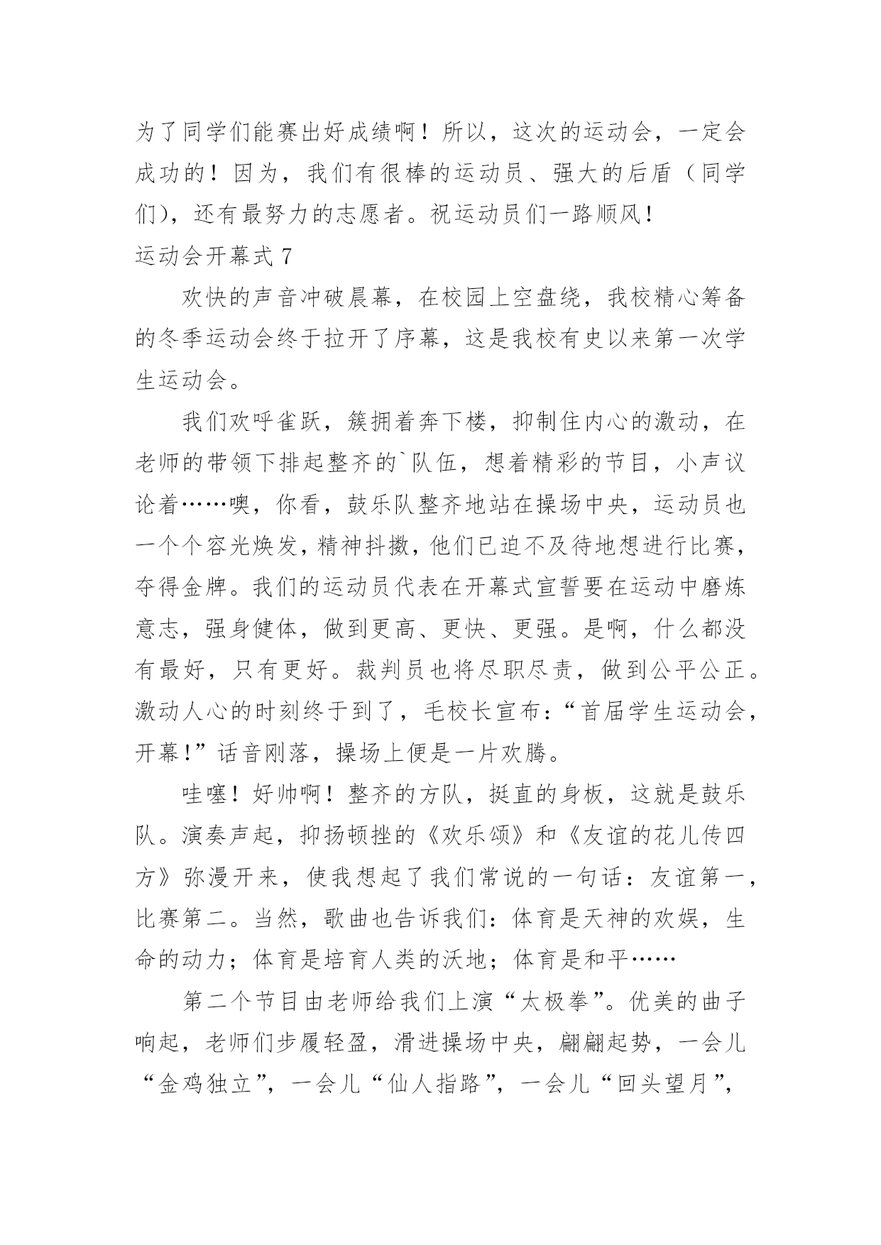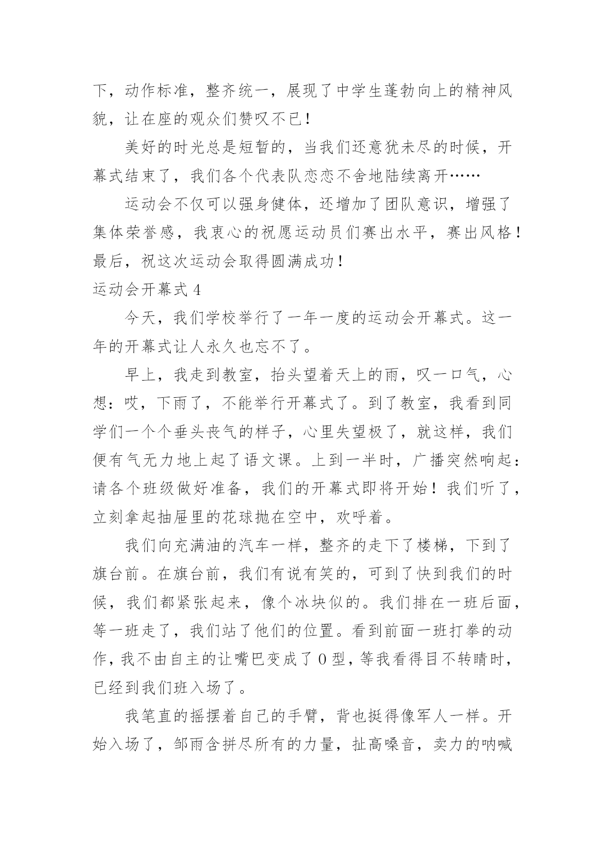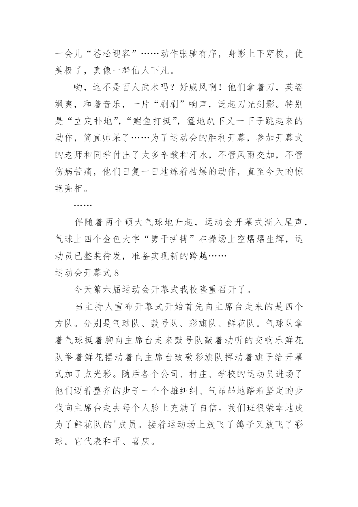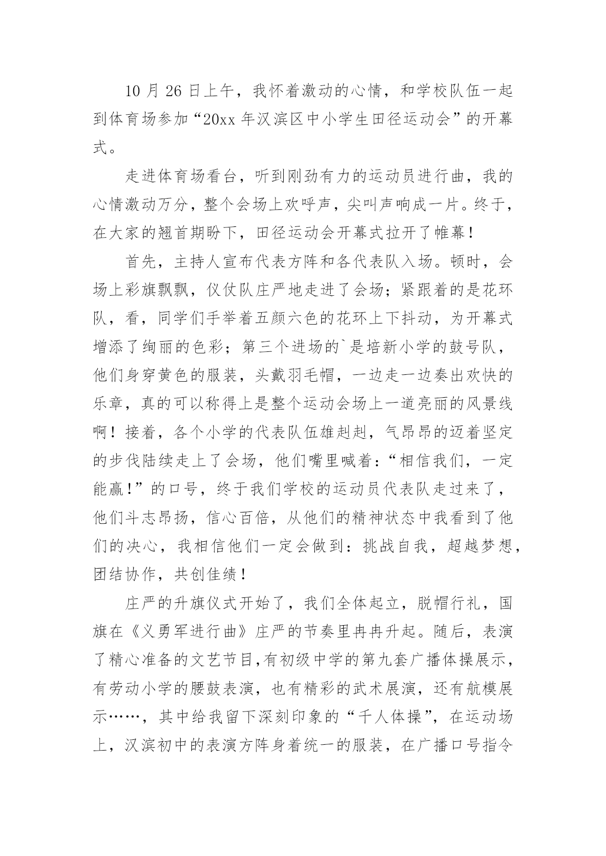 运动会开幕式运动会开幕式运动会开幕式1我们学校的运动会在万物复苏的春天开幕啦!今天的开幕式非常好看,既新颖又独特,全校三十多个班级,每个班都代表一个国家,都身着各个国家的服饰。我们班代表的是夏威夷。今天我们打扮得特别漂亮。女生身着露肚花吊带衫,下身着金色草裙,男生穿椰树图案T恤和同样图案的短裤,化着淡妆,每个人都比平常漂亮了很多,你看着我,我看着你,每个人都兴奋极了,准备工作做好后,我们排着整齐的队伍在篮球场等候。8:30分,开幕式正式开始了,只见四个大哥哥分别拉着国旗的一角,伴随着威武雄壮的乐曲,迈着整齐的步伐走向主席台,既庄严又帅气。接下来是从六年级开始的大检阅了,各种各样美丽的服饰,以及在主席台前各种各样的舞蹈,使人眼花缭乱,让人大饱眼福。顿时,篮球场“焕然一新”,成了花的.海洋,掌声,欢笑声,此起彼伏地响彻在校园的上空。漂亮的服饰太多了,最吸引我的是印度服饰,从头上披到腰的红纱巾,闪着金光的红色衣裤,以及美丽的头饰、手链、脚链,给人耳目一新的感觉。还有西班牙的服饰,红色的长连衣裙,和头上那顶顽皮的帽子,我都很喜欢,很想穿一穿。还有很多漂亮的衣服我都很喜欢,总之今天让我大开眼界。轮到我们上场了,只见我们班女生个个都楚楚动人,男生个个都英姿飒爽,今天我们好像懂事了许多,每一个人都想把最好的一面展现出来。夏威夷风情的音乐响起来了,全班同学都跟随着欢快的音乐跳了起来,我感觉今天我们跳得特别认真,特别整齐,特别有劲。当我们跳到抖肩这个动作时,每一个评委都情不自禁的拍手叫好起来,其他班的同学也欢呼起来。我又高兴又感动,高兴的是我们没有辜负老师的期望,感动的是我们排练了这么久,没有白练,终于得到了好评。所谓“台上一分钟,台下十年功”嘛!精彩纷呈的运动会开幕式结束了,可我的心情还沉浸在欢乐的海洋之中。运动会开幕式2今天天气晴朗,阳光明媚,照在身上暖洋洋的。我洗漱干净后,边吃着煮好的甜玉米,边走向学校。到校后,我先去我们班的观看场地好好看一遍,然后去班上,一只手拉着我的好朋友、挎着包,一只手拿着板凳,去看开幕式。不一会儿,开幕式开始了。首先出现在操场的是牵着国旗和学校校旗的同学们,他们踏着正字步,行动规范文明,满脸笑容,映着阳光的灿烂与明亮。紧跟着他们的是举着方形字牌的方阵队列,他们高举着方形字牌,面带着微笑。哈哈,现在走来的是花环队方阵,他们摇着花环,喊着口号,别提有多好看啦!“咚咚咚,咚咚咚……”紧接着走来的是腰鼓队,她们穿着金色的演出服,腰间斜挎着大红色的腰鼓,有节奏的敲打着。后面走来的是花球队。花球队的每一个同学都拿着2个色彩斑斓的花球,个个精神抖擞,笑容灿烂,时而举起花球,时而放下花球,动作整齐划一,干净利落。花球队后面是气球队,气球队由二年级小朋友牵着,你看那天真可爱的孩子们牵着五彩缤纷的各种气球越发越衬得他们童稚可爱。后面还有鲜花队呢!你看这些孩子欢乐的摇晃着鲜花,别提有多开心啦!后面是运动员出场啦!带领着他们的领导员们,个个穿着统一的黑衣服,看起来清秀端庄,明眸皓齿。后面的运动员也不甘示弱,纷纷拿出独特的`创意展示给大家看。你瞧这个班,拿出一张长长的书法字,上面写满了他们班运动员的名字;你再瞧瞧那个班,每个运动员手上都“开满”了一朵朵金灿灿的向日葵;哇,这个班真是最有创意的,每个运动员身上都穿着古代大将军穿的“铠甲”,一副“威风凛凛,所向披靡”的样子,气势宏大。还有的班统一服装、都做着同样的动作……放气球啦!五彩斑斓的气球翱翔在天际间,远远看去,就像彩色的蜡笔点缀在天空这张淡蓝色的纸上。各种各样的声音絮绕在操场上,显得无比热闹。开幕式结束了,可那热闹的场景,似乎还在我眼前闪现,那各种热闹的声音,似乎还在我耳边回荡。运动会开幕式310月26日上午,我怀着激动的心情,和学校队伍一起到体育场参加“20xx年汉滨区中小学生田径运动会”的开幕式。走进体育场看台,听到刚劲有力的运动员进行曲,我的心情激动万分,整个会场上欢呼声,尖叫声响成一片。终于,在大家的翘首期盼下,田径运动会开幕式拉开了帷幕!首先,主持人宣布代表方阵和各代表队入场。顿时,会场上彩旗飘飘,仪仗队庄严地走进了会场;紧跟着的是花环队,看,同学们手举着五颜六色的花环上下抖动,为开幕式增添了绚丽的色彩;第三个进场的`是培新小学的鼓号队,他们身穿黄色的服装,头戴羽毛帽,一边走一边奏出欢快的乐章,真的可以称得上是整个运动会场上一道亮丽的风景线啊!接着,各个小学的代表队伍雄赳赳,气昂昂的迈着坚定的步伐陆续走上了会场,他们嘴里喊着:“相信我们,一定能赢!”的口号,终于我们学校的运动员代表队走过来了,他们斗志昂扬,信心百倍,从他们的精神状态中我看到了他们的决心,我相信他们一定会做到:挑战自我,超越梦想,团结协作,共创佳绩!庄严的升旗仪式开始了,我们全体起立,脱帽行礼,国旗在《义勇