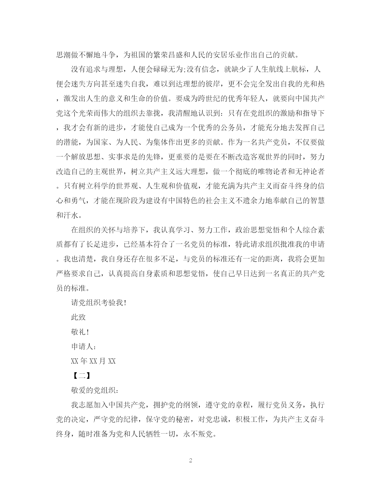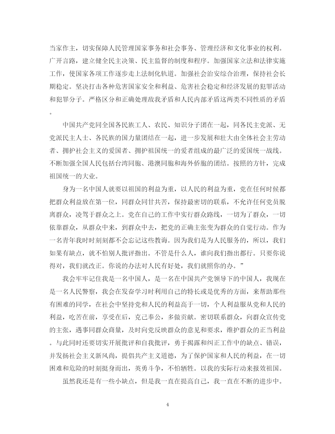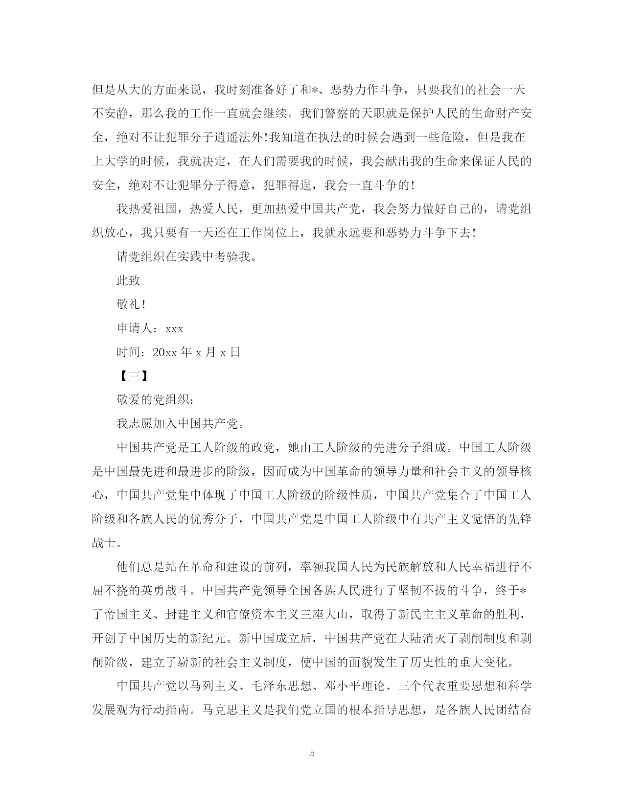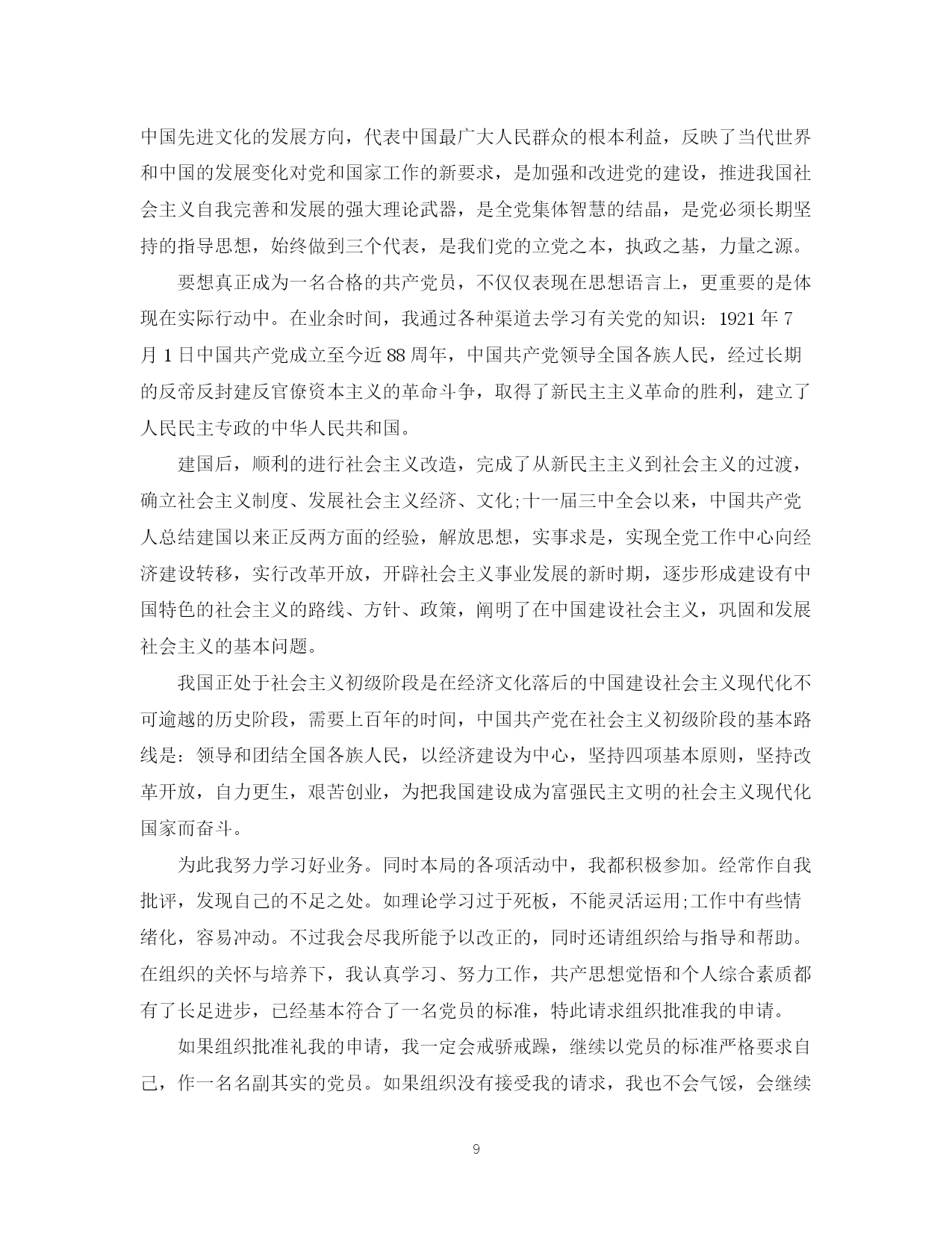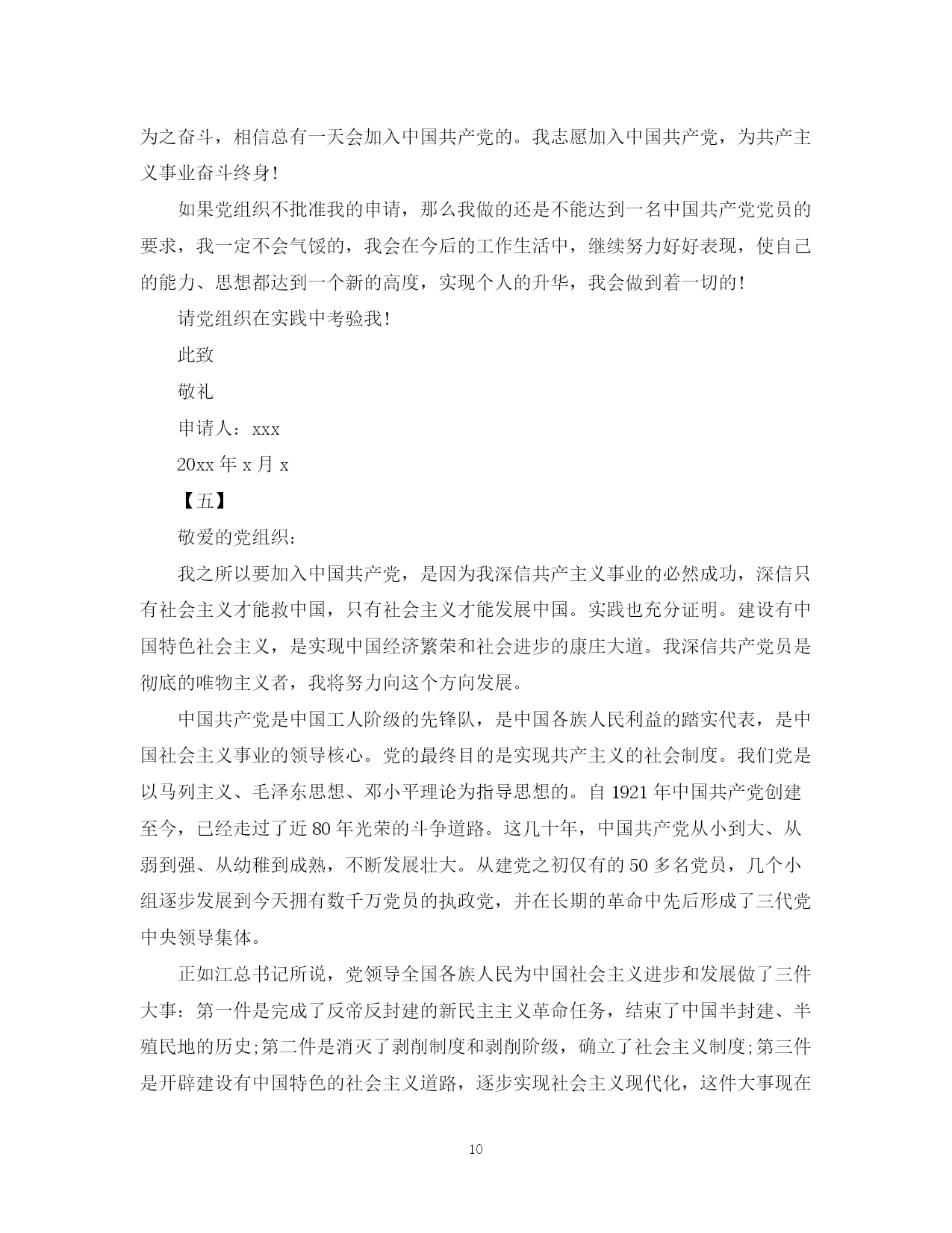 此资料由网络收集而来,如有侵权请告知上传者立即删除。资料共分享,我们负责传递知识。PAGEPAGE11公务员入党申请2000字【五篇】【一】敬爱的党组织:中国共产党从她成立之日起,一直忠实代表工人阶级和各族人民的根本利益,全心全意为人民服务;它具有远见卓识,能把握社会历史发展的客观规律;她具有严密的组织性和纪律性,能够坚韧不拔地团结奋斗;具有实事求是、走群众路线、开展批评和自我批评等优良传统和作风;善于总结和吸取经验教训,不断解放思想,勇于创新,开创社会主义现代化建设的新局面。实践证明:中国共产党是一个伟大、光荣、正确的党。只有坚持中国共产党的领导,才能实现社会主义现代化,才能充分调动全国人民的积极性,才能保证改革和现代化建设的社会主义性质,才能保证现代化建设有一个安定团结的政治环境,才能将改革和开放逐步推向深入,才能真正将我国建设成为独立、民主、富强的社会主义国家,才能最终实现我们的崇高理想——共产主义。中国共产党员,不仅仅象征着崇高的荣誉,更重要的是能够为年轻人指明今后正确的奋斗道路方向,使他们在党的摇篮里健康快乐地成长。但我也深深地知道,要想真正成为一名合格的共产党员,不仅仅表现在思想语言上,更重要的是体现在实际行动中。于是我将自己的决心融入到每一天里。平时我经常同党员谈心交流思想,使自己能够在正确的引导下更快的成长。在不断追求思想进步的同时,我时刻记得自己还是一名学生,不会忘记学习的重要性。我知道共产党员只有精通自身的业务,才能在群众中起到良好的模范带头作用。为此我努力学习好各门学科,在班级和学校组织的各项活动中,积极培养自己的综合素质。我还经常作自我批评,并发现自己身上的不足之处。如理论学习不够灵活、工作中有些情绪化、政治理论水平不高、工作方法比较简单等。不过我会尽我所能予以改正的,同时还请组织给与指导和帮助。自从我提出申请之日起,我在心中已将自己交给了党,我愿在日常的学习和工作中严格要求自己,做好党交给的工作,接受党的各种考验,我愿在社会主义建设中锻炼自己,和一切反党、*主义思潮做不懈地斗争,为祖国的繁荣昌盛和人民的安居乐业作出自己的贡献。没有追求与理想,人便会碌碌无为;没有信念,就缺少了人生航线上航标,人便会迷失方向甚至迷失自我,难以到达理想的彼岸,更不会完全发出自我的光和热,激发出人生的意义和生命的价值。要成为跨世纪的优秀年轻人,就要向中国共产党这个光荣而伟大的组织去靠拢,我清醒地认识到:只有在党组织的激励和指导下,我才会有新的进步,才能使自己成为一个优秀的公务员,才能充分地去发挥自己的潜能,为国家、为人民、为集体作出更多的贡献。作为一名共产党员,不仅要做一个解放思想、实事求是的先锋,更重要的是要在不断改造客观世界的同时,努力改造自己的主观世界,树立共产主义远大理想,做一个彻底的唯物论者和无神论者。只有树立科学的世界观、人生观和价值观,才能充满为共产主义而奋斗终身的信心和勇气,才能在现阶段为建设有中国特色的社会主义不遗余力地奉献自己的智慧和汗水。在组织的关怀与培养下,我认真学习、努力工作,政治思想觉悟和个人综合素质都有了长足进步,已经基本符合了一名党员的标准,特此请求组织批准我的申请。我也清楚,我自身还存在很多不足,与党员的标准还有一定的距离,我将会更加严格要求自己,认真提高自身素质和思想觉悟,使自己早日达到一名真正的共产党员的标准。请党组织考验我!此致敬礼!申请人:XX年XX月XX【二】敬爱的党组织:我志愿加入中国共产党,拥护党的纲领,遵守党的章程,履行党员义务,执行党的决定,严守党的纪律,保守党的秘密,对党忠诚,积极工作,为共产主义奋斗终身,随时准备为党和人民牺牲一切,永不叛党。现在的我已经是一名人民警察了,在我儿时的梦想就是做一名中国共产党党员和人民警察,现在的我已经实现一个梦想了,我现在就准备实现我儿时的另一个梦想,那就是加入中国共产党,做一名正式党员。在我上学的时候,我在班里都是前几名,我在高中毕业的时候,我的高考成绩本可以报考很好的重点大学,可是我会报的,我的梦想就是想上警官学院,结果我如愿以偿,我顺利的通过了警官学院的考察,我成为一名正式的警官学院大学生了。在毕业后我如愿的成为一名人民警察了。中国共产党是中国工人阶级的先锋队,是中国各族民利益的忠实代表,是中国社会主义事业的领导核心。党的最终目标,是实现共产主义的社会制度。马克思列宁主义揭示了人类社会历史发展的普遍规律,分析了资本主义制度本身无法克服的固有矛盾,指社会主义社会必然代替资本主义社会、最后必然发展为共产主义社会。《共产党宣言》发表一百多年来的历证明,科学社会主义理论是正确的,社会主义具有强大的生命力。社会主义的本质,是解放生产力,发展生力,消灭剥削,消除两极分化,最终达到共同