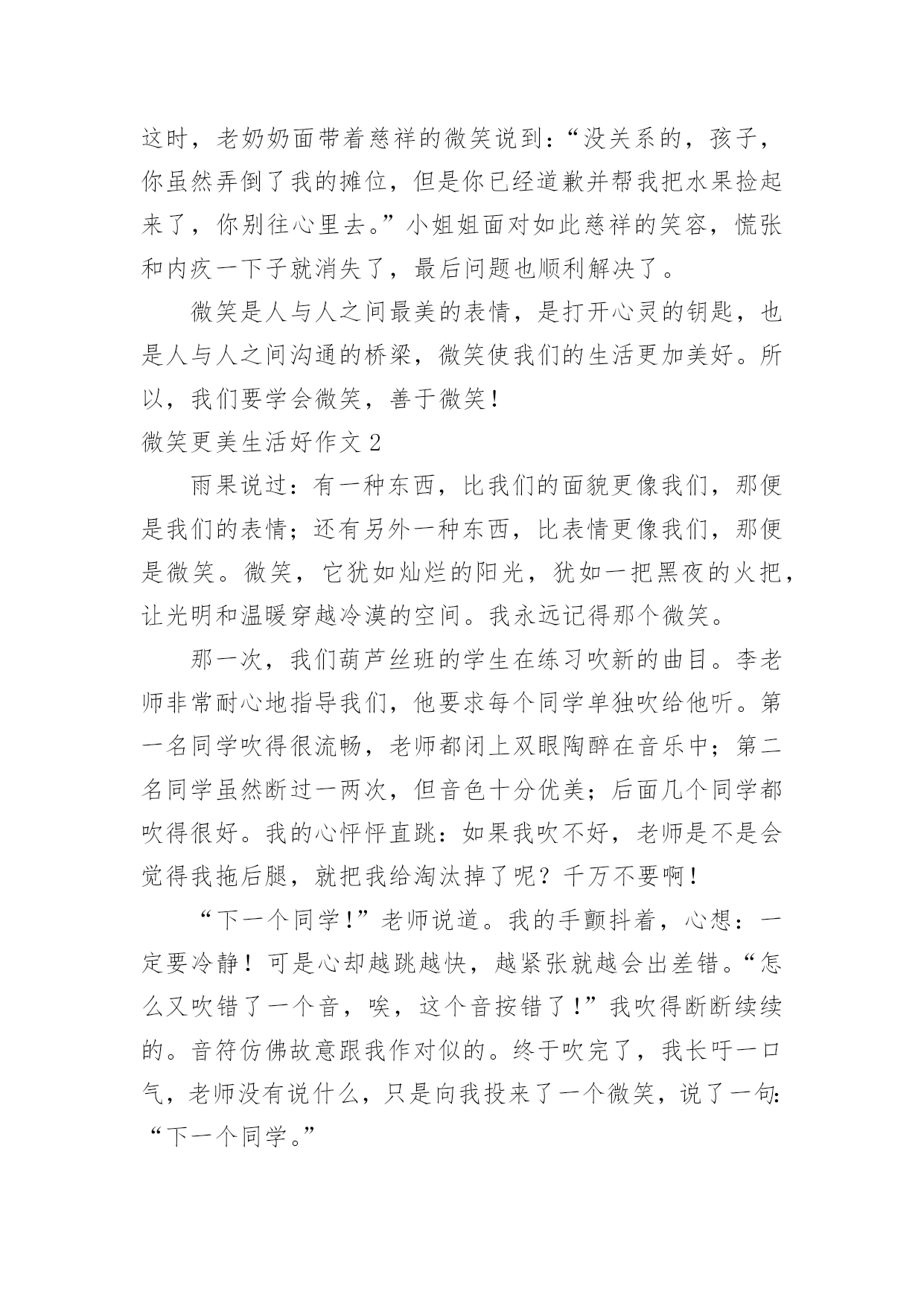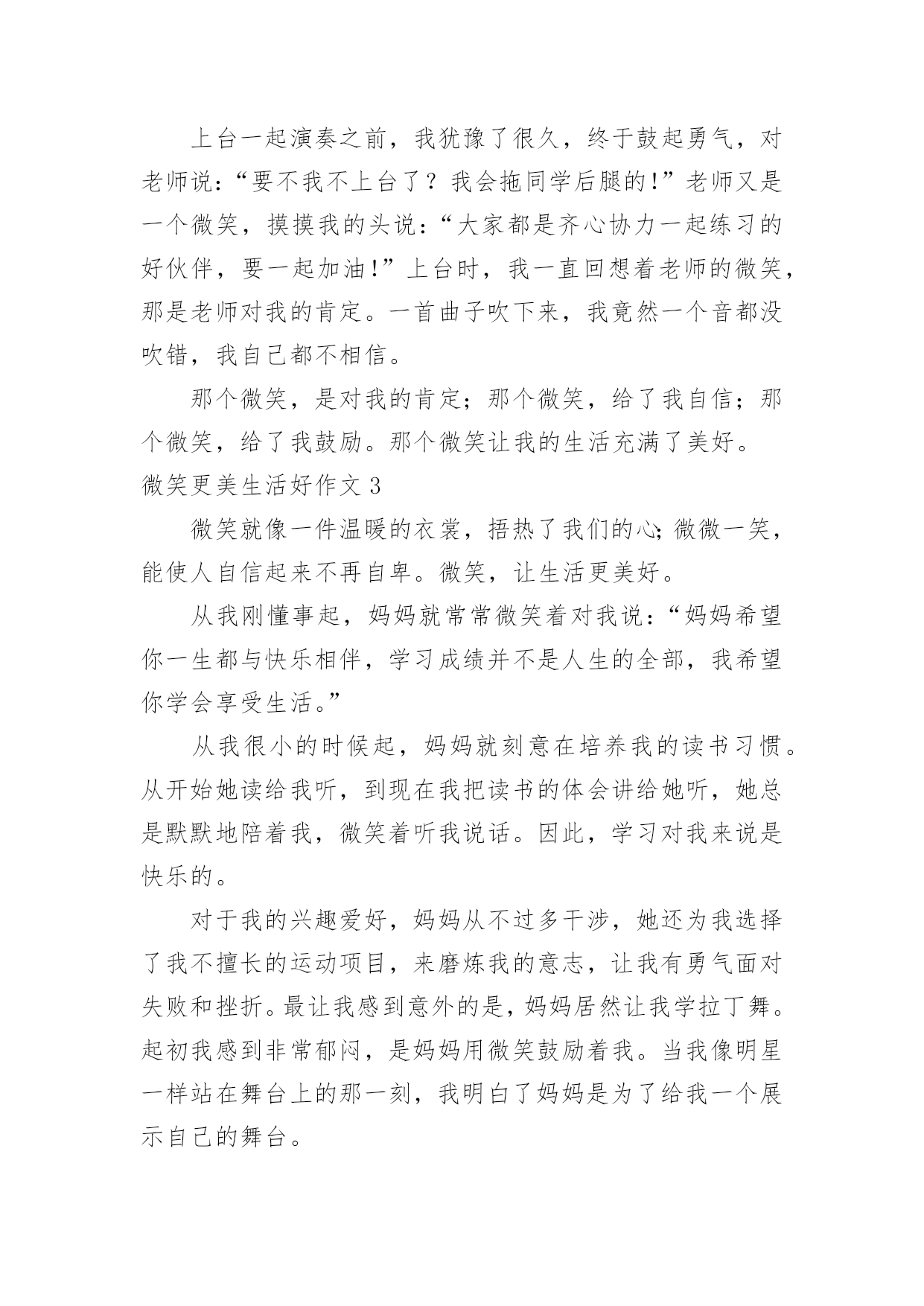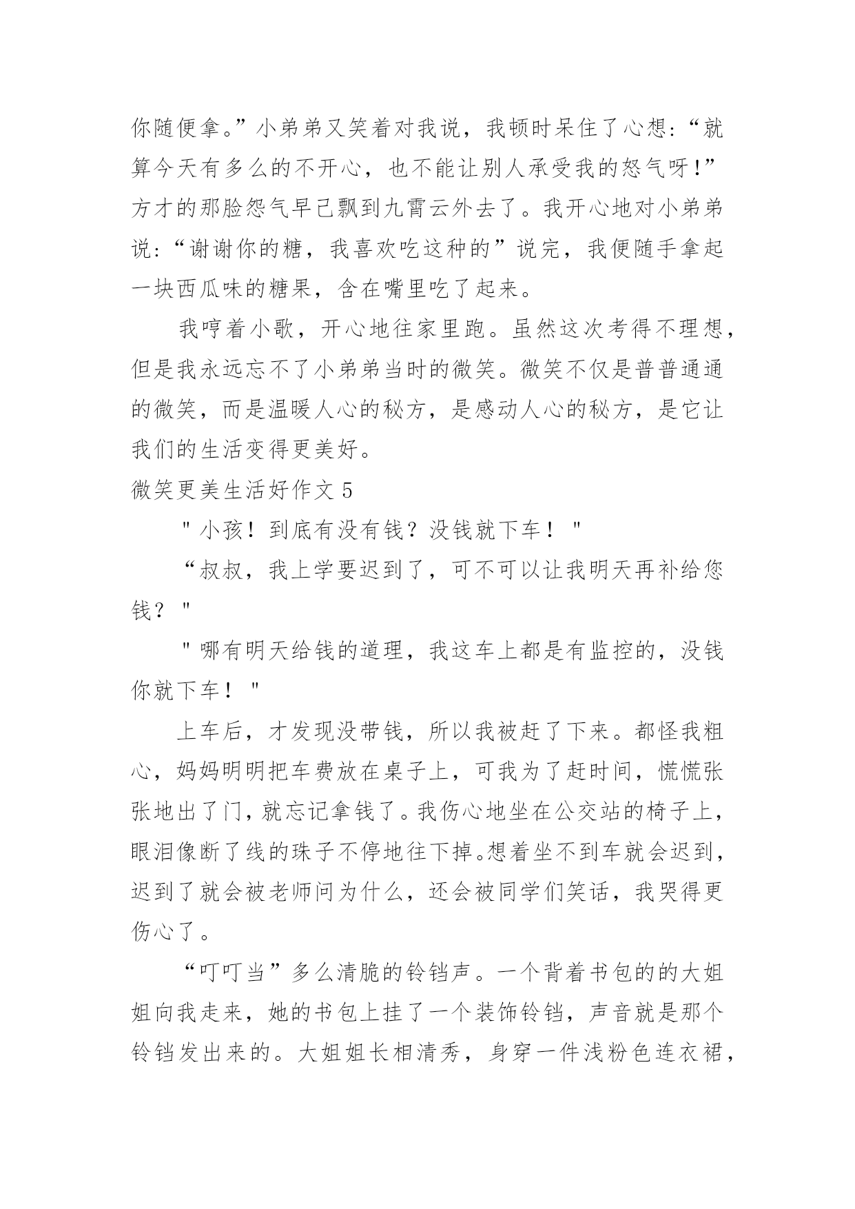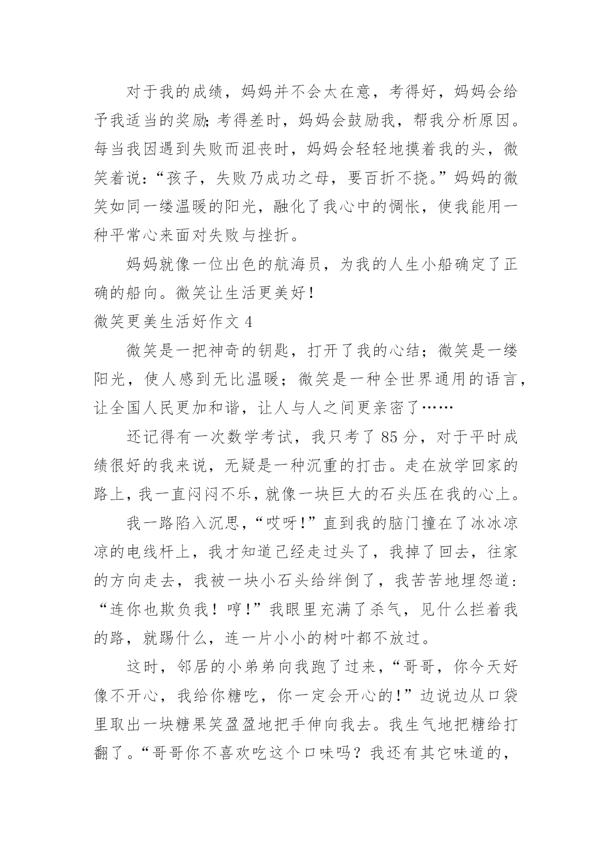 微笑更美生活好作文微笑更美生活好作文在平平淡淡的学习、工作、生活中,大家都不可避免地会接触到作文吧,作文是由文字组成,经过人的思想考虑,通过语言组织来表达一个主题意义的文体。一篇什么样的作文才能称之为优秀作文呢?下面是小编帮大家整理的微笑更美生活好作文,仅供参考,大家一起来看看吧。微笑更美生活好作文1中国有句古话叫做:相逢一笑混恩仇。说的就是微笑的作用,在现实生活和人际交往中,微笑具有治愈人心,让人心情舒畅的作用,使我们的生活更加美好。在我们平时出门的时候,应该会有这样的体会:当我们遇到了熟悉的朋友或是一个素不相识的陌生人,给你一个亲切的微笑时那你一定会感到心情愉悦,而且一整天都会沉浸在这种快乐中。当你给别人一个微笑时,对方会回给你一个更加灿烂的微笑。那么,你一整天的心情也会是一片阳光,就像是沐浴春风一般的舒畅。我曾经就遇到过这样的场面:一位小姐姐在骑车时的路上不小心把一位老奶奶的水果摊给弄倒了,那个小姐姐很慌张,不知道该怎么办才好。我想:这个小姐姐心里一定很内疚吧。之后,小姐姐一边说着对不起一边帮老奶奶捡起水果。这时,老奶奶面带着慈祥的微笑说到:“没关系的,孩子,你虽然弄倒了我的摊位,但是你已经道歉并帮我把水果捡起来了,你别往心里去。”小姐姐面对如此慈祥的笑容,慌张和内疚一下子就消失了,最后问题也顺利解决了。微笑是人与人之间最美的表情,是打开心灵的钥匙,也是人与人之间沟通的桥梁,微笑使我们的生活更加美好。所以,我们要学会微笑,善于微笑!微笑更美生活好作文2雨果说过:有一种东西,比我们的面貌更像我们,那便是我们的表情;还有另外一种东西,比表情更像我们,那便是微笑。微笑,它犹如灿烂的阳光,犹如一把黑夜的火把,让光明和温暖穿越冷漠的空间。我永远记得那个微笑。那一次,我们葫芦丝班的学生在练习吹新的曲目。李老师非常耐心地指导我们,他要求每个同学单独吹给他听。第一名同学吹得很流畅,老师都闭上双眼陶醉在音乐中;第二名同学虽然断过一两次,但音色十分优美;后面几个同学都吹得很好。我的心怦怦直跳:如果我吹不好,老师是不是会觉得我拖后腿,就把我给淘汰掉了呢?千万不要啊!“下一个同学!”老师说道。我的手颤抖着,心想:一定要冷静!可是心却越跳越快,越紧张就越会出差错。“怎么又吹错了一个音,唉,这个音按错了!”我吹得断断续续的。音符仿佛故意跟我作对似的。终于吹完了,我长吁一口气,老师没有说什么,只是向我投来了一个微笑,说了一句:“下一个同学。”上台一起演奏之前,我犹豫了很久,终于鼓起勇气,对老师说:“要不我不上台了?我会拖同学后腿的!”老师又是一个微笑,摸摸我的头说:“大家都是齐心协力一起练习的好伙伴,要一起加油!”上台时,我一直回想着老师的微笑,那是老师对我的肯定。一首曲子吹下来,我竟然一个音都没吹错,我自己都不相信。那个微笑,是对我的肯定;那个微笑,给了我自信;那个微笑,给了我鼓励。那个微笑让我的生活充满了美好。微笑更美生活好作文3微笑就像一件温暖的衣裳,捂热了我们的心;微微一笑,能使人自信起来不再自卑。微笑,让生活更美好。从我刚懂事起,妈妈就常常微笑着对我说:“妈妈希望你一生都与快乐相伴,学习成绩并不是人生的全部,我希望你学会享受生活。”从我很小的时候起,妈妈就刻意在培养我的读书习惯。从开始她读给我听,到现在我把读书的体会讲给她听,她总是默默地陪着我,微笑着听我说话。因此,学习对我来说是快乐的。对于我的兴趣爱好,妈妈从不过多干涉,她还为我选择了我不擅长的运动项目,来磨炼我的意志,让我有勇气面对失败和挫折。最让我感到意外的是,妈妈居然让我学拉丁舞。起初我感到非常郁闷,是妈妈用微笑鼓励着我。当我像明星一样站在舞台上的那一刻,我明白了妈妈是为了给我一个展示自己的舞台。对于我的成绩,妈妈并不会太在意,考得好,妈妈会给予我适当的奖励;考得差时,妈妈会鼓励我,帮我分析原因。每当我因遇到失败而沮丧时,妈妈会轻轻地摸着我的头,微笑着说:“孩子,失败乃成功之母,要百折不挠。”妈妈的微笑如同一缕温暖的阳光,融化了我心中的惆怅,使我能用一种平常心来面对失败与挫折。妈妈就像一位出色的航海员,为我的人生小船确定了正确的船向。微笑让生活更美好!微笑更美生活好作文4微笑是一把神奇的钥匙,打开了我的心结;微笑是一缕阳光,使人感到无比温暖;微笑是一种全世界通用的语言,让全国人民更加和谐,让人与人之间更亲密了……还记得有一次数学考试,我只考了85分,对于平时成绩很好的我来说,无疑是一种沉重的打击。走在放学回家的路上,我一直闷闷不乐,就像一块巨大的石头压在我的心上。我一路陷入沉思,“哎呀!”直到我的脑门撞在了冰冰凉凉的电线杆上,我才知道己经走过头了,我掉了回去,往家的方向走去,我被一块小石头给绊倒了,我苦苦地埋怨道:“连你也欺负我!哼!”我眼里充满了杀气,见什么拦着我的路,就踢什