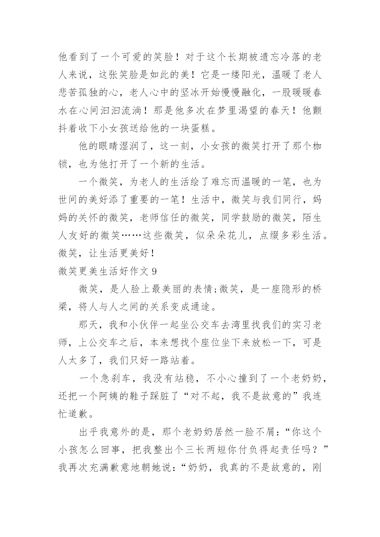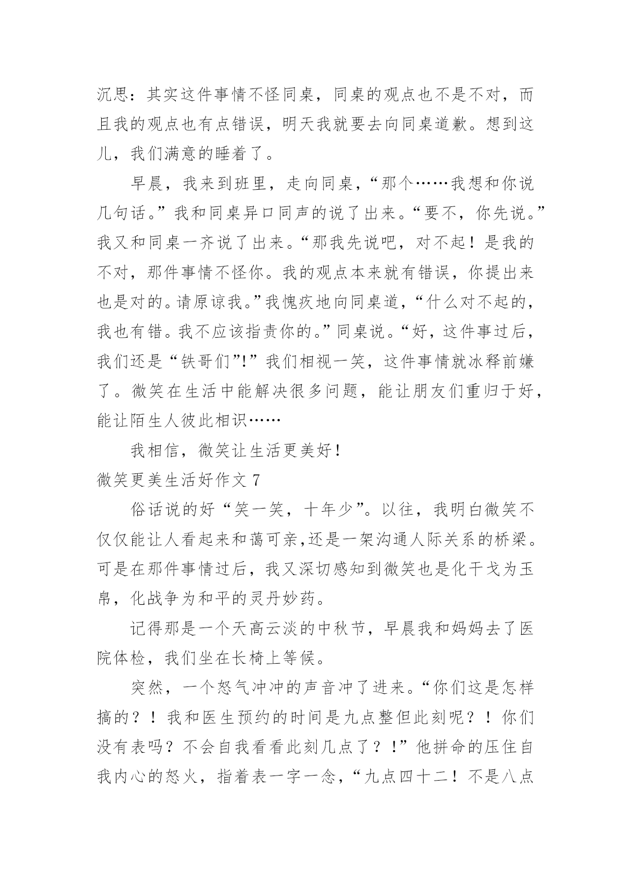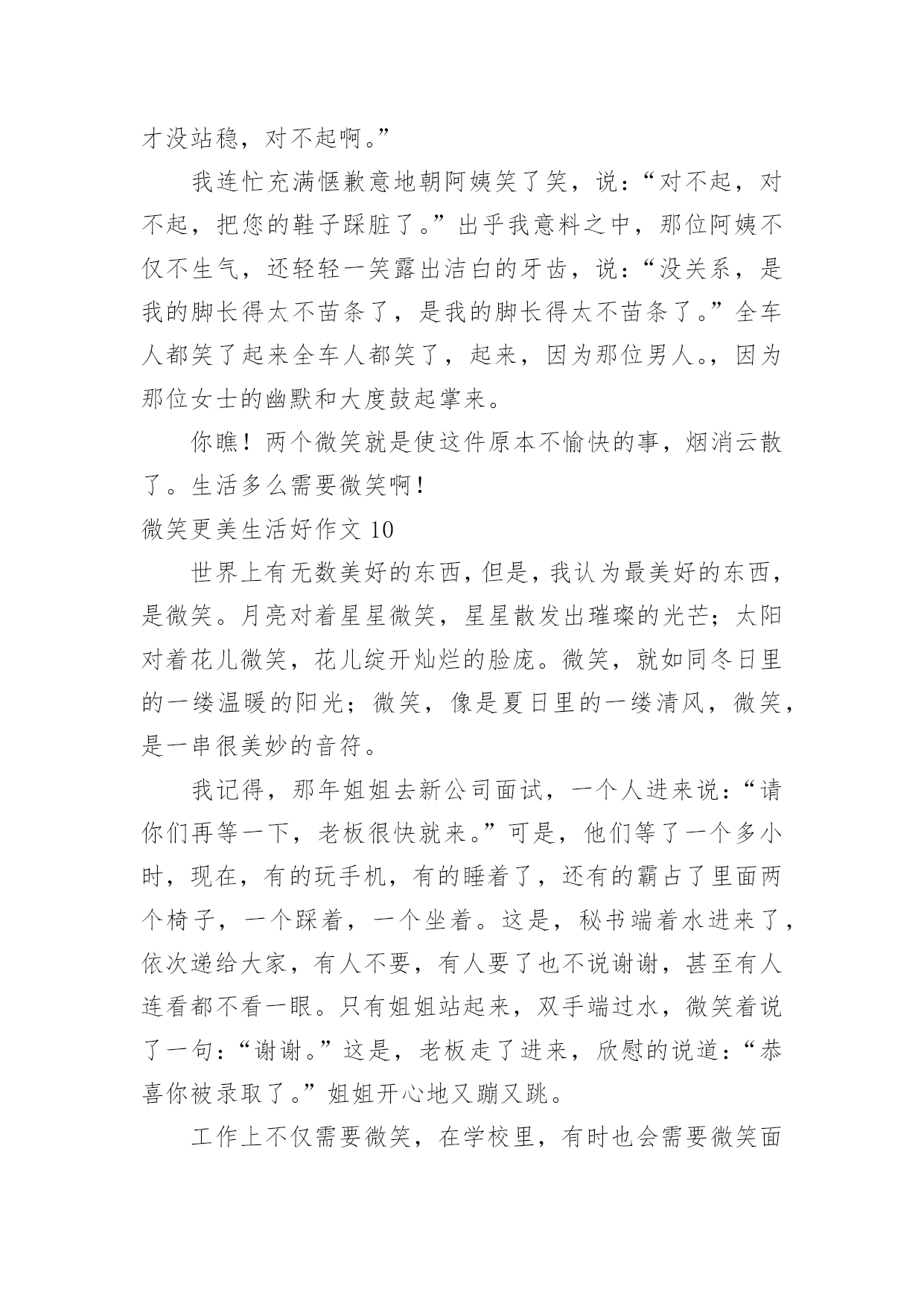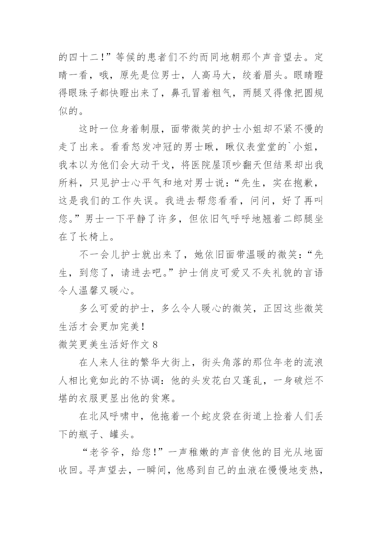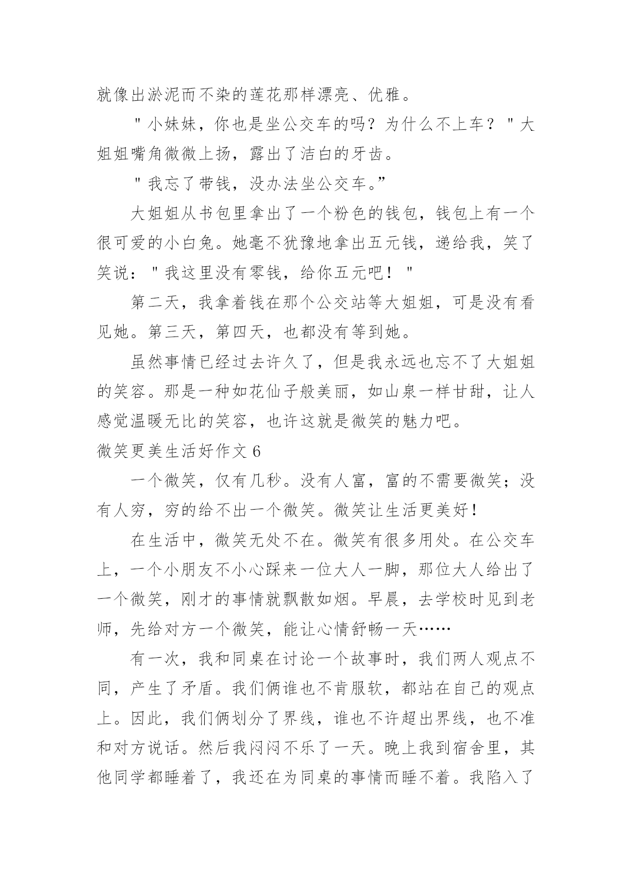 微笑更美生活好作文微笑更美生活好作文在平平淡淡的学习、工作、生活中,大家都不可避免地会接触到作文吧,作文是由文字组成,经过人的思想考虑,通过语言组织来表达一个主题意义的文体。一篇什么样的作文才能称之为优秀作文呢?下面是小编帮大家整理的微笑更美生活好作文,仅供参考,大家一起来看看吧。微笑更美生活好作文1中国有句古话叫做:相逢一笑混恩仇。说的就是微笑的作用,在现实生活和人际交往中,微笑具有治愈人心,让人心情舒畅的作用,使我们的生活更加美好。在我们平时出门的时候,应该会有这样的体会:当我们遇到了熟悉的朋友或是一个素不相识的陌生人,给你一个亲切的微笑时那你一定会感到心情愉悦,而且一整天都会沉浸在这种快乐中。当你给别人一个微笑时,对方会回给你一个更加灿烂的微笑。那么,你一整天的心情也会是一片阳光,就像是沐浴春风一般的舒畅。我曾经就遇到过这样的场面:一位小姐姐在骑车时的路上不小心把一位老奶奶的水果摊给弄倒了,那个小姐姐很慌张,不知道该怎么办才好。我想:这个小姐姐心里一定很内疚吧。之后,小姐姐一边说着对不起一边帮老奶奶捡起水果。这时,老奶奶面带着慈祥的微笑说到:“没关系的,孩子,你虽然弄倒了我的摊位,但是你已经道歉并帮我把水果捡起来了,你别往心里去。”小姐姐面对如此慈祥的笑容,慌张和内疚一下子就消失了,最后问题也顺利解决了。微笑是人与人之间最美的表情,是打开心灵的钥匙,也是人与人之间沟通的桥梁,微笑使我们的生活更加美好。所以,我们要学会微笑,善于微笑!微笑更美生活好作文2雨果说过:有一种东西,比我们的面貌更像我们,那便是我们的表情;还有另外一种东西,比表情更像我们,那便是微笑。微笑,它犹如灿烂的阳光,犹如一把黑夜的火把,让光明和温暖穿越冷漠的空间。我永远记得那个微笑。那一次,我们葫芦丝班的学生在练习吹新的曲目。李老师非常耐心地指导我们,他要求每个同学单独吹给他听。第一名同学吹得很流畅,老师都闭上双眼陶醉在音乐中;第二名同学虽然断过一两次,但音色十分优美;后面几个同学都吹得很好。我的心怦怦直跳:如果我吹不好,老师是不是会觉得我拖后腿,就把我给淘汰掉了呢?千万不要啊!“下一个同学!”老师说道。我的手颤抖着,心想:一定要冷静!可是心却越跳越快,越紧张就越会出差错。“怎么又吹错了一个音,唉,这个音按错了!”我吹得断断续续的。音符仿佛故意跟我作对似的。终于吹完了,我长吁一口气,老师没有说什么,只是向我投来了一个微笑,说了一句:“下一个同学。”上台一起演奏之前,我犹豫了很久,终于鼓起勇气,对老师说:“要不我不上台了?我会拖同学后腿的!”老师又是一个微笑,摸摸我的头说:“大家都是齐心协力一起练习的好伙伴,要一起加油!”上台时,我一直回想着老师的微笑,那是老师对我的肯定。一首曲子吹下来,我竟然一个音都没吹错,我自己都不相信。那个微笑,是对我的肯定;那个微笑,给了我自信;那个微笑,给了我鼓励。那个微笑让我的生活充满了美好。微笑更美生活好作文3微笑就像一件温暖的衣裳,捂热了我们的心;微微一笑,能使人自信起来不再自卑。微笑,让生活更美好。从我刚懂事起,妈妈就常常微笑着对我说:“妈妈希望你一生都与快乐相伴,学习成绩并不是人生的全部,我希望你学会享受生活。”从我很小的时候起,妈妈就刻意在培养我的读书习惯。从开始她读给我听,到现在我把读书的体会讲给她听,她总是默默地陪着我,微笑着听我说话。因此,学习对我来说是快乐的。对于我的兴趣爱好,妈妈从不过多干涉,她还为我选择了我不擅长的运动项目,来磨炼我的意志,让我有勇气面对失败和挫折。最让我感到意外的是,妈妈居然让我学拉丁舞。起初我感到非常郁闷,是妈妈用微笑鼓励着我。当我像明星一样站在舞台上的那一刻,我明白了妈妈是为了给我一个展示自己的舞台。对于我的成绩,妈妈并不会太在意,考得好,妈妈会给予我适当的奖励;考得差时,妈妈会鼓励我,帮我分析原因。每当我因遇到失败而沮丧时,妈妈会轻轻地摸着我的头,微笑着说:“孩子,失败乃成功之母,要百折不挠。”妈妈的微笑如同一缕温暖的阳光,融化了我心中的惆怅,使我能用一种平常心来面对失败与挫折。妈妈就像一位出色的航海员,为我的人生小船确定了正确的船向。微笑让生活更美好!微笑更美生活好作文4微笑是一把神奇的钥匙,打开了我的心结;微笑是一缕阳光,使人感到无比温暖;微笑是一种全世界通用的语言,让全国人民更加和谐,让人与人之间更亲密了……还记得有一次数学考试,我只考了85分,对于平时成绩很好的我来说,无疑是一种沉重的打击。走在放学回家的路上,我一直闷闷不乐,就像一块巨大的石头压在我的心上。我一路陷入沉思,“哎呀!”直到我的脑门撞在了冰冰凉凉的电线杆上,我才知道己经走过头了,我掉了回去,往家的方向走去,我被一块小石头给绊倒了,我苦苦地埋怨道:“连你也欺负我!哼!”我眼里充满了杀气,见什么拦着我的路,就踢什