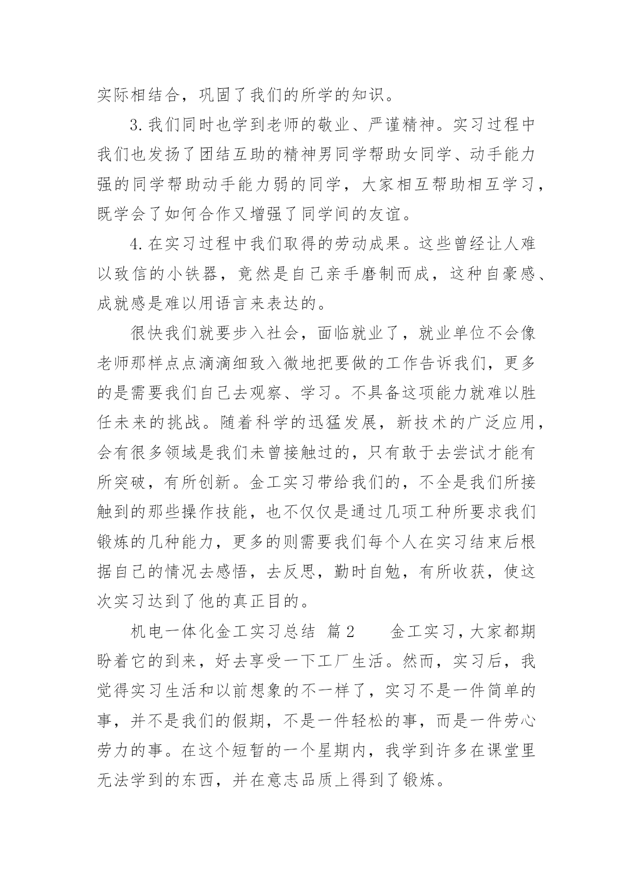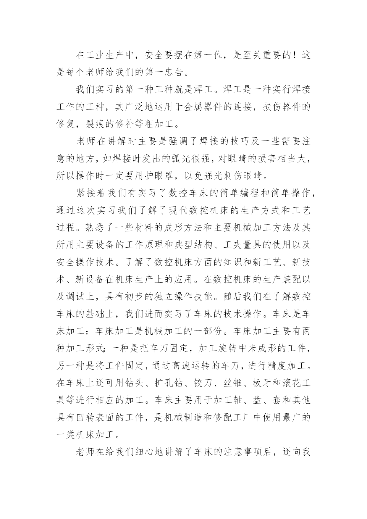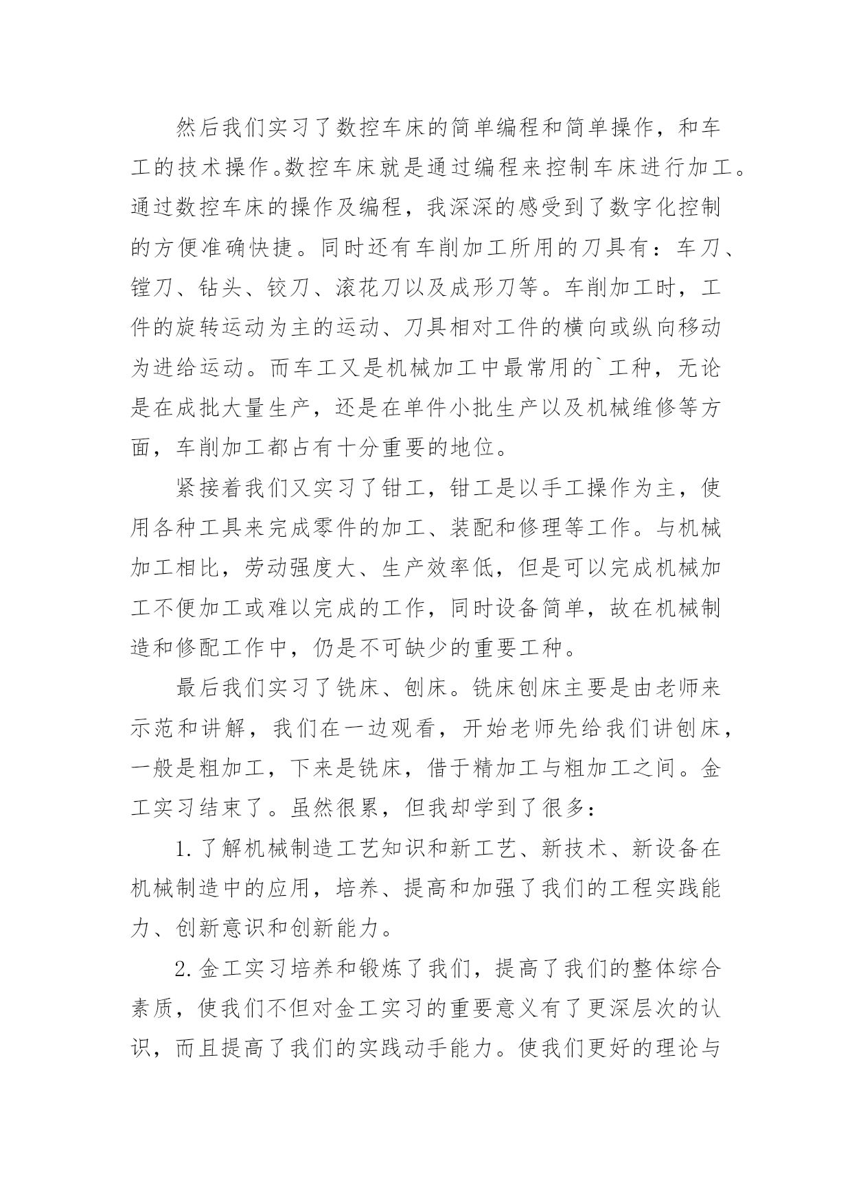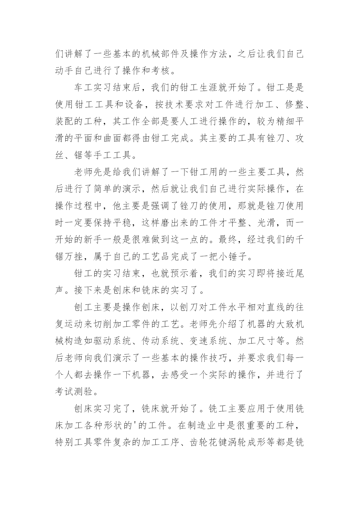 机电一体化金工实习总结机电一体化金工实习总结总结就是把一个时段的学习、工作或其完成情况进行一次全面系统的总结,写总结有利于我们学习和工作能力的提高,让我们一起认真地写一份总结吧。总结一般是怎么写的呢?下面是小编为大家收集的机电一体化金工实习总结,欢迎阅读与收藏。机电一体化金工实习总结篇1时光匆匆,岁月流梭!转眼间金工实习结束了。在实习期间虽然很累、很苦,但我却感到很快乐!我们在学院实训基地进行了金工实习。在此期间,我们接触了焊工、机加工、车工、钳工、铣床、刨床等工种的基本操作技能和安全技术教程。每次,大家都要学习一项新的技术,并在4小时的实习时间里,完成从对各项工种的一无所知到制作出一件成品的过程。在老师们耐心细致地讲授和在我们的积极的配合下,我们没有发生一例伤害事故,基本达到了预期的实习要求,圆满地完成了实习任务。我们首先要实习的工种是焊接,在焊接的过程中我们只学习了焊接方法中的熔化焊。老师介绍了相关原理、仪器的使用技巧和在使用中应注意的问题。在焊接的时候,尽管那些焊接的火花可能会伤及皮肤,但强烈的好奇心与求知欲还是让我们乐此不疲的练习着。然后我们实习了数控车床的简单编程和简单操作,和车工的技术操作。数控车床就是通过编程来控制车床进行加工。通过数控车床的操作及编程,我深深的感受到了数字化控制的方便准确快捷。同时还有车削加工所用的刀具有:车刀、镗刀、钻头、铰刀、滚花刀以及成形刀等。车削加工时,工件的旋转运动为主的运动、刀具相对工件的横向或纵向移动为进给运动。而车工又是机械加工中最常用的`工种,无论是在成批大量生产,还是在单件小批生产以及机械维修等方面,车削加工都占有十分重要的地位。紧接着我们又实习了钳工,钳工是以手工操作为主,使用各种工具来完成零件的加工、装配和修理等工作。与机械加工相比,劳动强度大、生产效率低,但是可以完成机械加工不便加工或难以完成的工作,同时设备简单,故在机械制造和修配工作中,仍是不可缺少的重要工种。最后我们实习了铣床、刨床。铣床刨床主要是由老师来示范和讲解,我们在一边观看,开始老师先给我们讲刨床,一般是粗加工,下来是铣床,借于精加工与粗加工之间。金工实习结束了。虽然很累,但我却学到了很多:1.了解机械制造工艺知识和新工艺、新技术、新设备在机械制造中的应用,培养、提高和加强了我们的工程实践能力、创新意识和创新能力。2.金工实习培养和锻炼了我们,提高了我们的整体综合素质,使我们不但对金工实习的重要意义有了更深层次的认识,而且提高了我们的实践动手能力。使我们更好的理论与实际相结合,巩固了我们的所学的知识。3.我们同时也学到老师的敬业、严谨精神。实习过程中我们也发扬了团结互助的精神男同学帮助女同学、动手能力强的同学帮助动手能力弱的同学,大家相互帮助相互学习,既学会了如何合作又增强了同学间的友谊。4.在实习过程中我们取得的劳动成果。这些曾经让人难以致信的小铁器,竟然是自己亲手磨制而成,这种自豪感、成就感是难以用语言来表达的。很快我们就要步入社会,面临就业了,就业单位不会像老师那样点点滴滴细致入微地把要做的工作告诉我们,更多的是需要我们自己去观察、学习。不具备这项能力就难以胜任未来的挑战。随着科学的迅猛发展,新技术的广泛应用,会有很多领域是我们未曾接触过的,只有敢于去尝试才能有所突破,有所创新。金工实习带给我们的,不全是我们所接触到的那些操作技能,也不仅仅是通过几项工种所要求我们锻炼的几种能力,更多的则需要我们每个人在实习结束后根据自己的情况去感悟,去反思,勤时自勉,有所收获,使这次实习达到了他的真正目的。机电一体化金工实习总结篇2金工实习,大家都期盼着它的到来,好去享受一下工厂生活。然而,实习后,我觉得实习生活和以前想象的不一样了,实习不是一件简单的事,并不是我们的假期,不是一件轻松的事,而是一件劳心劳力的事。在这个短暂的一个星期内,我学到许多在课堂里无法学到的东西,并在意志品质上得到了锻炼。在工业生产中,安全要摆在第一位,是至关重要的!这是每个老师给我们的第一忠告。我们实习的第一种工种就是焊工。焊工是一种实行焊接工作的工种,其广泛地运用于金属器件的连接,损伤器件的修复,裂痕的修补等粗加工。老师在讲解时主要是强调了焊接的技巧及一些需要注意的地方,如焊接时发出的弧光很强,对眼睛的损害相当大,所以操作时一定要用护眼罩,以免强光刺伤眼睛。紧接着我们有实习了数控车床的简单编程和简单操作,通过这次实习我们了解了现代数控机床的生产方式和工艺过程。熟悉了一些材料的成形方法和主要机械加工方法及其所用主要设备的工作原理和典型结构、工夹量具的使用以及安全操作技术。了解了数控机床方面的知识和新工艺、新技术、新设备在机床生产上的应用。在数控机床的生产装配以及调试上,具有初步的独立操作技能。随后我们在了解数控车床的基础上,我们进而实习了