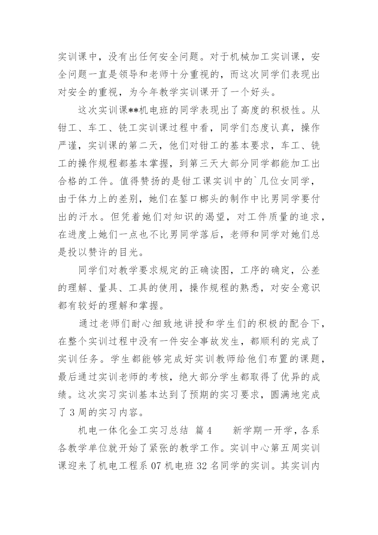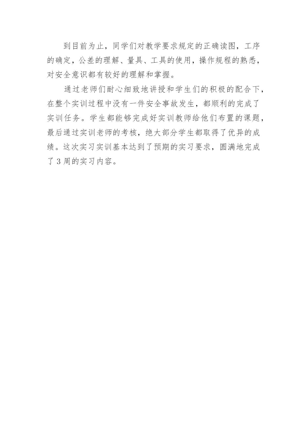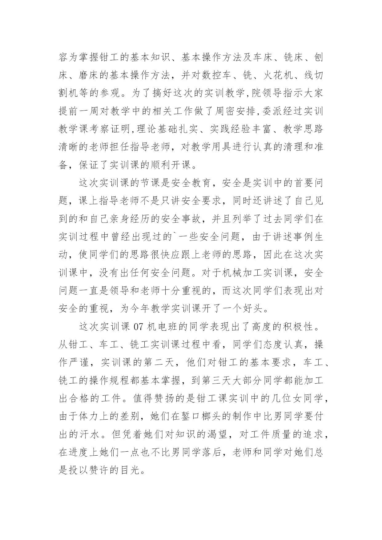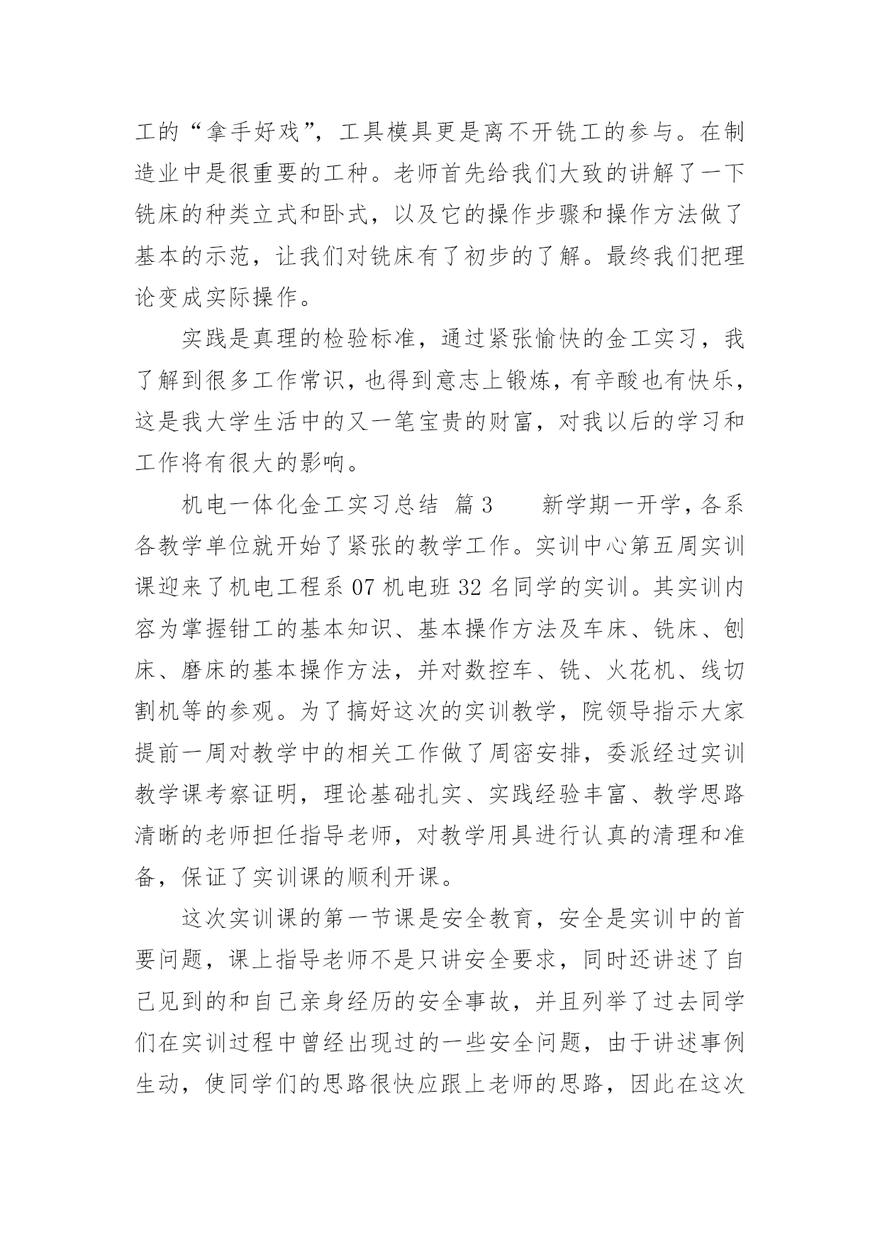 机电一体化金工实习总结机电一体化金工实习总结总结就是把一个时段的学习、工作或其完成情况进行一次全面系统的总结,写总结有利于我们学习和工作能力的提高,让我们一起认真地写一份总结吧。总结一般是怎么写的呢?下面是小编为大家收集的机电一体化金工实习总结,欢迎阅读与收藏。机电一体化金工实习总结篇1时光匆匆,岁月流梭!转眼间金工实习结束了。在实习期间虽然很累、很苦,但我却感到很快乐!我们在学院实训基地进行了金工实习。在此期间,我们接触了焊工、机加工、车工、钳工、铣床、刨床等工种的基本操作技能和安全技术教程。每次,大家都要学习一项新的技术,并在4小时的实习时间里,完成从对各项工种的一无所知到制作出一件成品的过程。在老师们耐心细致地讲授和在我们的积极的配合下,我们没有发生一例伤害事故,基本达到了预期的实习要求,圆满地完成了实习任务。我们首先要实习的工种是焊接,在焊接的过程中我们只学习了焊接方法中的熔化焊。老师介绍了相关原理、仪器的使用技巧和在使用中应注意的问题。在焊接的时候,尽管那些焊接的火花可能会伤及皮肤,但强烈的好奇心与求知欲还是让我们乐此不疲的练习着。然后我们实习了数控车床的简单编程和简单操作,和车工的技术操作。数控车床就是通过编程来控制车床进行加工。通过数控车床的操作及编程,我深深的感受到了数字化控制的方便准确快捷。同时还有车削加工所用的刀具有:车刀、镗刀、钻头、铰刀、滚花刀以及成形刀等。车削加工时,工件的旋转运动为主的运动、刀具相对工件的横向或纵向移动为进给运动。而车工又是机械加工中最常用的`工种,无论是在成批大量生产,还是在单件小批生产以及机械维修等方面,车削加工都占有十分重要的地位。紧接着我们又实习了钳工,钳工是以手工操作为主,使用各种工具来完成零件的加工、装配和修理等工作。与机械加工相比,劳动强度大、生产效率低,但是可以完成机械加工不便加工或难以完成的工作,同时设备简单,故在机械制造和修配工作中,仍是不可缺少的重要工种。最后我们实习了铣床、刨床。铣床刨床主要是由老师来示范和讲解,我们在一边观看,开始老师先给我们讲刨床,一般是粗加工,下来是铣床,借于精加工与粗加工之间。金工实习结束了。虽然很累,但我却学到了很多:1.了解机械制造工艺知识和新工艺、新技术、新设备在机械制造中的应用,培养、提高和加强了我们的工程实践能力、创新意识和创新能力。2.金工实习培养和锻炼了我们,提高了我们的整体综合素质,使我们不但对金工实习的重要意义有了更深层次的认识,而且提高了我们的实践动手能力。使我们更好的理论与实际相结合,巩固了我们的所学的知识。3.我们同时也学到老师的敬业、严谨精神。实习过程中我们也发扬了团结互助的精神男同学帮助女同学、动手能力强的同学帮助动手能力弱的同学,大家相互帮助相互学习,既学会了如何合作又增强了同学间的友谊。4.在实习过程中我们取得的劳动成果。这些曾经让人难以致信的小铁器,竟然是自己亲手磨制而成,这种自豪感、成就感是难以用语言来表达的。很快我们就要步入社会,面临就业了,就业单位不会像老师那样点点滴滴细致入微地把要做的工作告诉我们,更多的是需要我们自己去观察、学习。不具备这项能力就难以胜任未来的挑战。随着科学的迅猛发展,新技术的广泛应用,会有很多领域是我们未曾接触过的,只有敢于去尝试才能有所突破,有所创新。金工实习带给我们的,不全是我们所接触到的那些操作技能,也不仅仅是通过几项工种所要求我们锻炼的几种能力,更多的则需要我们每个人在实习结束后根据自己的情况去感悟,去反思,勤时自勉,有所收获,使这次实习达到了他的真正目的。机电一体化金工实习总结篇2金工实习,大家都期盼着它的到来,好去享受一下工厂生活。然而,实习后,我觉得实习生活和以前想象的不一样了,实习不是一件简单的事,并不是我们的假期,不是一件轻松的事,而是一件劳心劳力的事。在这个短暂的一个星期内,我学到许多在课堂里无法学到的东西,并在意志品质上得到了锻炼。在工业生产中,安全要摆在第一位,是至关重要的!这是每个老师给我们的第一忠告。我们实习的第一种工种就是焊工。焊工是一种实行焊接工作的工种,其广泛地运用于金属器件的连接,损伤器件的修复,裂痕的修补等粗加工。老师在讲解时主要是强调了焊接的技巧及一些需要注意的地方,如焊接时发出的弧光很强,对眼睛的损害相当大,所以操作时一定要用护眼罩,以免强光刺伤眼睛。紧接着我们有实习了数控车床的简单编程和简单操作,通过这次实习我们了解了现代数控机床的生产方式和工艺过程。熟悉了一些材料的成形方法和主要机械加工方法及其所用主要设备的工作原理和典型结构、工夹量具的使用以及安全操作技术。了解了数控机床方面的知识和新工艺、新技术、新设备在机床生产上的应用。在数控机床的生产装配以及调试上,具有初步的独立操作技能。随后我们在了解数控车床的基础上,我们进而实习了