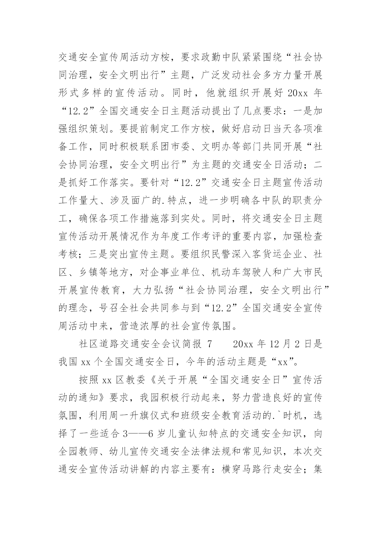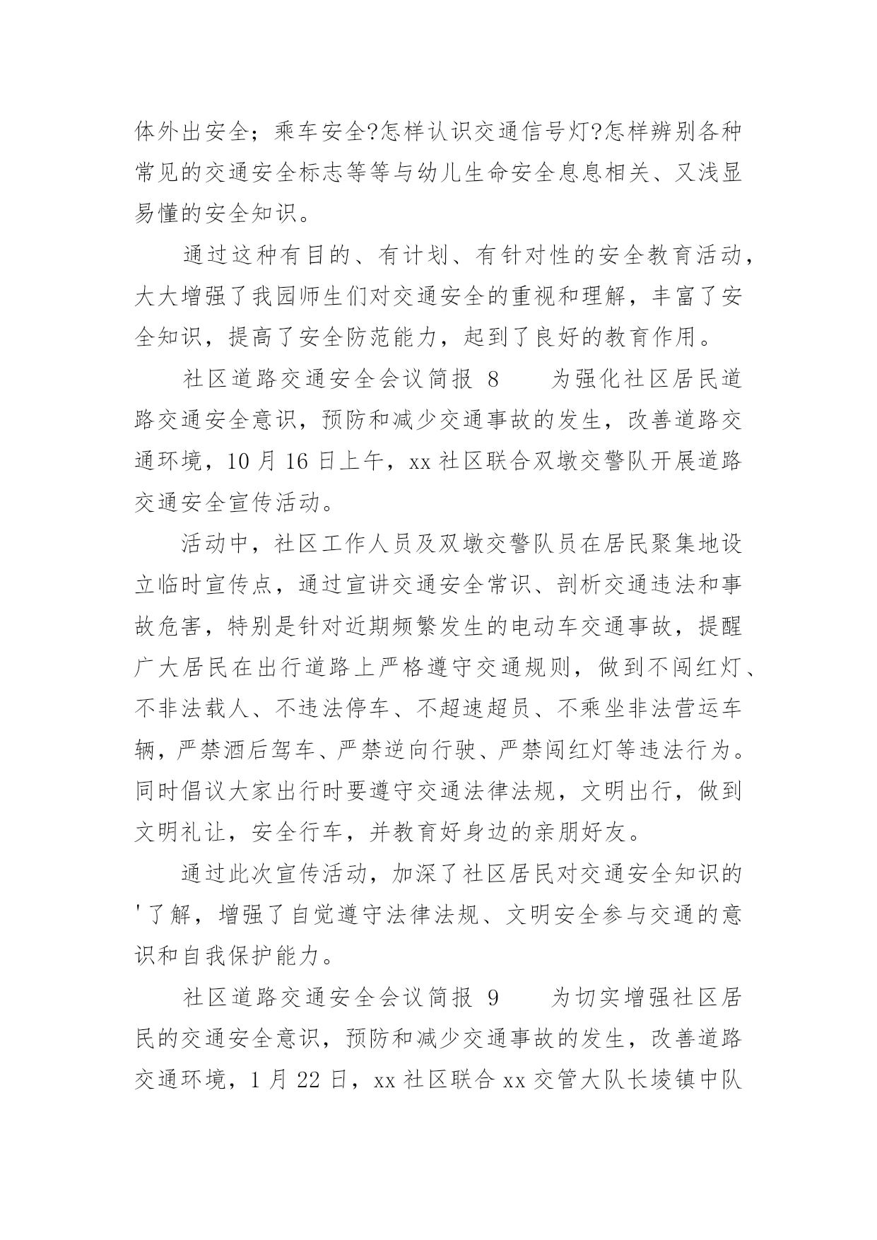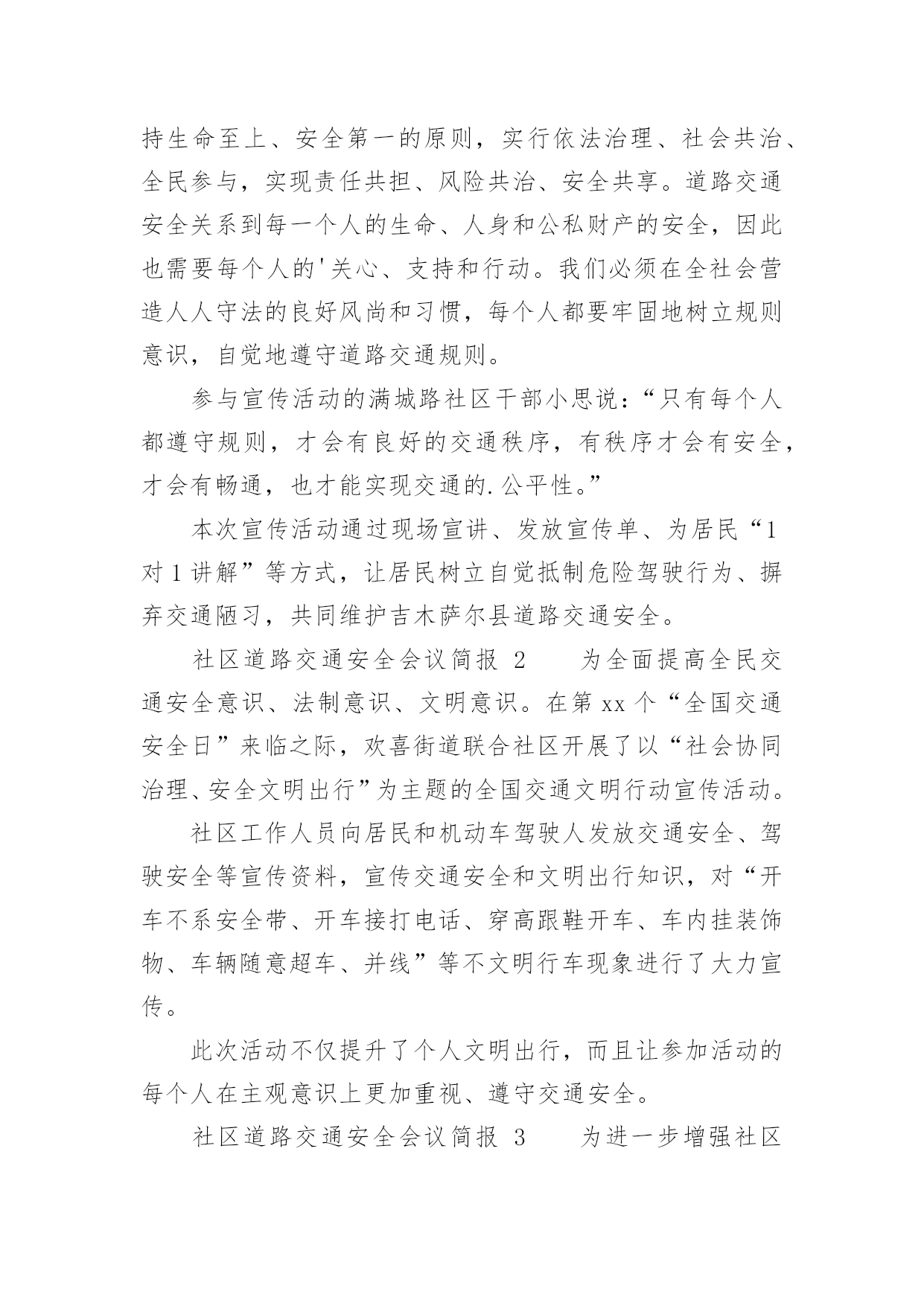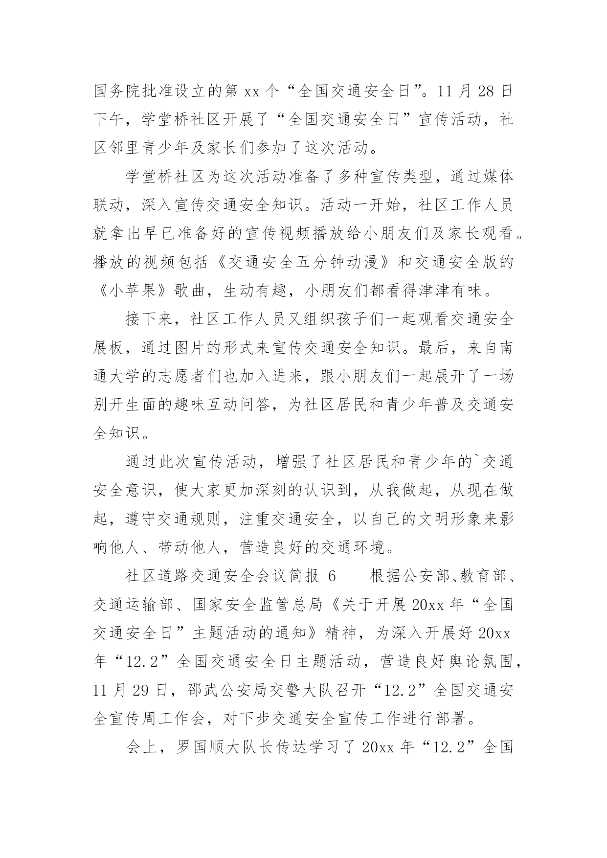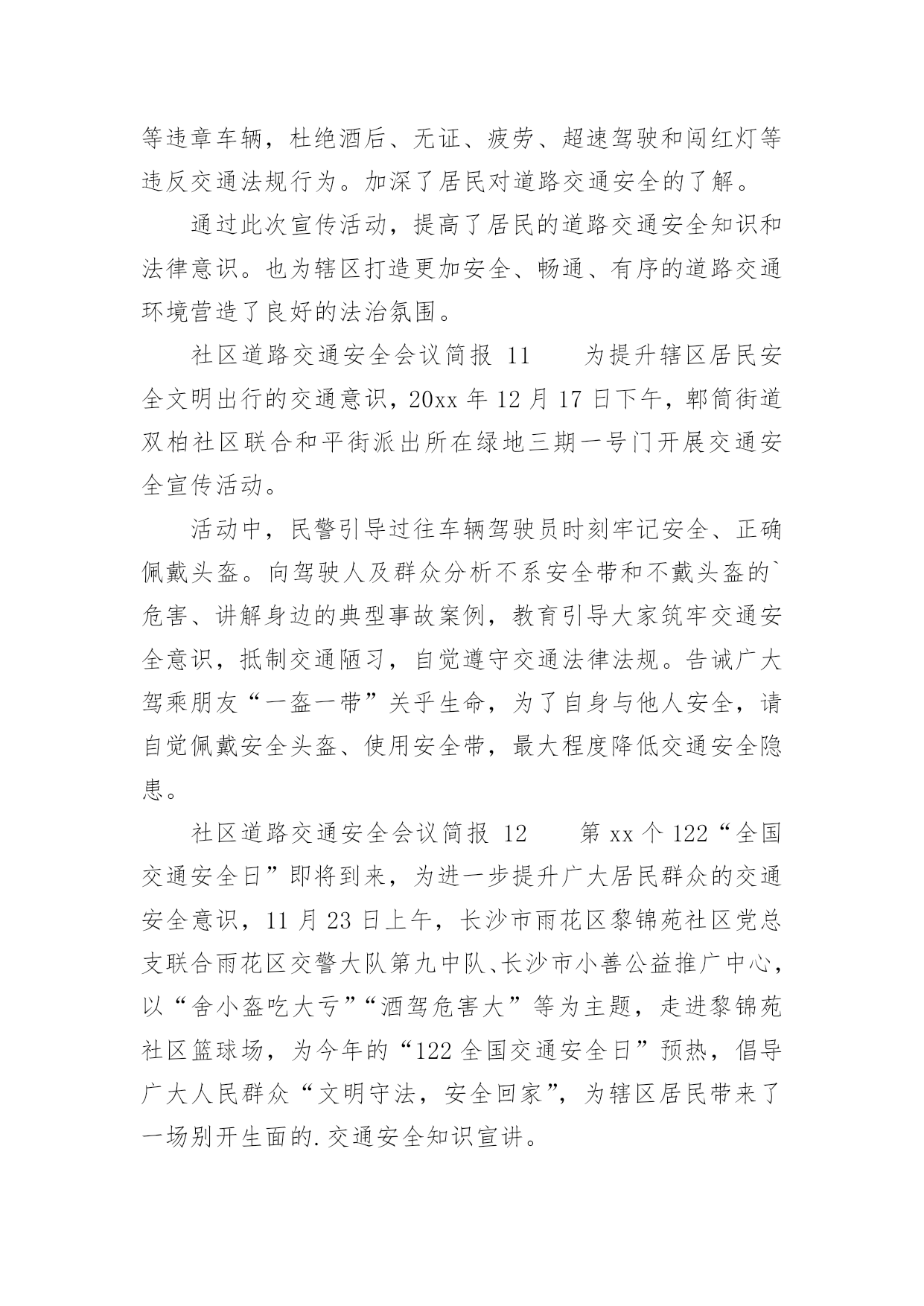 社区道路交通安全会议简报社区道路交通安全会议简报(精选12篇)在生活、工作和学习中,越来越多人会去使用简报,简报又称“动态”“简讯”“要情”“摘报”“工作通讯”“情况反映”“情况交流”“内部参考”等。你写简报时总是没有新意?以下是小编整理的社区道路交通安全会议简报,欢迎大家分享。社区道路交通安全会议简报1今天(12月2日)是第xx个“全国交通安全日”,今年活动的主题是“xx”。吉木萨尔县文明办、县交通大队、吉木萨尔镇各社区工作人员共计100余人,在吉木萨尔县北庭商贸城前进行交通安全知识普法宣传。据了解,协同治理是社会治理的一个重要理念和创新模式,对解决道路交通安全这样一个极其复杂的系统工程来讲具有非常重要的意义。近年来,我县开展交通安全社会协同治理的工作成效主要体现:县委、县政府组织全县开展“吉木萨尔县文明大行动”,把文明交通创建作为重要内容推进,全民齐参与,交通环境明显改善,交通参与者交通安全意识明显提高。我县文明交通主题系列活动影响不断增强,先后策划开展各类交通安全主题宣传活动,社会群众广泛参与,共同倡导文明交通理念。吉木萨尔县交通大队大队长呼吁:道路交通安全必须坚持生命至上、安全第一的原则,实行依法治理、社会共治、全民参与,实现责任共担、风险共治、安全共享。道路交通安全关系到每一个人的生命、人身和公私财产的安全,因此也需要每个人的'关心、支持和行动。我们必须在全社会营造人人守法的良好风尚和习惯,每个人都要牢固地树立规则意识,自觉地遵守道路交通规则。参与宣传活动的满城路社区干部小思说:“只有每个人都遵守规则,才会有良好的交通秩序,有秩序才会有安全,才会有畅通,也才能实现交通的.公平性。”本次宣传活动通过现场宣讲、发放宣传单、为居民“1对1讲解”等方式,让居民树立自觉抵制危险驾驶行为、摒弃交通陋习,共同维护吉木萨尔县道路交通安全。社区道路交通安全会议简报2为全面提高全民交通安全意识、法制意识、文明意识。在第xx个“全国交通安全日”来临之际,欢喜街道联合社区开展了以“社会协同治理、安全文明出行”为主题的全国交通文明行动宣传活动。社区工作人员向居民和机动车驾驶人发放交通安全、驾驶安全等宣传资料,宣传交通安全和文明出行知识,对“开车不系安全带、开车接打电话、穿高跟鞋开车、车内挂装饰物、车辆随意超车、并线”等不文明行车现象进行了大力宣传。此次活动不仅提升了个人文明出行,而且让参加活动的每个人在主观意识上更加重视、遵守交通安全。社区道路交通安全会议简报3为进一步增强社区群众的交通安全意识和文明意识,积极营造20xx年全国第xx个“122全国交通安全日”前期预热阶段宣传氛围。11月30日上午,景德镇市交警太白园中队民警联合梨树园社区以“社会协同治理、安全文明出行”为主题开展交通安全宣传活动。活动中,中队民警通过摆放交通安全宣传展板、发放交通安全宣传材料、面对面宣讲交通安全法律法规等形式,向社区工作者和社区居民详细讲解了驾乘车辆、步行等方面的日常出行安全常识,以及有关道路交通违法处理、道路交通事故应急处理方法等交通安全知识,并通过例举近期典型交通事故案例,广泛宣传超员、超速、超载、疲劳驾驶、酒驾、毒驾、涉牌涉证等严重违法行为危害性。此次宣传活动,大队共有8名民警和协警参加,摆放安全宣传展板10块,发放各类宣传资料300余份。通过宣传,进一步提升了社区居民的交通安全意识和法治意识,切实为全国第x个122全国交通安全日的.到来营造浓厚宣传氛围。社区道路交通安全会议简报4按照街道的统一部署和安排,我社区高度重视,认真贯彻落实相关的会议和文件精神。为加强对专项整治活动工作的组织领导,确保专项整治工作落实到位、取得实效,我社区成立了道路交通安全专项整治工作领导小组,制定了道理交通安全专项整治活动工作的实施方案。坚持"疏堵结合、标本兼治、综合治理、依法监督"的原则,加大了非法车辆的打击力度,维护了社区道路交通安全秩序。一、工作成效强化重点地区及驾驶人管理。随着机动车辆特别是私家车的不断增长,加强了对辖区各类车辆的停放、停靠的整治。主要居民区的.交通秩序得到明显改善。并加强对驾驶员安全教育,进一步加强了源头安全管理。使辖区道路交通保持安全畅通有序。同时,开展道路交通安全检查和隐患排查,会同派出所对我社区管辖范围内的车辆聚集区、学校周边等主要干道开展交通隐患排查,确保了居民、学生的出行安全。大力开展交通安全宣传,提升居民的安全意识。社区开展了多种形式的交通安全宣传活动。通过在辖区主要路段设立宣传点,摆放宣传展板、发放宣传资料、接受群众咨询等方式,广泛开展交通安全宣传活动,努力提高居民文明交通意识。在辖区营造了学习交通安全知识、遵守交通规章的良好氛围。同时,深入辖区单位和中小学校、幼儿园,为广大驾驶员、居民、学生开展交通法制宣传。使辖区居民的文明、道路