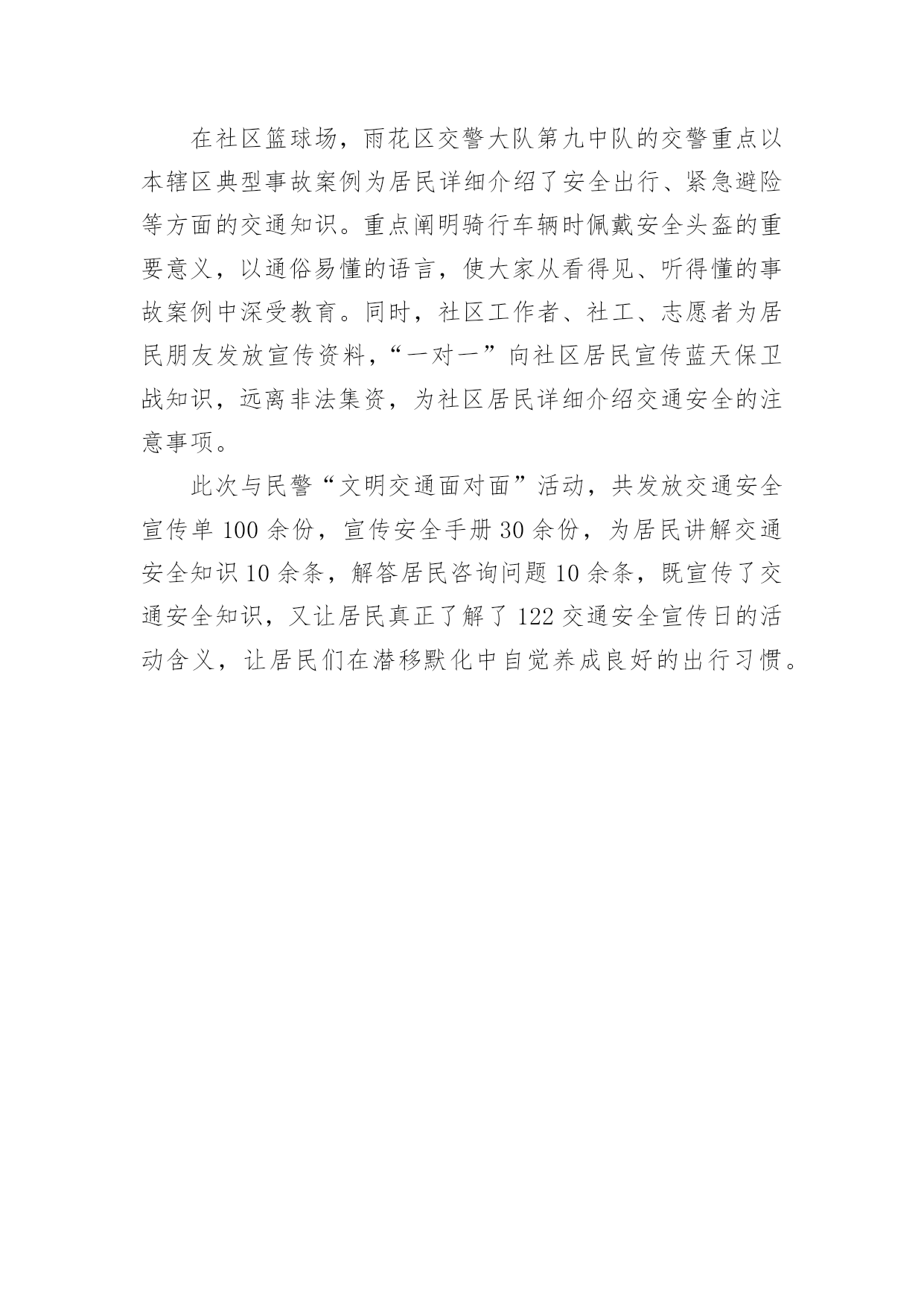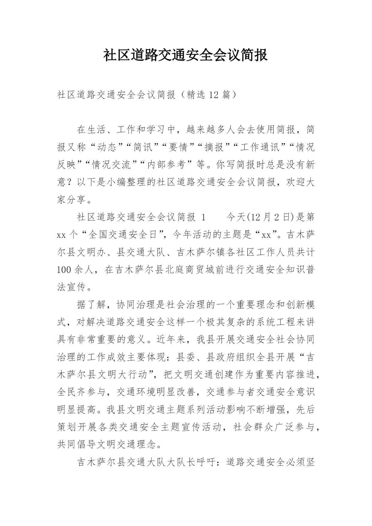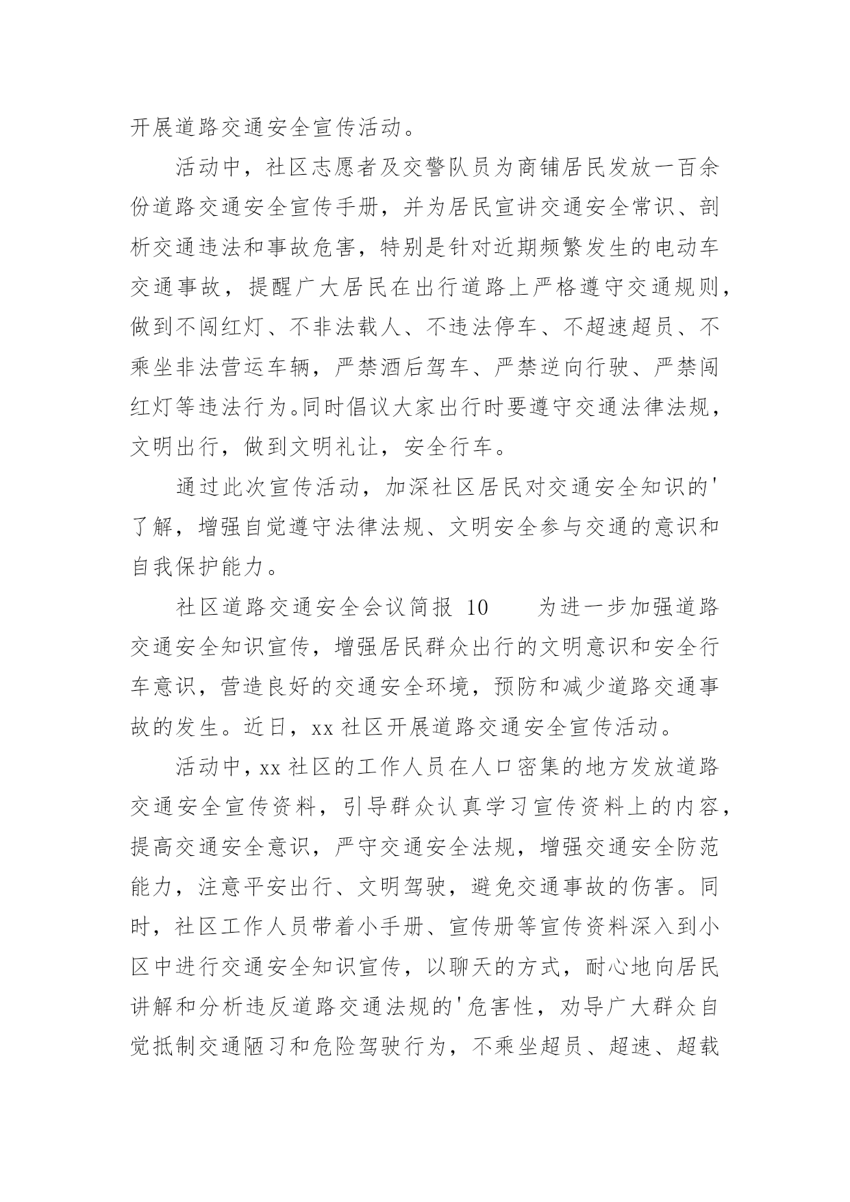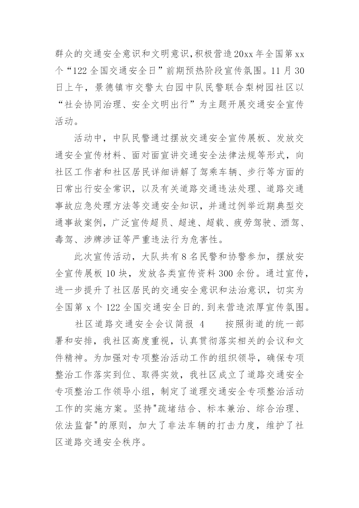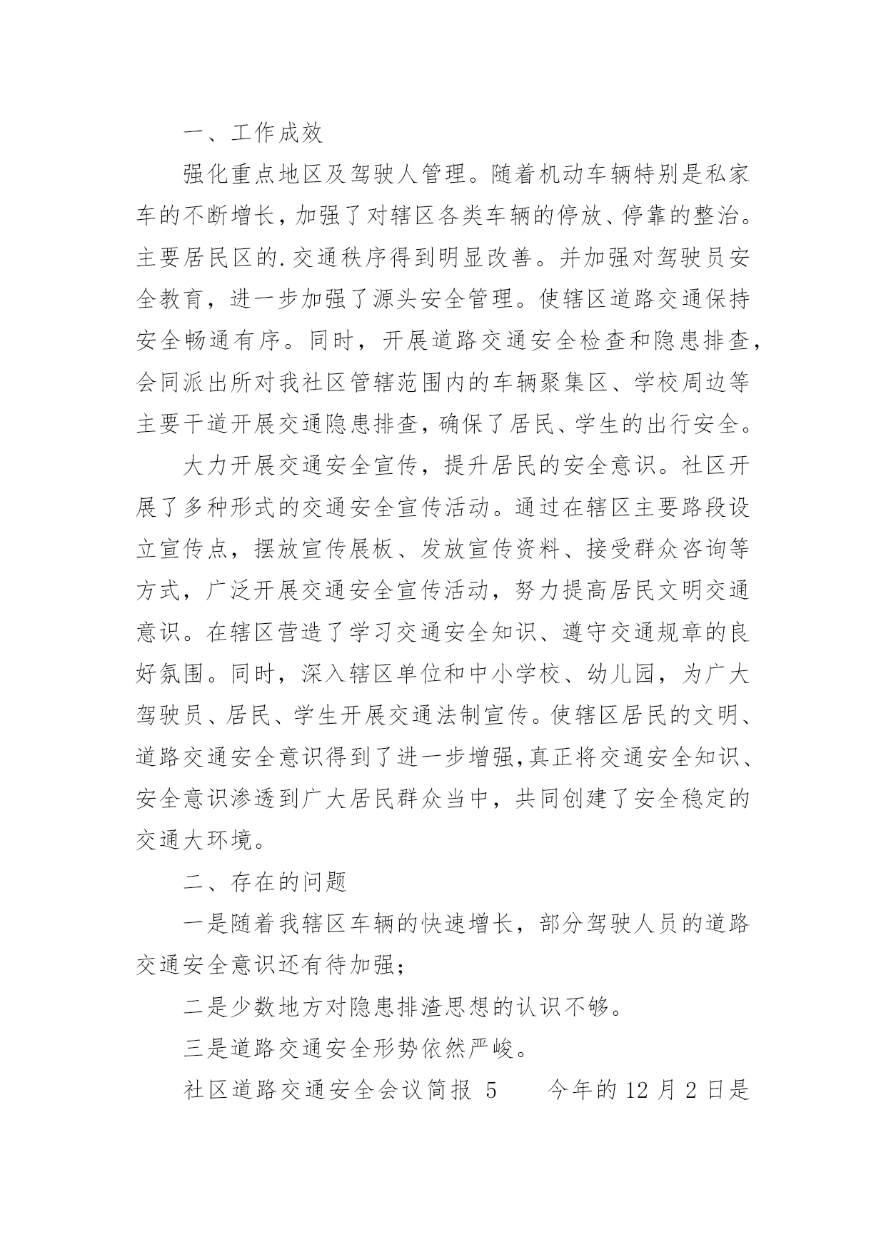 社区道路交通安全会议简报社区道路交通安全会议简报(精选12篇)在生活、工作和学习中,越来越多人会去使用简报,简报又称“动态”“简讯”“要情”“摘报”“工作通讯”“情况反映”“情况交流”“内部参考”等。你写简报时总是没有新意?以下是小编整理的社区道路交通安全会议简报,欢迎大家分享。社区道路交通安全会议简报1今天(12月2日)是第xx个“全国交通安全日”,今年活动的主题是“xx”。吉木萨尔县文明办、县交通大队、吉木萨尔镇各社区工作人员共计100余人,在吉木萨尔县北庭商贸城前进行交通安全知识普法宣传。据了解,协同治理是社会治理的一个重要理念和创新模式,对解决道路交通安全这样一个极其复杂的系统工程来讲具有非常重要的意义。近年来,我县开展交通安全社会协同治理的工作成效主要体现:县委、县政府组织全县开展“吉木萨尔县文明大行动”,把文明交通创建作为重要内容推进,全民齐参与,交通环境明显改善,交通参与者交通安全意识明显提高。我县文明交通主题系列活动影响不断增强,先后策划开展各类交通安全主题宣传活动,社会群众广泛参与,共同倡导文明交通理念。吉木萨尔县交通大队大队长呼吁:道路交通安全必须坚持生命至上、安全第一的原则,实行依法治理、社会共治、全民参与,实现责任共担、风险共治、安全共享。道路交通安全关系到每一个人的生命、人身和公私财产的安全,因此也需要每个人的'关心、支持和行动。我们必须在全社会营造人人守法的良好风尚和习惯,每个人都要牢固地树立规则意识,自觉地遵守道路交通规则。参与宣传活动的满城路社区干部小思说:“只有每个人都遵守规则,才会有良好的交通秩序,有秩序才会有安全,才会有畅通,也才能实现交通的.公平性。”本次宣传活动通过现场宣讲、发放宣传单、为居民“1对1讲解”等方式,让居民树立自觉抵制危险驾驶行为、摒弃交通陋习,共同维护吉木萨尔县道路交通安全。社区道路交通安全会议简报2为全面提高全民交通安全意识、法制意识、文明意识。在第xx个“全国交通安全日”来临之际,欢喜街道联合社区开展了以“社会协同治理、安全文明出行”为主题的全国交通文明行动宣传活动。社区工作人员向居民和机动车驾驶人发放交通安全、驾驶安全等宣传资料,宣传交通安全和文明出行知识,对“开车不系安全带、开车接打电话、穿高跟鞋开车、车内挂装饰物、车辆随意超车、并线”等不文明行车现象进行了大力宣传。此次活动不仅提升了个人文明出行,而且让参加活动的每个人在主观意识上更加重视、遵守交通安全。社区道路交通安全会议简报3为进一步增强社区群众的交通安全意识和文明意识,积极营造20xx年全国第xx个“122全国交通安全日”前期预热阶段宣传氛围。11月30日上午,景德镇市交警太白园中队民警联合梨树园社区以“社会协同治理、安全文明出行”为主题开展交通安全宣传活动。活动中,中队民警通过摆放交通安全宣传展板、发放交通安全宣传材料、面对面宣讲交通安全法律法规等形式,向社区工作者和社区居民详细讲解了驾乘车辆、步行等方面的日常出行安全常识,以及有关道路交通违法处理、道路交通事故应急处理方法等交通安全知识,并通过例举近期典型交通事故案例,广泛宣传超员、超速、超载、疲劳驾驶、酒驾、毒驾、涉牌涉证等严重违法行为危害性。此次宣传活动,大队共有8名民警和协警参加,摆放安全宣传展板10块,发放各类宣传资料300余份。通过宣传,进一步提升了社区居民的交通安全意识和法治意识,切实为全国第x个122全国交通安全日的.到来营造浓厚宣传氛围。社区道路交通安全会议简报4按照街道的统一部署和安排,我社区高度重视,认真贯彻落实相关的会议和文件精神。为加强对专项整治活动工作的组织领导,确保专项整治工作落实到位、取得实效,我社区成立了道路交通安全专项整治工作领导小组,制定了道理交通安全专项整治活动工作的实施方案。坚持"疏堵结合、标本兼治、综合治理、依法监督"的原则,加大了非法车辆的打击力度,维护了社区道路交通安全秩序。一、工作成效强化重点地区及驾驶人管理。随着机动车辆特别是私家车的不断增长,加强了对辖区各类车辆的停放、停靠的整治。主要居民区的.交通秩序得到明显改善。并加强对驾驶员安全教育,进一步加强了源头安全管理。使辖区道路交通保持安全畅通有序。同时,开展道路交通安全检查和隐患排查,会同派出所对我社区管辖范围内的车辆聚集区、学校周边等主要干道开展交通隐患排查,确保了居民、学生的出行安全。大力开展交通安全宣传,提升居民的安全意识。社区开展了多种形式的交通安全宣传活动。通过在辖区主要路段设立宣传点,摆放宣传展板、发放宣传资料、接受群众咨询等方式,广泛开展交通安全宣传活动,努力提高居民文明交通意识。在辖区营造了学习交通安全知识、遵守交通规章的良好氛围。同时,深入辖区单位和中小学校、幼儿园,为广大驾驶员、居民、学生开展交通法制宣传。使辖区居民的文明、道路