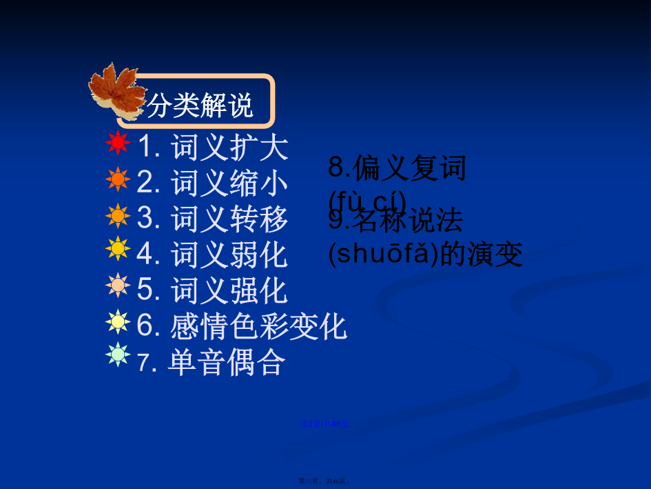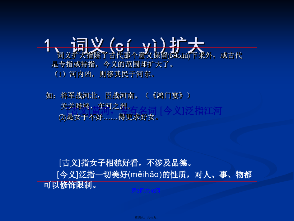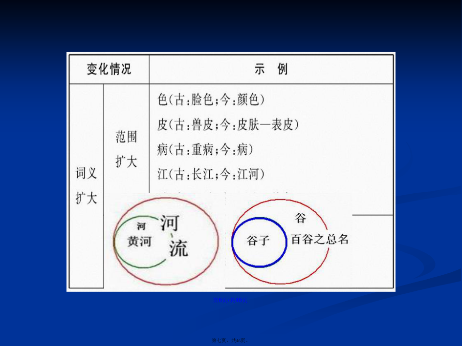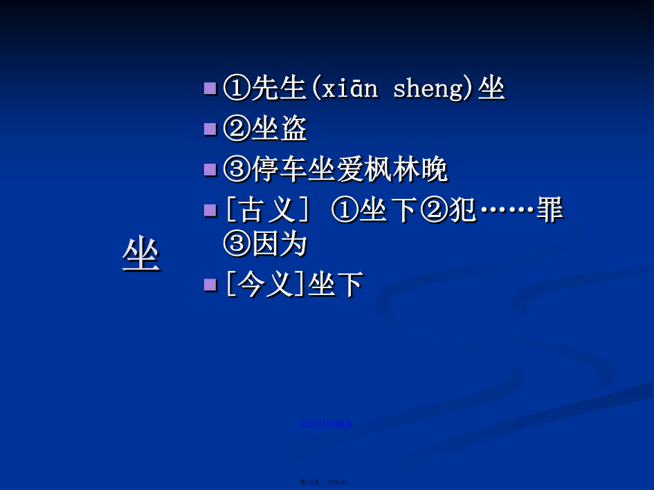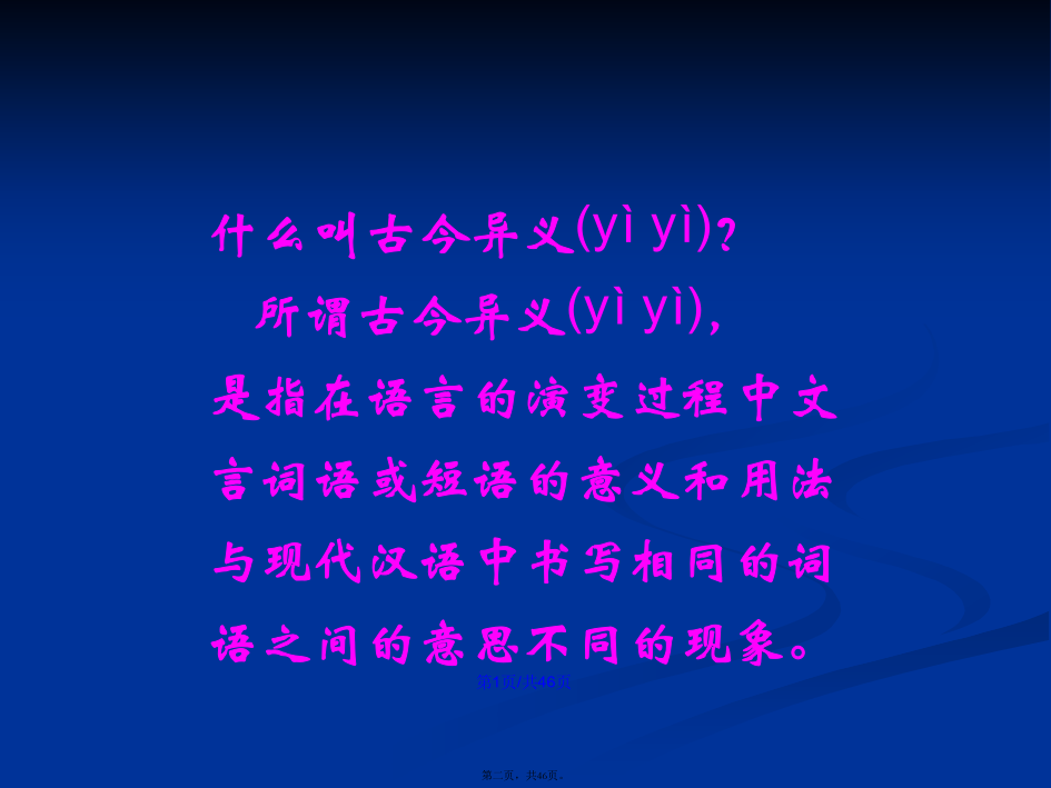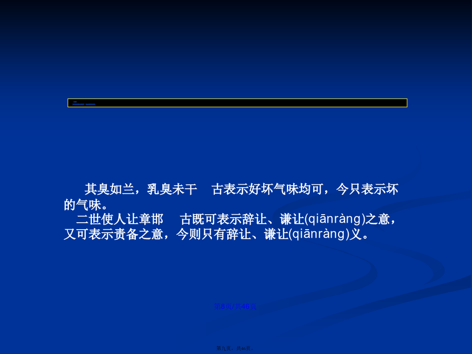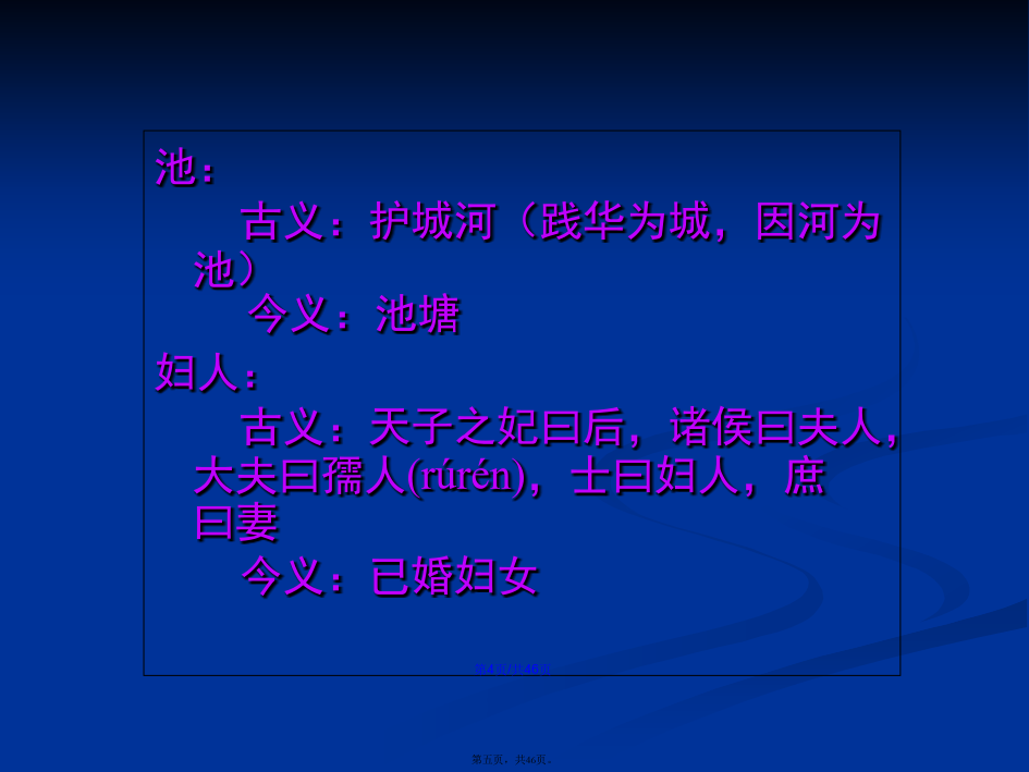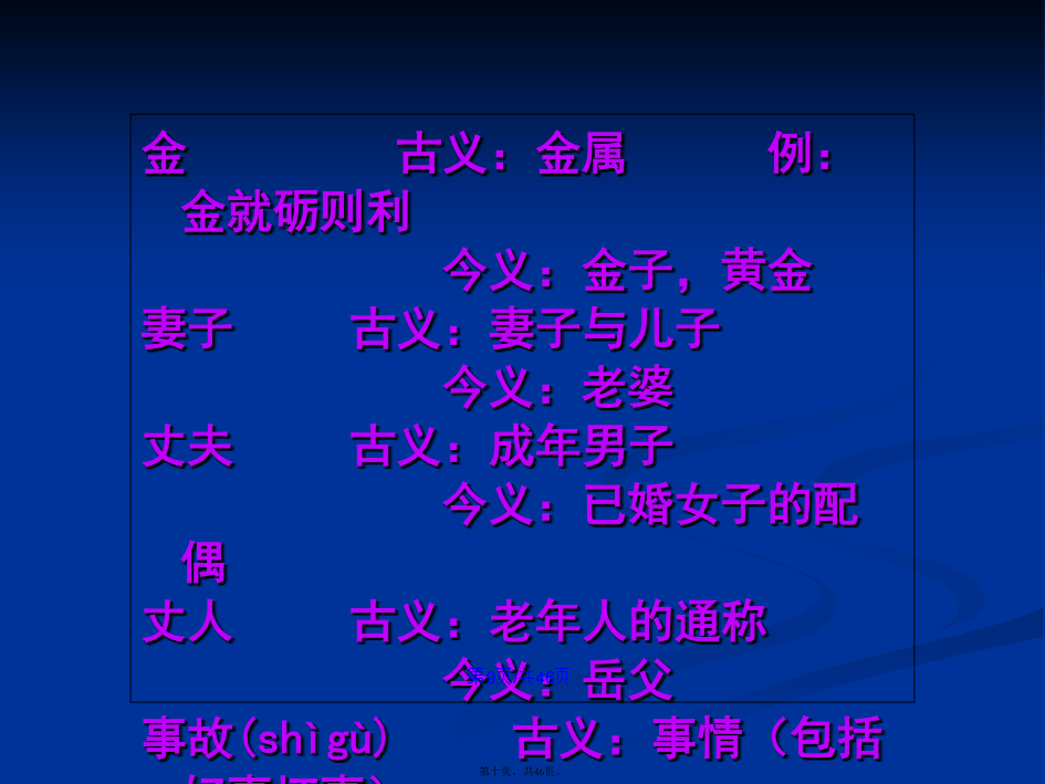 会计学什么叫古今异义(yìyì)?所谓古今异义(yìyì),是指在语言的演变过程中文言词语或短语的意义和用法与现代汉语中书写相同的词语之间的意思不同的现象。1、词义(cíyì)扩大池:古义:护城河(践华为城,因河为池)今义:池塘妇人:古义:天子之妃曰后,诸侯曰夫人,大夫曰孺人(rúrén),士曰妇人,庶曰妻今义:已婚妇女坐/1.解释下列(xiàliè)各句中下划线词语的古今意义和用法。(1)秦以虎狼之势,与中国抗衡。古义:中原地区。今义:中华人民共和国。(2)弟走从军阿姨死,暮去朝来颜色故。古义:母亲。今义:晚辈对任何女性长辈的亲切称呼。(3)一日不见,如隔三秋古义:秋季。今义:一年。2、词义缩小顾名思义,就是词的涵义或表达的范围(fànwéi)缩小了。如由泛指演变为专指等。金古义:金属例:金就砺则利今义:金子,黄金妻子古义:妻子与儿子今义:老婆丈夫古义:成年男子今义:已婚女子的配偶丈人古义:老年人的通称今义:岳父事故(shìgù)古义:事情(包括好事坏事)今义:意外的不幸。1)率妻子邑人来此绝境(juéjìng)2)古之学者必有师3)思厥先祖父,暴霜露,斩荆棘终日不成章,泣涕零如雨:古代指眼泪,现在指鼻涕;故旧(gùjiù)不遗,则民不偷:古代指苟且、马虎、刻薄、不厚道,今义转移为偷窃。汤:古代本义为”热水”,今则菜汤、米汤等。闻古义:耳朵听见今义:鼻子闻到烈士古义:坚贞不屈的刚强之士,有志建功立业之人(烈士暮年,壮心不已)今义:为正义事业而牺牲的人穷古义:处境困难(穷且益坚)今义:经济贫穷(pínqióng)狱古义:案件(文字狱,小大之狱,虽不能查)今义:监狱解释下列词语的古今意义。①所以遣将守关者,备他盗之出入与非常也。古义:意外的变故或不平常。今义:副词,表程度②微察公子,公子颜色愈和。古义:容颜、脸色。今义:色彩。③秋天漠漠向昏黑古义:秋日的天空。今义:秋季。④上初即位,富于春秋(fùyúchūnqiū)古义:年岁、年龄。今义:春天和秋天。⑤行李之往来,共其乏困古义:外交使者。今义:出门时带的包裹。4、词义弱化所谓(suǒwèi)“词义弱化”,就是指同样的词语,在古代时所表示的语义较强,而今天所表示的语义则较弱。解释下列(xiàliè)下划线词语的古今意义。①未尝有坚明约束者古义:盟约。今义:限制。②戍卒叫,函谷举,楚人一炬,可怜焦土古义:攻克。今义:抬起。③兔走触株,折颈而死古义:跑。今义:行走。5、词义强化所谓(suǒwèi)“词义强化”,就是指同样的词语在古代表示的意义较弱,而今天所表示的语义增强了。解释下列下划线词语的古今意义。①同志(tóngzhì)者不远千里而致古:志同道合的人今:革命群众的互称②烈士暮年,壮心不已古:表示刚直侠义之人今:表示为正义牺牲的人③(廉颇)宣言曰:“我见相如,必辱之。”古:扬言今:宣告,声明。④璧有瑕,请指示王古:指给人看今:表示上对下申明处理问题的原则和方法。⑤率妻子邑人来此绝境古:与外界隔绝之地今:没有出路的困境。6、感情色彩变化(biànhuà)有些词语在应用的过程中,感情色彩逐步发生了变化(biànhuà),要么由“褒”变“贬”,要么由“中性词”变为“褒义词”或“贬义词”。/1)先帝不以臣卑鄙2)牺牲(xīshēng)玉帛,弗敢专也3)上食埃土,下饮黄泉,用心一也7、单音偶合指两个单音节的词语放在一起刚好(gānghǎo)和现代汉语中的双音节词形式相同,但意思不同的情况。1)虽曰爱之,其实害之2)其闻道也固先乎吾,吾从而(cóngér)师之3)中间力拉崩倒之声4)吾社之行为士先者,为之声义8、名称说法的演变有些时候古文中用一个词表示某一意思(yìsī),而现代汉语中已不再使用该词语表示,而是换用别的词语表示了目现换成“眼睛”寡现换用“少”足现换用“脚”读书欲睡,引锥刺其股。愿为市鞍马。多谢后世人,戒之慎勿忘。找出下列(xiàliè)各句中的古今异义词,并解释:①东家有好女,可怜体无比②牺牲玉帛,弗敢加也③天下云集响应④未尝有坚明约束者⑤戊卒叫,函谷举,楚人一炬,可怜焦土⑥秦以虎狼之势,与中国抗衡(kànghéng)。⑦弟走从军阿姨死,暮去朝来颜色故。⑧沛公居山东时⑨率妻子邑人来此绝境(10)行李(xíngli)之往来,共其乏困(11)璧有瑕,请指示王(12)读书欲睡,引锥刺其股(13)多谢(duōxiè)后世人,戒之慎勿忘综合练习1、下列各句中词义与现代汉语意义相同的一项是()A至于颠覆,理固宜然B由是感激(gǎnjī),遂许先帝