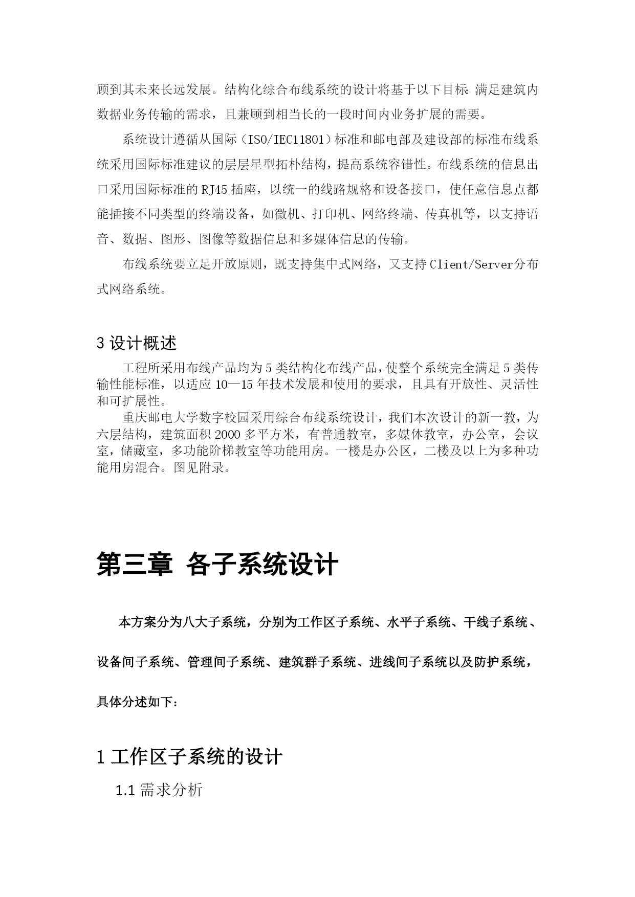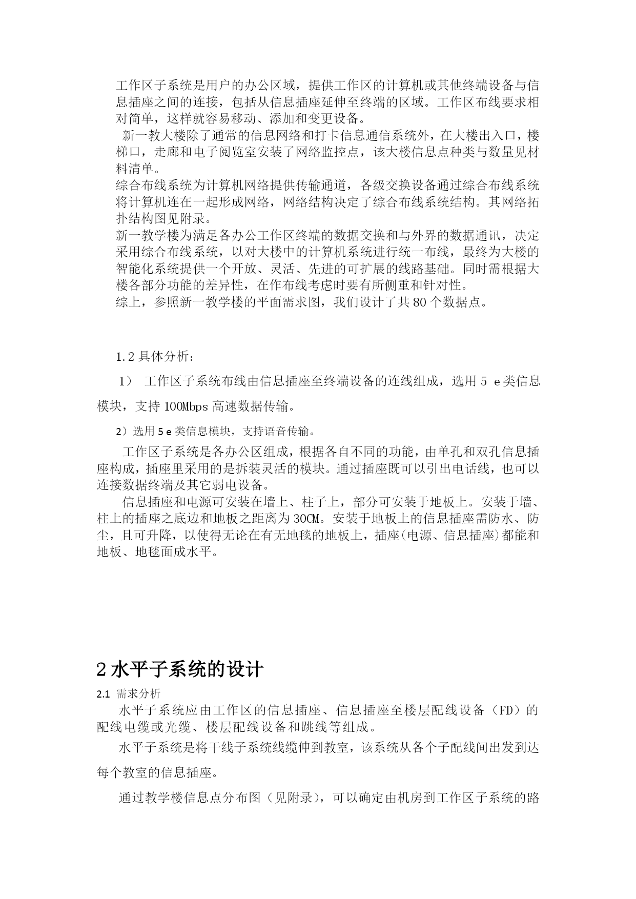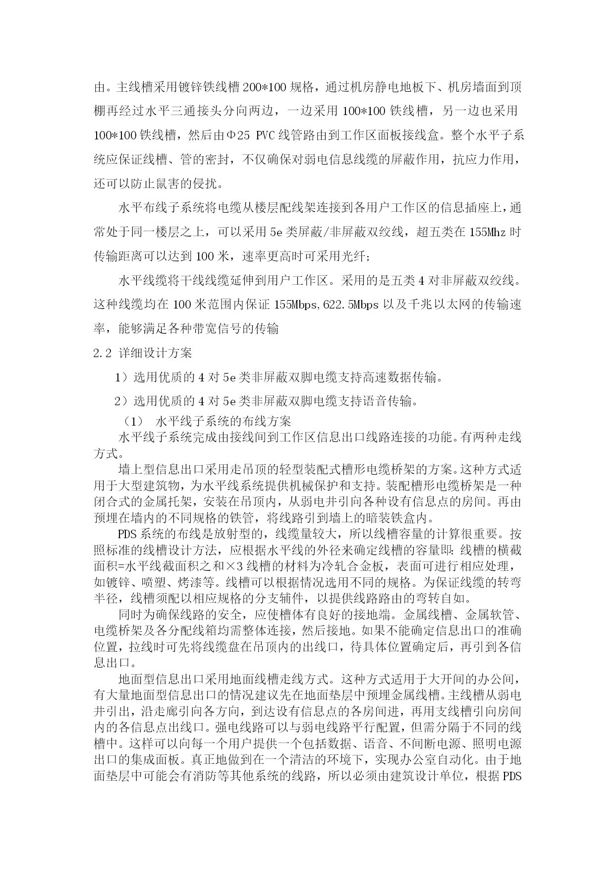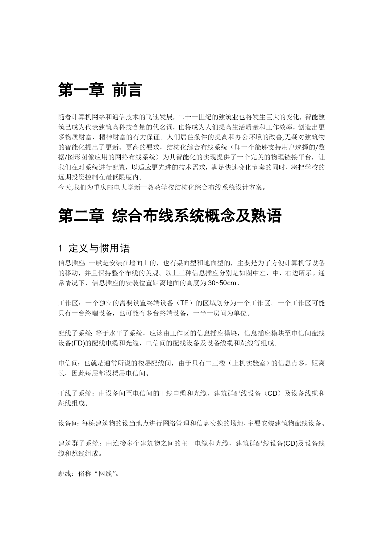 重庆邮电大学综合布线课程设计报告项目名称:国际学院综合布线系统方案专业:电子信息工程班级/小组:组长:成员:指导教师:2012年6月成员分工情况XX:图纸的绘制,表格的制作。XX:设计方案的制作目录前言------------------------------------------------------4综合布线系统概念及熟语--------------------------42.1定义与惯用语--------------------------------------42.2综合布线系统概念---------------------------------52.3设计概述----------------------------------------------6第三章各子系统设计------------------------------------------63.1工作区子系统的设计-----------------------------63.2水平子系统的设计--------------------------------83.3垂直干线子系统的设计-------------------------93.4建筑群子系统设计-------------------------------93.5设备间子系统设计-------------------------------103.6布线系统总体结构-------------------------------11第四章费用及材料清单-------------------------------------11附录图纸--------------------------------------------------------12参考文献目录-------------------------------------------------17第一章前言随着计算机网络和通信技术的飞速发展,二十一世纪的建筑业也将发生巨大的变化,智能建筑已成为代表建筑高科技含量的代名词,也将成为人们提高生活质量和工作效率,创造出更多物质财富、精神财富的有力保证。人们居住条件的提高和办公环境的改善,无疑对建筑物的智能化提出了更新、更高的要求,结构化综合布线系统(即一个能够支持用户选择的/数据/图形图像应用的网络布线系统)为其智能化的实现提供了一个完美的物理链接平台,让我们在对系统进行配置,以适应更先进的技术需求,满足快速变化节奏的同时,将把学校的远期投资控制在最低限度内。今天,我们为重庆邮电大学新一教教学楼结构化综合布线系统设计方案。第二章综合布线系统概念及熟语1定义与惯用语信息插座:一般是安装在墙面上的,也有桌面型和地面型的,主要是为了方便计算机等设备的移动,并且保持整个布线的美观。以上三种信息插座分别是如图中左、中、右边所示。通常情况下,信息插座的安装位置距离地面的高度为30~50cm。工作区:一个独立的需要设置终端设备(TE)的区域划分为一个工作区。一个工作区可能只有一台终端设备,也可能有多台终端设备,一半一房间为单位。配线子系统:等于水平子系统,应该由工作区的信息插座模块,信息插座模块至电信间配线设备(FD)的配线电缆和光缆,电信间的配线设备及设备线缆和跳线等组成。电信间:也就是通常所说的楼层配线间,由于只有二三楼(上机实验室)的信息点多,距离长,因此每层都设楼层电信间。干线子系统:由设备间至电信间的干线电缆和光缆,建筑群配线设备(CD)及设备线缆和跳线组成。设备间:每栋建筑物的设当地点进行网络管理和信息交换的场地,主要安装建筑物配线设备。建筑群子系统:由连接多个建筑物之间的主干电缆和光缆,建筑群配线设备(CD)及设备线缆和跳线组成。跳线:俗称“网线”。通信布线槽:布线槽就是凹形有盖或无盖的金属体或塑料体,中空,穿线用的!适配器:适配器是英语Adapter/adaptor的汉语翻译。适配器就是一个接口HYPERLINK"http://baike.baidu.com/view/110440.htm"\t"_blank"转换器,它可以是一个独立的硬件接口设备,允许HYPERLINK"http://baike.baidu.com/view/25278.htm"\t"_blank"硬件或电子接口与其它硬件或电子接口相连,也可以是信息接口。比如:电源适配器、三角架基座转接部件、USB与HYPERLINK"http://baike.baidu.com/view/69108.htm"\t"_blank"