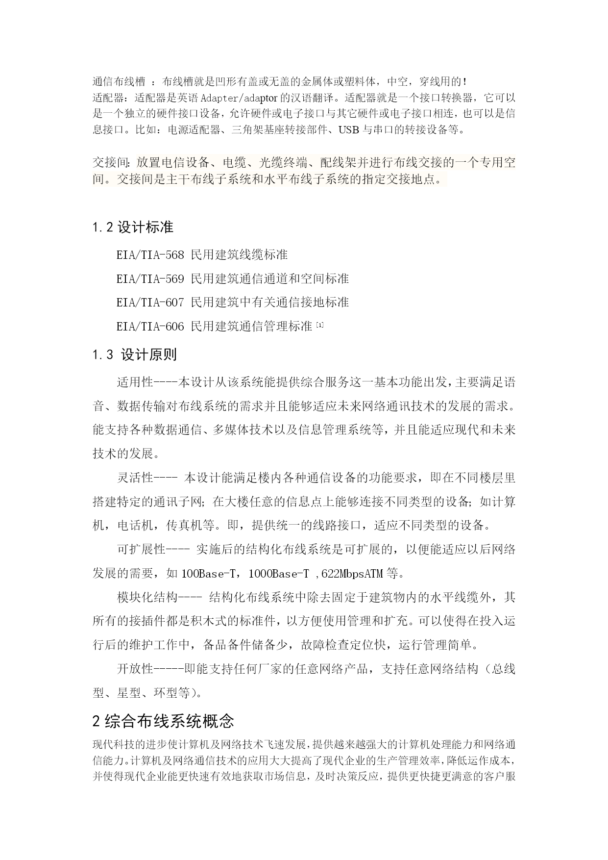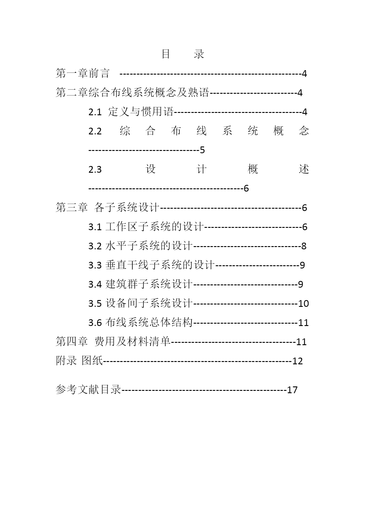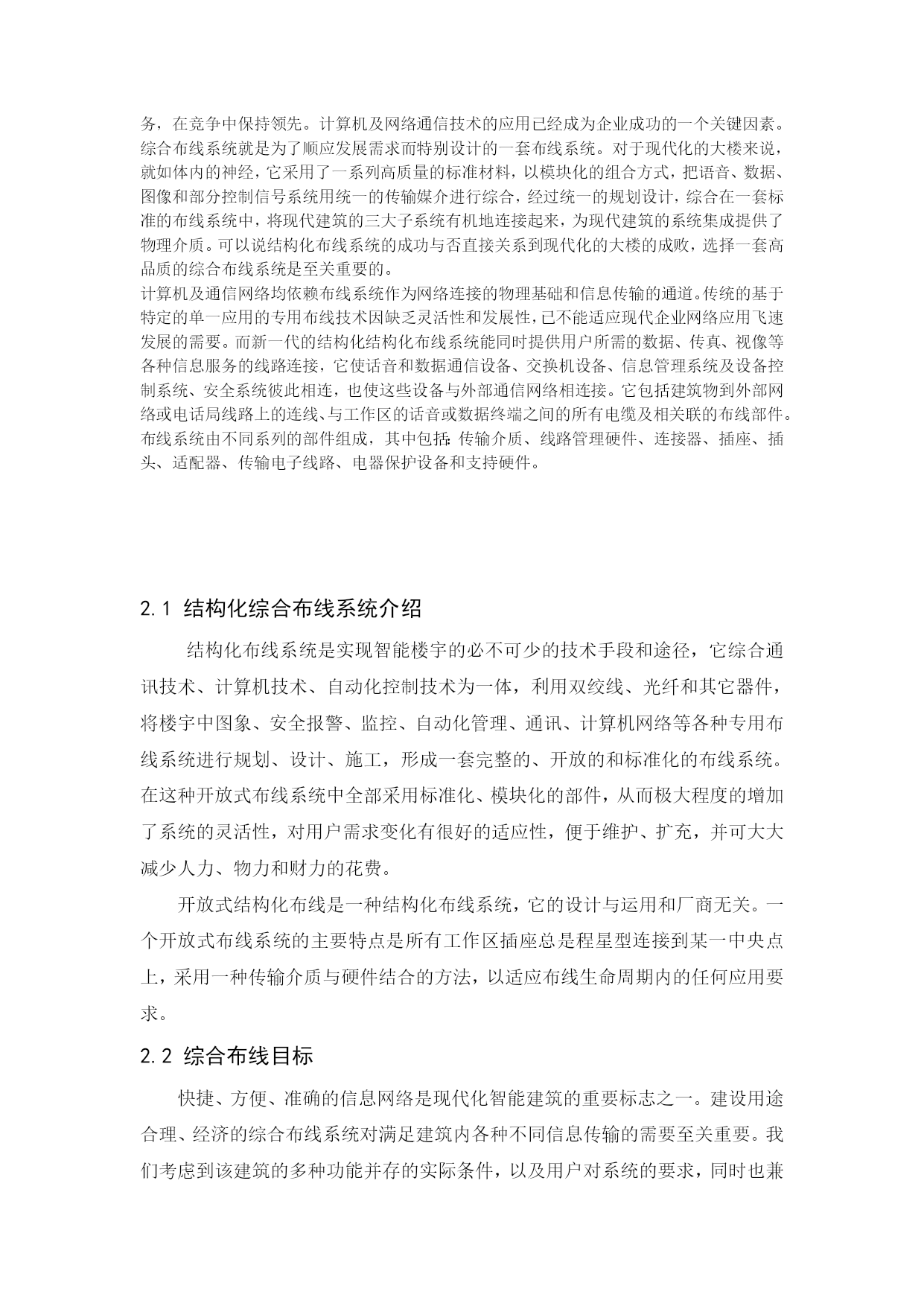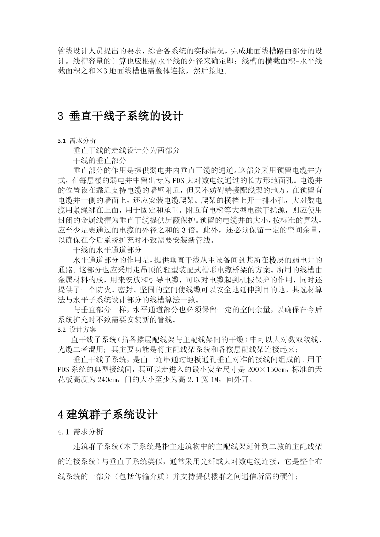重庆邮电大学综合布线课程设计报告项目名称:国际学院综合布线系统方案专业:电子信息工程班级/小组:组长:成员:指导教师:2012年6月成员分工情况XX:图纸的绘制,表格的制作。XX:设计方案的制作目录前言------------------------------------------------------4综合布线系统概念及熟语--------------------------42.1定义与惯用语--------------------------------------42.2综合布线系统概念---------------------------------52.3设计概述----------------------------------------------6第三章各子系统设计------------------------------------------63.1工作区子系统的设计-----------------------------63.2水平子系统的设计--------------------------------83.3垂直干线子系统的设计-------------------------93.4建筑群子系统设计-------------------------------93.5设备间子系统设计-------------------------------103.6布线系统总体结构-------------------------------11第四章费用及材料清单-------------------------------------11附录图纸--------------------------------------------------------12参考文献目录-------------------------------------------------17第一章前言随着计算机网络和通信技术的飞速发展,二十一世纪的建筑业也将发生巨大的变化,智能建筑已成为代表建筑高科技含量的代名词,也将成为人们提高生活质量和工作效率,创造出更多物质财富、精神财富的有力保证。人们居住条件的提高和办公环境的改善,无疑对建筑物的智能化提出了更新、更高的要求,结构化综合布线系统(即一个能够支持用户选择的/数据/图形图像应用的网络布线系统)为其智能化的实现提供了一个完美的物理链接平台,让我们在对系统进行配置,以适应更先进的技术需求,满足快速变化节奏的同时,将把学校的远期投资控制在最低限度内。今天,我们为重庆邮电大学新一教教学楼结构化综合布线系统设计方案。第二章综合布线系统概念及熟语1定义与惯用语信息插座:一般是安装在墙面上的,也有桌面型和地面型的,主要是为了方便计算机等设备的移动,并且保持整个布线的美观。以上三种信息插座分别是如图中左、中、右边所示。通常情况下,信息插座的安装位置距离地面的高度为30~50cm。工作区:一个独立的需要设置终端设备(TE)的区域划分为一个工作区。一个工作区可能只有一台终端设备,也可能有多台终端设备,一半一房间为单位。配线子系统:等于水平子系统,应该由工作区的信息插座模块,信息插座模块至电信间配线设备(FD)的配线电缆和光缆,电信间的配线设备及设备线缆和跳线等组成。电信间:也就是通常所说的楼层配线间,由于只有二三楼(上机实验室)的信息点多,距离长,因此每层都设楼层电信间。干线子系统:由设备间至电信间的干线电缆和光缆,建筑群配线设备(CD)及设备线缆和跳线组成。设备间:每栋建筑物的设当地点进行网络管理和信息交换的场地,主要安装建筑物配线设备。建筑群子系统:由连接多个建筑物之间的主干电缆和光缆,建筑群配线设备(CD)及设备线缆和跳线组成。跳线:俗称“网线”。通信布线槽:布线槽就是凹形有盖或无盖的金属体或塑料体,中空,穿线用的!适配器:适配器是英语Adapter/adaptor的汉语翻译。适配器就是一个接口HYPERLINK"http://baike.baidu.com/view/110440.htm"\t"_blank"转换器,它可以是一个独立的硬件接口设备,允许HYPERLINK"http://baike.baidu.com/view/25278.htm"\t"_blank"硬件或电子接口与其它硬件或电子接口相连,也可以是信息接口。比如:电源适配器、三角架基座转接部件、USB与HYPERLINK"http://baike.baidu.com/view/69108.htm"\t"_blank"