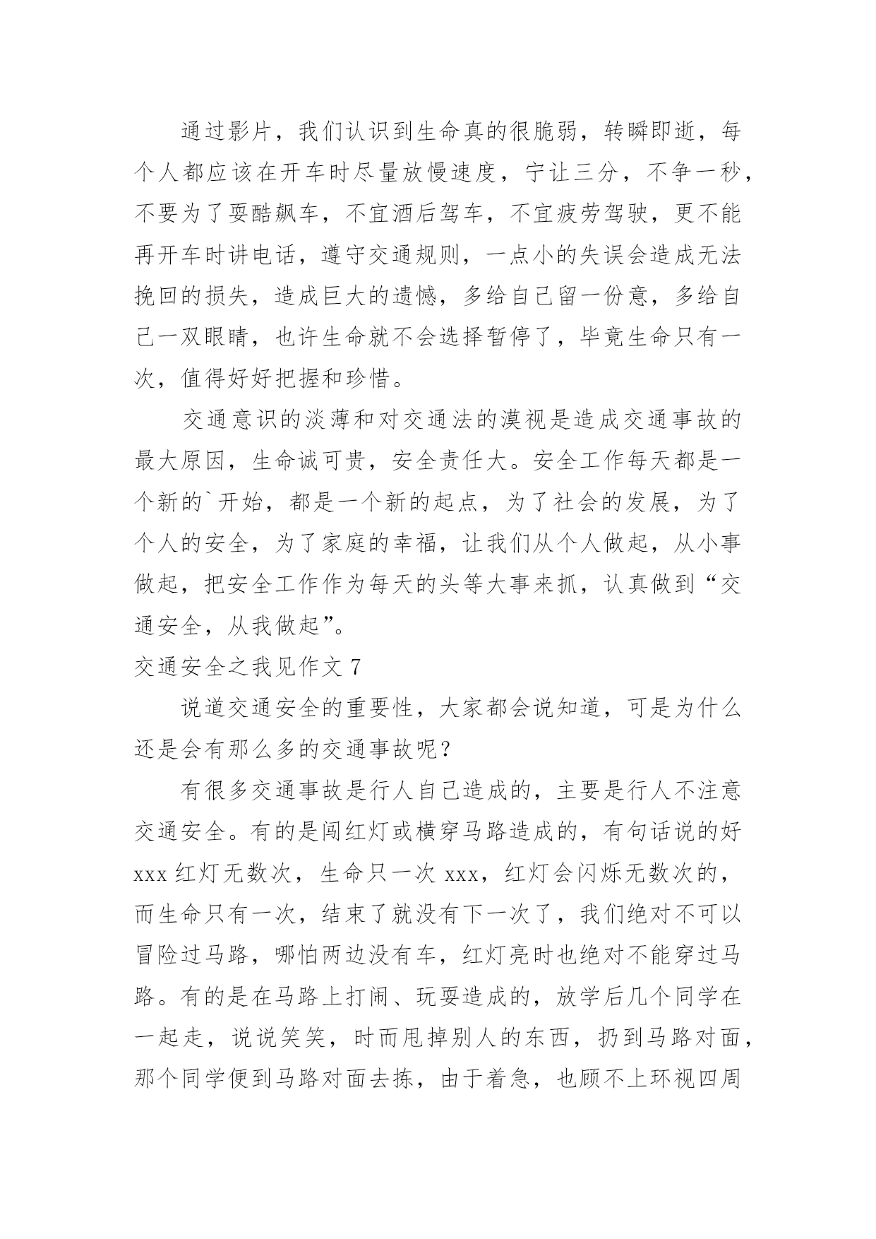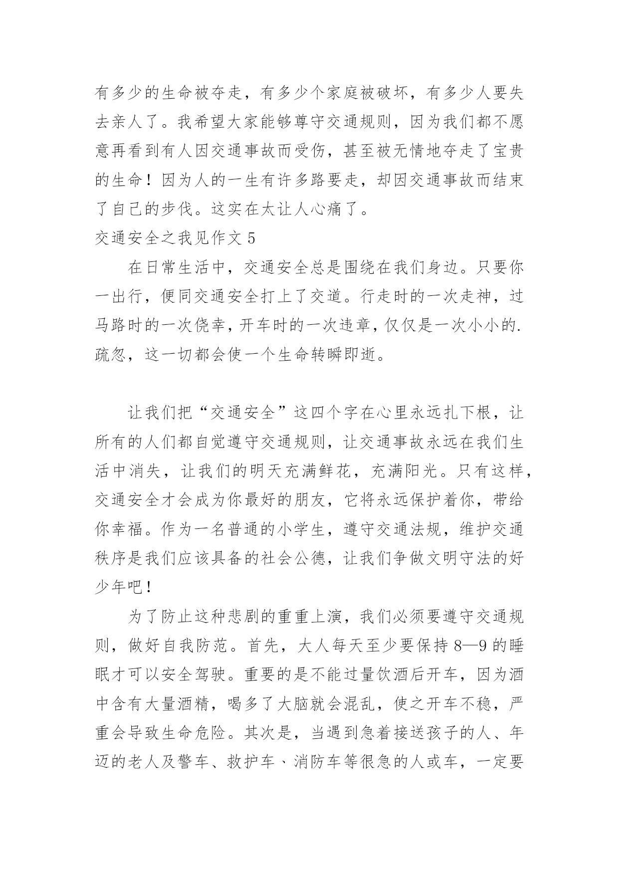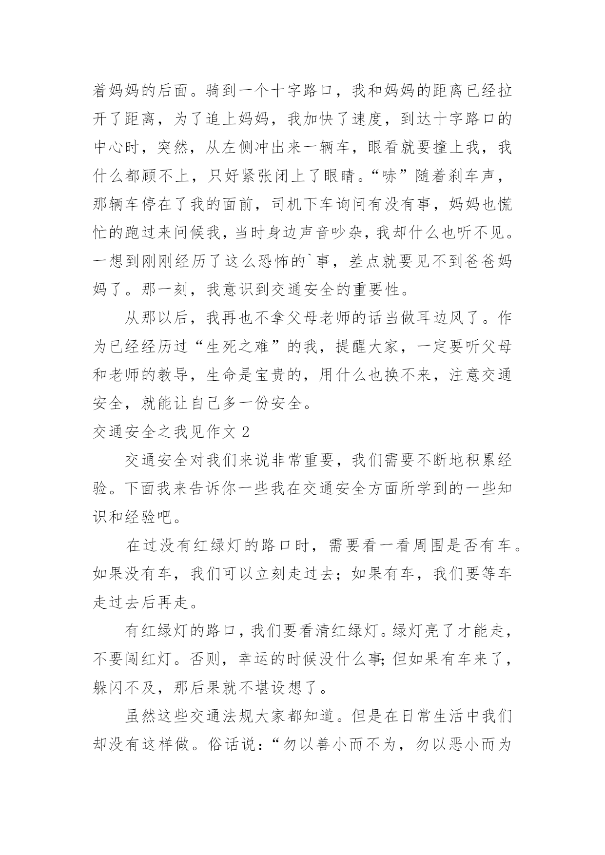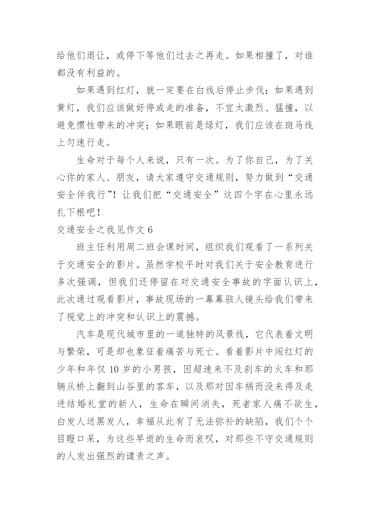 交通安全之我见作文交通安全之我见作文(7篇)在学习、工作、生活中,大家都尝试过写作文吧,借助作文可以提高我们的语言组织能力。你知道作文怎样才能写的好吗?以下是小编整理的交通安全之我见作文,欢迎大家分享。交通安全之我见作文1从小我对交通安全方面的知识很薄弱,只知道红灯停,绿灯行,过马路要走斑马线这些连三岁小孩都懂的事。虽然交通安全父母和老师经常会提起,但我每次都当做耳边风,左耳进,右耳出。甚至有些反感他们总是念叨这些。现在想想,要不是以前一直把他们的话当做耳边风,也不会差点命丧黄泉了。记得有一次,我和同学一起出去逛街。准备过马路时,我发现绿灯的时间只剩几秒了,一想再等必定又要等很久,我便因为贪图一时拉着同学朝马路对面飞奔而去。可就在我们跑到一半时,红灯亮了。一辆小轿车就我们身后驶过,凉风久久没有散去,吹到我身上,顿时,我的冷汗豆大豆大往下落。连现在想起来都有点心有余悸。从那以后,我每次过马路都小心翼翼,深怕又有一辆轿车突然驶出来。不过,好景不长,过了一段时间,我便忘了这个教训。又有一次我骑车和妈妈出去玩,妈妈骑车在前面,我跟着妈妈的后面。骑到一个十字路口,我和妈妈的距离已经拉开了距离,为了追上妈妈,我加快了速度,到达十字路口的中心时,突然,从左侧冲出来一辆车,眼看就要撞上我,我什么都顾不上,只好紧张闭上了眼睛。“哧”随着刹车声,那辆车停在了我的面前,司机下车询问有没有事,妈妈也慌忙的跑过来问候我,当时身边声音吵杂,我却什么也听不见。一想到刚刚经历了这么恐怖的`事,差点就要见不到爸爸妈妈了。那一刻,我意识到交通安全的重要性。从那以后,我再也不拿父母老师的话当做耳边风了。作为已经经历过“生死之难”的我,提醒大家,一定要听父母和老师的教导,生命是宝贵的,用什么也换不来,注意交通安全,就能让自己多一份安全。交通安全之我见作文2交通安全对我们来说非常重要,我们需要不断地积累经验。下面我来告诉你一些我在交通安全方面所学到的一些知识和经验吧。在过没有红绿灯的路口时,需要看一看周围是否有车。如果没有车,我们可以立刻走过去;如果有车,我们要等车走过去后再走。有红绿灯的路口,我们要看清红绿灯。绿灯亮了才能走,不要闯红灯。否则,幸运的时候没什么事;但如果有车来了,躲闪不及,那后果就不堪设想了。虽然这些交通法规大家都知道。但是在日常生活中我们却没有这样做。俗话说:“勿以善小而不为,勿以恶小而为之。”例如一次《齐鲁晚报》上报道的“宝马撞人案”,我认为“宝马”车主太小气、太“野蛮”了。一个行人不慎把葱挂在他的车上,而且事后还向他赔礼道歉,但他却故意把这个行人撞伤。就算没有人受伤,他也不该报复,应该通过法律来处理才对。有些交通事故是因为司机酒后驾车,因神志不清导致交通事故,在此提醒司机叔叔阿姨们,希望您在开车前少喝酒,不要逞能。如果喝酒了,就要坐公交车或出租车回家,避免交通事故给您和他人带来麻烦。有的交通事故是行人或车辆闯红灯造成的,有的是行人横穿马路造成的,还有的是翻越护栏造成的'。前人发明红绿灯是有原因的,大家不要怕麻烦。红灯会闪烁无数次,而生命只有一次,用完了就没有下一次了。在红灯没有灭的时候,我们绝对不可以冒险过马路,哪怕两边没有车,也不能穿过马路。让我们不断地掌握更多的交通安全知识,时刻遵守交通规则,做一名遵守交通的小学生吧。交通安全之我见作文3上帝即是公平的,也是吝啬的,他只给予每个在地球上的生物1次生命,所以我们一定要好好爱护自己的生命,但是,随着经济繁荣的发展,交通事业发达,车辆不停在公路上行驶,时常走进我们的生活,直接面对,而无法避免。因此,交通安全,人人须知。同学们,我们应该注意以下几点。1、乘坐公共车辆,应该遵守公共秩序,讲究社会公德,注意交通安全。2、候车时,应依次排队,站在道路边或站台上等候,不应拥挤在车行道上。3、上车时,应等汽车靠站停稳,先让车上的乘客下完车,再按次序上车,不能争先恐后。4、乘车时不要把身体的任何部位伸出手窗外,以免被对面来车或路边树木等刮伤;也不要向车窗外乱扔杂物,以免伤及他人。乘车时还要坐稳扶好,最好是系上安全带以免车辆紧急刹车时摔倒受伤。5、上学、放学和外出活动要保证安全,要遵守交通规则,做到“绿灯行,红灯停”。同学们,如果你们没有记住以上几点,上帝是不会给予任何人第2次生命的!每年,有多少的生命被夺走!有多少个家庭被破坏!有多少人要失去亲人了!如果我们每个人心中都有交通规则,每个人都能自觉遵守交通规则。我相信一定可以避免很多悲惨的。遵守交通规则就是珍爱生命!!人让车,让出一片温情,让出一片秩序;车让人,让出一片安全,让出一片理解。在这个世界上,只要人和车互相谦让,才能尽可能地避免的`发生,减少死亡的人数,珍爱宝贵的生命。请大家一定要爱惜生命!让我们在安全的包围下快乐、健康地成长,建设自己美丽的家园。我