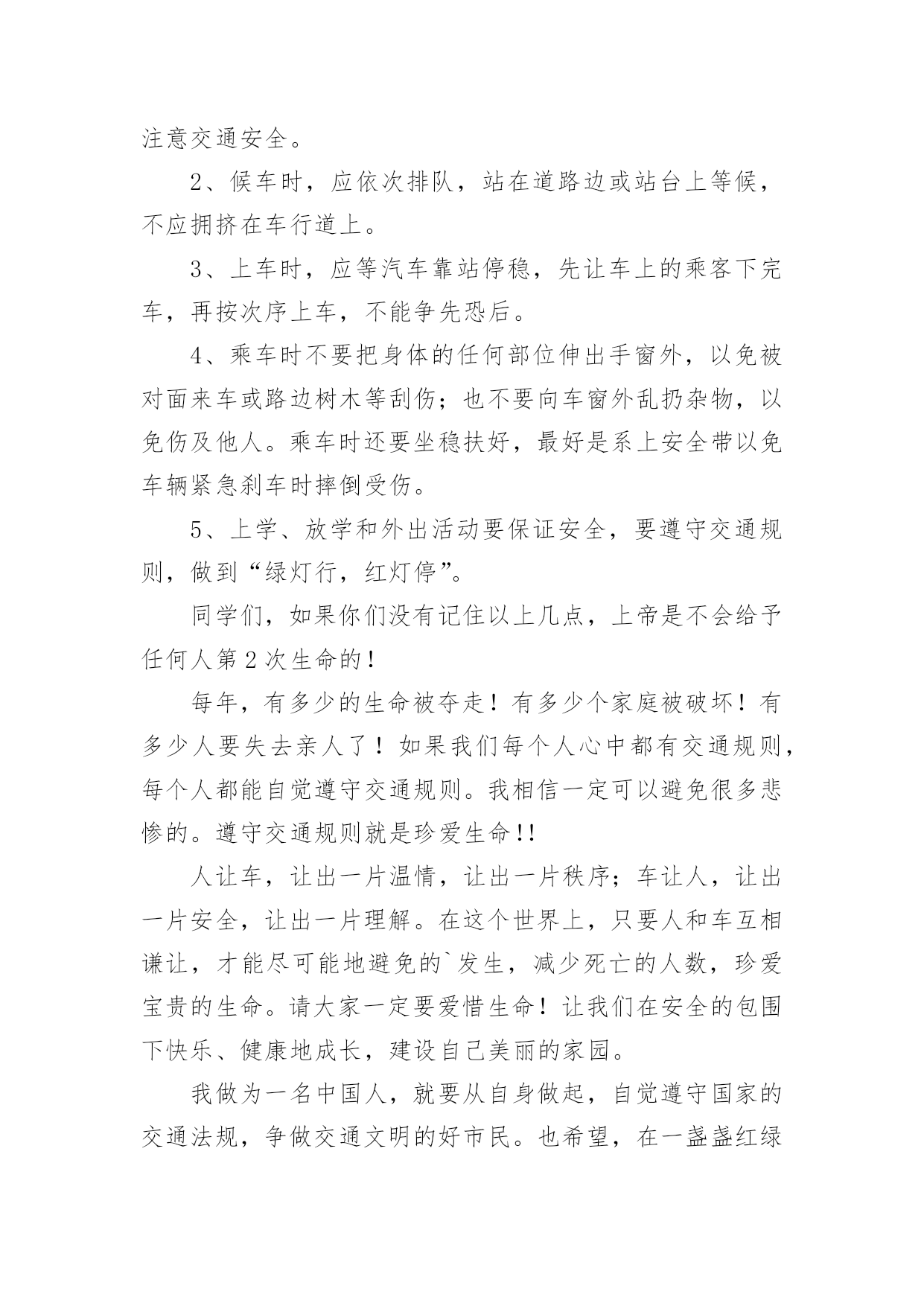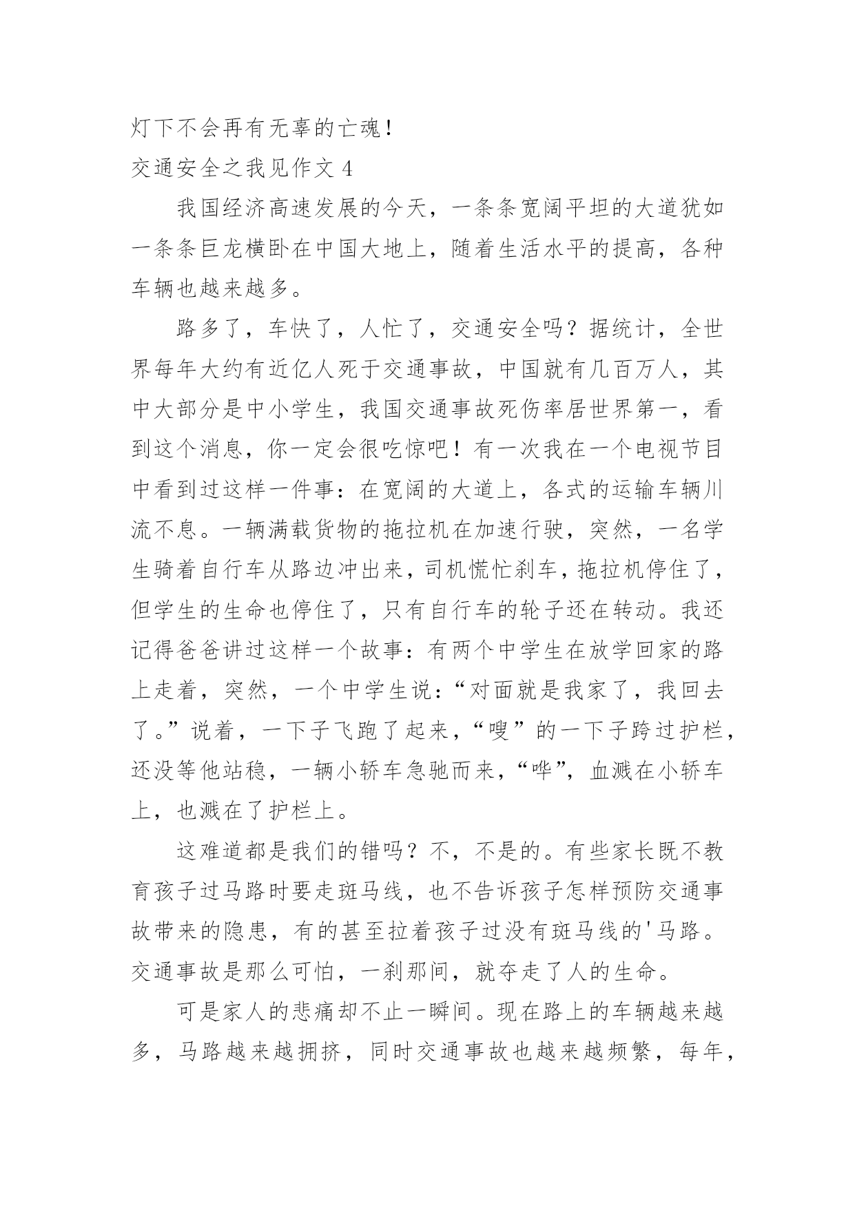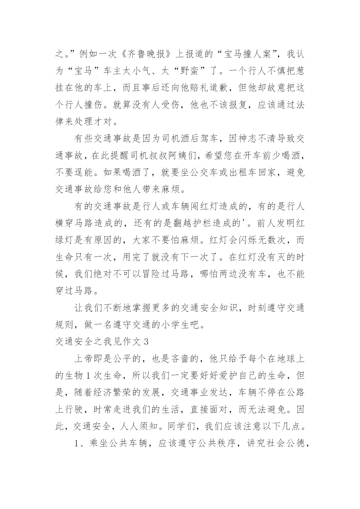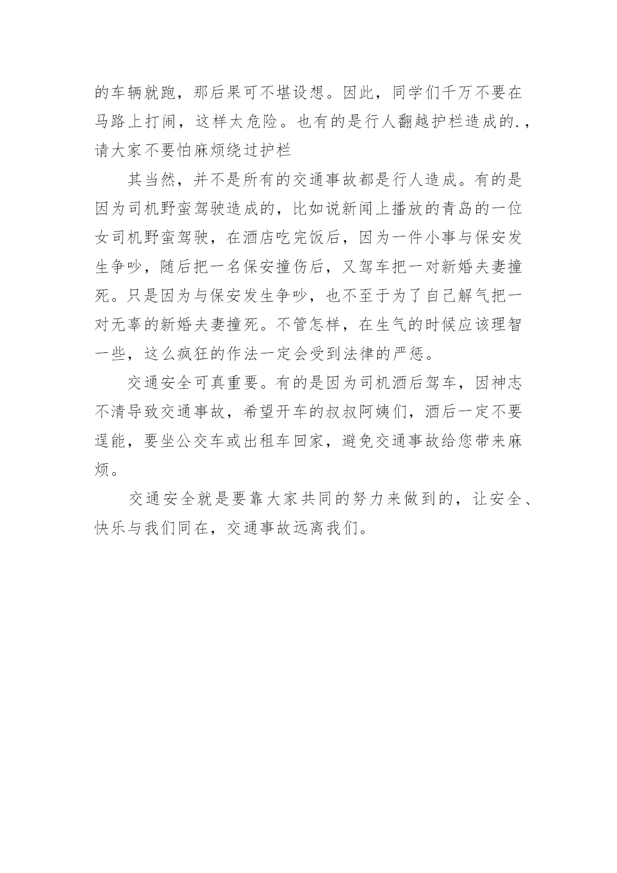 交通安全之我见作文交通安全之我见作文(7篇)在学习、工作、生活中,大家都尝试过写作文吧,借助作文可以提高我们的语言组织能力。你知道作文怎样才能写的好吗?以下是小编整理的交通安全之我见作文,欢迎大家分享。交通安全之我见作文1从小我对交通安全方面的知识很薄弱,只知道红灯停,绿灯行,过马路要走斑马线这些连三岁小孩都懂的事。虽然交通安全父母和老师经常会提起,但我每次都当做耳边风,左耳进,右耳出。甚至有些反感他们总是念叨这些。现在想想,要不是以前一直把他们的话当做耳边风,也不会差点命丧黄泉了。记得有一次,我和同学一起出去逛街。准备过马路时,我发现绿灯的时间只剩几秒了,一想再等必定又要等很久,我便因为贪图一时拉着同学朝马路对面飞奔而去。可就在我们跑到一半时,红灯亮了。一辆小轿车就我们身后驶过,凉风久久没有散去,吹到我身上,顿时,我的冷汗豆大豆大往下落。连现在想起来都有点心有余悸。从那以后,我每次过马路都小心翼翼,深怕又有一辆轿车突然驶出来。不过,好景不长,过了一段时间,我便忘了这个教训。又有一次我骑车和妈妈出去玩,妈妈骑车在前面,我跟着妈妈的后面。骑到一个十字路口,我和妈妈的距离已经拉开了距离,为了追上妈妈,我加快了速度,到达十字路口的中心时,突然,从左侧冲出来一辆车,眼看就要撞上我,我什么都顾不上,只好紧张闭上了眼睛。“哧”随着刹车声,那辆车停在了我的面前,司机下车询问有没有事,妈妈也慌忙的跑过来问候我,当时身边声音吵杂,我却什么也听不见。一想到刚刚经历了这么恐怖的`事,差点就要见不到爸爸妈妈了。那一刻,我意识到交通安全的重要性。从那以后,我再也不拿父母老师的话当做耳边风了。作为已经经历过“生死之难”的我,提醒大家,一定要听父母和老师的教导,生命是宝贵的,用什么也换不来,注意交通安全,就能让自己多一份安全。交通安全之我见作文2交通安全对我们来说非常重要,我们需要不断地积累经验。下面我来告诉你一些我在交通安全方面所学到的一些知识和经验吧。在过没有红绿灯的路口时,需要看一看周围是否有车。如果没有车,我们可以立刻走过去;如果有车,我们要等车走过去后再走。有红绿灯的路口,我们要看清红绿灯。绿灯亮了才能走,不要闯红灯。否则,幸运的时候没什么事;但如果有车来了,躲闪不及,那后果就不堪设想了。虽然这些交通法规大家都知道。但是在日常生活中我们却没有这样做。俗话说:“勿以善小而不为,勿以恶小而为之。”例如一次《齐鲁晚报》上报道的“宝马撞人案”,我认为“宝马”车主太小气、太“野蛮”了。一个行人不慎把葱挂在他的车上,而且事后还向他赔礼道歉,但他却故意把这个行人撞伤。就算没有人受伤,他也不该报复,应该通过法律来处理才对。有些交通事故是因为司机酒后驾车,因神志不清导致交通事故,在此提醒司机叔叔阿姨们,希望您在开车前少喝酒,不要逞能。如果喝酒了,就要坐公交车或出租车回家,避免交通事故给您和他人带来麻烦。有的交通事故是行人或车辆闯红灯造成的,有的是行人横穿马路造成的,还有的是翻越护栏造成的'。前人发明红绿灯是有原因的,大家不要怕麻烦。红灯会闪烁无数次,而生命只有一次,用完了就没有下一次了。在红灯没有灭的时候,我们绝对不可以冒险过马路,哪怕两边没有车,也不能穿过马路。让我们不断地掌握更多的交通安全知识,时刻遵守交通规则,做一名遵守交通的小学生吧。交通安全之我见作文3上帝即是公平的,也是吝啬的,他只给予每个在地球上的生物1次生命,所以我们一定要好好爱护自己的生命,但是,随着经济繁荣的发展,交通事业发达,车辆不停在公路上行驶,时常走进我们的生活,直接面对,而无法避免。因此,交通安全,人人须知。同学们,我们应该注意以下几点。1、乘坐公共车辆,应该遵守公共秩序,讲究社会公德,注意交通安全。2、候车时,应依次排队,站在道路边或站台上等候,不应拥挤在车行道上。3、上车时,应等汽车靠站停稳,先让车上的乘客下完车,再按次序上车,不能争先恐后。4、乘车时不要把身体的任何部位伸出手窗外,以免被对面来车或路边树木等刮伤;也不要向车窗外乱扔杂物,以免伤及他人。乘车时还要坐稳扶好,最好是系上安全带以免车辆紧急刹车时摔倒受伤。5、上学、放学和外出活动要保证安全,要遵守交通规则,做到“绿灯行,红灯停”。同学们,如果你们没有记住以上几点,上帝是不会给予任何人第2次生命的!每年,有多少的生命被夺走!有多少个家庭被破坏!有多少人要失去亲人了!如果我们每个人心中都有交通规则,每个人都能自觉遵守交通规则。我相信一定可以避免很多悲惨的。遵守交通规则就是珍爱生命!!人让车,让出一片温情,让出一片秩序;车让人,让出一片安全,让出一片理解。在这个世界上,只要人和车互相谦让,才能尽可能地避免的`发生,减少死亡的人数,珍爱宝贵的生命。请大家一定要爱惜生命!让我们在安全的包围下快乐、健康地成长,建设自己美丽的家园。我