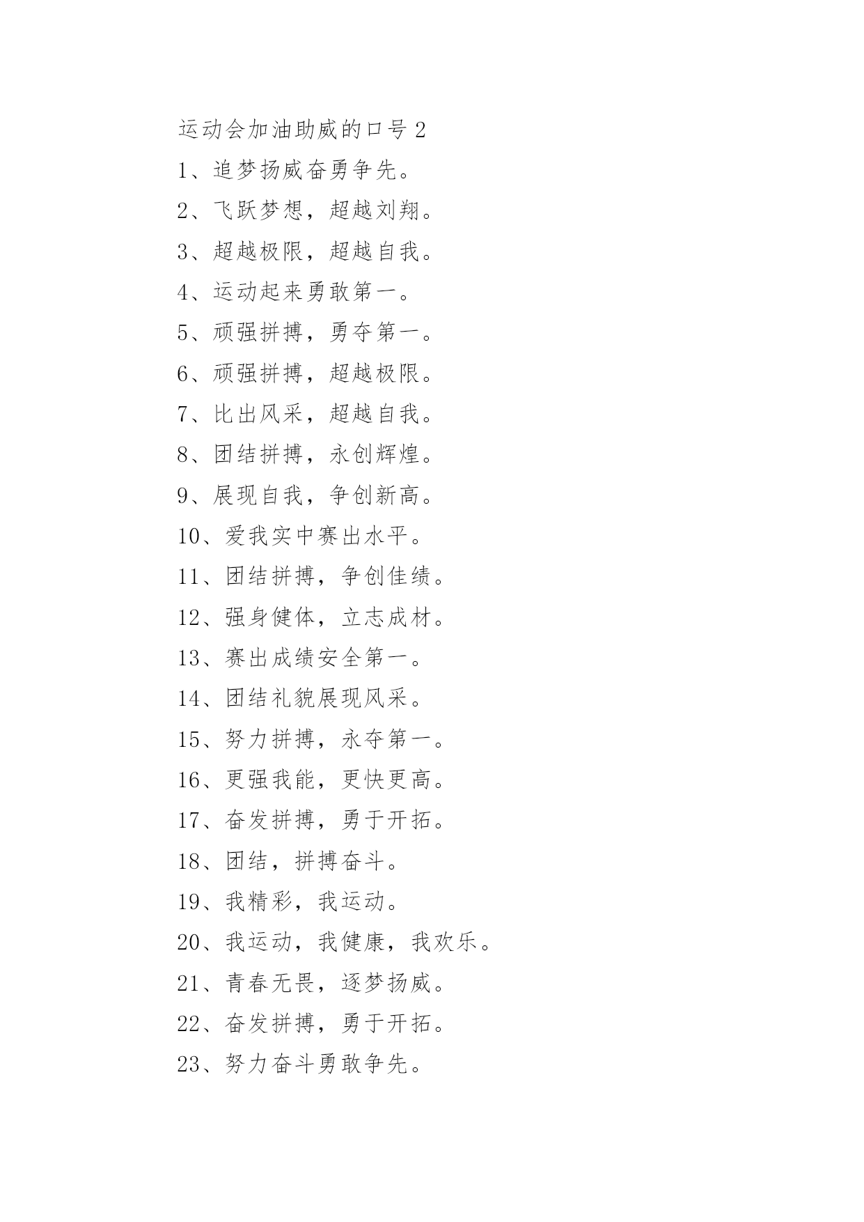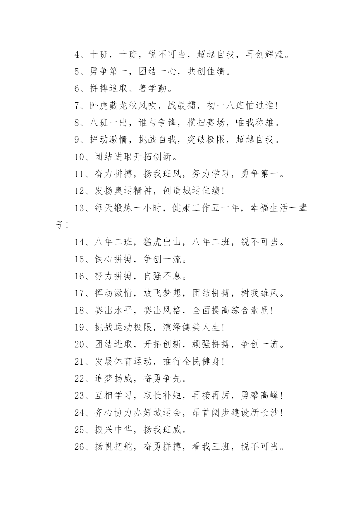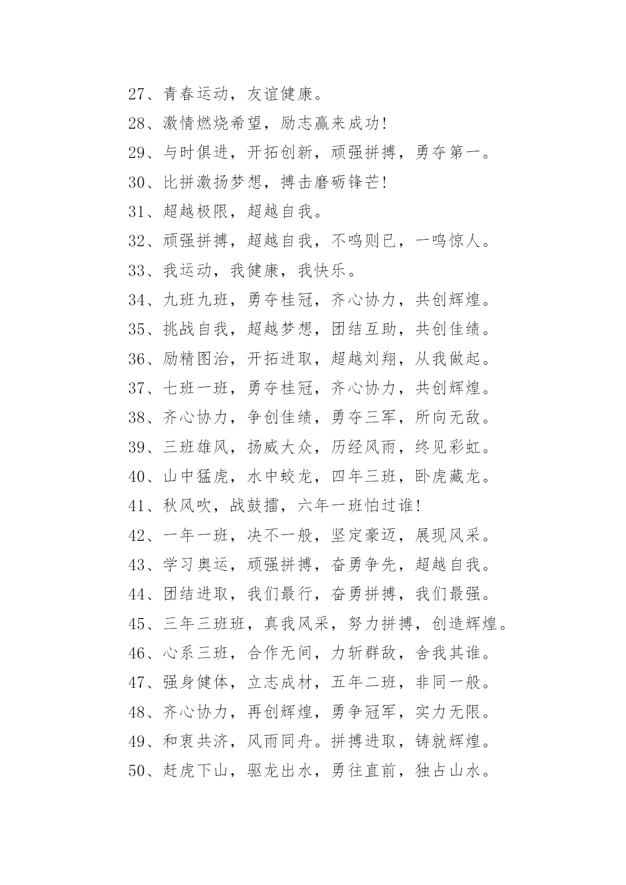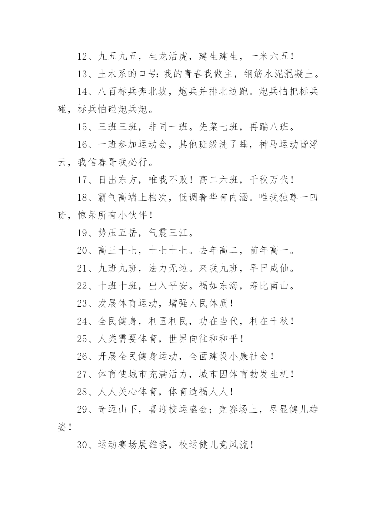 运动会加油助威的口号运动会加油助威的口号(精选210句)在平日的学习、工作和生活里,大家总免不了要接触或使用口号吧,通过口号可以增加团队凝聚力,起到事半功倍的效果。究竟什么样的口号才是好的口号呢?下面是小编为大家收集的运动会加油助威的口号(精选210句),仅供参考,欢迎大家阅读。运动会加油助威的口号11、低调低调,三班驾到,不要掌声,只要尖叫。2、三班三班,威震八方,其余各班,入土为安。3、发型到位,气质高贵。我们呐喊,八班万岁!4、提高成绩,拿回手机。壮我五班,勇夺第一。5、临床临床,医大最强!谁让我败,让谁临床!6、巴蜀大地,谁主沉浮,唯我三班,笑傲江湖!7、一九一九,一群野狗,谁敢不服,咬他两口!8、一班参加运动会,其他班级洗了睡。神马运动皆浮云,我信春哥我必行。9、新闻传播学院的`:新传新传,薪火相传,爷传给爸,爸传给咱。10、发型到位,气质高贵。我们呐喊,二班万岁。11、清华北大,不怕不怕,考个三本,一样伟大。12、九五九五,生龙活虎,建生建生,一米六五!13、土木系的口号:我的青春我做主,钢筋水泥混凝土。14、八百标兵奔北坡,炮兵并排北边跑。炮兵怕把标兵碰,标兵怕碰炮兵炮。15、三班三班,非同一班。先菜七班,再踹八班。16、一班参加运动会,其他班级洗了睡,神马运动皆浮云,我信春哥我必行。17、日出东方,唯我不败!高二六班,千秋万代!18、霸气高端上档次,低调奢华有内涵。唯我独尊一四班,惊呆所有小伙伴!19、势压五岳,气震三江。20、高三十七,十七十七。去年高二,前年高一。21、九班九班,法力无边。来我九班,早日成仙。22、十班十班,出入平安。福如东海,寿比南山。23、发展体育运动,增强人民体质!24、全民健身,利国利民,功在当代,利在千秋!25、人类需要体育,世界向往和和平!26、开展全民健身运动,全面建设小康社会!27、体育使城市充满活力,城市因体育勃发生机!28、人人关心体育,体育造福人人!29、奇迈山下,喜迎校运盛会;竞赛场上,尽显健儿雄姿!30、运动赛场展雄姿,校运健儿竞风流!运动会加油助威的口号21、追梦扬威奋勇争先。2、飞跃梦想,超越刘翔。3、超越极限,超越自我。4、运动起来勇敢第一。5、顽强拼搏,勇夺第一。6、顽强拼搏,超越极限。7、比出风采,超越自我。8、团结拼搏,永创辉煌。9、展现自我,争创新高。10、爱我实中赛出水平。11、团结拼搏,争创佳绩。12、强身健体,立志成材。13、赛出成绩安全第一。14、团结礼貌展现风采。15、努力拼搏,永夺第一。16、更强我能,更快更高。17、奋发拼搏,勇于开拓。18、团结,拼搏奋斗。19、我精彩,我运动。20、我运动,我健康,我欢乐。21、青春无畏,逐梦扬威。22、奋发拼搏,勇于开拓。23、努力奋斗勇敢争先。24、挥动活力,放飞梦想。25、礼貌守纪拥抱胜利26、青春无悔,活力无限。27、我运动,我欢乐。我锻炼,我提高。28、天道酬勤健康起来。29、奥运精神,永驻我心。30、团结拼搏拼搏进。31、努力拼搏自强不息。32、赛出风格,赛出水平。33、挑战自我,突破极限。34、振兴中华赛出水平。35、挑战自我,突破极限。运动会加油助威的口号31、齐心协力!力争上游!永不言弃!2、健儿们,你是我们的骄傲,我们的自豪,胜利一定属于你们,加油!加油!加油!3、高二(3)班的全体运动员们,你们加油,我们为你们喝彩!4、奇迈山下,喜迎华园研运盛会;竞赛场上,尽显机汽健儿雄姿!5、超越自我,八年五班,奋勇拼搏。6、勇夺桂冠,齐心协力,共创辉煌。7、永争第一。8、齐心进,运动会,创佳绩!9、奋发向上,努力拼搏,永不言弃。10、奋勇拼搏,看我三班,锐不可当。11、抒写运动乐意!12、放飞梦想,团结拼搏,树我雄风。13、争创一流。14、开拓创新,顽强拼搏,勇夺第一。15、影子飒爽,奋勇拼搏,展现自我。16、奋起争先,机汽学子,再创辉煌。17、争创一流,好好学习,天天向上。18、凝神聚力谱新篇。19、展青春风采!20、走向明天。21、迎缤纷征途。22、谁都可以踱进去。23、开拓创新,顽强拼搏,争创一流。24、体育健儿,整装侍发!25、比赛第二!26、取长补短,再接再厉,勇攀高峰。27、17班的魂!28、猛虎出山,八年二班,锐不可当。29、勇者激情,机汽健儿,永不言弃。30、图其至远!31、明日的`太阳将从这里升起!32、开拓进取,超越刘翔,从我做起。33、永不言弃;努力拼搏,再创佳绩。34、风雨同舟;拼搏进取,铸就辉煌。13班:努力奋进,永争第一!35、只有更好。36、放飞希望和梦想!37、气比山昂,机汽学子,力争更强!38、奋力拼搏,齐心协力,争创一流。39、超越梦想,团结互助,共创佳绩。40、用知识创造生产力。41、九班最强!42、勤奋好学,激情飞扬。43、团结一心,共创佳绩。44、