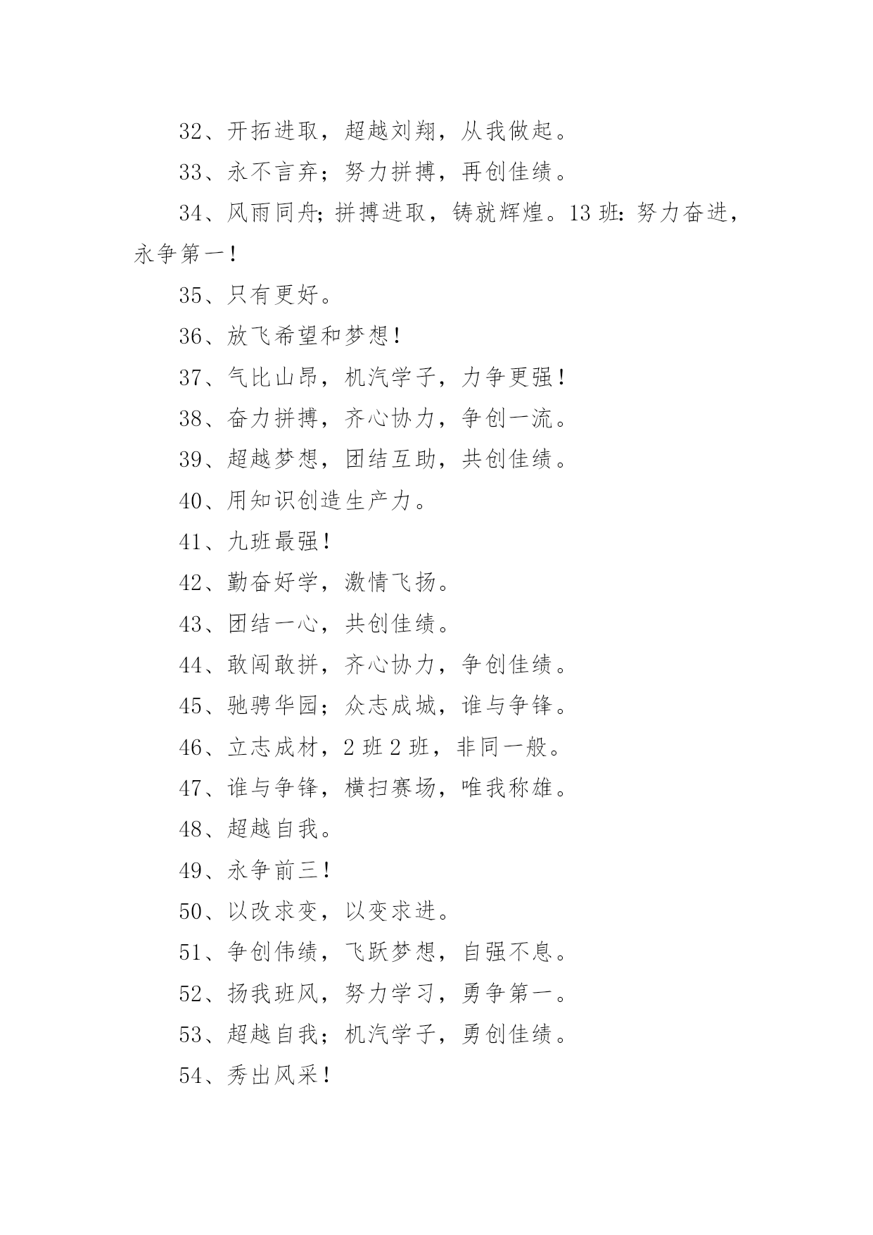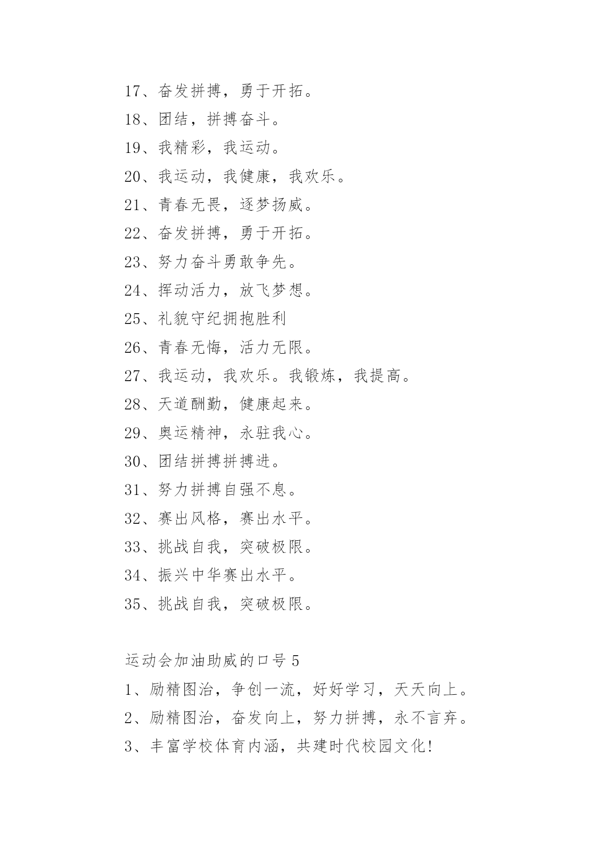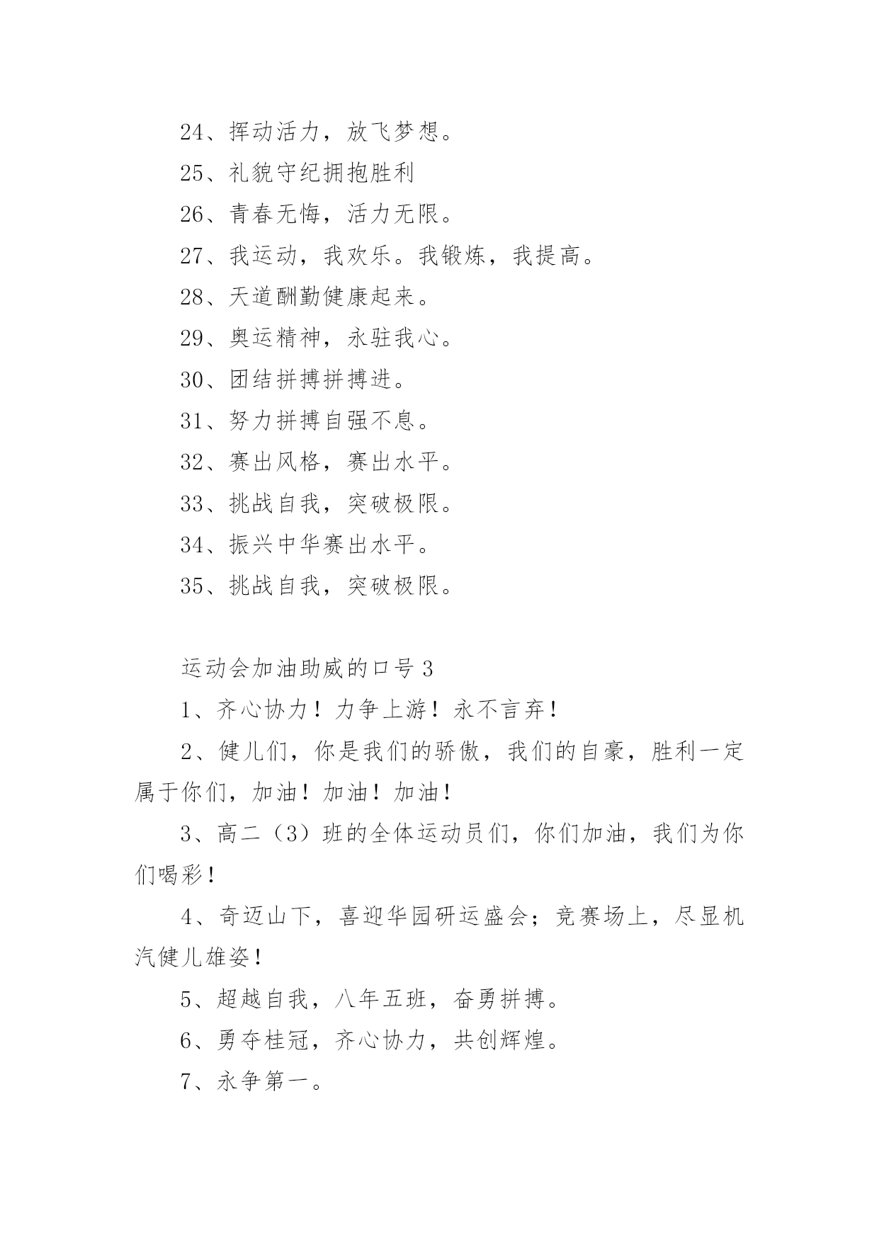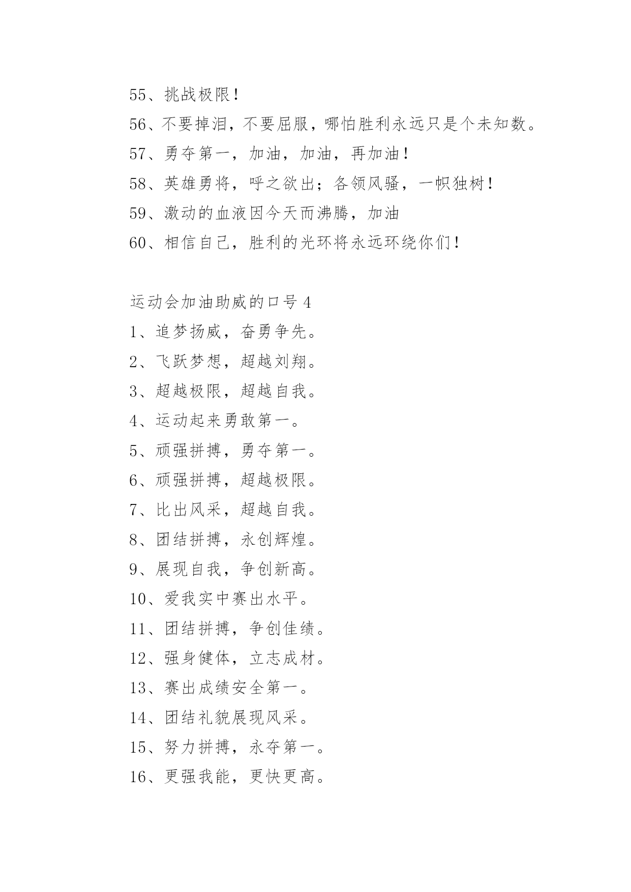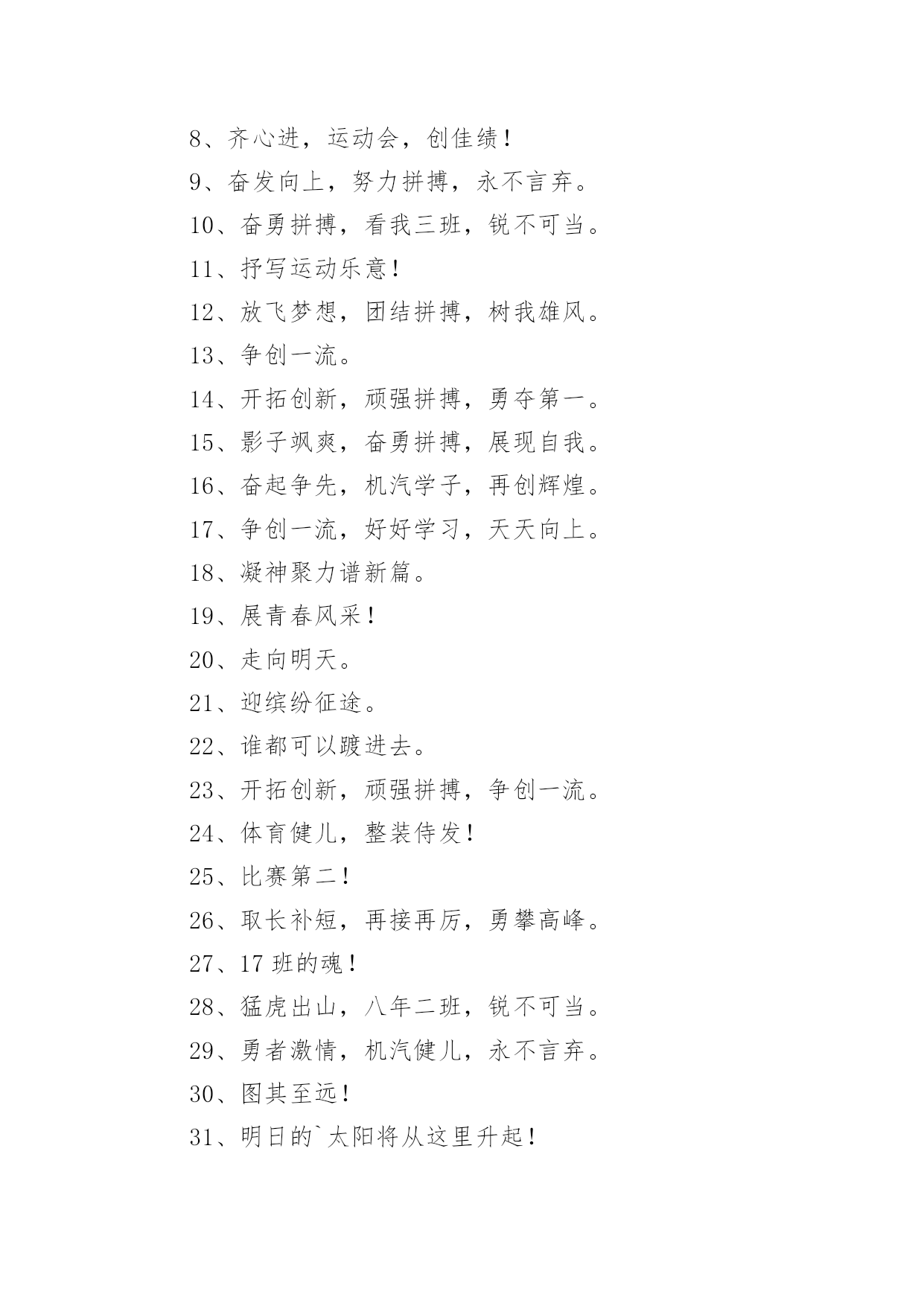 运动会加油助威的口号运动会加油助威的口号(精选210句)在平日的学习、工作和生活里,大家总免不了要接触或使用口号吧,通过口号可以增加团队凝聚力,起到事半功倍的效果。究竟什么样的口号才是好的口号呢?下面是小编为大家收集的运动会加油助威的口号(精选210句),仅供参考,欢迎大家阅读。运动会加油助威的口号11、低调低调,三班驾到,不要掌声,只要尖叫。2、三班三班,威震八方,其余各班,入土为安。3、发型到位,气质高贵。我们呐喊,八班万岁!4、提高成绩,拿回手机。壮我五班,勇夺第一。5、临床临床,医大最强!谁让我败,让谁临床!6、巴蜀大地,谁主沉浮,唯我三班,笑傲江湖!7、一九一九,一群野狗,谁敢不服,咬他两口!8、一班参加运动会,其他班级洗了睡。神马运动皆浮云,我信春哥我必行。9、新闻传播学院的`:新传新传,薪火相传,爷传给爸,爸传给咱。10、发型到位,气质高贵。我们呐喊,二班万岁。11、清华北大,不怕不怕,考个三本,一样伟大。12、九五九五,生龙活虎,建生建生,一米六五!13、土木系的口号:我的青春我做主,钢筋水泥混凝土。14、八百标兵奔北坡,炮兵并排北边跑。炮兵怕把标兵碰,标兵怕碰炮兵炮。15、三班三班,非同一班。先菜七班,再踹八班。16、一班参加运动会,其他班级洗了睡,神马运动皆浮云,我信春哥我必行。17、日出东方,唯我不败!高二六班,千秋万代!18、霸气高端上档次,低调奢华有内涵。唯我独尊一四班,惊呆所有小伙伴!19、势压五岳,气震三江。20、高三十七,十七十七。去年高二,前年高一。21、九班九班,法力无边。来我九班,早日成仙。22、十班十班,出入平安。福如东海,寿比南山。23、发展体育运动,增强人民体质!24、全民健身,利国利民,功在当代,利在千秋!25、人类需要体育,世界向往和和平!26、开展全民健身运动,全面建设小康社会!27、体育使城市充满活力,城市因体育勃发生机!28、人人关心体育,体育造福人人!29、奇迈山下,喜迎校运盛会;竞赛场上,尽显健儿雄姿!30、运动赛场展雄姿,校运健儿竞风流!运动会加油助威的口号21、追梦扬威奋勇争先。2、飞跃梦想,超越刘翔。3、超越极限,超越自我。4、运动起来勇敢第一。5、顽强拼搏,勇夺第一。6、顽强拼搏,超越极限。7、比出风采,超越自我。8、团结拼搏,永创辉煌。9、展现自我,争创新高。10、爱我实中赛出水平。11、团结拼搏,争创佳绩。12、强身健体,立志成材。13、赛出成绩安全第一。14、团结礼貌展现风采。15、努力拼搏,永夺第一。16、更强我能,更快更高。17、奋发拼搏,勇于开拓。18、团结,拼搏奋斗。19、我精彩,我运动。20、我运动,我健康,我欢乐。21、青春无畏,逐梦扬威。22、奋发拼搏,勇于开拓。23、努力奋斗勇敢争先。24、挥动活力,放飞梦想。25、礼貌守纪拥抱胜利26、青春无悔,活力无限。27、我运动,我欢乐。我锻炼,我提高。28、天道酬勤健康起来。29、奥运精神,永驻我心。30、团结拼搏拼搏进。31、努力拼搏自强不息。32、赛出风格,赛出水平。33、挑战自我,突破极限。34、振兴中华赛出水平。35、挑战自我,突破极限。运动会加油助威的口号31、齐心协力!力争上游!永不言弃!2、健儿们,你是我们的骄傲,我们的自豪,胜利一定属于你们,加油!加油!加油!3、高二(3)班的全体运动员们,你们加油,我们为你们喝彩!4、奇迈山下,喜迎华园研运盛会;竞赛场上,尽显机汽健儿雄姿!5、超越自我,八年五班,奋勇拼搏。6、勇夺桂冠,齐心协力,共创辉煌。7、永争第一。8、齐心进,运动会,创佳绩!9、奋发向上,努力拼搏,永不言弃。10、奋勇拼搏,看我三班,锐不可当。11、抒写运动乐意!12、放飞梦想,团结拼搏,树我雄风。13、争创一流。14、开拓创新,顽强拼搏,勇夺第一。15、影子飒爽,奋勇拼搏,展现自我。16、奋起争先,机汽学子,再创辉煌。17、争创一流,好好学习,天天向上。18、凝神聚力谱新篇。19、展青春风采!20、走向明天。21、迎缤纷征途。22、谁都可以踱进去。23、开拓创新,顽强拼搏,争创一流。24、体育健儿,整装侍发!25、比赛第二!26、取长补短,再接再厉,勇攀高峰。27、17班的魂!28、猛虎出山,八年二班,锐不可当。29、勇者激情,机汽健儿,永不言弃。30、图其至远!31、明日的`太阳将从这里升起!32、开拓进取,超越刘翔,从我做起。33、永不言弃;努力拼搏,再创佳绩。34、风雨同舟;拼搏进取,铸就辉煌。13班:努力奋进,永争第一!35、只有更好。36、放飞希望和梦想!37、气比山昂,机汽学子,力争更强!38、奋力拼搏,齐心协力,争创一流。39、超越梦想,团结互助,共创佳绩。40、用知识创造生产力。41、九班最强!42、勤奋好学,激情飞扬。43、团结一心,共创佳绩。44、
