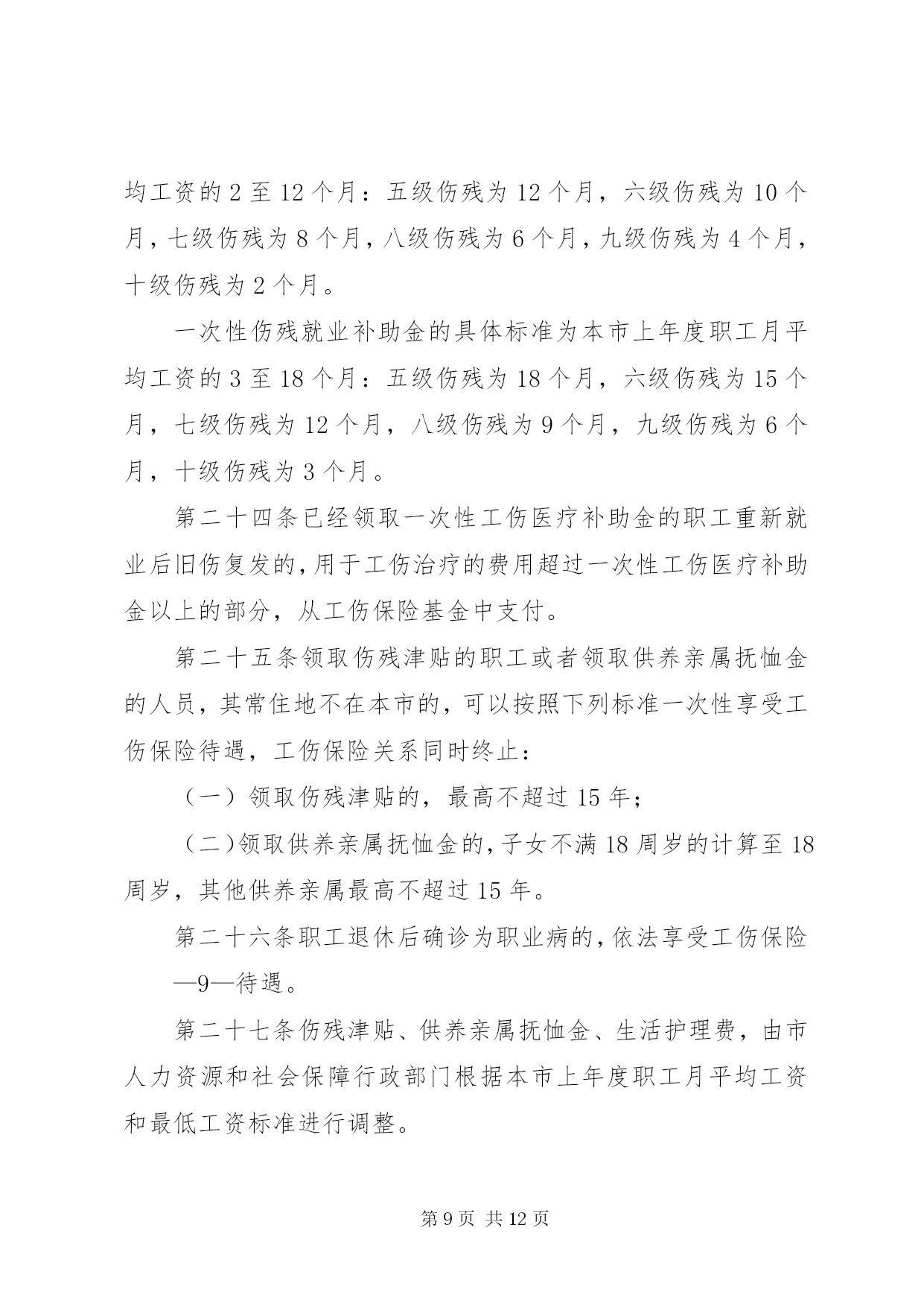 第PAGE\*Arabic\*MERGEFORMAT12页共NUMPAGES\*MERGEFORMAT12页XX省工伤保险若干规定第50号《XX省工伤保险若干规定》已于2012年1月14日经市人民政府第82次常务会议通过,现予公布,自2012年3月5日起施行。市长黄兴国二○一二年二月三日—1—XX省工伤保险若干规定第一条为了完善工伤保险制度,保障因工作遭受事故伤害或者患职业病的职工获得医疗救治和经济补偿,促进工伤预防和职业康复,分散用人单位的工伤风险,根据《中华人民共和国社会保险法》和《工伤保险条例》(国务院令第586号),结合本市实际情况,制定本规定。第二条本市行政区域内的企业、事业单位、社会团体、民办非企业单位、基金会、律师事务所、会计师事务所等组织和有雇工的个体工商户(以下称用人单位)应当依法参加工伤保险,为本单位全部职工或者雇工(以下称职工)缴纳工伤保险费。前款规定的用人单位职工均有依照本规定享受工伤保险待遇的权利。第三条市人力资源和社会保障行政部门负责全市的工伤保险工作。区县人力资源和社会保障行政部门在市人力资源和社会保障行政部门的指导下,具体负责本行政区域内的工伤保险工作。社会保险经办机构(以下称经办机构)具体承办工伤保险事务。财政、卫生、工商、安全监管、公安、建设交通、交通港口等行政部门按照各自职责做好工伤保险工作。第四条与工伤保险相关的行政部门应当就工伤事故和职业—2—病建立信息共享机制。第五条本市工伤保险基金实行全市统筹。工伤保险基金由下列各项构成:(一)用人单位缴纳的工伤保险费;(二)工伤保险基金的利息;(三)依法纳入工伤保险基金的其他资金。第六条经办机构根据用人单位的工商登记和主要生产经营业务等情况,依据国家有关规定,确定用人单位适用的行业差别费率。经办机构根据用人单位的工伤保险费使用、工伤发生率等情况,适用所属行业内相应的费率档次,确定用人单位年度工伤保险缴费费率,并报市人力资源和社会保障行政部门备案。第七条用人单位应当按时缴纳工伤保险费,职工个人不缴纳工伤保险费。用人单位缴纳工伤保险费的数额为本单位职工工资总额乘以单位缴费费率之积。对于难以按照职工工资总额缴纳工伤保险费的建筑施工企业、小型服务企业、小型矿山企业等行业企业,其缴纳工伤保险费的具体计算办法,由市人力资源和社会保障行政部门确定。第八条用人单位应当自依法成立之日起30日内,到所在地的经办机构办理工伤保险登记。经办机构应当自收到申请之日起10日内审核完毕。—3—用人单位应当自用工之日起30日内,到所在地的经办机构为其职工办理工伤保险参保手续。用人单位的工伤保险登记事项发生变更或者依法终止的,应当自变更或者终止之日起30日内,到经办机构办理工伤保险变更或者注销手续。第九条工伤保险基金用于下列支出:(一)工伤保险待遇;(二)劳动能力鉴定费用;(三)工伤认定调查费用;(四)职业康复费用;(五)工伤预防费用;(六)法律、法规规定用于工伤保险的其他费用。第十条工伤保险基金应当按照当年工伤保险基金总额的10%提留储备金,其滚存总额超过当年工伤保险基金总额的30%时,不再提取。储备金用于统筹本市重大事故的工伤保险待遇支付;储备金不足支付的,由市人民政府垫付。第十一条市人力资源和社会保障行政部门负责患职业病的职工和跨省市流动作业用人单位职工的工伤认定工作。各区县人力资源和社会保障行政部门负责前款规定外的用人单位职工的工伤认定工作。第十二条职工发生事故伤害后,职工或者现场人员应当立即—4—向用人单位报告。用人单位应当在24小时内向人力资源和社会保障行政部门报告。第十三条用人单位应当自事故伤害发生之日或者职工被诊断、鉴定为职业病之日起30日内,向人力资源和社会保障行政部门提出工伤认定申请,并提交下列材料:(一)工伤认定申请表;(二)劳动合同或者劳动关系证明;(三)医疗诊断证明或者职业病诊断证明;(四)职工本人身份证明;(五)其他相关证明材料。第十四条用人单位未按规定提出工伤认定申请的,工伤职工或者其近亲属、工会组织在事故伤害发生之日或者被诊断、鉴定为职业病之日起1年内,可以直接向人力资源和社会保障行政部门提出工伤认定申请,并提交本规定第十三条规定的材料。第十五条人力资源和社会保障行政部门应当自收到工伤认定申请之日起15日内,对工伤认定申请作出受理或者不予受理的决定,并书面通知申请人。工伤认定申请材料不完整的,应当一次性书面告知申请人在15日内补齐。人力资源和社会保障行政部门应当自受理工伤认定申请之日起60日内作出工伤认定的决定,并书面通知用人单位、工伤职工或者其近亲属和经办机构。对受理的事实清楚、权利义务明确的工伤认定申请,应当自受理工伤认定申请之日起15日内作出工伤—5—认定的决定。第十六条劳动能力鉴定委员会由人力资源和社会保障行政部门