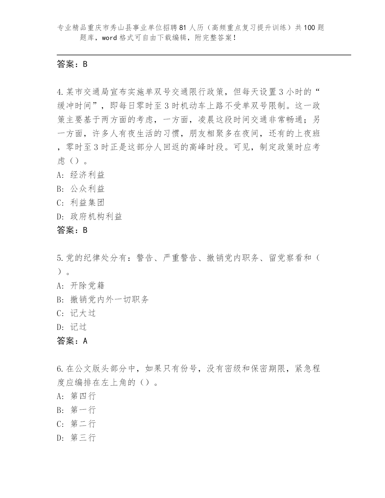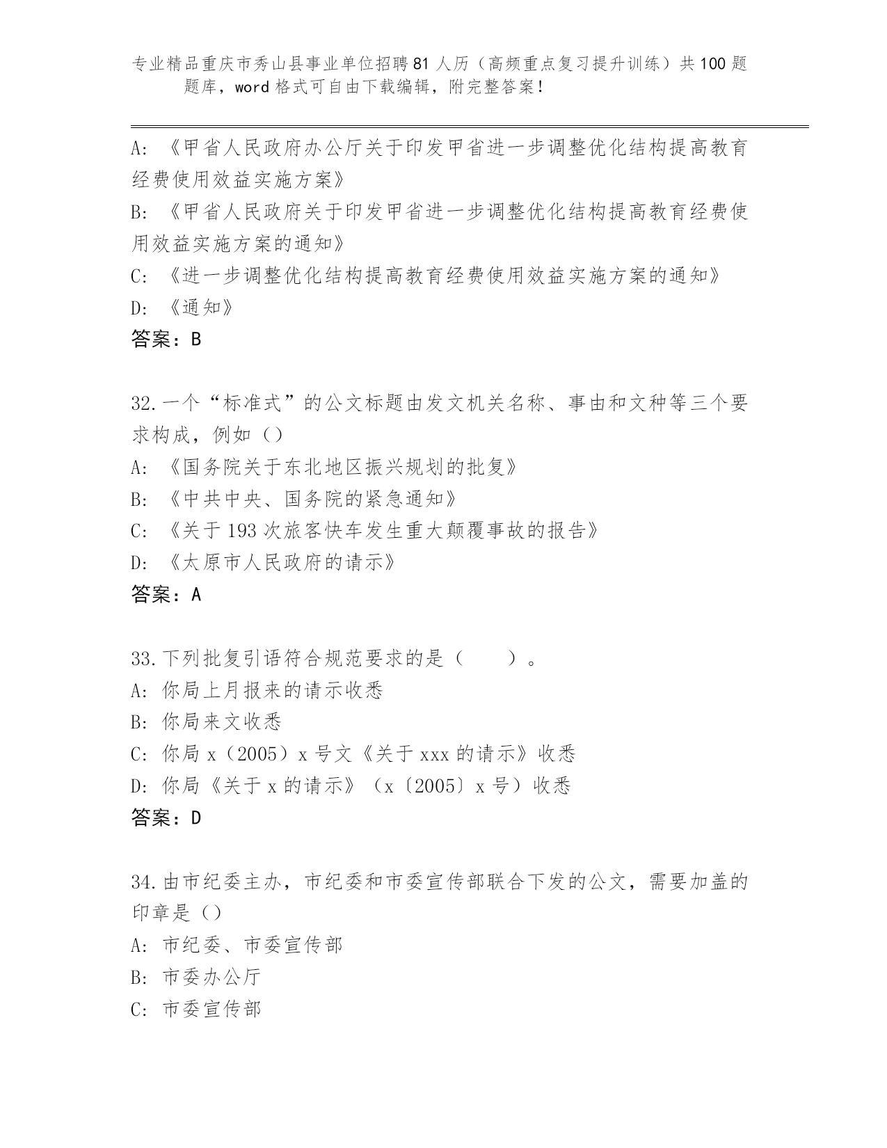 完整版重庆市秀山县事业单位招聘81人历(高频重点复习提升训练)共100题 内部题库附答案(突破训练)
