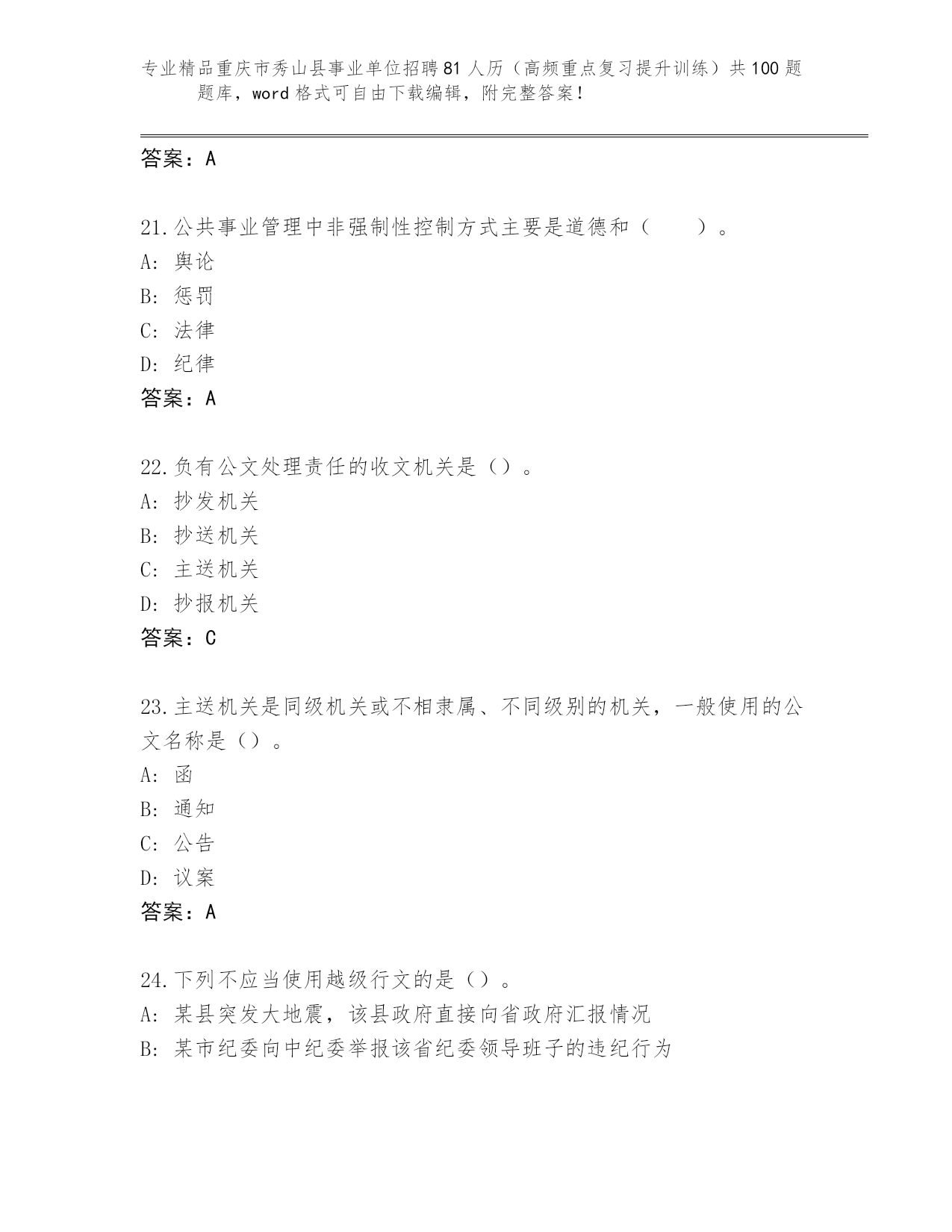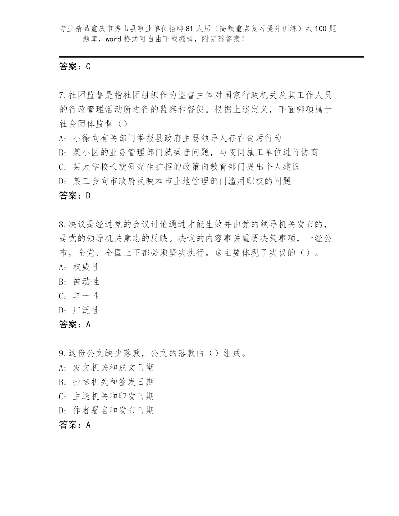 重庆市秀山县事业单位招聘81人历(高频重点复习提升训练)共100题 完整版附答案【轻巧夺冠】