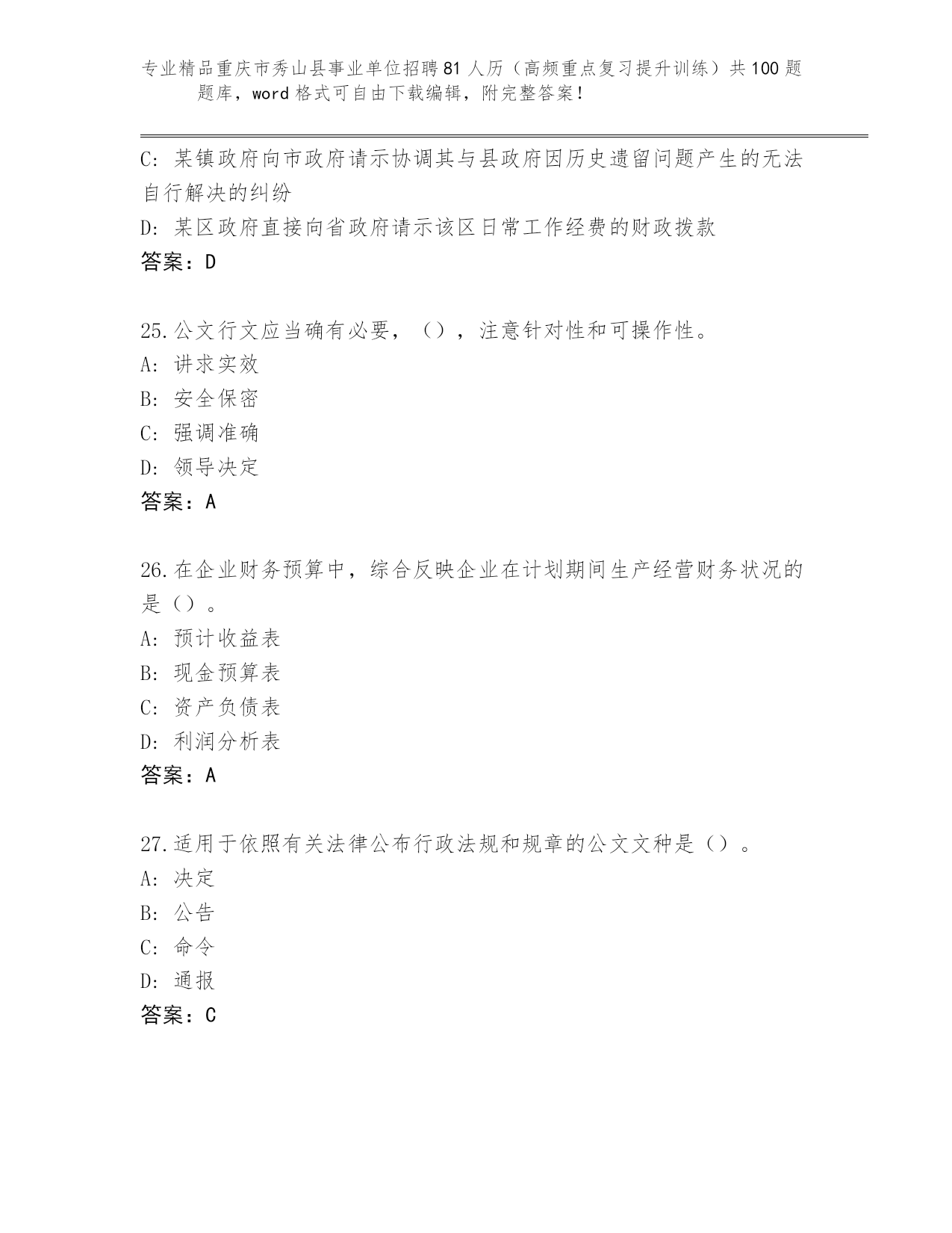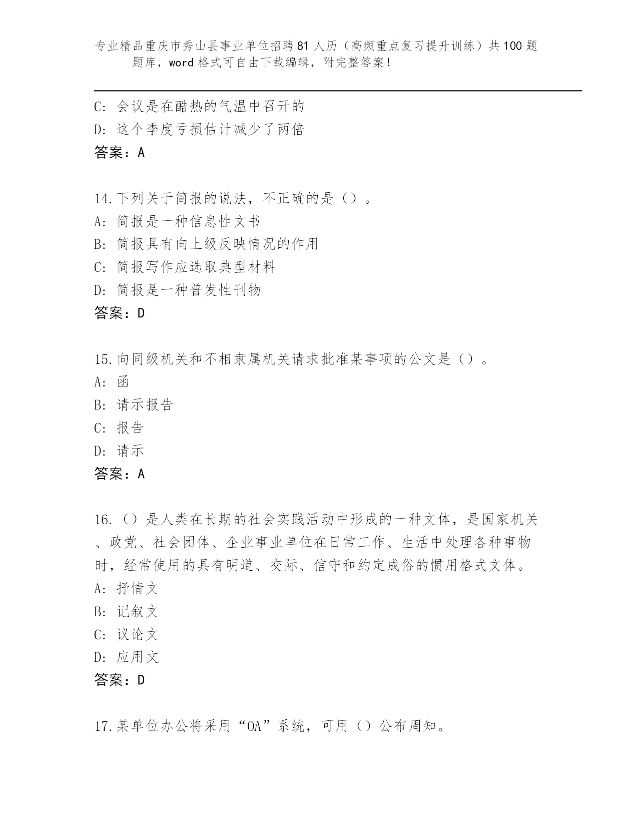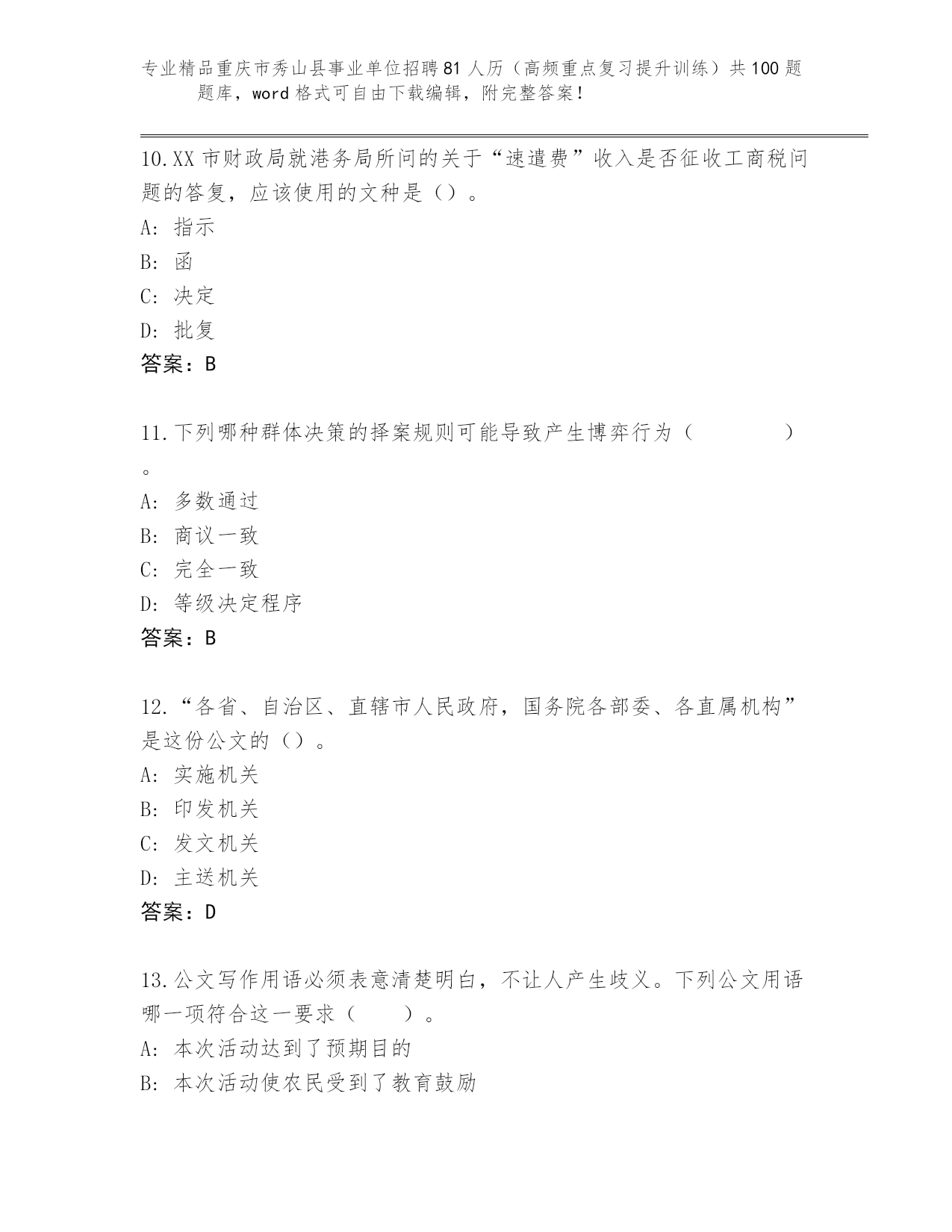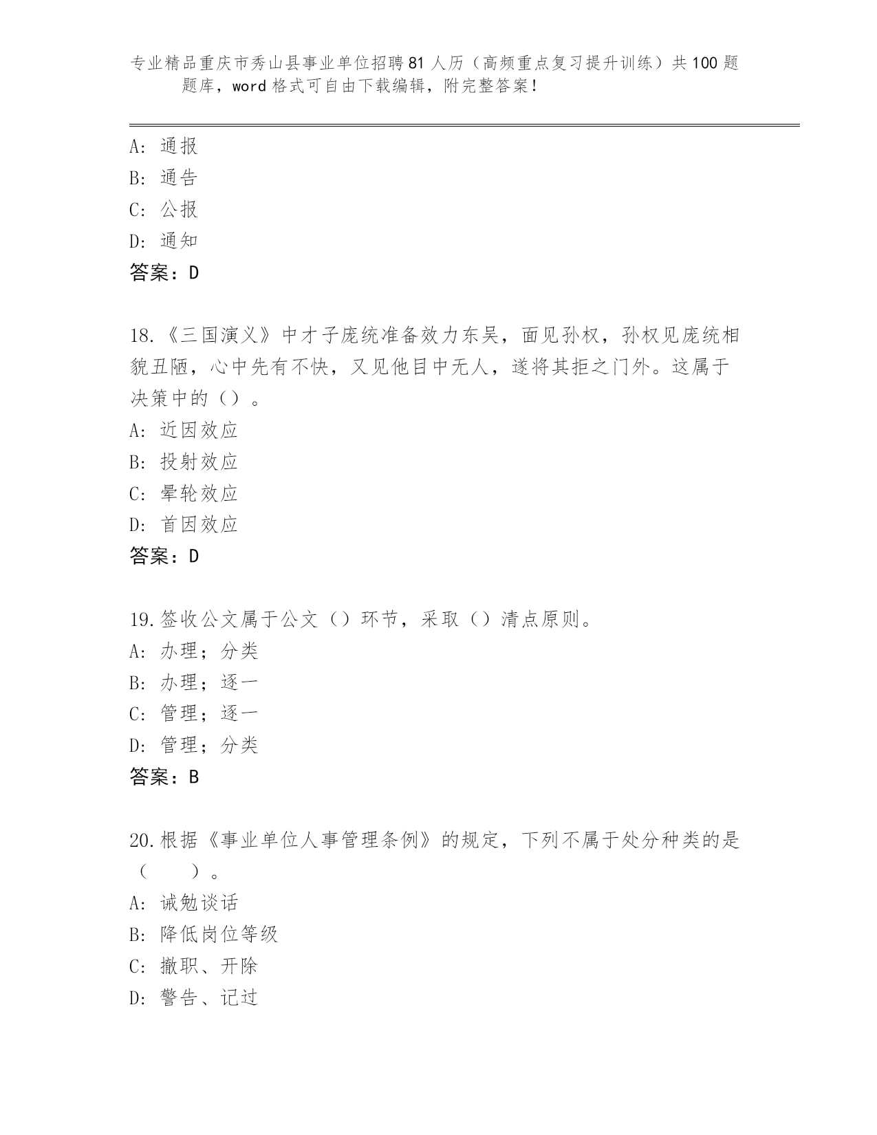 完整版重庆市秀山县事业单位招聘81人历(高频重点复习提升训练)共100题 内部题库带答案(预热题)