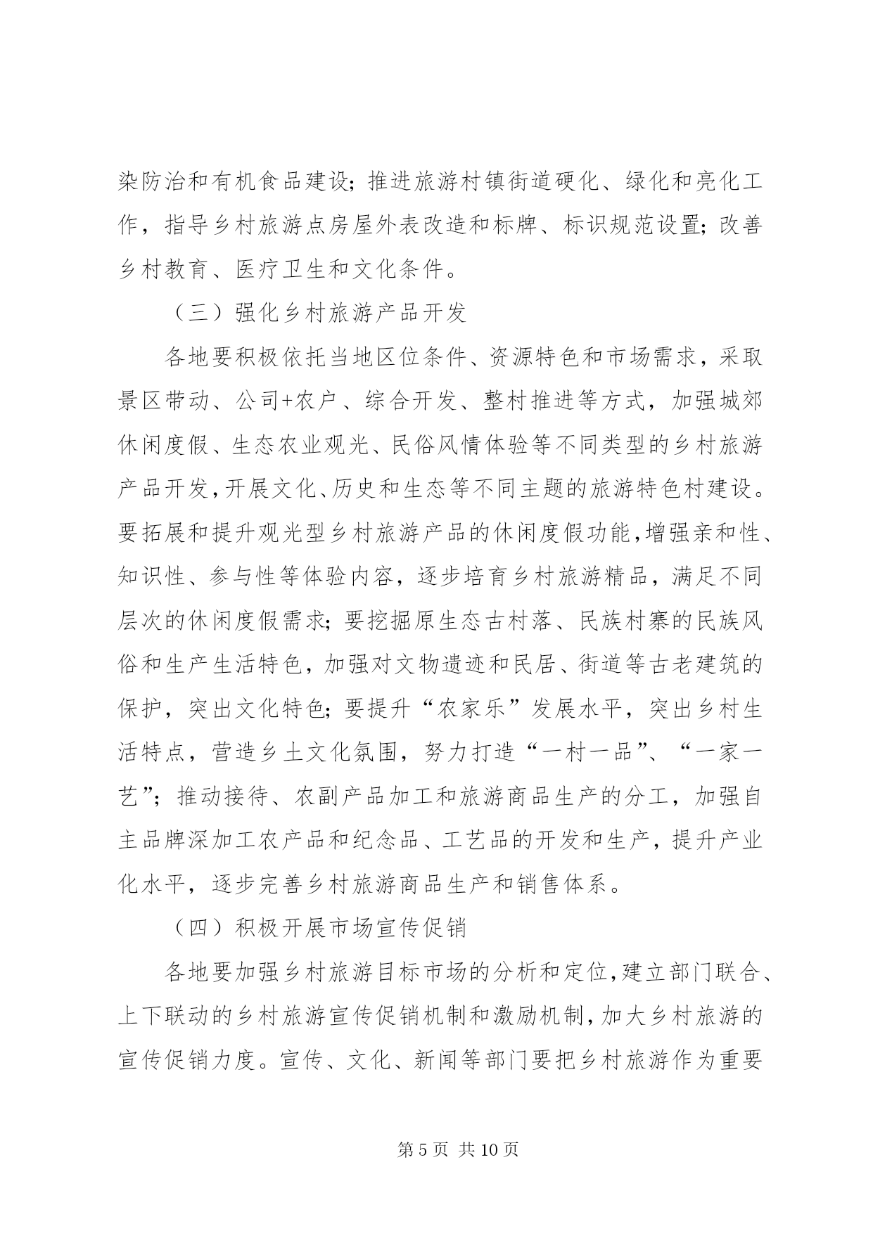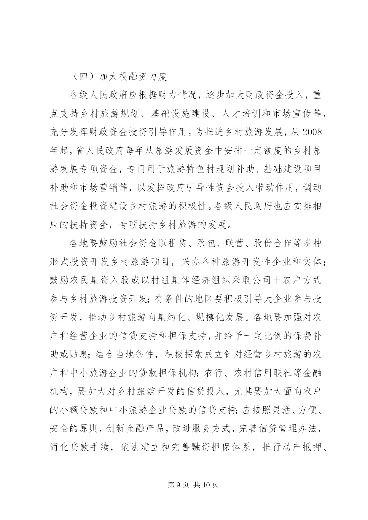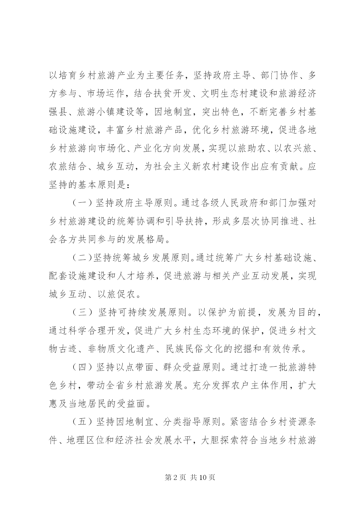 第PAGE\*Arabic\*MERGEFORMAT10页共NUMPAGES\*MERGEFORMAT10页加快乡村旅游发展意见为深入贯彻落实党中央、国务院关于社会主义新农村建设的战略部署,发挥旅游产业的关联带动作用,充分挖掘和利用“三农”资源,促进旅游业与农村建设有效结合,加快传统农业转型升级,推动全省乡村旅游快速健康发展,推进全省旅游二次创业,结合我省实际,特提出以下意见:一、发展乡村旅游的重要意义大力发展乡村旅游,以旅游促“三农”,是社会主义新农村建设的重要组成部分,是加快城乡经济统筹发展、实现产业联动和以城带乡的重要途径,对加快推进新农村建设、统筹城乡发展、增加农民就业机会、拓宽农民增收渠道、促进农村精神文明建设和满足游客旅游文化消费需求都具有十分重要的意义。同时,科学保护和合理开发各类乡村风光,宣传文化和生活吸引,开展乡村观光、休闲、度假和体验性旅游活动,对进一步保护生态环境和弘扬民族文化,丰富和优化我省旅游产品结构、区域结构和市场结构都将发挥积极的作用。二、发展乡村旅游的指导思想和基本原则加快乡村旅游发展的指导思想是:以科学发展观为指导,按照“生产发展、生活宽裕、乡风文明、村容整洁、管理民主”的要求,以建设小康、文明、生态、和谐的社会主义新农村为目标,从农村实际和旅游市场需求出发,发挥旅游产业的关联带动作用,以培育乡村旅游产业为主要任务,坚持政府主导、部门协作、多方参与、市场运作,结合扶贫开发、文明生态村建设和旅游经济强县、旅游小镇建设等,因地制宜,突出特色,不断完善乡村基础设施建设,丰富乡村旅游产品,优化乡村旅游环境,促进各地乡村旅游向市场化、产业化方向发展,实现以旅助农、以农兴旅、农旅结合、城乡互动,为社会主义新农村建设作出应有贡献。应坚持的基本原则是:(一)坚持政府主导原则。通过各级人民政府和部门加强对乡村旅游建设的统筹协调和引导扶持,形成多层次协同推进、社会各方共同参与的发展格局。(二)坚持统筹城乡发展原则。通过统筹广大乡村基础设施、配套设施建设和人才培养,促进旅游与相关产业互动发展,实现城乡互动、以旅促农。(三)坚持可持续发展原则。以保护为前提,发展为目的,通过科学合理开发,促进广大乡村生态环境的保护,促进乡村文物古迹、非物质文化遗产、民族民俗文化的挖掘和有效传承。(四)坚持以点带面、群众受益原则。通过打造一批旅游特色乡村,带动全省乡村旅游发展。充分发挥农户主体作用,扩大惠及当地居民的受益面。(五)坚持因地制宜、分类指导原则。紧密结合乡村资源条件、地理区位和经济社会发展水平,大胆探索符合当地乡村旅游发展的开发模式。立足本地条件、突出地方特色,积极培育不同类型的乡村旅游产品。三、发展乡村旅游的目标加快全省乡村旅游建设,通过3年—5年时间实现以下目标:(一)以突出打造景区依托、城市带动、农业观光、民俗风情等类型的乡村旅游产品为重点,在全省创建20个旅游特色县(市、区)、60个旅游小镇,建设200个特色鲜明、功能配套、交通便利、服务配套、环境优美、吸引力强,受广大旅游者欢迎的观光旅游、度假休闲的旅游特色村,今年内启动50个村试点。要使一批发展势头好的旅游特色村建成“****省旅游名村”,带动和促进全省乡村旅游的发展。(二)使已有乡村旅游项目得到明显提升和完善,基本形成种类丰富、档次适中的乡村旅游产品体系和特色突出、发展规范的乡村旅游格局;形成连通城乡的旅游市场,成为国内旅游市场的重要支撑体,满足旅游消费需求。(三)实现新增乡村旅游就业5万人,间接就业20万人;每年旅游从业农民人均纯收入增长5%;全省乡村旅游发展带头人、经营户和服务人员得到有效培训。四、加快乡村旅游发展的工作重点(一)科学编制乡村旅游发展规划发展乡村旅游要坚持规划先行、布局合理、开发有序的原则。各地要科学编制乡村旅游规划,要把乡村旅游规划纳入同级旅游总体规划,实现规划的相互衔接。发展乡村旅游资源条件好的州(市)、县(市、区)要立足资源优势,将乡村旅游规划与城乡规划相衔接,统一编制、统一实施,切实提高规划的科学性、可操作性和权威性。省级旅游、建设等部门要重点指导一批不同特色、不同类型的乡村旅游村镇规划;要指导各地以靠近城市(镇)、靠近景区和旅游重大(点)建设项目、靠近主要旅游干线的“围点沿线”思路,突破行政区划,突出资源特色,以避免产品同质化开发为核心,以区域旅游线路整合乡村旅游产品为重点,分类指导、错位开发,以满足旅游市场消费的需求,便于旅游企业的宣传和运作,为乡村提供专业的乡村旅游开发规划和项目指导。(二)加强乡村旅游基础建设各级人民政府要加强领导,把发展乡村旅游纳入当地社会主义新农村建设的整体布局中部署和推动,结合新农村建设和乡村旅游开发,促进政府有关公共服务向乡村旅游延伸,加强乡村基础设施建设和社会事业建设。农村沼