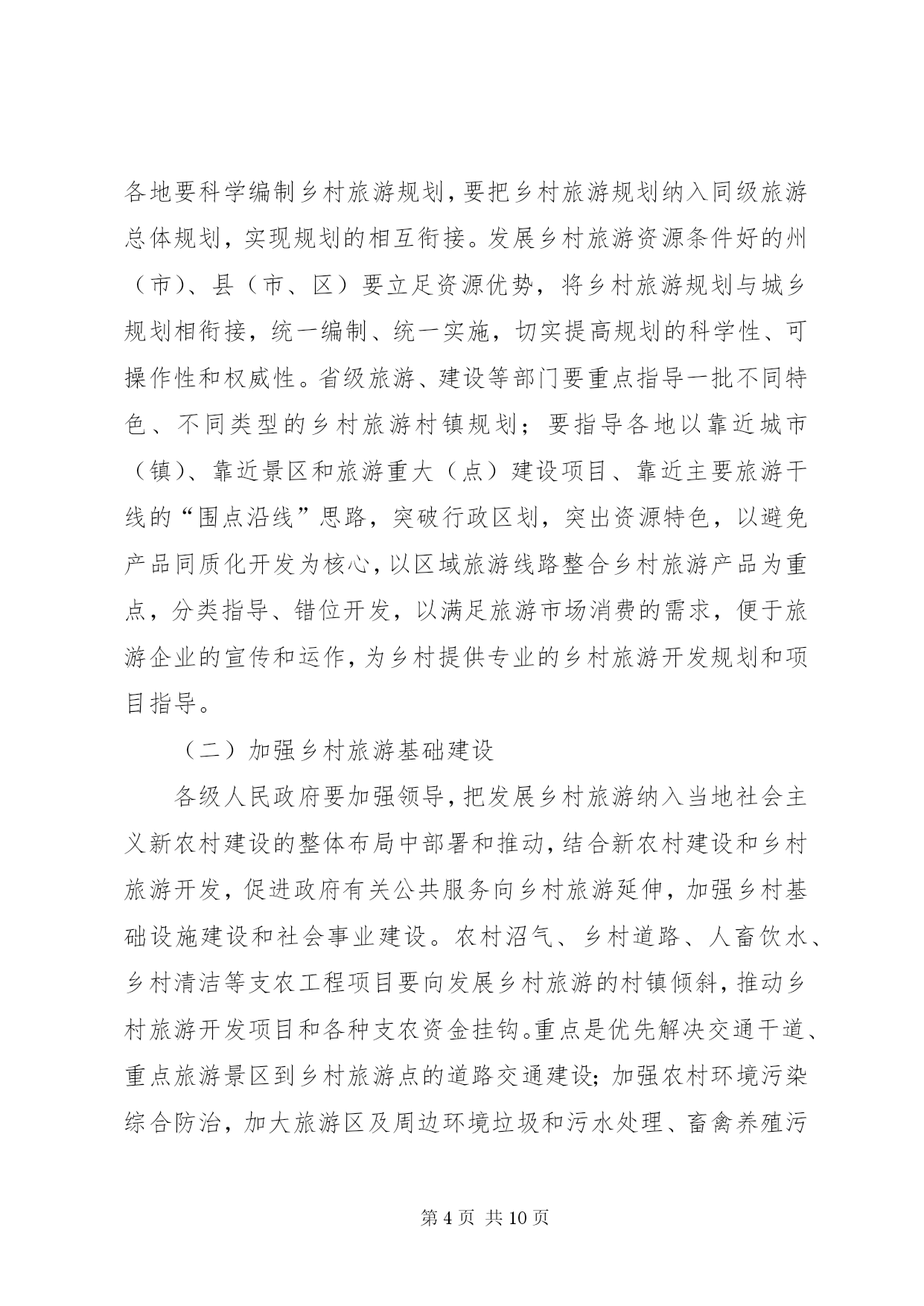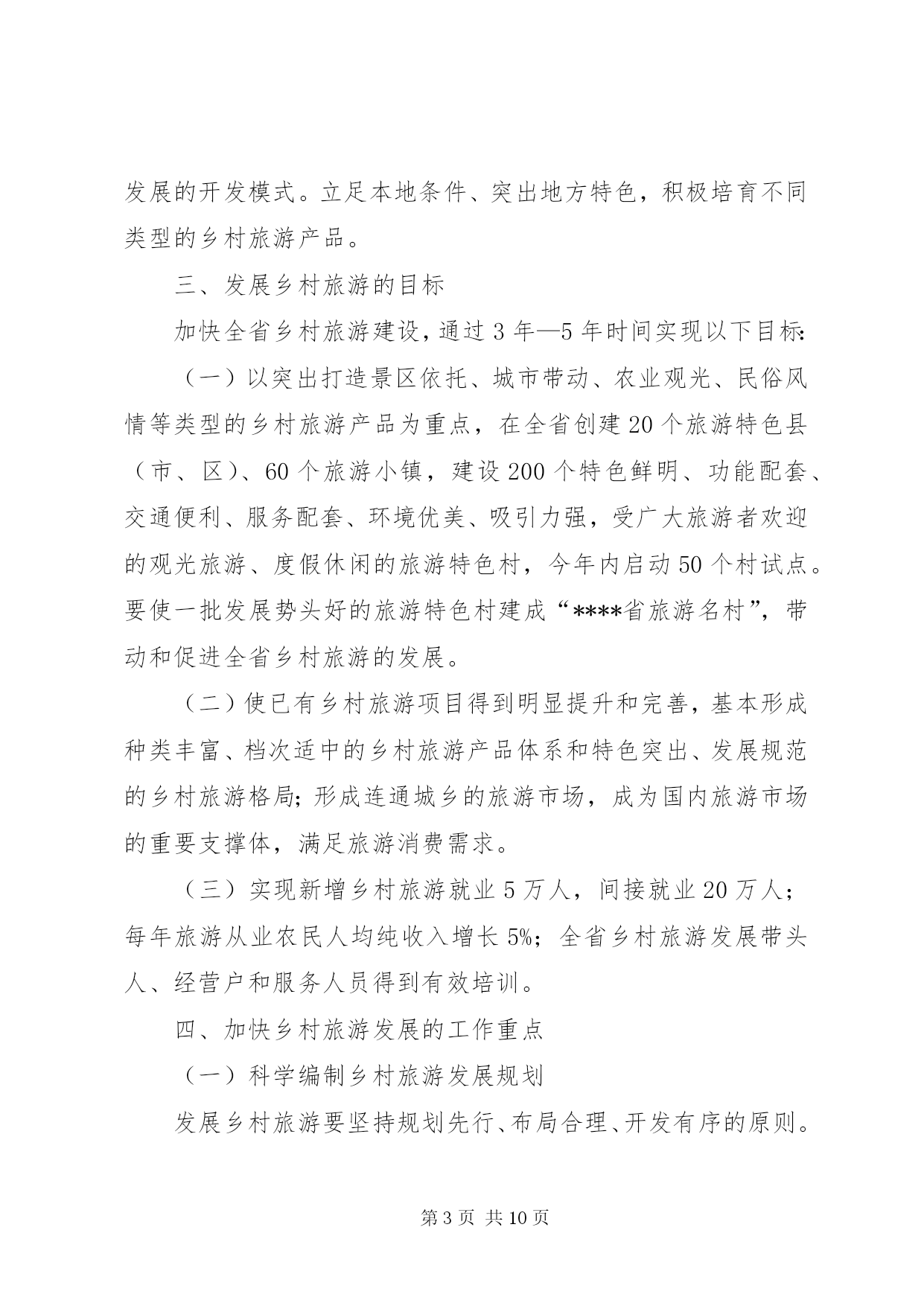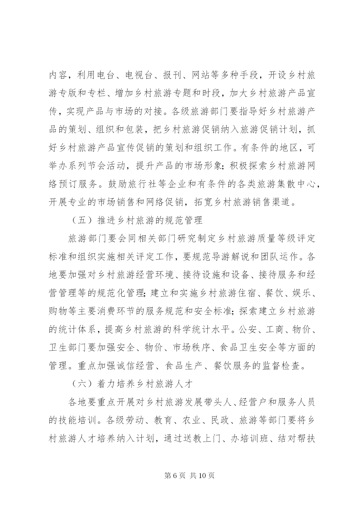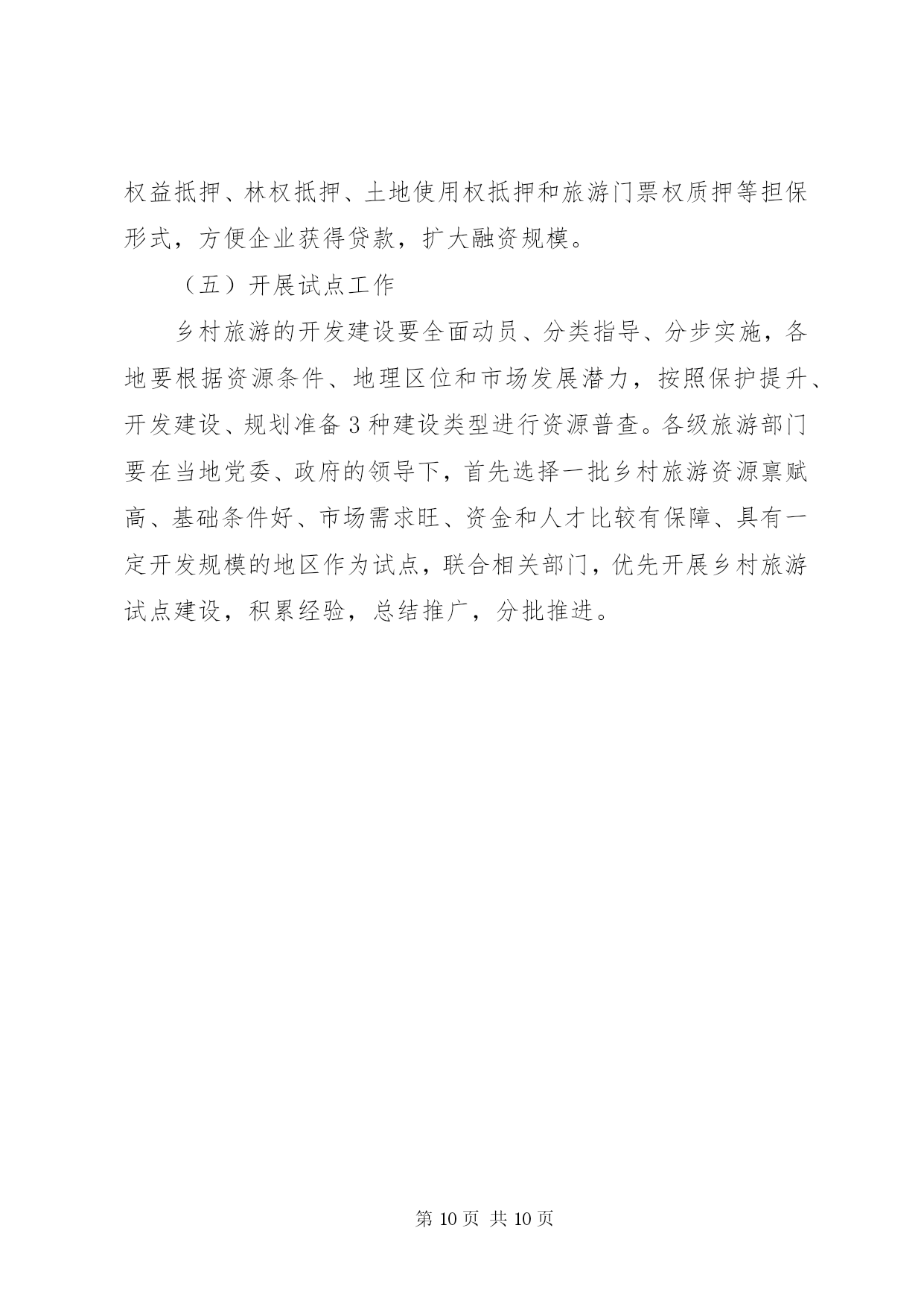 第PAGE\*Arabic\*MERGEFORMAT10页共NUMPAGES\*MERGEFORMAT10页加快乡村旅游发展意见为深入贯彻落实党中央、国务院关于社会主义新农村建设的战略部署,发挥旅游产业的关联带动作用,充分挖掘和利用“三农”资源,促进旅游业与农村建设有效结合,加快传统农业转型升级,推动全省乡村旅游快速健康发展,推进全省旅游二次创业,结合我省实际,特提出以下意见:一、发展乡村旅游的重要意义大力发展乡村旅游,以旅游促“三农”,是社会主义新农村建设的重要组成部分,是加快城乡经济统筹发展、实现产业联动和以城带乡的重要途径,对加快推进新农村建设、统筹城乡发展、增加农民就业机会、拓宽农民增收渠道、促进农村精神文明建设和满足游客旅游文化消费需求都具有十分重要的意义。同时,科学保护和合理开发各类乡村风光,宣传文化和生活吸引,开展乡村观光、休闲、度假和体验性旅游活动,对进一步保护生态环境和弘扬民族文化,丰富和优化我省旅游产品结构、区域结构和市场结构都将发挥积极的作用。二、发展乡村旅游的指导思想和基本原则加快乡村旅游发展的指导思想是:以科学发展观为指导,按照“生产发展、生活宽裕、乡风文明、村容整洁、管理民主”的要求,以建设小康、文明、生态、和谐的社会主义新农村为目标,从农村实际和旅游市场需求出发,发挥旅游产业的关联带动作用,以培育乡村旅游产业为主要任务,坚持政府主导、部门协作、多方参与、市场运作,结合扶贫开发、文明生态村建设和旅游经济强县、旅游小镇建设等,因地制宜,突出特色,不断完善乡村基础设施建设,丰富乡村旅游产品,优化乡村旅游环境,促进各地乡村旅游向市场化、产业化方向发展,实现以旅助农、以农兴旅、农旅结合、城乡互动,为社会主义新农村建设作出应有贡献。应坚持的基本原则是:(一)坚持政府主导原则。通过各级人民政府和部门加强对乡村旅游建设的统筹协调和引导扶持,形成多层次协同推进、社会各方共同参与的发展格局。(二)坚持统筹城乡发展原则。通过统筹广大乡村基础设施、配套设施建设和人才培养,促进旅游与相关产业互动发展,实现城乡互动、以旅促农。(三)坚持可持续发展原则。以保护为前提,发展为目的,通过科学合理开发,促进广大乡村生态环境的保护,促进乡村文物古迹、非物质文化遗产、民族民俗文化的挖掘和有效传承。(四)坚持以点带面、群众受益原则。通过打造一批旅游特色乡村,带动全省乡村旅游发展。充分发挥农户主体作用,扩大惠及当地居民的受益面。(五)坚持因地制宜、分类指导原则。紧密结合乡村资源条件、地理区位和经济社会发展水平,大胆探索符合当地乡村旅游发展的开发模式。立足本地条件、突出地方特色,积极培育不同类型的乡村旅游产品。三、发展乡村旅游的目标加快全省乡村旅游建设,通过3年—5年时间实现以下目标:(一)以突出打造景区依托、城市带动、农业观光、民俗风情等类型的乡村旅游产品为重点,在全省创建20个旅游特色县(市、区)、60个旅游小镇,建设200个特色鲜明、功能配套、交通便利、服务配套、环境优美、吸引力强,受广大旅游者欢迎的观光旅游、度假休闲的旅游特色村,今年内启动50个村试点。要使一批发展势头好的旅游特色村建成“****省旅游名村”,带动和促进全省乡村旅游的发展。(二)使已有乡村旅游项目得到明显提升和完善,基本形成种类丰富、档次适中的乡村旅游产品体系和特色突出、发展规范的乡村旅游格局;形成连通城乡的旅游市场,成为国内旅游市场的重要支撑体,满足旅游消费需求。(三)实现新增乡村旅游就业5万人,间接就业20万人;每年旅游从业农民人均纯收入增长5%;全省乡村旅游发展带头人、经营户和服务人员得到有效培训。四、加快乡村旅游发展的工作重点(一)科学编制乡村旅游发展规划发展乡村旅游要坚持规划先行、布局合理、开发有序的原则。各地要科学编制乡村旅游规划,要把乡村旅游规划纳入同级旅游总体规划,实现规划的相互衔接。发展乡村旅游资源条件好的州(市)、县(市、区)要立足资源优势,将乡村旅游规划与城乡规划相衔接,统一编制、统一实施,切实提高规划的科学性、可操作性和权威性。省级旅游、建设等部门要重点指导一批不同特色、不同类型的乡村旅游村镇规划;要指导各地以靠近城市(镇)、靠近景区和旅游重大(点)建设项目、靠近主要旅游干线的“围点沿线”思路,突破行政区划,突出资源特色,以避免产品同质化开发为核心,以区域旅游线路整合乡村旅游产品为重点,分类指导、错位开发,以满足旅游市场消费的需求,便于旅游企业的宣传和运作,为乡村提供专业的乡村旅游开发规划和项目指导。(二)加强乡村旅游基础建设各级人民政府要加强领导,把发展乡村旅游纳入当地社会主义新农村建设的整体布局中部署和推动,结合新农村建设和乡村旅游开发,促进政府有关公共服务向乡村旅游延伸,加强乡村基础设施建设和社会事业建设。农村沼