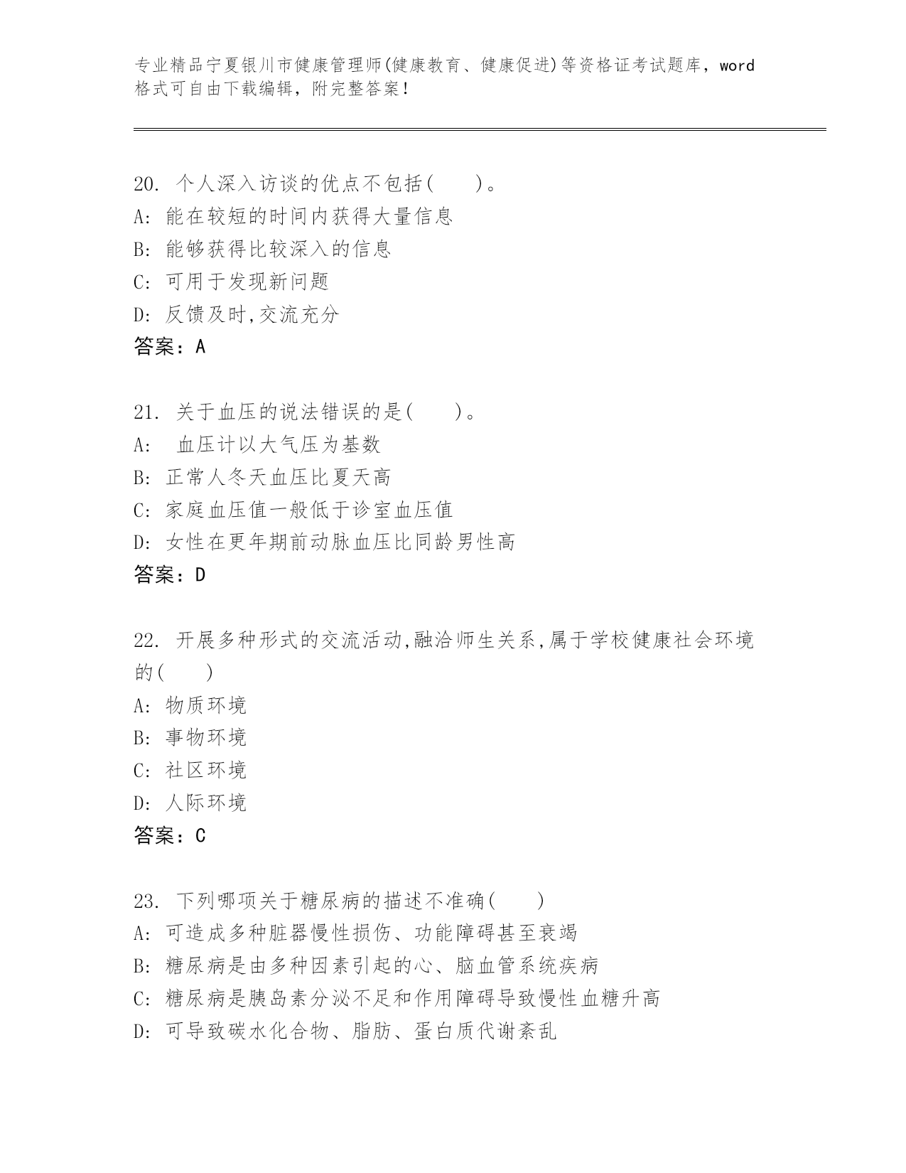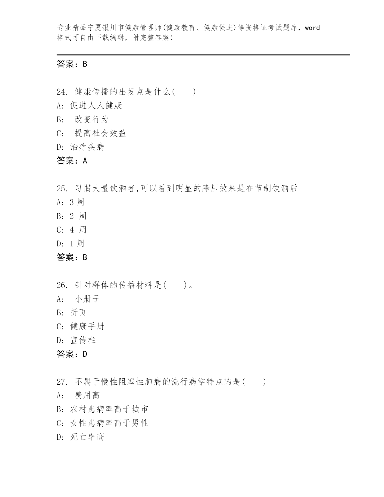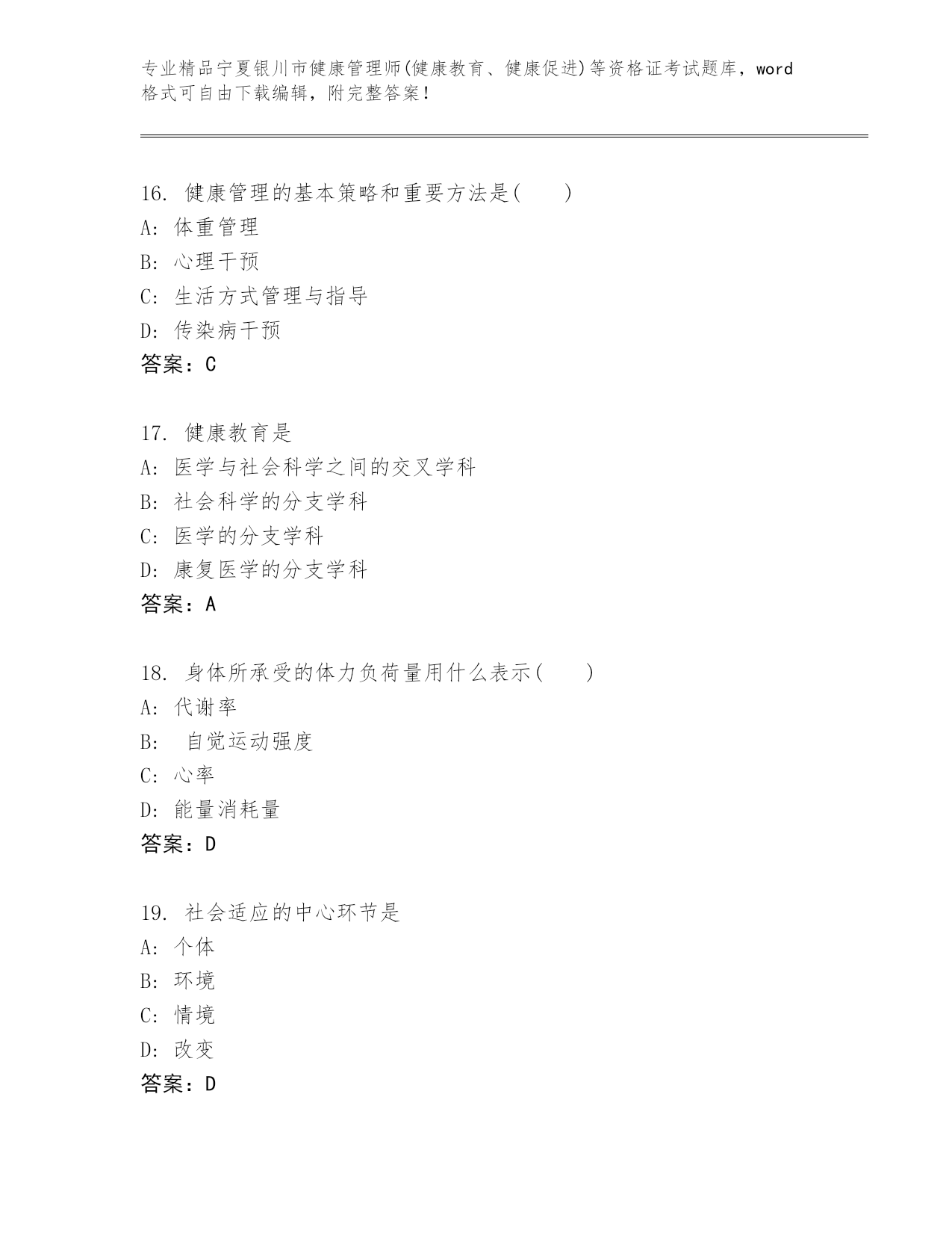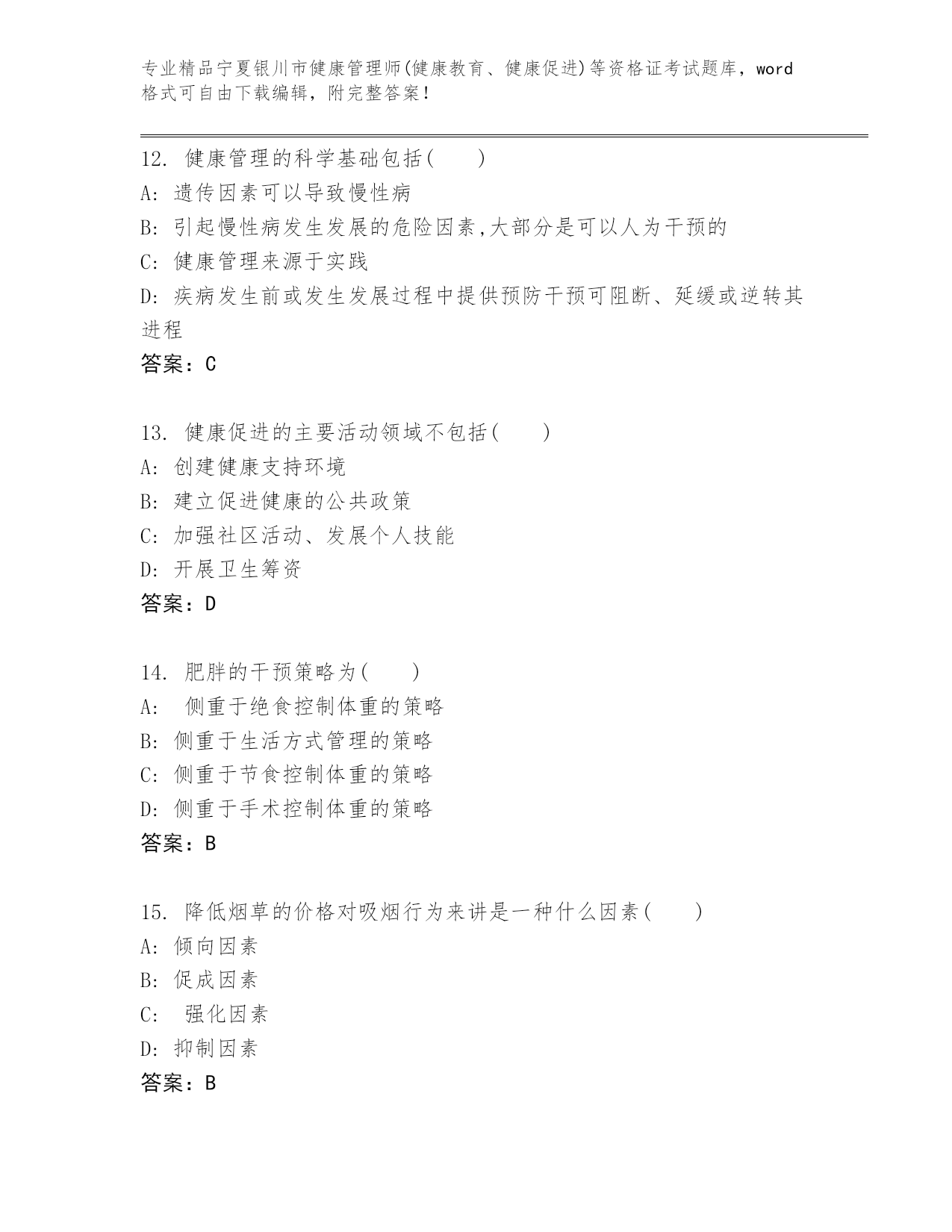 完整版宁夏银川市健康管理师(健康教育、健康促进)等资格证考试及参考答案(名师推荐)