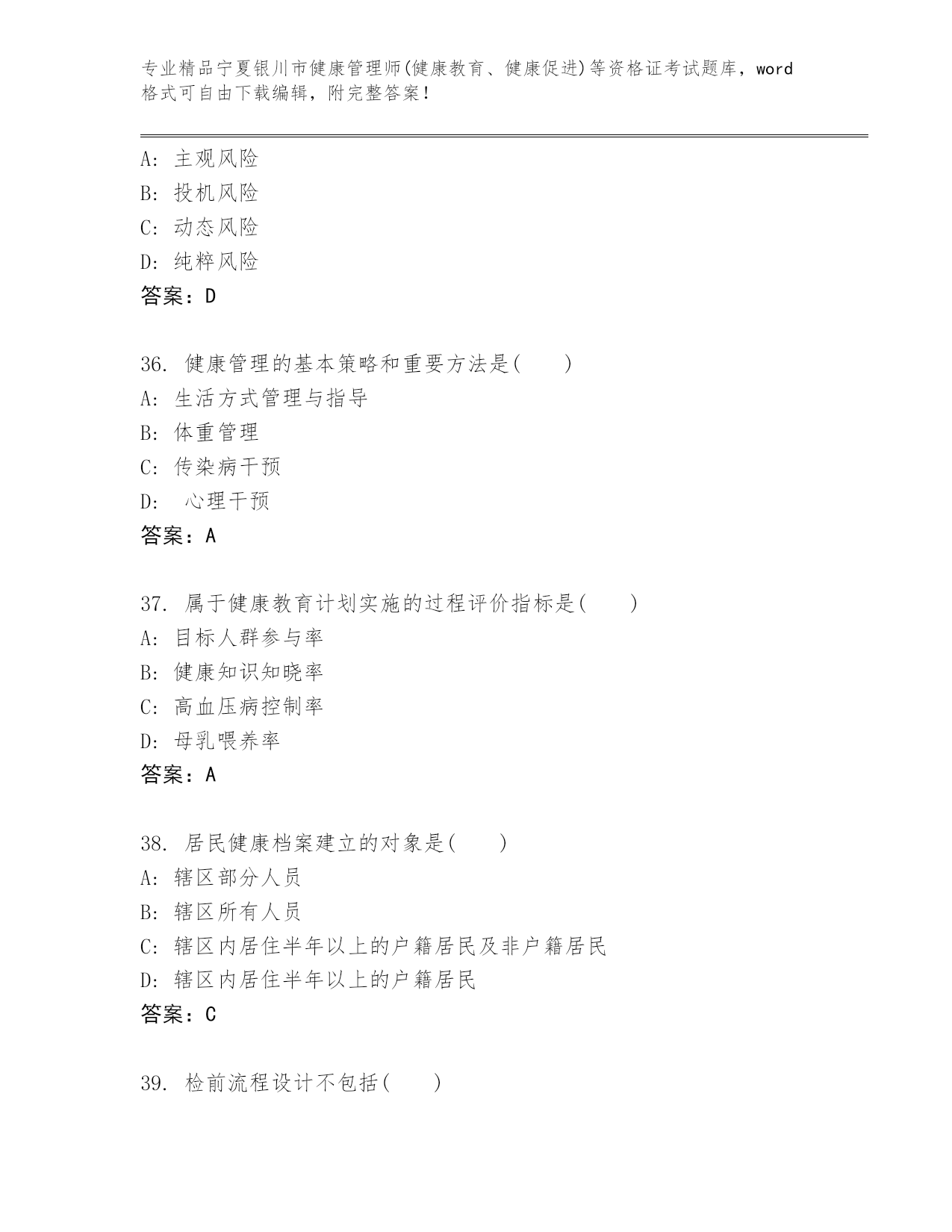 完整版宁夏银川市健康管理师(健康教育、健康促进)等资格证考试及参考答案(名师推荐).docx