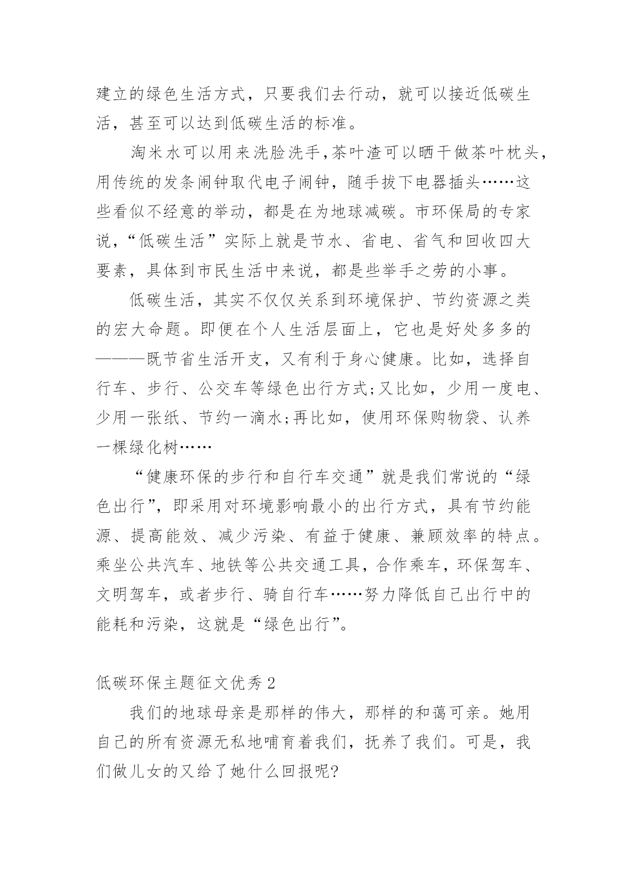 低碳环保主题征文优秀在平平淡淡的日常中,大家都经常看到征文的身影吧,征文具有主题鲜明、内容清楚的特点。相信写征文是一个让许多人都头痛的问题,以下是小编收集整理的低碳环保主题征文优秀,仅供参考,欢迎大家阅读。低碳环保主题征文优秀1记得去年夏天,天气非常热,我和我的家人“躲”在家里看电视。老爸离开沙发,走到空调下,找了找空调遥控器,便“啪啪”地按了几下。之后又走到沙发旁坐了下来,我好奇的问老爸:“老爸,你刚才干什么的呀?”老爸说:“没干什么!”我不信,便穿上鞋,走到空调下,拿起空调遥控器,看了一眼,呀,原来老爸把空调调到了24摄氏度,我对老妈说:“老妈,你快跟老爸说叫他把空调关掉吧,如果我们把空调关掉,把电风扇打开,那能减少多少排碳量啊!”又为大自然节省了能源。记得还有一次,我和老妈要去买纸盘,由于第二天要用,我们晚上才去超市。出门时,老妈对我说:“一会儿到超市车停哪儿呢?”我连忙对老妈说:“不行不行!如果开车去,没地方停,最重要的是开车去会排出多少碳哪!”老妈听了我的.话,陪我走到了超市。低碳生活只是一种态度,而不是能力,我们应该从节电、节水、节碳、节油、节气这种小事做起,低碳生活是我们要建立的绿色生活方式,只要我们去行动,就可以接近低碳生活,甚至可以达到低碳生活的标准。淘米水可以用来洗脸洗手,茶叶渣可以晒干做茶叶枕头,用传统的发条闹钟取代电子闹钟,随手拔下电器插头……这些看似不经意的举动,都是在为地球减碳。市环保局的专家说,“低碳生活”实际上就是节水、省电、省气和回收四大要素,具体到市民生活中来说,都是些举手之劳的小事。低碳生活,其实不仅仅关系到环境保护、节约资源之类的宏大命题。即便在个人生活层面上,它也是好处多多的———既节省生活开支,又有利于身心健康。比如,选择自行车、步行、公交车等绿色出行方式;又比如,少用一度电、少用一张纸、节约一滴水;再比如,使用环保购物袋、认养一棵绿化树……“健康环保的步行和自行车交通”就是我们常说的“绿色出行”,即采用对环境影响最小的出行方式,具有节约能源、提高能效、减少污染、有益于健康、兼顾效率的特点。乘坐公共汽车、地铁等公共交通工具,合作乘车,环保驾车、文明驾车,或者步行、骑自行车……努力降低自己出行中的能耗和污染,这就是“绿色出行”。低碳环保主题征文优秀2我们的地球母亲是那样的伟大,那样的和蔼可亲。她用自己的所有资源无私地哺育着我们,抚养了我们。可是,我们做儿女的又给了她什么回报呢?我们什么也没有回报,我们给予母亲的只是一件件令她伤心的事:滥用化学品,使母亲身上体无完肤;乱砍乱伐,使母亲漂亮的绿色花衣一天天消逝;胡乱开垦,让母亲的血液不再清澈,而是浑黄一体,满江泥沙……有人可能会问这到底是我们造成的吗?越来越多的动物灭绝,越来越多的绿洲沙漠化。大气层遭破坏,汽车尾气、工厂废烟使我们的空气质量一天不如一天。昔日的清澈小溪,今日的死鱼塘。原本郁郁葱葱的'森林,最后只剩下光秃秃的树桩……我们要珍惜地球母亲给予我们的一切,来保护这一切,不能因为自己的一己私利而破坏它;不能因为自己的一次冲动破坏它的和谐。我们要为了后代着想,不要让子孙只看到濒临灭绝的动物化石。既然保护地球的重任交到了我们的手上,我们就应该尽自己的责任,让地球成为永恒!我们这些后代可以为她做些什么呢?今年正在召开的-,把“倡导环保新生活”作为重要的议题进行讨论,节能减排,低碳生活等环保理念和健康文明的生活方式,被越来越多的人认识并践行。“低碳风”已经吹入社会的方方面面。作为一名小学生,我们应该深切地感受到保护地球母亲的紧迫感与使命感。地球母亲是我们共同的家,我们应该保护她。我们在上学放学的路上不乱丢废弃物,随手把路上的垃圾捡捡干净,出门扔垃圾时分分类,把废电池扔进不可回收箱里;把被风吹歪的小树扶正,爱护花草树木,保护森林;远行时,不做小汽车,可以走路或骑自行车;节约用电,随手关灯;节约每一张纸,提倡双面用纸,利用家中洁净的废纸做草稿纸,减少纸张消耗;珍惜每一滴水,合理使用水资源,用完水后随手关闭阀门,把淘米、洗菜的水用来浇花或冲厕所;发扬勤俭节约传统美德,杜绝浪费现象,不吃零食,不浪费食品等从点滴做起。提倡低碳生活,就要从小事做起,从我做起,从点点滴滴的小事做起,从保护环境做起,让我们一起行动、共同努力,让地球明天变得更加美好吧!
