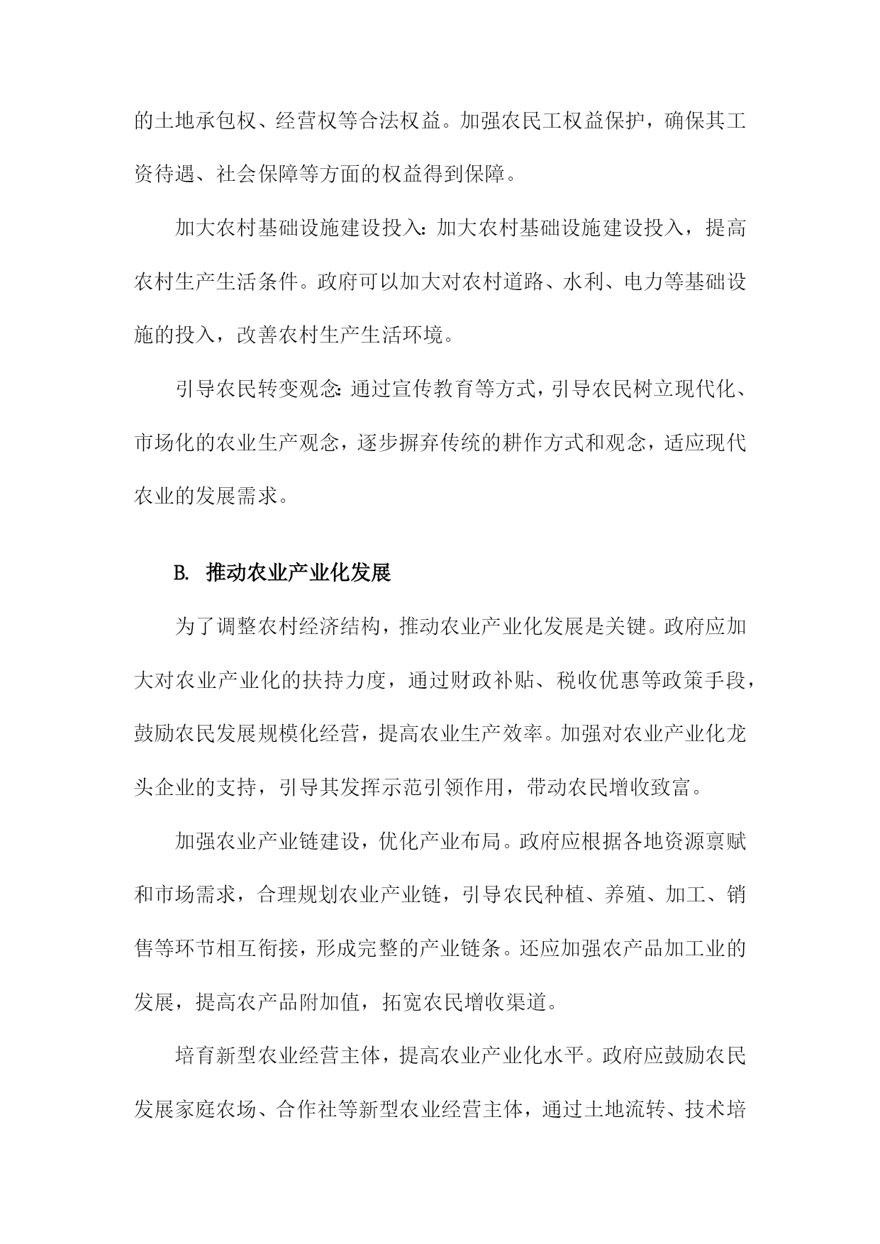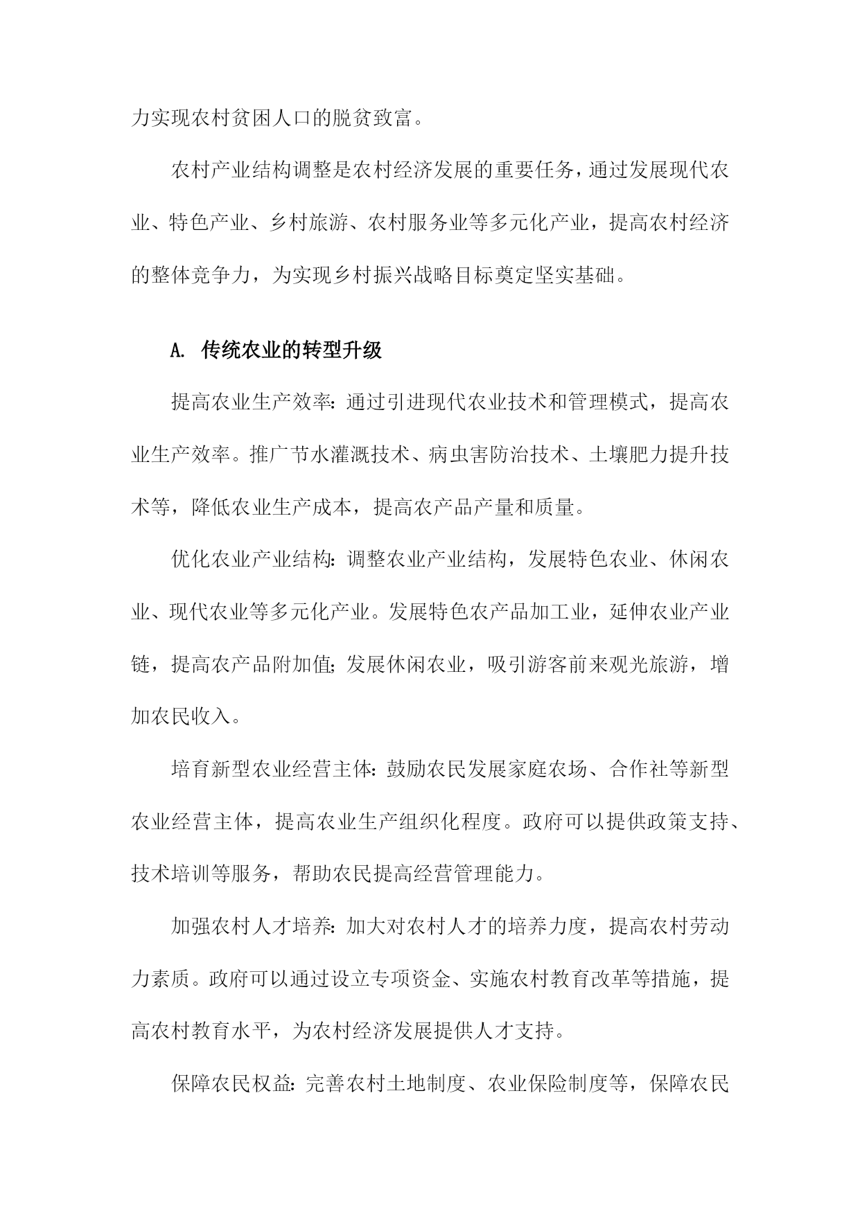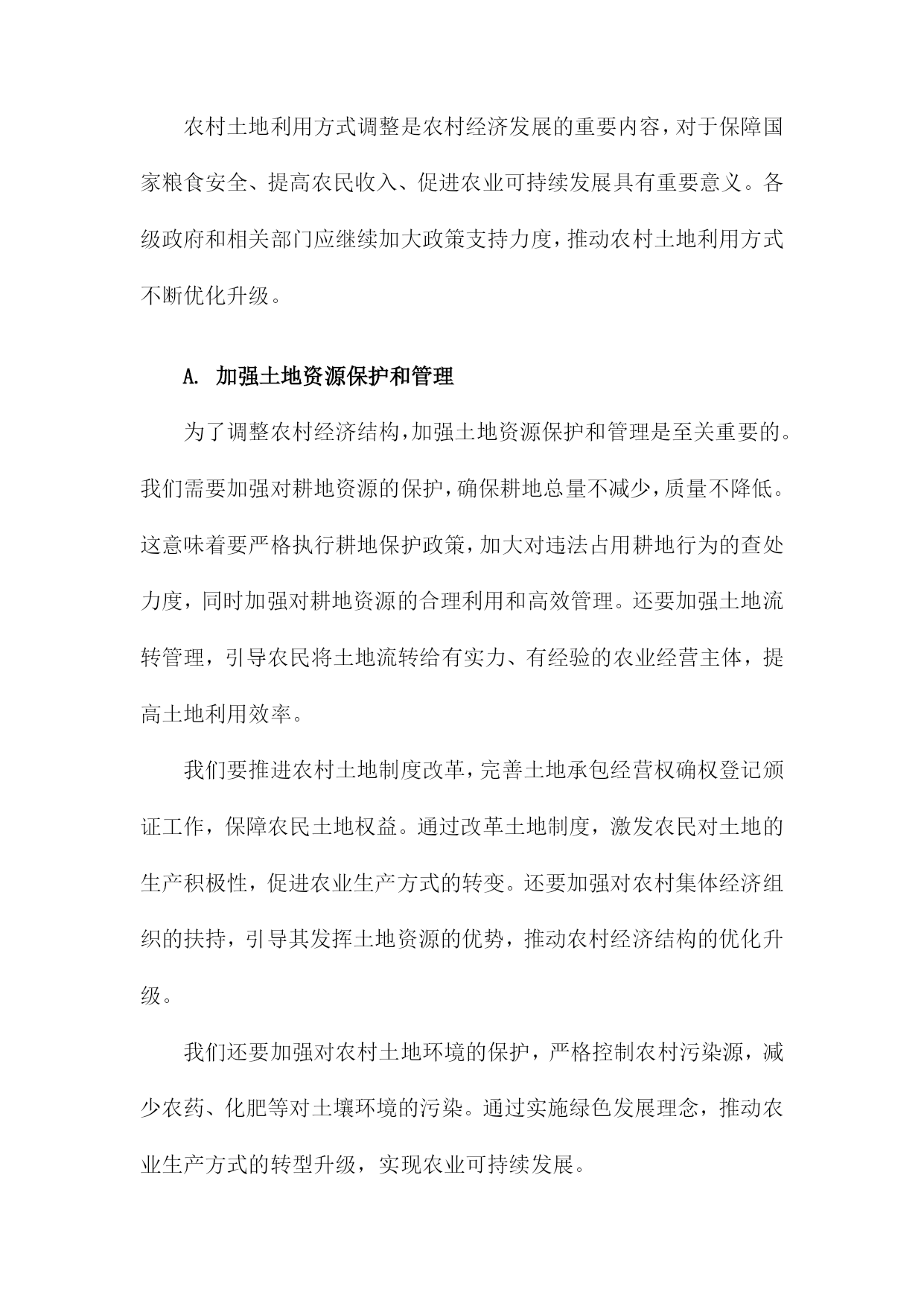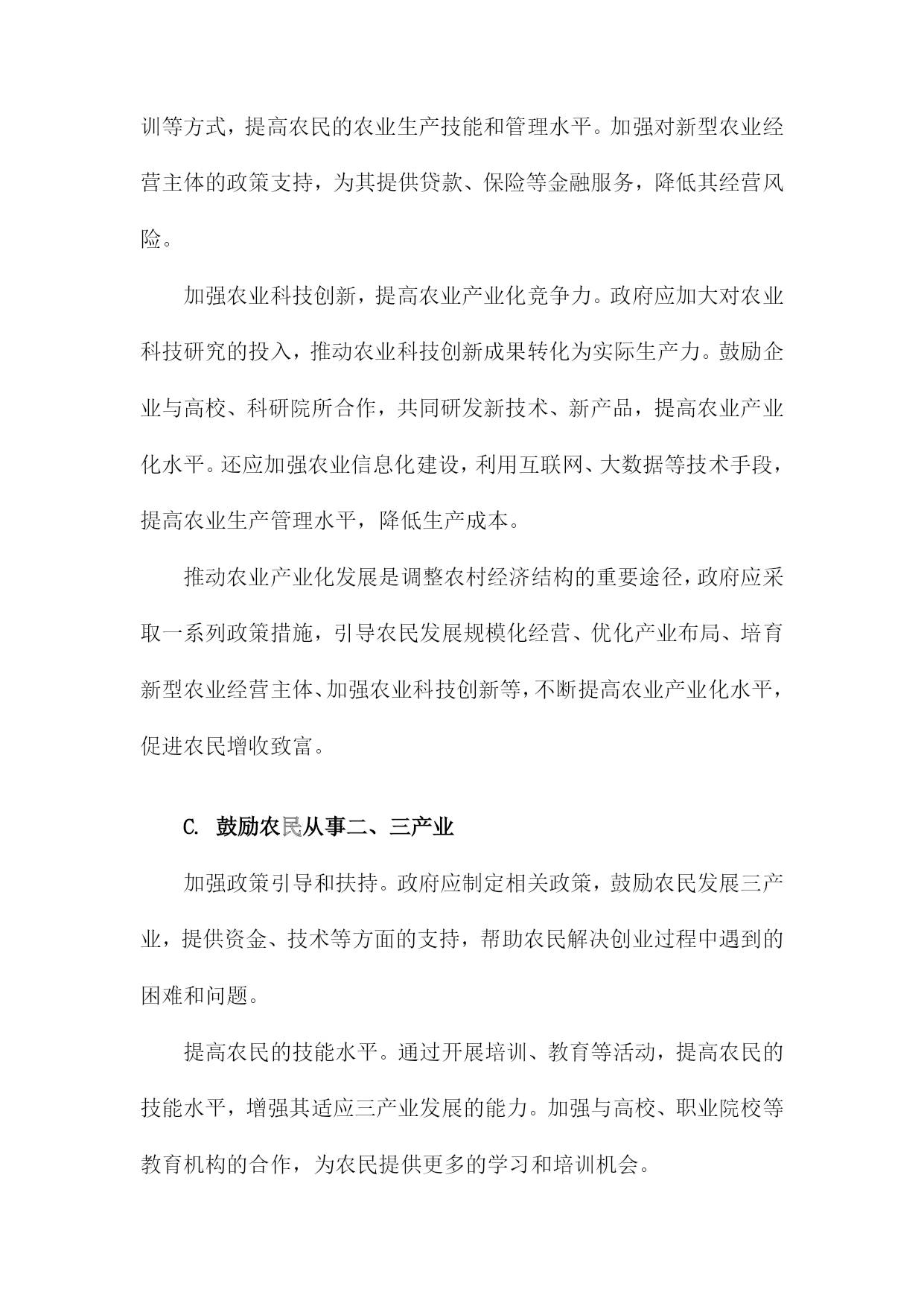 调整农村经济结构一、农村产业结构调整发展现代农业。加大对农业科技研发的投入,推广先进的农业生产技术,提高农业生产效率。加强农业基础设施建设,改善农田水利条件,提高农田抗灾能力。发展特色产业。根据各地区的资源优势和市场需求,发展具有地方特色的农产品加工业,如水果、蔬菜、畜禽养殖等。通过产业链延伸,提高农产品附加值,增加农民收入。发展乡村旅游。充分利用农村的自然风光、历史文化等资源,发展乡村旅游产业。通过提供农家乐、民宿、特色农产品销售等服务,吸引游客前来消费,带动农村经济发展。发展农村服务业。鼓励农民发展家庭手工业、农产品加工、农村电商等服务业,拓宽农民就业渠道,提高农民收入水平。加强农民工培训和转移就业工作。通过职业技能培训、创业指导等方式,提高农民工的就业技能和创业能力。积极引导农民工向中西部地区转移就业,缓解东部沿海地区劳动力过剩的压力。完善农村社会保障体系。建立健全农村养老保险、医疗保险等社会保障制度,保障农民的基本生活。加大对贫困地区的扶贫力度,努力实现农村贫困人口的脱贫致富。农村产业结构调整是农村经济发展的重要任务,通过发展现代农业、特色产业、乡村旅游、农村服务业等多元化产业,提高农村经济的整体竞争力,为实现乡村振兴战略目标奠定坚实基础。A.传统农业的转型升级提高农业生产效率:通过引进现代农业技术和管理模式,提高农业生产效率。推广节水灌溉技术、病虫害防治技术、土壤肥力提升技术等,降低农业生产成本,提高农产品产量和质量。优化农业产业结构:调整农业产业结构,发展特色农业、休闲农业、现代农业等多元化产业。发展特色农产品加工业,延伸农业产业链,提高农产品附加值;发展休闲农业,吸引游客前来观光旅游,增加农民收入。培育新型农业经营主体:鼓励农民发展家庭农场、合作社等新型农业经营主体,提高农业生产组织化程度。政府可以提供政策支持、技术培训等服务,帮助农民提高经营管理能力。加强农村人才培养:加大对农村人才的培养力度,提高农村劳动力素质。政府可以通过设立专项资金、实施农村教育改革等措施,提高农村教育水平,为农村经济发展提供人才支持。保障农民权益:完善农村土地制度、农业保险制度等,保障农民的土地承包权、经营权等合法权益。加强农民工权益保护,确保其工资待遇、社会保障等方面的权益得到保障。加大农村基础设施建设投入:加大农村基础设施建设投入,提高农村生产生活条件。政府可以加大对农村道路、水利、电力等基础设施的投入,改善农村生产生活环境。引导农民转变观念:通过宣传教育等方式,引导农民树立现代化、市场化的农业生产观念,逐步摒弃传统的耕作方式和观念,适应现代农业的发展需求。B.推动农业产业化发展为了调整农村经济结构,推动农业产业化发展是关键。政府应加大对农业产业化的扶持力度,通过财政补贴、税收优惠等政策手段,鼓励农民发展规模化经营,提高农业生产效率。加强对农业产业化龙头企业的支持,引导其发挥示范引领作用,带动农民增收致富。加强农业产业链建设,优化产业布局。政府应根据各地资源禀赋和市场需求,合理规划农业产业链,引导农民种植、养殖、加工、销售等环节相互衔接,形成完整的产业链条。还应加强农产品加工业的发展,提高农产品附加值,拓宽农民增收渠道。培育新型农业经营主体,提高农业产业化水平。政府应鼓励农民发展家庭农场、合作社等新型农业经营主体,通过土地流转、技术培训等方式,提高农民的农业生产技能和管理水平。加强对新型农业经营主体的政策支持,为其提供贷款、保险等金融服务,降低其经营风险。加强农业科技创新,提高农业产业化竞争力。政府应加大对农业科技研究的投入,推动农业科技创新成果转化为实际生产力。鼓励企业与高校、科研院所合作,共同研发新技术、新产品,提高农业产业化水平。还应加强农业信息化建设,利用互联网、大数据等技术手段,提高农业生产管理水平,降低生产成本。推动农业产业化发展是调整农村经济结构的重要途径,政府应采取一系列政策措施,引导农民发展规模化经营、优化产业布局、培育新型农业经营主体、加强农业科技创新等,不断提高农业产业化水平,促进农民增收致富。C.鼓励农民从事二、三产业加强政策引导和扶持。政府应制定相关政策,鼓励农民发展三产业,提供资金、技术等方面的支持,帮助农民解决创业过程中遇到的困难和问题。提高农民的技能水平。通过开展培训、教育等活动,提高农民的技能水平,增强其适应三产业发展的能力。加强与高校、职业院校等教育机构的合作,为农民提供更多的学习和培训机会。发挥农业产业化优势。依托农业产业化龙头企业,推动农产品加工、流通等环节的发展,延伸产业链条,提高附加值,增加农民收入来源。培育新兴产业。鼓励农民发展特色种植、养殖等新兴产业,利用当地资源优势,开发具有市场潜力的产品,满足市场需求,促进农村经济发展。加强基