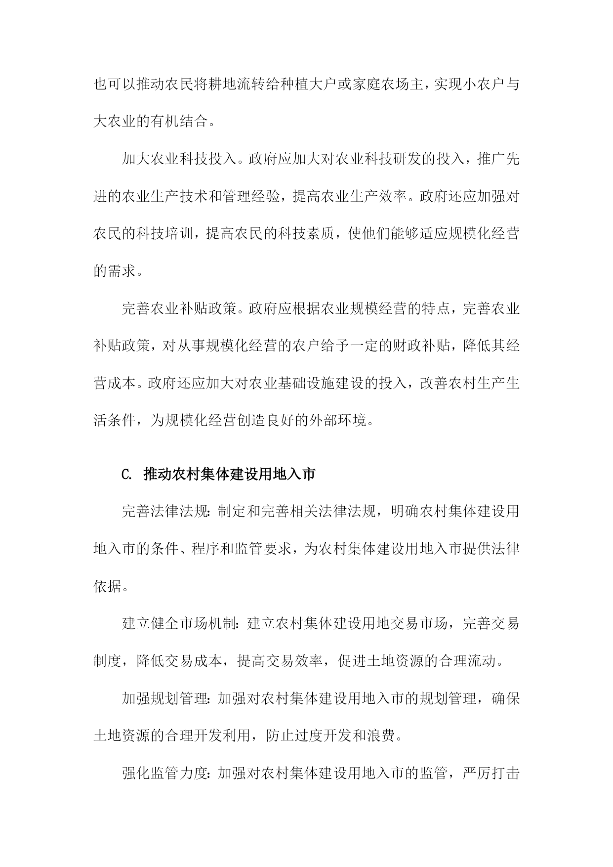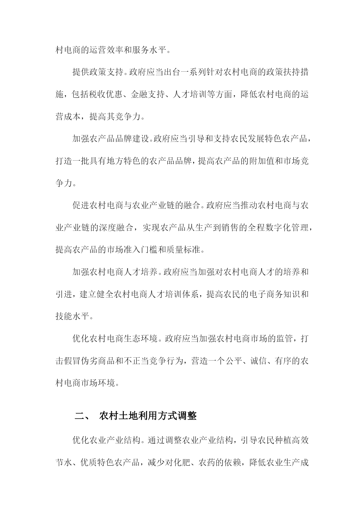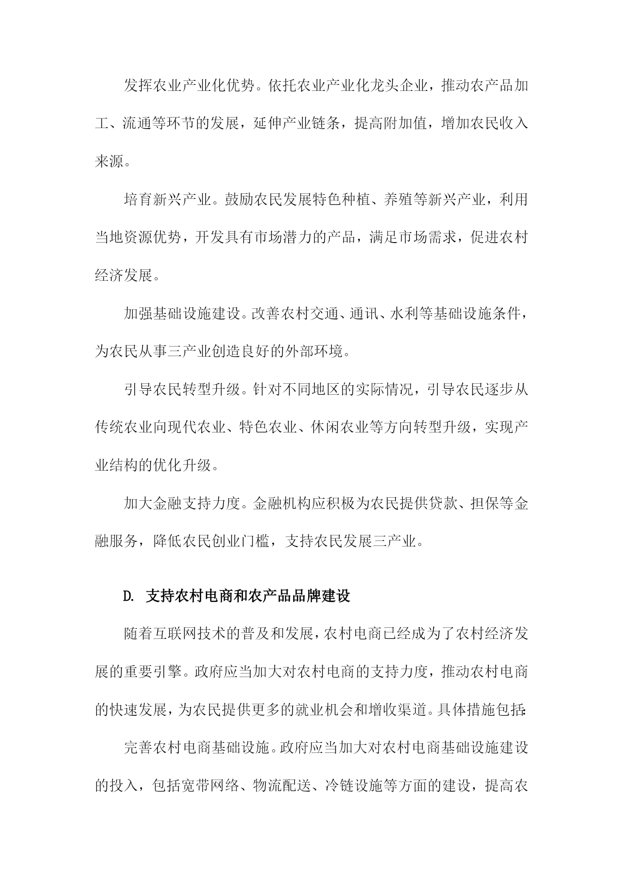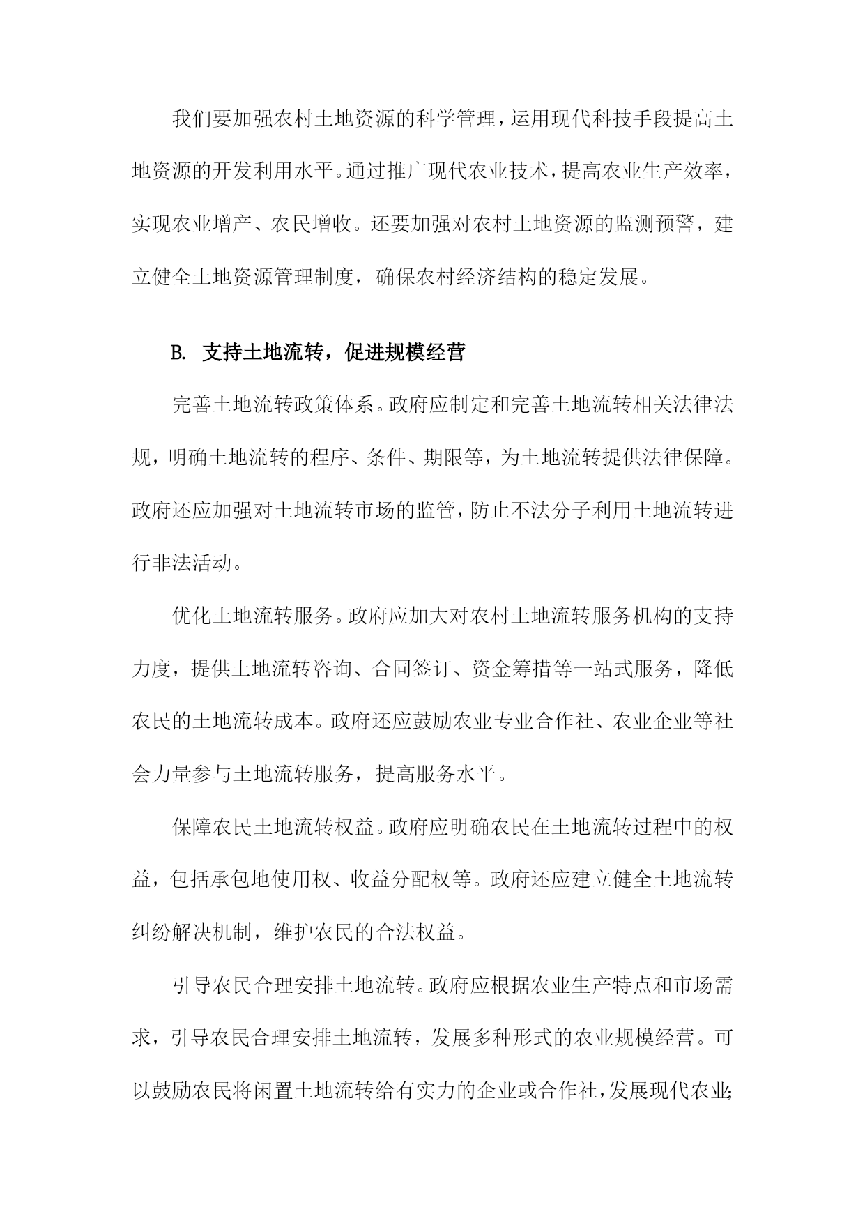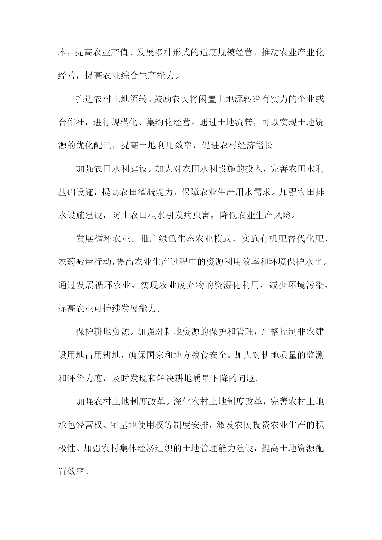 调整农村经济结构一、农村产业结构调整发展现代农业。加大对农业科技研发的投入,推广先进的农业生产技术,提高农业生产效率。加强农业基础设施建设,改善农田水利条件,提高农田抗灾能力。发展特色产业。根据各地区的资源优势和市场需求,发展具有地方特色的农产品加工业,如水果、蔬菜、畜禽养殖等。通过产业链延伸,提高农产品附加值,增加农民收入。发展乡村旅游。充分利用农村的自然风光、历史文化等资源,发展乡村旅游产业。通过提供农家乐、民宿、特色农产品销售等服务,吸引游客前来消费,带动农村经济发展。发展农村服务业。鼓励农民发展家庭手工业、农产品加工、农村电商等服务业,拓宽农民就业渠道,提高农民收入水平。加强农民工培训和转移就业工作。通过职业技能培训、创业指导等方式,提高农民工的就业技能和创业能力。积极引导农民工向中西部地区转移就业,缓解东部沿海地区劳动力过剩的压力。完善农村社会保障体系。建立健全农村养老保险、医疗保险等社会保障制度,保障农民的基本生活。加大对贫困地区的扶贫力度,努力实现农村贫困人口的脱贫致富。农村产业结构调整是农村经济发展的重要任务,通过发展现代农业、特色产业、乡村旅游、农村服务业等多元化产业,提高农村经济的整体竞争力,为实现乡村振兴战略目标奠定坚实基础。A.传统农业的转型升级提高农业生产效率:通过引进现代农业技术和管理模式,提高农业生产效率。推广节水灌溉技术、病虫害防治技术、土壤肥力提升技术等,降低农业生产成本,提高农产品产量和质量。优化农业产业结构:调整农业产业结构,发展特色农业、休闲农业、现代农业等多元化产业。发展特色农产品加工业,延伸农业产业链,提高农产品附加值;发展休闲农业,吸引游客前来观光旅游,增加农民收入。培育新型农业经营主体:鼓励农民发展家庭农场、合作社等新型农业经营主体,提高农业生产组织化程度。政府可以提供政策支持、技术培训等服务,帮助农民提高经营管理能力。加强农村人才培养:加大对农村人才的培养力度,提高农村劳动力素质。政府可以通过设立专项资金、实施农村教育改革等措施,提高农村教育水平,为农村经济发展提供人才支持。保障农民权益:完善农村土地制度、农业保险制度等,保障农民的土地承包权、经营权等合法权益。加强农民工权益保护,确保其工资待遇、社会保障等方面的权益得到保障。加大农村基础设施建设投入:加大农村基础设施建设投入,提高农村生产生活条件。政府可以加大对农村道路、水利、电力等基础设施的投入,改善农村生产生活环境。引导农民转变观念:通过宣传教育等方式,引导农民树立现代化、市场化的农业生产观念,逐步摒弃传统的耕作方式和观念,适应现代农业的发展需求。B.推动农业产业化发展为了调整农村经济结构,推动农业产业化发展是关键。政府应加大对农业产业化的扶持力度,通过财政补贴、税收优惠等政策手段,鼓励农民发展规模化经营,提高农业生产效率。加强对农业产业化龙头企业的支持,引导其发挥示范引领作用,带动农民增收致富。加强农业产业链建设,优化产业布局。政府应根据各地资源禀赋和市场需求,合理规划农业产业链,引导农民种植、养殖、加工、销售等环节相互衔接,形成完整的产业链条。还应加强农产品加工业的发展,提高农产品附加值,拓宽农民增收渠道。培育新型农业经营主体,提高农业产业化水平。政府应鼓励农民发展家庭农场、合作社等新型农业经营主体,通过土地流转、技术培训等方式,提高农民的农业生产技能和管理水平。加强对新型农业经营主体的政策支持,为其提供贷款、保险等金融服务,降低其经营风险。加强农业科技创新,提高农业产业化竞争力。政府应加大对农业科技研究的投入,推动农业科技创新成果转化为实际生产力。鼓励企业与高校、科研院所合作,共同研发新技术、新产品,提高农业产业化水平。还应加强农业信息化建设,利用互联网、大数据等技术手段,提高农业生产管理水平,降低生产成本。推动农业产业化发展是调整农村经济结构的重要途径,政府应采取一系列政策措施,引导农民发展规模化经营、优化产业布局、培育新型农业经营主体、加强农业科技创新等,不断提高农业产业化水平,促进农民增收致富。C.鼓励农民从事二、三产业加强政策引导和扶持。政府应制定相关政策,鼓励农民发展三产业,提供资金、技术等方面的支持,帮助农民解决创业过程中遇到的困难和问题。提高农民的技能水平。通过开展培训、教育等活动,提高农民的技能水平,增强其适应三产业发展的能力。加强与高校、职业院校等教育机构的合作,为农民提供更多的学习和培训机会。发挥农业产业化优势。依托农业产业化龙头企业,推动农产品加工、流通等环节的发展,延伸产业链条,提高附加值,增加农民收入来源。培育新兴产业。鼓励农民发展特色种植、养殖等新兴产业,利用当地资源优势,开发具有市场潜力的产品,满足市场需求,促进农村经济发展。加强基