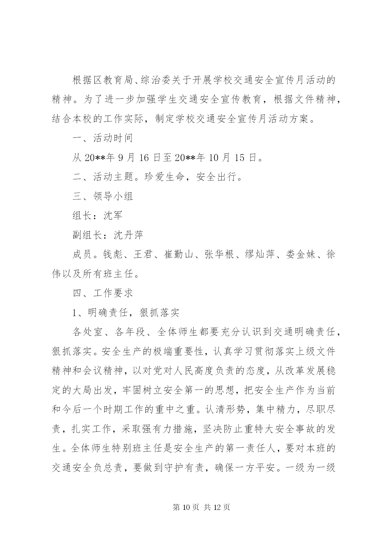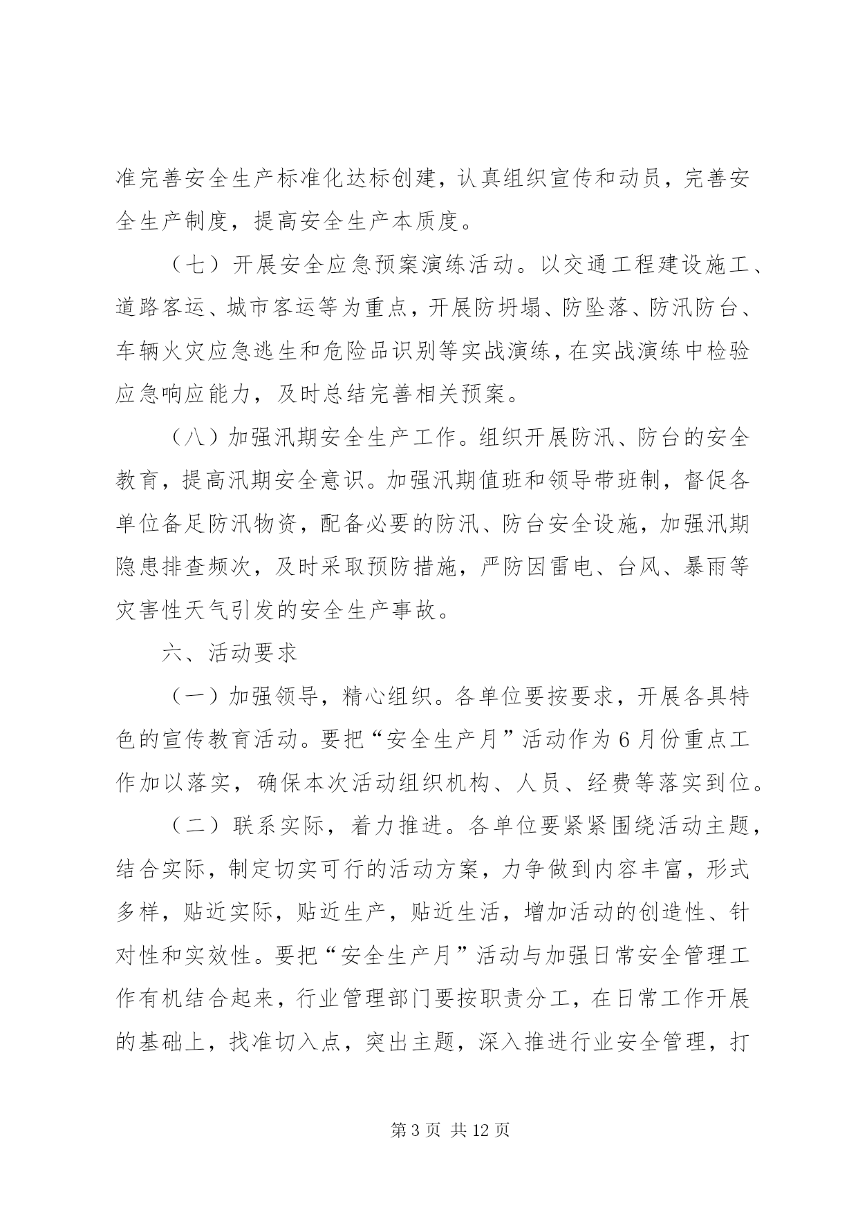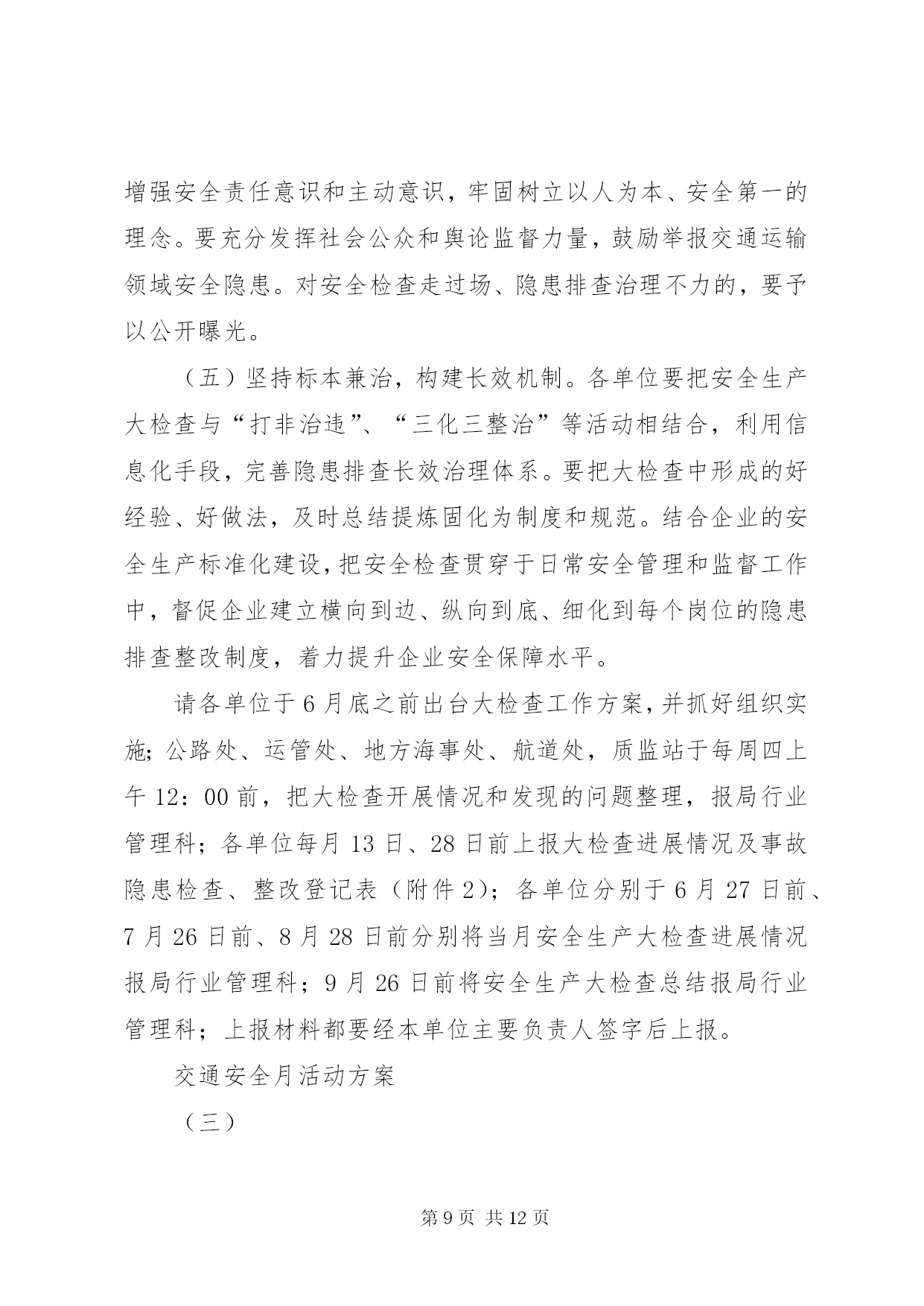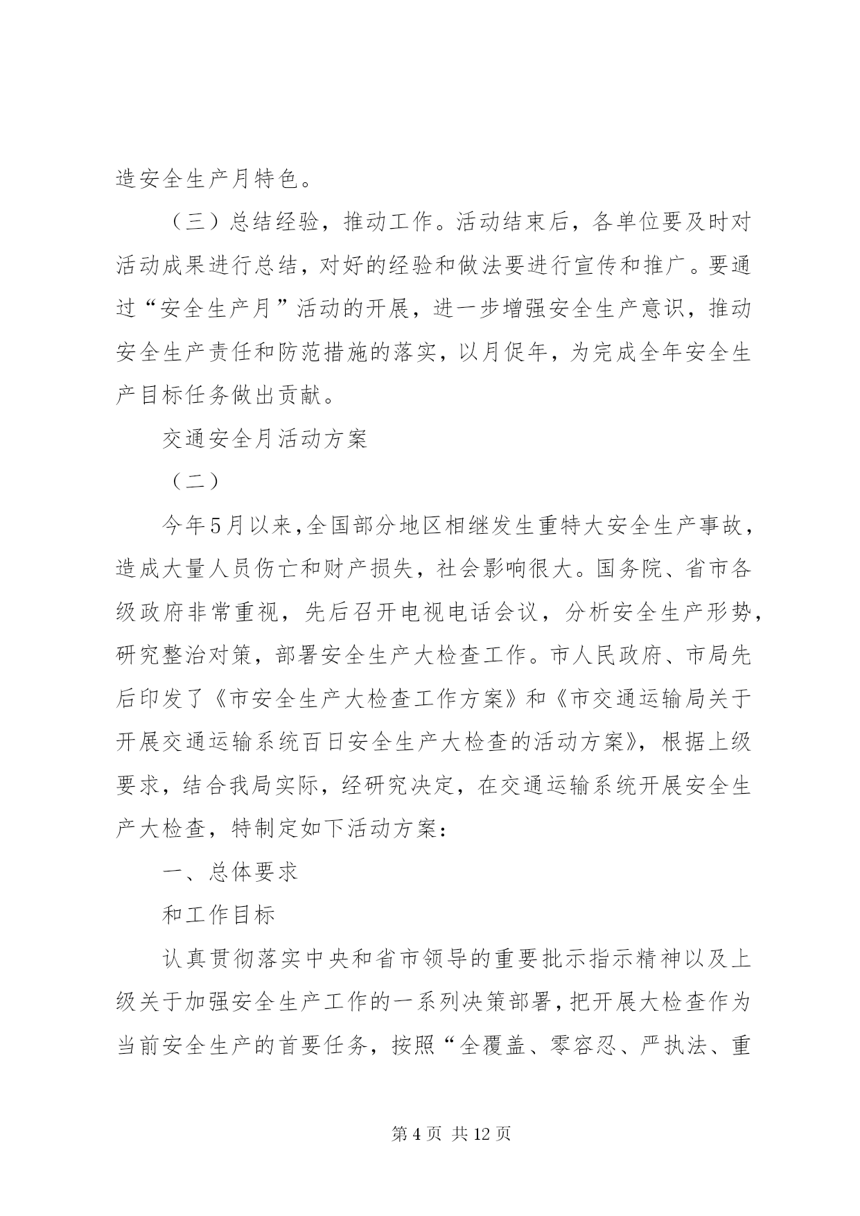 第PAGE\*Arabic\*MERGEFORMAT12页共NUMPAGES\*MERGEFORMAT12页交通安全月活动方案(一)为深入宣传贯彻习近平总书记关于安全生产工作的一系列重要指示精神,进一步加强安全生产教育宣传工作,根据市安委会和市局关于组织开展第13个“安全生产月”活动的要求,结合我局实际,制定如下实施方案一、指导思想以党的十八大、十八届三中全会和上级安全生产工作会议精神为指导,以宣传贯彻习近平总书记系列重要讲话精神、大力实施安全发展战略为主线,以“强化红线意识、促进安全发展”为主题,坚持“贴近实际、贴近生活、贴近群众”的原则,通过集中开展系列安全生产宣传教育活动,弘扬安全文化,普及安全知识,提升安全素养,为“常金一体,交通先行”提供有力的安全保障。二、活动主题强化红线意识、促进安全发展。三、活动时间**年5月31日至6月30日。四、组织机构成立市交通运输局“安全生产月”活动领导小组,指导全系统“安全生产月”活动的开展。五、活动内容(一)积极参加和配合市安委会组织和安排的活动,6月16日参加安全生产宣传咨询活动,航道管理处派2人,带好展板和宣传资料于上午7:45分前到金沙广场集中。(二)围绕活动主题,在车站、港口码头、工地等场所悬挂横幅、张贴安全生产宣传标语和图片、开展知识竞赛等形式重点宣传交通运输行业安全生产法律法规、安全文化和安全知识、技能等。(三)组织观看学习警示教育片,围绕典型事故案例,深入剖析事故原因,深刻吸取教训,用事故教训推动各单位强化安全生产责任制的落实,完善预防措施,防止同类事故发生。(四)开展以农民工安全知识、技能培训、法律法规普及为重点,全体交通职工参与的安全教育培训活动。在农民工较为集中的交通工程建设工地,建管处要督促指导各施工单位开展好建设施工安全事故警示教育和职业病预防知识培训。(五)开展全行业事故隐患大排查活动,严厉打击危险化学品运输、交通建设工程施工、道路和水上交通运输等重点行业和领域内的习惯性违法、违规和违章行为。活动期间,将会同安监部门对交通建设工程等领域开展安全生产专项督查检查活动。(六)结合年度安全生产标准化推进目标,督促城市客运、交通运输建筑施工和普货运输等单位加强全员安全教育,按照标准完善安全生产标准化达标创建,认真组织宣传和动员,完善安全生产制度,提高安全生产本质度。(七)开展安全应急预案演练活动。以交通工程建设施工、道路客运、城市客运等为重点,开展防坍塌、防坠落、防汛防台、车辆火灾应急逃生和危险品识别等实战演练,在实战演练中检验应急响应能力,及时总结完善相关预案。(八)加强汛期安全生产工作。组织开展防汛、防台的安全教育,提高汛期安全意识。加强汛期值班和领导带班制,督促各单位备足防汛物资,配备必要的防汛、防台安全设施,加强汛期隐患排查频次,及时采取预防措施,严防因雷电、台风、暴雨等灾害性天气引发的安全生产事故。六、活动要求(一)加强领导,精心组织。各单位要按要求,开展各具特色的宣传教育活动。要把“安全生产月”活动作为6月份重点工作加以落实,确保本次活动组织机构、人员、经费等落实到位。(二)联系实际,着力推进。各单位要紧紧围绕活动主题,结合实际,制定切实可行的活动方案,力争做到内容丰富,形式多样,贴近实际,贴近生产,贴近生活,增加活动的创造性、针对性和实效性。要把“安全生产月”活动与加强日常安全管理工作有机结合起来,行业管理部门要按职责分工,在日常工作开展的基础上,找准切入点,突出主题,深入推进行业安全管理,打造安全生产月特色。(三)总结经验,推动工作。活动结束后,各单位要及时对活动成果进行总结,对好的经验和做法要进行宣传和推广。要通过“安全生产月”活动的开展,进一步增强安全生产意识,推动安全生产责任和防范措施的落实,以月促年,为完成全年安全生产目标任务做出贡献。交通安全月活动方案(二)今年5月以来,全国部分地区相继发生重特大安全生产事故,造成大量人员伤亡和财产损失,社会影响很大。国务院、省市各级政府非常重视,先后召开电视电话会议,分析安全生产形势,研究整治对策,部署安全生产大检查工作。市人民政府、市局先后印发了《市安全生产大检查工作方案》和《市交通运输局关于开展交通运输系统百日安全生产大检查的活动方案》,根据上级要求,结合我局实际,经研究决定,在交通运输系统开展安全生产大检查,特制定如下活动方案:一、总体要求和工作目标认真贯彻落实中央和省市领导的重要批示指示精神以及上级关于加强安全生产工作的一系列决策部署,把开展大检查作为当前安全生产的首要任务,按照“全覆盖、零容忍、严执法、重实效”的总体要求,突出行业重点领域和薄弱环节,查隐患、抓整改、强督查、严问责,堵塞安全监管漏洞,强化安全生产措施,增强安全生产意识,落实两个主体责任,提升安全管理水平,
