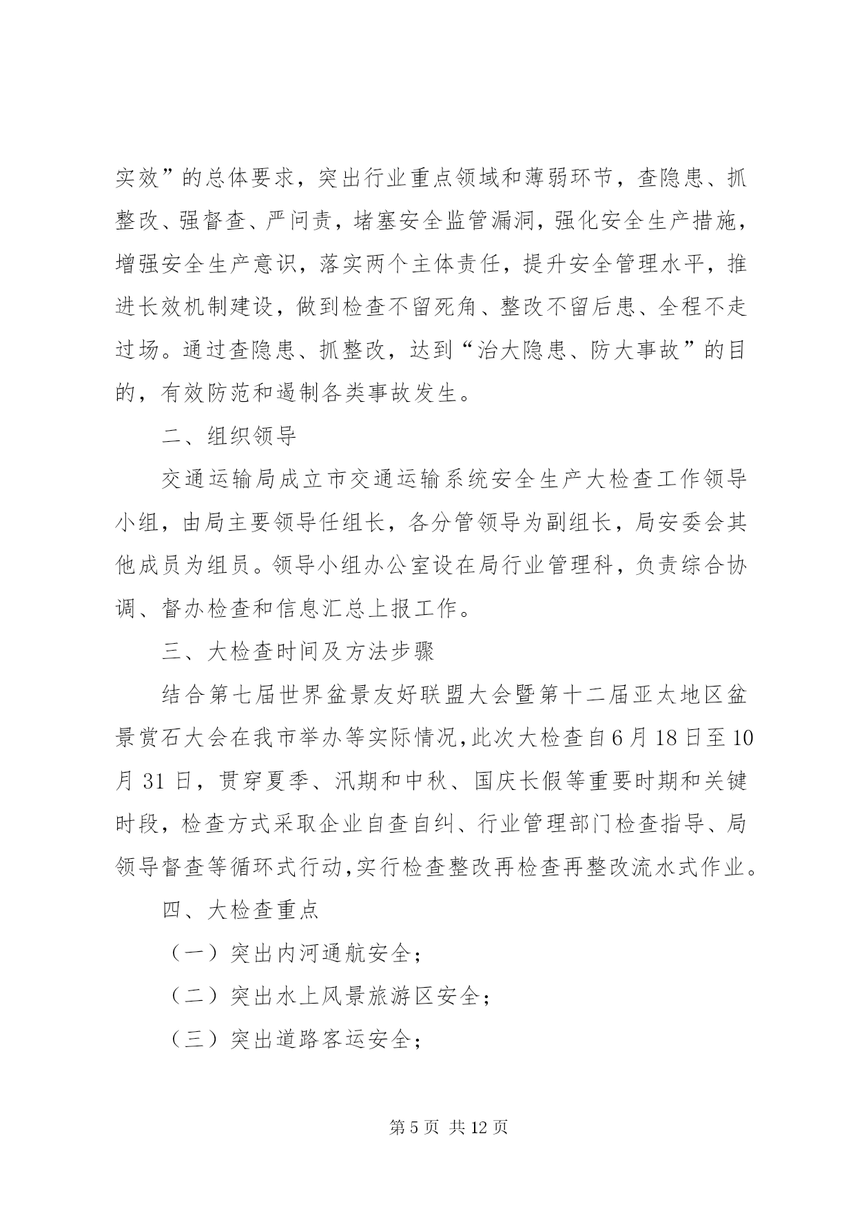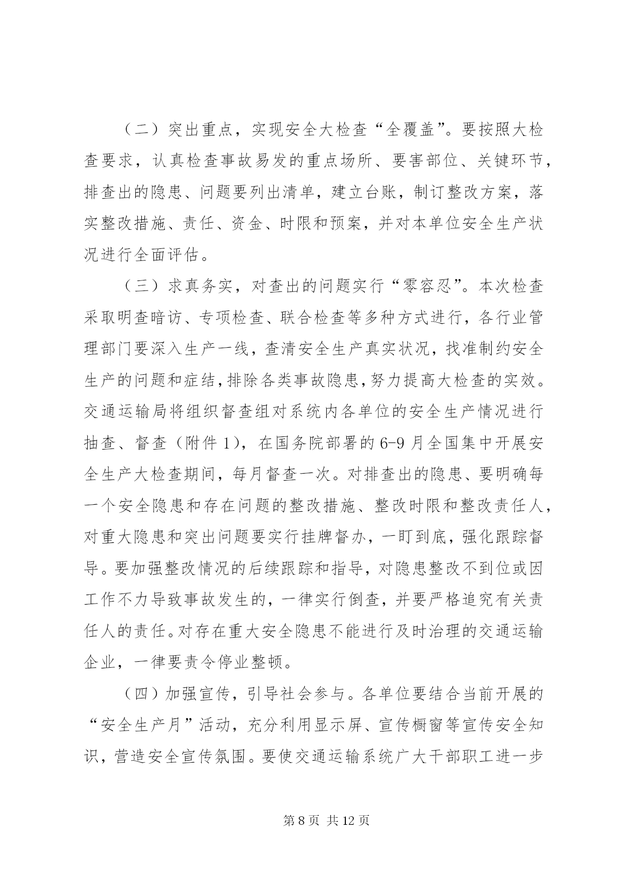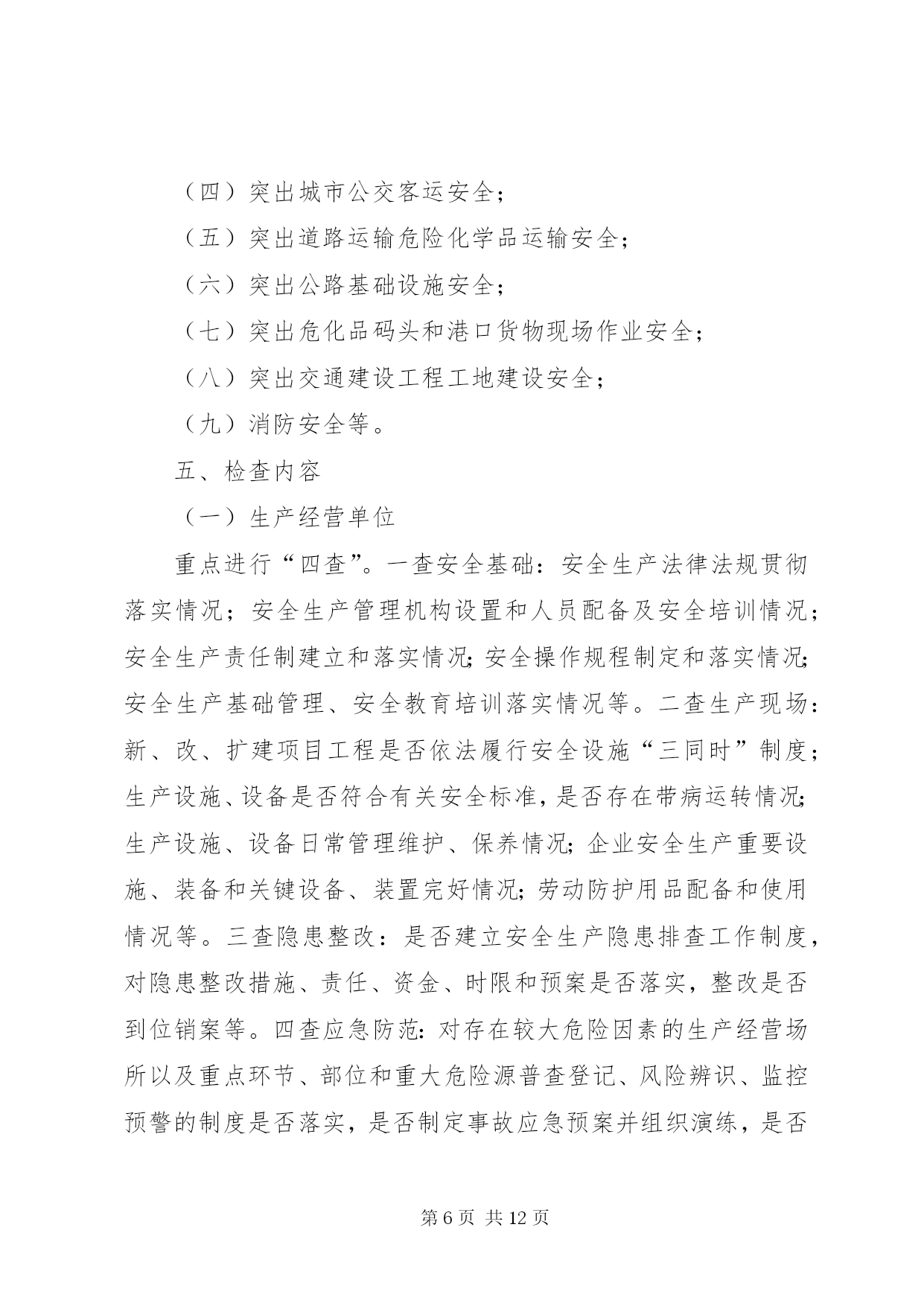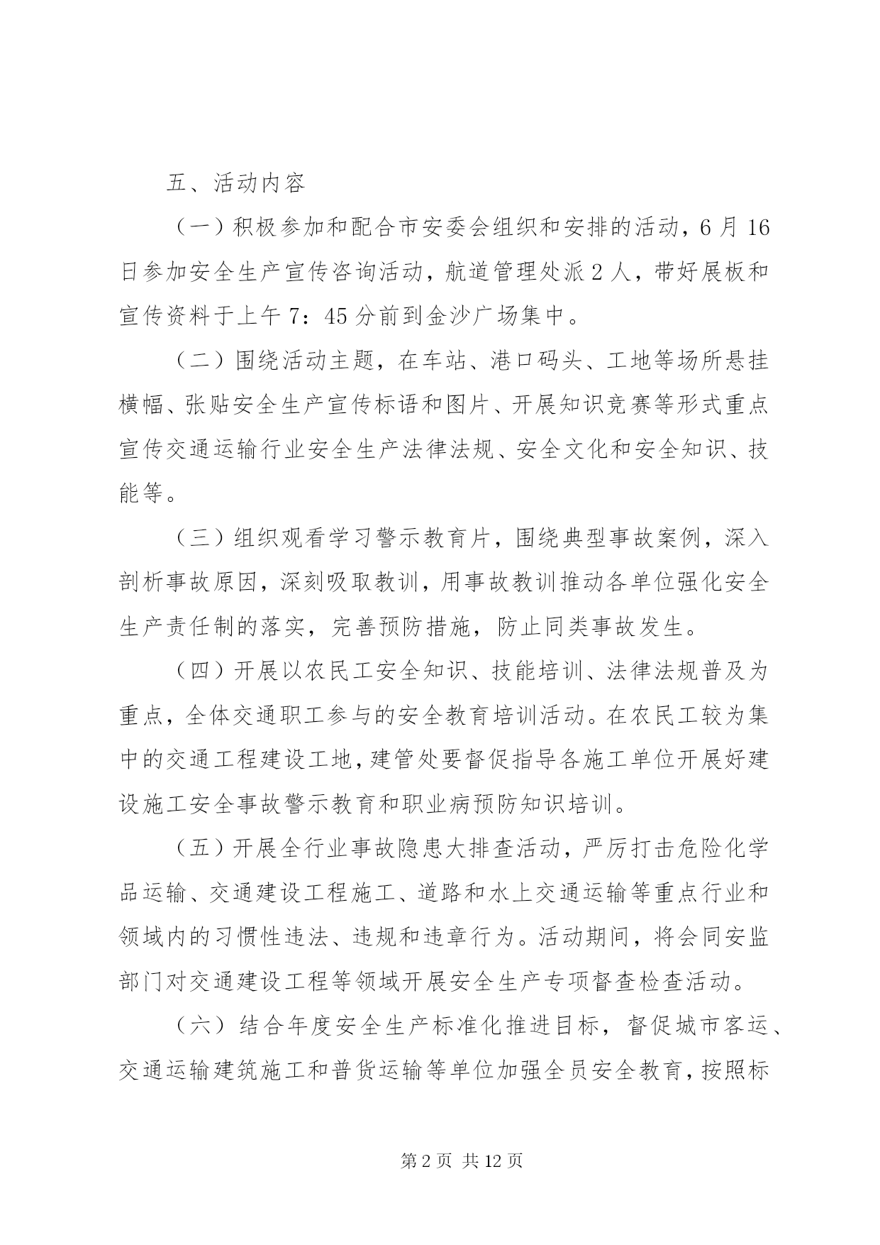 第PAGE\*Arabic\*MERGEFORMAT12页共NUMPAGES\*MERGEFORMAT12页交通安全月活动方案(一)为深入宣传贯彻习近平总书记关于安全生产工作的一系列重要指示精神,进一步加强安全生产教育宣传工作,根据市安委会和市局关于组织开展第13个“安全生产月”活动的要求,结合我局实际,制定如下实施方案一、指导思想以党的十八大、十八届三中全会和上级安全生产工作会议精神为指导,以宣传贯彻习近平总书记系列重要讲话精神、大力实施安全发展战略为主线,以“强化红线意识、促进安全发展”为主题,坚持“贴近实际、贴近生活、贴近群众”的原则,通过集中开展系列安全生产宣传教育活动,弘扬安全文化,普及安全知识,提升安全素养,为“常金一体,交通先行”提供有力的安全保障。二、活动主题强化红线意识、促进安全发展。三、活动时间**年5月31日至6月30日。四、组织机构成立市交通运输局“安全生产月”活动领导小组,指导全系统“安全生产月”活动的开展。五、活动内容(一)积极参加和配合市安委会组织和安排的活动,6月16日参加安全生产宣传咨询活动,航道管理处派2人,带好展板和宣传资料于上午7:45分前到金沙广场集中。(二)围绕活动主题,在车站、港口码头、工地等场所悬挂横幅、张贴安全生产宣传标语和图片、开展知识竞赛等形式重点宣传交通运输行业安全生产法律法规、安全文化和安全知识、技能等。(三)组织观看学习警示教育片,围绕典型事故案例,深入剖析事故原因,深刻吸取教训,用事故教训推动各单位强化安全生产责任制的落实,完善预防措施,防止同类事故发生。(四)开展以农民工安全知识、技能培训、法律法规普及为重点,全体交通职工参与的安全教育培训活动。在农民工较为集中的交通工程建设工地,建管处要督促指导各施工单位开展好建设施工安全事故警示教育和职业病预防知识培训。(五)开展全行业事故隐患大排查活动,严厉打击危险化学品运输、交通建设工程施工、道路和水上交通运输等重点行业和领域内的习惯性违法、违规和违章行为。活动期间,将会同安监部门对交通建设工程等领域开展安全生产专项督查检查活动。(六)结合年度安全生产标准化推进目标,督促城市客运、交通运输建筑施工和普货运输等单位加强全员安全教育,按照标准完善安全生产标准化达标创建,认真组织宣传和动员,完善安全生产制度,提高安全生产本质度。(七)开展安全应急预案演练活动。以交通工程建设施工、道路客运、城市客运等为重点,开展防坍塌、防坠落、防汛防台、车辆火灾应急逃生和危险品识别等实战演练,在实战演练中检验应急响应能力,及时总结完善相关预案。(八)加强汛期安全生产工作。组织开展防汛、防台的安全教育,提高汛期安全意识。加强汛期值班和领导带班制,督促各单位备足防汛物资,配备必要的防汛、防台安全设施,加强汛期隐患排查频次,及时采取预防措施,严防因雷电、台风、暴雨等灾害性天气引发的安全生产事故。六、活动要求(一)加强领导,精心组织。各单位要按要求,开展各具特色的宣传教育活动。要把“安全生产月”活动作为6月份重点工作加以落实,确保本次活动组织机构、人员、经费等落实到位。(二)联系实际,着力推进。各单位要紧紧围绕活动主题,结合实际,制定切实可行的活动方案,力争做到内容丰富,形式多样,贴近实际,贴近生产,贴近生活,增加活动的创造性、针对性和实效性。要把“安全生产月”活动与加强日常安全管理工作有机结合起来,行业管理部门要按职责分工,在日常工作开展的基础上,找准切入点,突出主题,深入推进行业安全管理,打造安全生产月特色。(三)总结经验,推动工作。活动结束后,各单位要及时对活动成果进行总结,对好的经验和做法要进行宣传和推广。要通过“安全生产月”活动的开展,进一步增强安全生产意识,推动安全生产责任和防范措施的落实,以月促年,为完成全年安全生产目标任务做出贡献。交通安全月活动方案(二)今年5月以来,全国部分地区相继发生重特大安全生产事故,造成大量人员伤亡和财产损失,社会影响很大。国务院、省市各级政府非常重视,先后召开电视电话会议,分析安全生产形势,研究整治对策,部署安全生产大检查工作。市人民政府、市局先后印发了《市安全生产大检查工作方案》和《市交通运输局关于开展交通运输系统百日安全生产大检查的活动方案》,根据上级要求,结合我局实际,经研究决定,在交通运输系统开展安全生产大检查,特制定如下活动方案:一、总体要求和工作目标认真贯彻落实中央和省市领导的重要批示指示精神以及上级关于加强安全生产工作的一系列决策部署,把开展大检查作为当前安全生产的首要任务,按照“全覆盖、零容忍、严执法、重实效”的总体要求,突出行业重点领域和薄弱环节,查隐患、抓整改、强督查、严问责,堵塞安全监管漏洞,强化安全生产措施,增强安全生产意识,落实两个主体责任,提升安全管理水平,