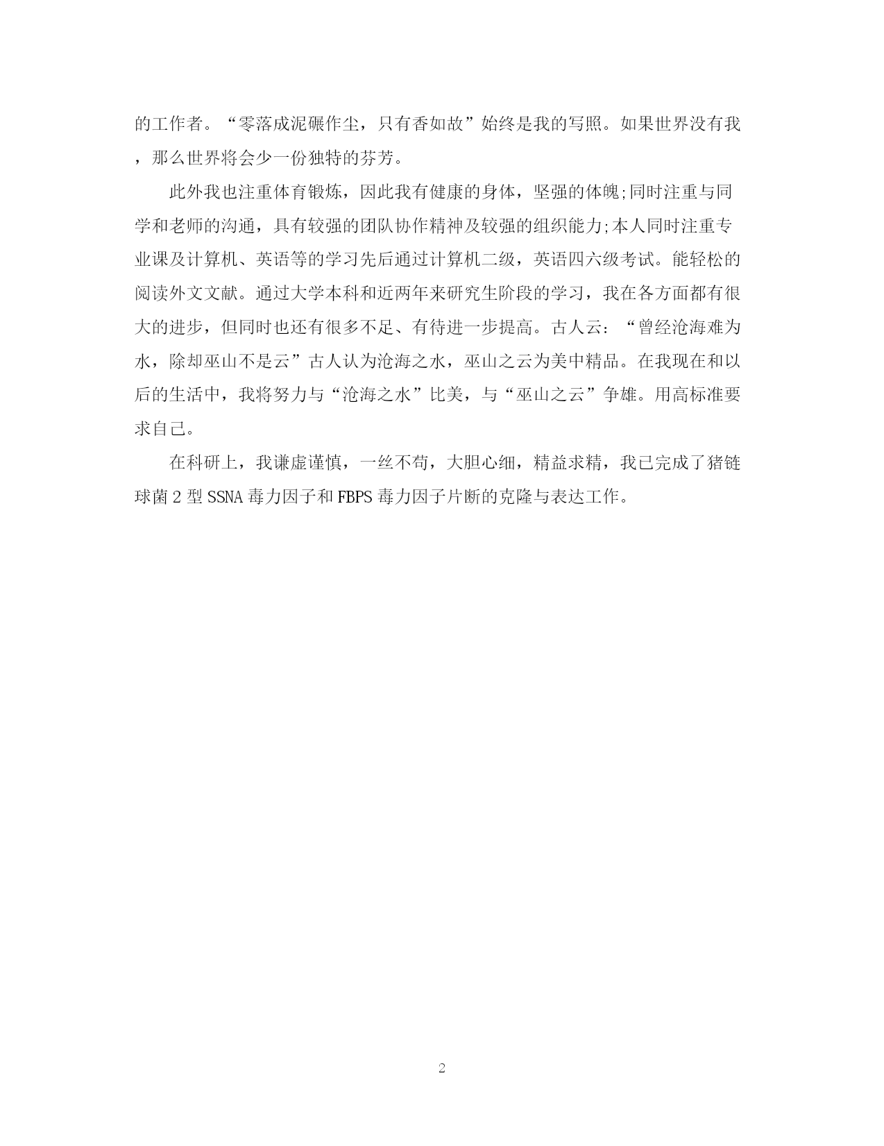 此资料由网络收集而来,如有侵权请告知上传者立即删除。资料共分享,我们负责传递知识。PAGEPAGE2优秀研究生的自我鉴定优秀研究生的自我鉴定热爱祖国,拥护中国共产党,坚持四项基本原则,信仰马克思列宁主义,马泽东思想,政治上积极要求进步;遵纪守法,严于律己;热爱集体,尊敬师长,团结同学,关心他人,善与他人合作;稳重豁达,诚实守信,能吃苦耐劳。学习目的明确、学习认真、刻苦,积极进取,有较强的钻研精神。在大学本科学习期间,在努力学好专业课的同时,还选修了《计算机编程》,《心理学》《钢笔及毛笔书法》,《文学鉴赏》,《日语》,《经济管理》等一系列课程。同时积极参与组织学院各项有益的实践活动和组勤工俭学活动,以及学校的多种活动。在假期给高中生辅导生物和英语,到公司打工。在把自己展现给社会的同时,社会也给了我丰厚的汇报,给予了我课本不能给予的东西,开阔了我的视野。提高了我的组织与处理问题的能力。在这些活动帮助我提高自己分析问题、解决问题的能力。对社会的认识也不在片面化,能辩证的看待问题。2019年大学毕业后,我积极投身于社会主义建设中去,能吃苦耐劳、意志坚强、心思慎密敏捷、行事更为执著仔细。曾多次受到领导表扬,并于2019年元月升为技术督导。在研究生学习阶段,我认真学习各门专业课以及《邓小平理论》、《建设有中国特色的社会社会主义理论》等重要的思想理论知识,在学习完善自我。坚持社会主义、共产主义信念、拥护祖国统一大业,热心关心和了解有关国际国内的大事,并具有正确而客观的分辩是非的能力。遵守校纪校规,积极参加集体活动和各项相关的学术讨论会。两年多来,在导师的悉心指导和严格要求以及自己努力下下,各方面都取得了很大的进步。在思想上,进一步深入学习了有关党的知识,对党的各项真政策,制度认识更加深刻。懂得了先做人,后做学问的道理;在生活上,俭朴,积极,乐观;在学习上,勤奋,踏实,掌握了扎实的理论知识和业务技能,具有一定的科研能力、能独立地进行科学研究。在大学与读研期间,我一直默默但不无闻的工作者。“零落成泥碾作尘,只有香如故”始终是我的写照。如果世界没有我,那么世界将会少一份独特的芬芳。此外我也注重体育锻炼,因此我有健康的身体,坚强的体魄;同时注重与同学和老师的沟通,具有较强的团队协作精神及较强的组织能力;本人同时注重专业课及计算机、英语等的学习先后通过计算机二级,英语四六级考试。能轻松的阅读外文文献。通过大学本科和近两年来研究生阶段的学习,我在各方面都有很大的进步,但同时也还有很多不足、有待进一步提高。古人云:“曾经沧海难为水,除却巫山不是云”古人认为沧海之水,巫山之云为美中精品。在我现在和以后的生活中,我将努力与“沧海之水”比美,与“巫山之云”争雄。用高标准要求自己。在科研上,我谦虚谨慎,一丝不苟,大胆心细,精益求精,我已完成了猪链球菌2型SSNA毒力因子和FBPS毒力因子片断的克隆与表达工作。