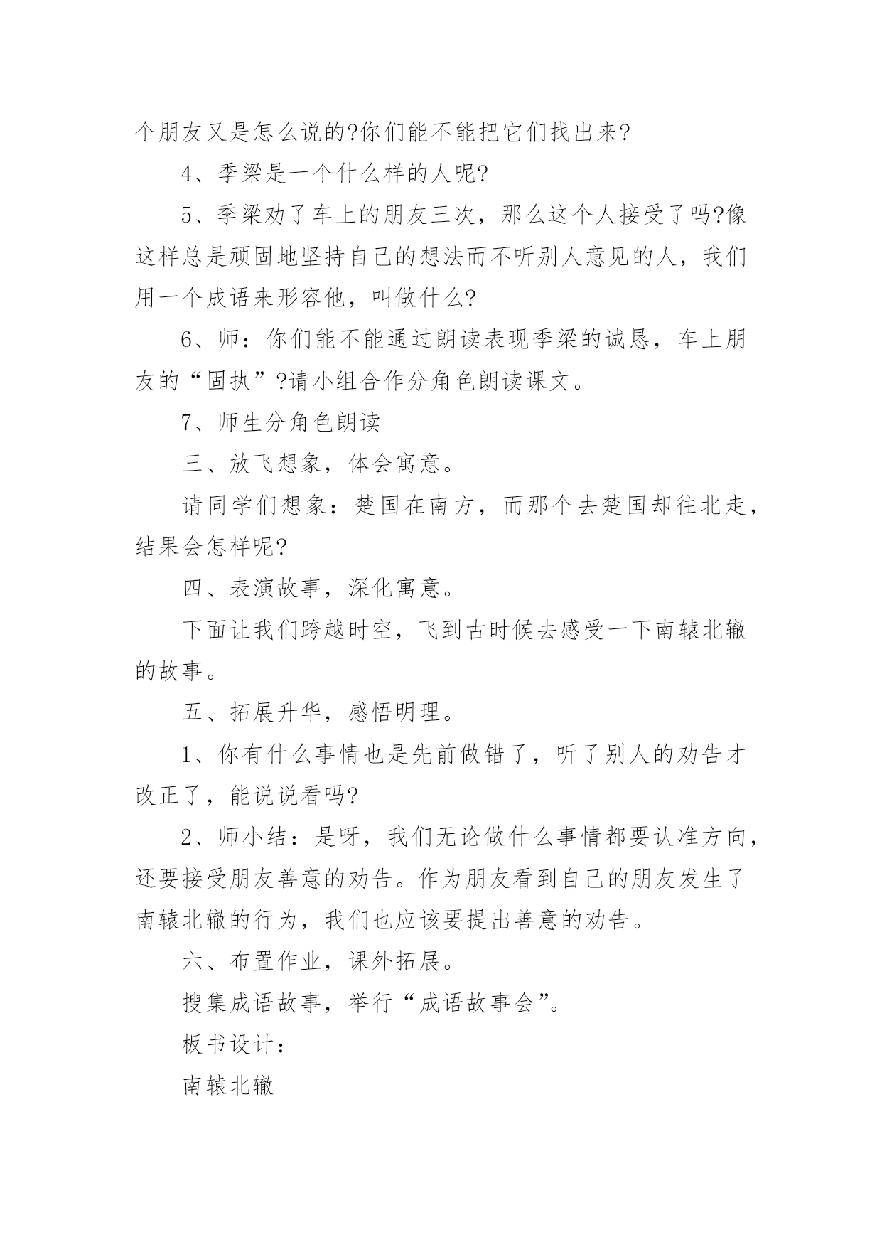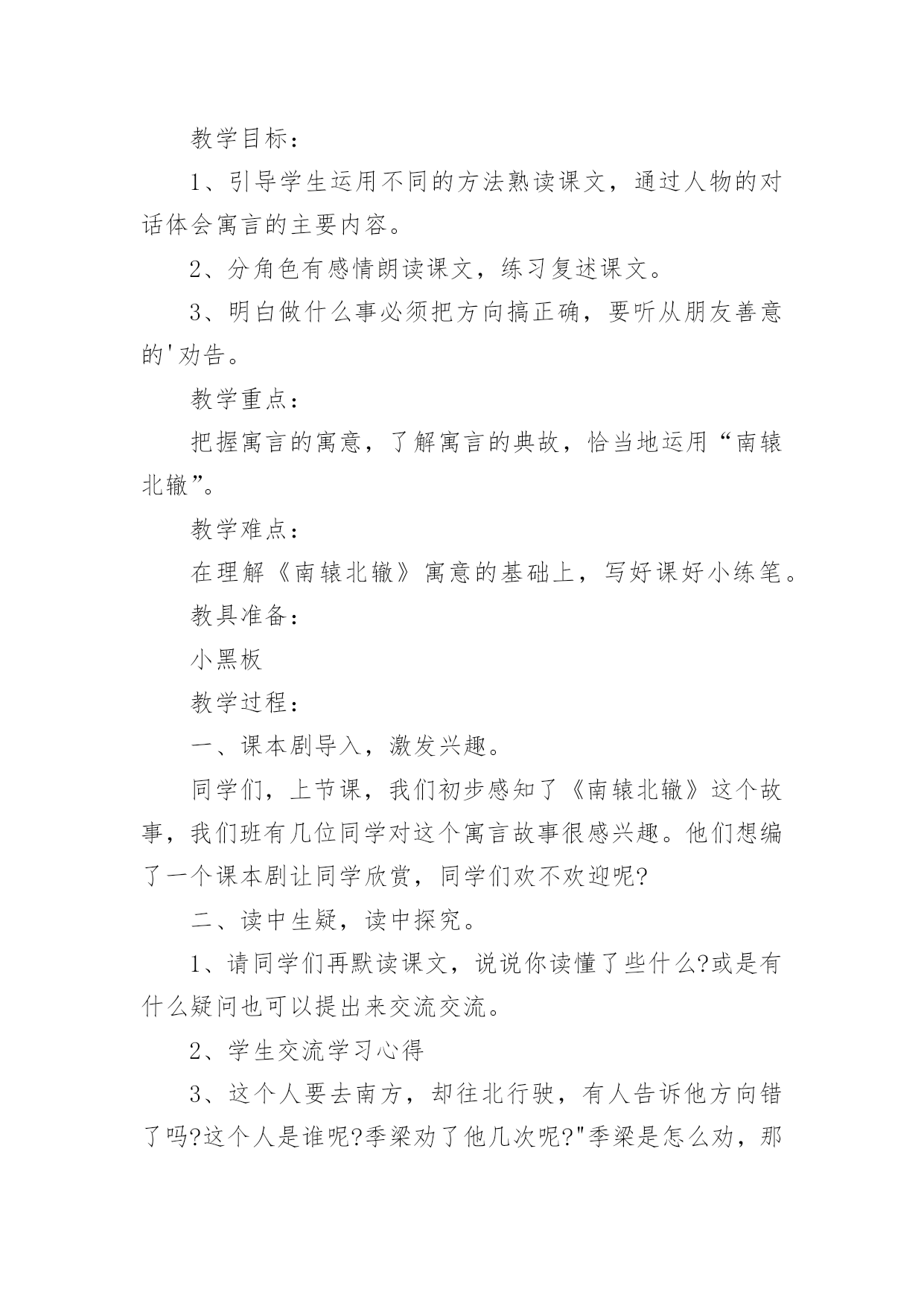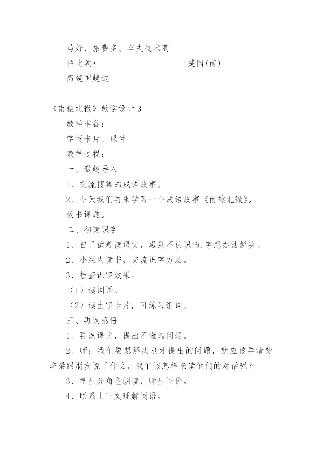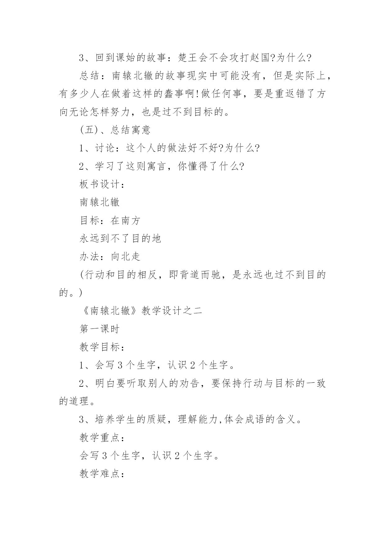 《南辕北辙》教学设计在教学工作者开展教学活动前,编写教学设计是必不可少的,教学设计是连接基础理论与实践的桥梁,对于教学理论与实践的紧密结合具有沟通作用。那么什么样的教学设计才是好的呢?下面是小编为大家收集的《南辕北辙》教学设计,仅供参考,大家一起来看看吧。《南辕北辙》教学设计1教学目标:1、知识目标:A、能够正确、流利、有感情地朗读课文,并能联系上下文及生活实际了解课文中的词句,读懂故事,体会成语的含义。B、用------虽然---------,可----------说句话。2、能力目标A、培养学生的质疑,理解能力B、能够表演,再现课文情境3、情感目标做什么事必须把方向搞正确,要听从朋友善意的劝告。教学重点:能联系上下文及生活实际了解课文中的词句,读懂故事。教学难点:体会南辕北辙的寓意:做什么事情必须先把方向搞正确,还要听从朋友善意的劝告。教学过程:(一)课本剧导入,激发兴趣1、师:同学们,上节课,我们初步感知了《南辕北辙》这个故事,我们班有几位同学对这个寓言故事很感兴趣。他们想编了一个课本剧让同学欣赏,同学们欢不欢迎呢?(二)读中生疑,读中探究1、请同学们再默读课文,说说你读懂了些什么?或是有什么疑问也可以提出来交流交流。2、学生交流学习心得3、师:这个人要去南方,却往北行驶,有人告诉他方向错了吗?这个人是谁呢?季梁劝了他几次呢?季梁是怎么劝,那个朋友又是怎么说的?你们能不能把它们找出来?4、师:出示:------虽然------可是-------(1)你们能不能仿照这个例子说说话?5、师:板书:不解、告诉、诚恳6、能不能来说说不解、诚恳的意思?7、季梁是一个什么样的人呢?8、季梁劝了车上的朋友三次,那么这个人接受了吗?像这样总是顽固地坚持自己的想法而不听别人意见的人,我们用一个成语来形容他,叫做什么?9、理解固执己见的意思。10、师:你们能不能通过朗读表现季梁的诚恳,车上朋友的固执?请小组合作分角色朗读课文。11、师:我们一起来听听录音机小博士是怎么读的。12、学生进行评议13、师生分角色朗读(三)放飞想象,体会寓意1、请同学们想象:楚国在南方,而那个去楚国却往北走,结果会怎样呢?2、通过这篇课文你明白了什么道理师小结:通过这篇课文的`学习,我们还知道一个人如果走的方向不对,是实现不了目标的。(四)表演故事,深化寓意下面让我们跨越时空,飞到古时候去感受一下南辕北辙的故事。1、小组合作演一演故事2、反馈交流3、如果你是车上的朋友,发现自己方向错了,你会怎么说、怎么做?(五)拓展升华,感悟明理1、你有什么事情也是先前做错了,听了别人的劝告才改正了,能说说看吗?(1)小组合作交流(2)反馈交流2、师小结:是呀,我们无论做什么事情都要认准方向,还要接受朋友善意的劝告。作为朋友看到自己的朋友发生了南辕北辙的行为,我们也应该要提出善意的劝告。3、师:你们还知道道哪些成语故事呢?能不能讲一讲。(七)布置作业,课外拓展搜集成语故事,举行成语故事会《南辕北辙》教学设计2《南辕北辙》教学设计之一课时目标1、学会《南辕北辙》,认读本课生字及其组成的新词。2、体会理解课文的寓意。3、正确、流利、有感情地朗读课文。教学重点及难点1、朗读课文,理解寓意包含的道理。2、学会复述内容,背诵课文。教学准备1、挂图,生字卡片。2、学生准备:收集寓言。课时安排一课时教学过程(一)、谈话导入同学们,从家里到学校,一般情况下,你愿意多走路还是少走路?是的!我们一般都不愿意多走路浪费时间,但有一个人明明该往南走,他却偏偏要往北走,这是怎么一回事呢?他是太聪明了吗?咱们现在就去看一看!(二)、感知大意1、自读,>这则寓言,看看自己能读懂什么?还有哪些不懂?做上符号。2、小组交流,全班交流解决问题。重点词语:提醒、把式、盘缠。(三)、理解课文内容1、自读课文,思考:课文讲了一件什么事?讲了一个人想到南方去,而他所走的路线去是朝向北方,别人提醒他走错了他却满不在乎。2、分角色朗读课文。思考:朋友提醒了他几次?他怎样回答的?(1)指名分角色读第一次提醒他的话和那个人的回答。从朋友的提醒中,你知道了什么?(2)那个人的朋友第二次提醒他说了什么?(3)朋友又是怎样提醒他的?指名读。那个人又说了什么?什么是盘缠?盘缠带得多能到楚国吗?为什么?3、朋友们几次提醒那个人,他都没有听,结果怎么样?齐读最后一段。“硬要”是什么意思?文中哪些地方说明了这个词?(四)创设情境,练习口语交际1、出示图:看着那个人走远的影子,他的朋友会说什么?2、你想对那个楚国人说什么?3、回到课始的故事:楚王会不会攻打赵国?为什么?总结:南辕北辙的故事现实中可能没有,但是实际上,有多少人在做着这样的蠢事啊!做任何事,要是重返错了方向无论怎样努力,也是过不到目标的。(五)、总结寓意1、讨论:这个人的做法好不