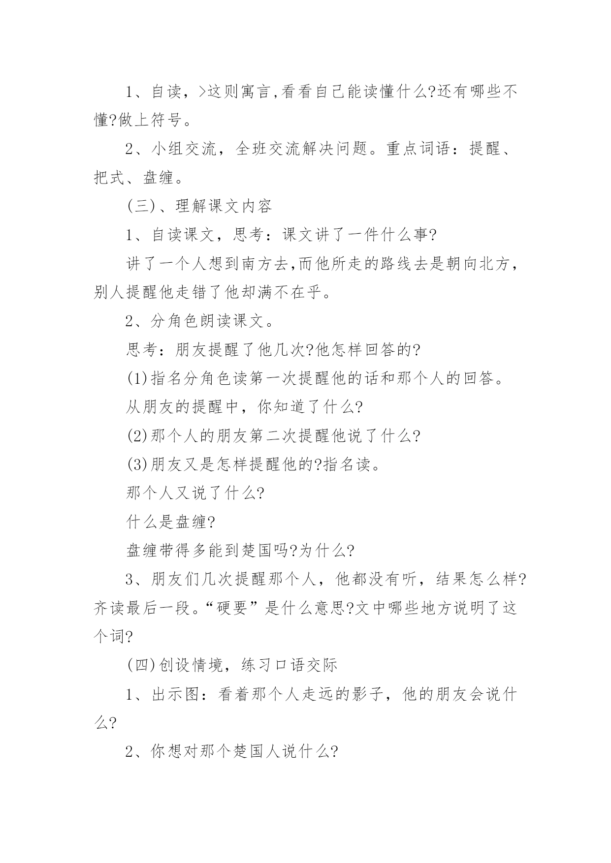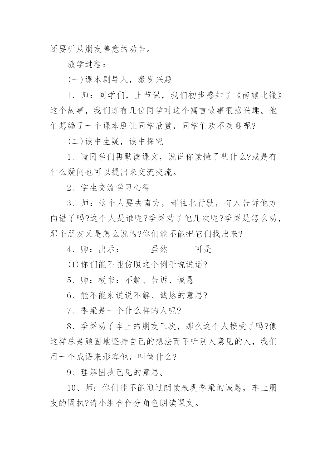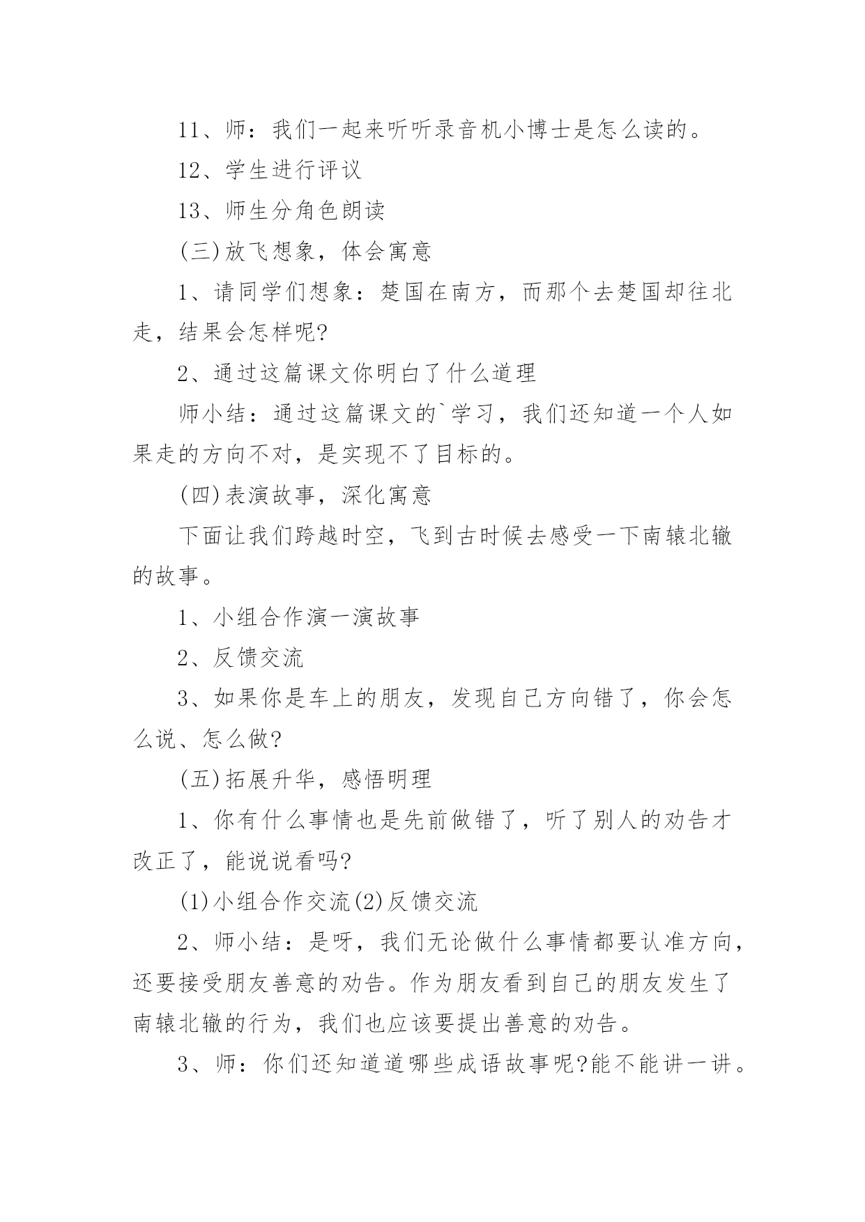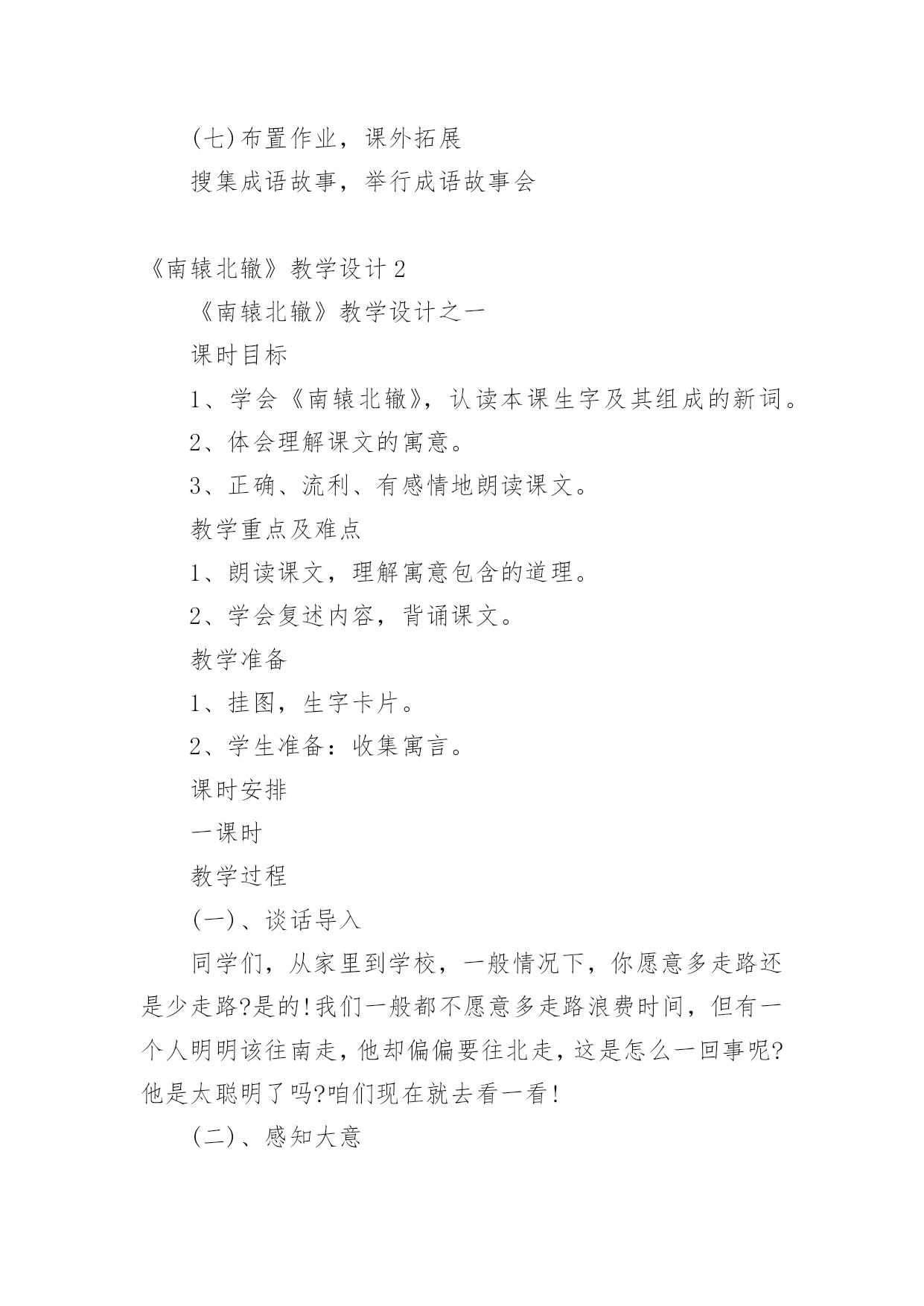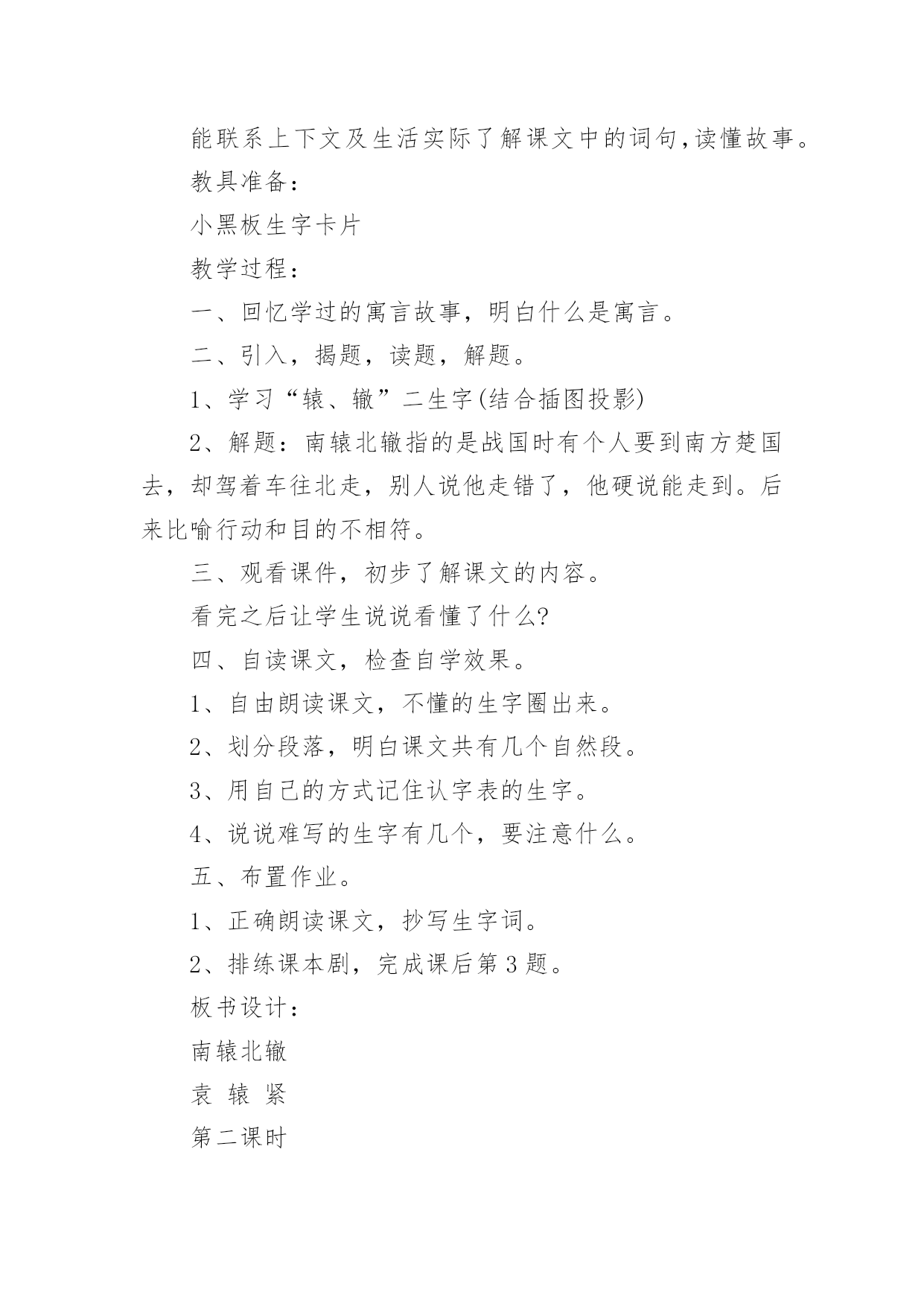 《南辕北辙》教学设计在教学工作者开展教学活动前,编写教学设计是必不可少的,教学设计是连接基础理论与实践的桥梁,对于教学理论与实践的紧密结合具有沟通作用。那么什么样的教学设计才是好的呢?下面是小编为大家收集的《南辕北辙》教学设计,仅供参考,大家一起来看看吧。《南辕北辙》教学设计1教学目标:1、知识目标:A、能够正确、流利、有感情地朗读课文,并能联系上下文及生活实际了解课文中的词句,读懂故事,体会成语的含义。B、用------虽然---------,可----------说句话。2、能力目标A、培养学生的质疑,理解能力B、能够表演,再现课文情境3、情感目标做什么事必须把方向搞正确,要听从朋友善意的劝告。教学重点:能联系上下文及生活实际了解课文中的词句,读懂故事。教学难点:体会南辕北辙的寓意:做什么事情必须先把方向搞正确,还要听从朋友善意的劝告。教学过程:(一)课本剧导入,激发兴趣1、师:同学们,上节课,我们初步感知了《南辕北辙》这个故事,我们班有几位同学对这个寓言故事很感兴趣。他们想编了一个课本剧让同学欣赏,同学们欢不欢迎呢?(二)读中生疑,读中探究1、请同学们再默读课文,说说你读懂了些什么?或是有什么疑问也可以提出来交流交流。2、学生交流学习心得3、师:这个人要去南方,却往北行驶,有人告诉他方向错了吗?这个人是谁呢?季梁劝了他几次呢?季梁是怎么劝,那个朋友又是怎么说的?你们能不能把它们找出来?4、师:出示:------虽然------可是-------(1)你们能不能仿照这个例子说说话?5、师:板书:不解、告诉、诚恳6、能不能来说说不解、诚恳的意思?7、季梁是一个什么样的人呢?8、季梁劝了车上的朋友三次,那么这个人接受了吗?像这样总是顽固地坚持自己的想法而不听别人意见的人,我们用一个成语来形容他,叫做什么?9、理解固执己见的意思。10、师:你们能不能通过朗读表现季梁的诚恳,车上朋友的固执?请小组合作分角色朗读课文。11、师:我们一起来听听录音机小博士是怎么读的。12、学生进行评议13、师生分角色朗读(三)放飞想象,体会寓意1、请同学们想象:楚国在南方,而那个去楚国却往北走,结果会怎样呢?2、通过这篇课文你明白了什么道理师小结:通过这篇课文的`学习,我们还知道一个人如果走的方向不对,是实现不了目标的。(四)表演故事,深化寓意下面让我们跨越时空,飞到古时候去感受一下南辕北辙的故事。1、小组合作演一演故事2、反馈交流3、如果你是车上的朋友,发现自己方向错了,你会怎么说、怎么做?(五)拓展升华,感悟明理1、你有什么事情也是先前做错了,听了别人的劝告才改正了,能说说看吗?(1)小组合作交流(2)反馈交流2、师小结:是呀,我们无论做什么事情都要认准方向,还要接受朋友善意的劝告。作为朋友看到自己的朋友发生了南辕北辙的行为,我们也应该要提出善意的劝告。3、师:你们还知道道哪些成语故事呢?能不能讲一讲。(七)布置作业,课外拓展搜集成语故事,举行成语故事会《南辕北辙》教学设计2《南辕北辙》教学设计之一课时目标1、学会《南辕北辙》,认读本课生字及其组成的新词。2、体会理解课文的寓意。3、正确、流利、有感情地朗读课文。教学重点及难点1、朗读课文,理解寓意包含的道理。2、学会复述内容,背诵课文。教学准备1、挂图,生字卡片。2、学生准备:收集寓言。课时安排一课时教学过程(一)、谈话导入同学们,从家里到学校,一般情况下,你愿意多走路还是少走路?是的!我们一般都不愿意多走路浪费时间,但有一个人明明该往南走,他却偏偏要往北走,这是怎么一回事呢?他是太聪明了吗?咱们现在就去看一看!(二)、感知大意1、自读,>这则寓言,看看自己能读懂什么?还有哪些不懂?做上符号。2、小组交流,全班交流解决问题。重点词语:提醒、把式、盘缠。(三)、理解课文内容1、自读课文,思考:课文讲了一件什么事?讲了一个人想到南方去,而他所走的路线去是朝向北方,别人提醒他走错了他却满不在乎。2、分角色朗读课文。思考:朋友提醒了他几次?他怎样回答的?(1)指名分角色读第一次提醒他的话和那个人的回答。从朋友的提醒中,你知道了什么?(2)那个人的朋友第二次提醒他说了什么?(3)朋友又是怎样提醒他的?指名读。那个人又说了什么?什么是盘缠?盘缠带得多能到楚国吗?为什么?3、朋友们几次提醒那个人,他都没有听,结果怎么样?齐读最后一段。“硬要”是什么意思?文中哪些地方说明了这个词?(四)创设情境,练习口语交际1、出示图:看着那个人走远的影子,他的朋友会说什么?2、你想对那个楚国人说什么?3、回到课始的故事:楚王会不会攻打赵国?为什么?总结:南辕北辙的故事现实中可能没有,但是实际上,有多少人在做着这样的蠢事啊!做任何事,要是重返错了方向无论怎样努力,也是过不到目标的。(五)、总结寓意1、讨论:这个人的做法好不