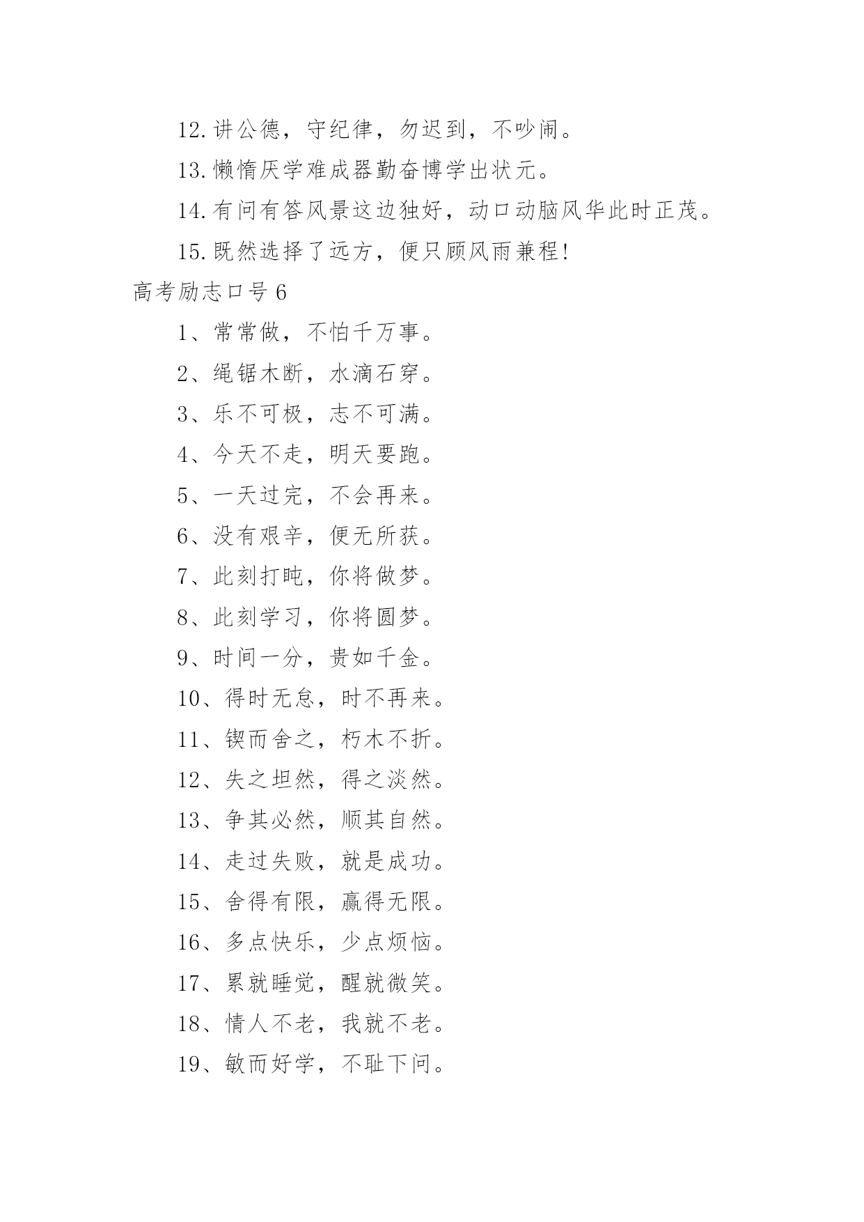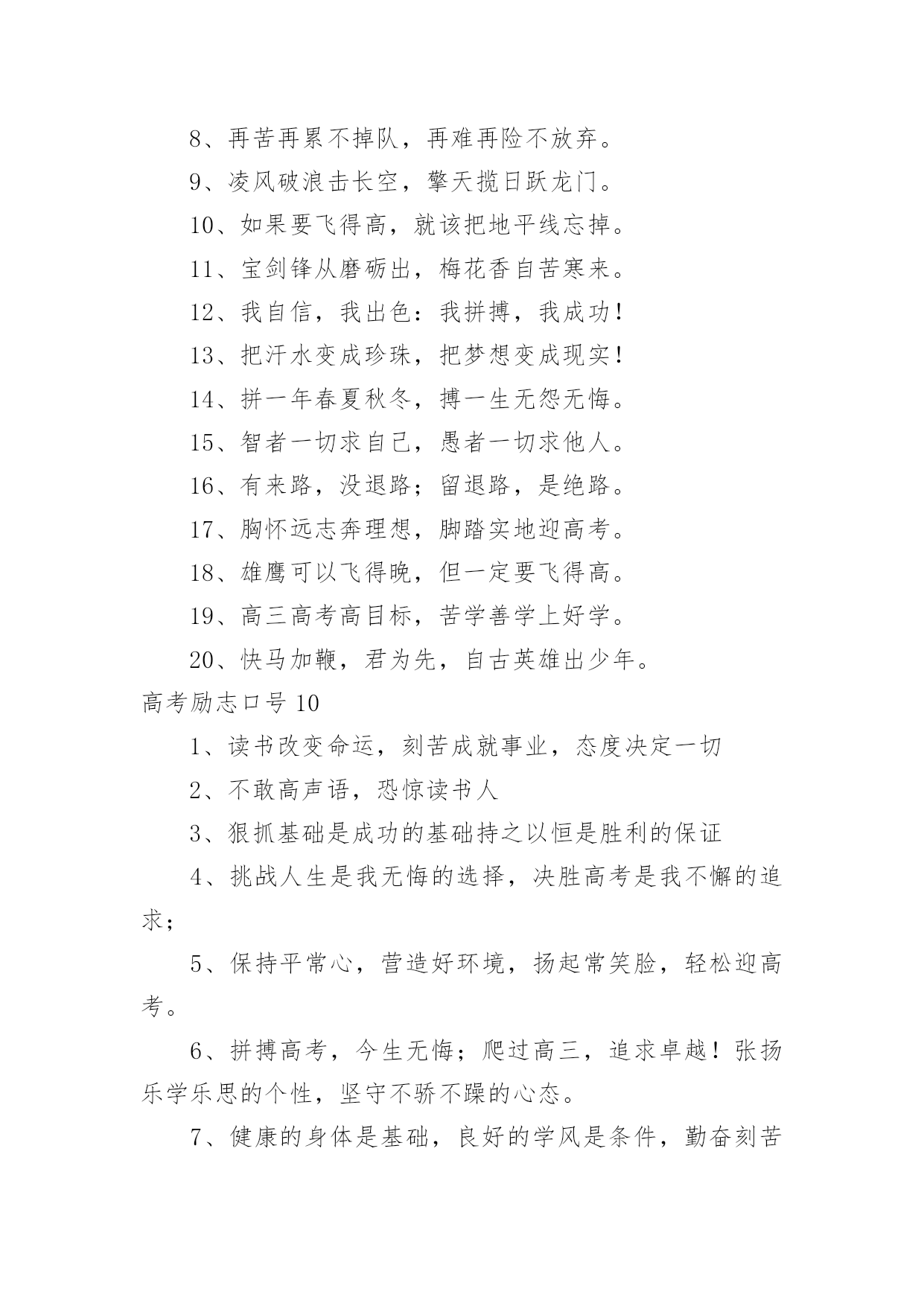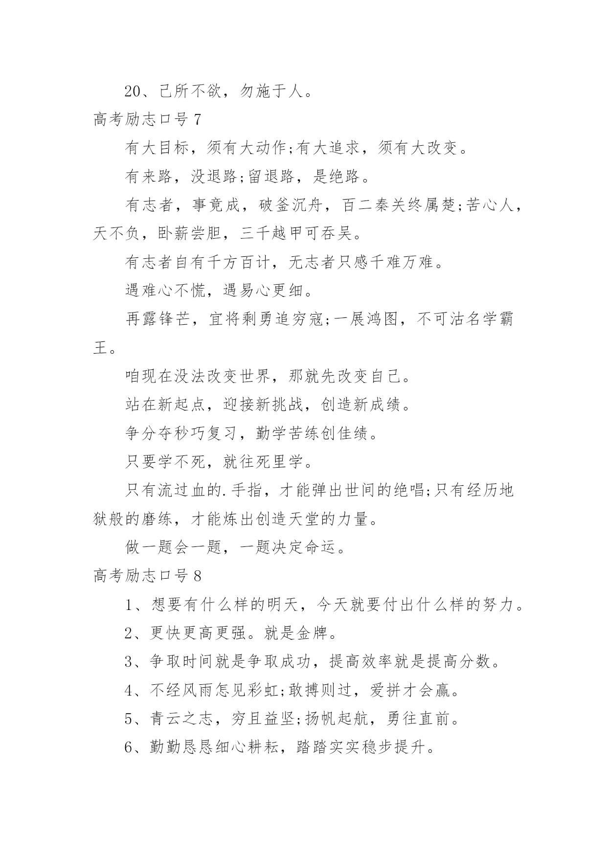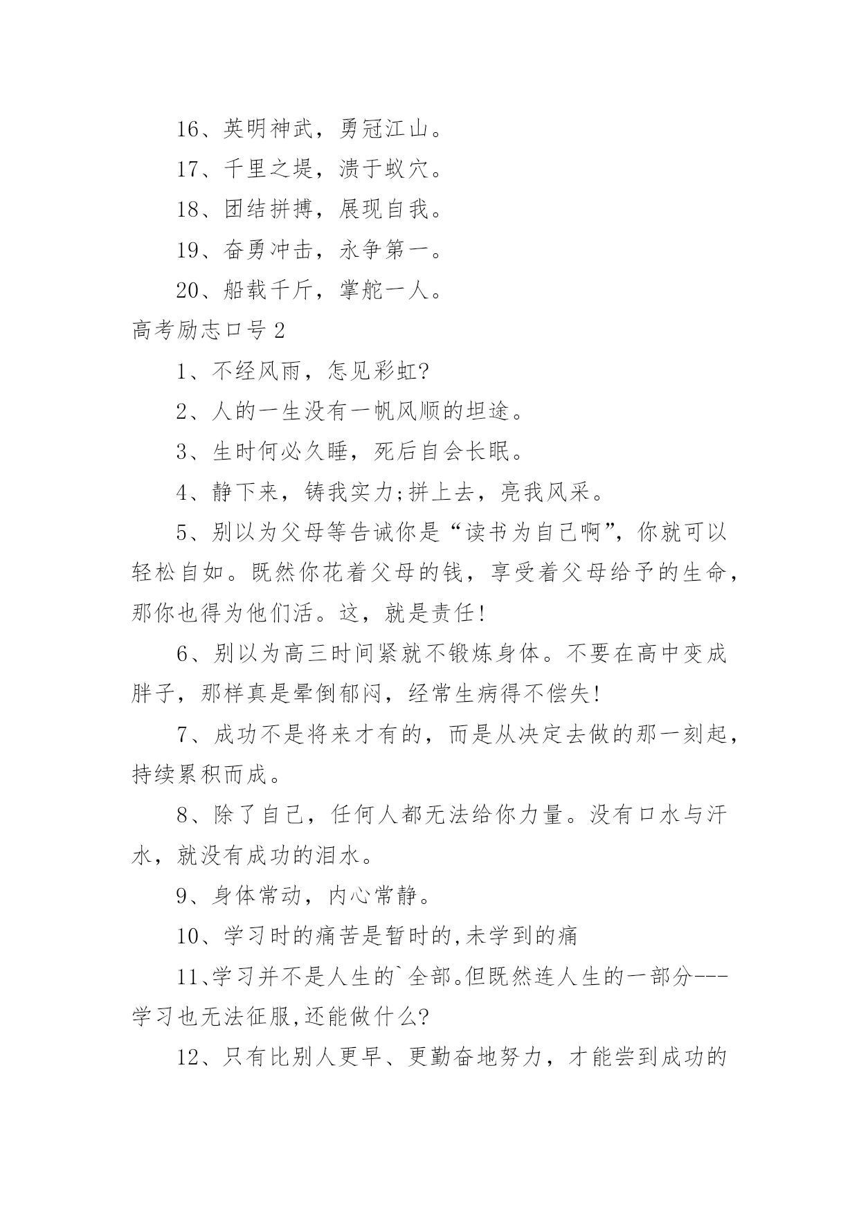 高考励志口号高考励志口号集合15篇在平时的学习、工作或生活中,许多人对一些广为流传的口号都不陌生吧,口号是指挥一个团队共同行为的指令。那么都有哪些类型的口号呢?以下是小编精心整理的高考励志口号,欢迎阅读与收藏。高考励志口号11、勤学乐思,奋发向上。2、自信自律,求实创新。3、勤奋乐学,团结拼搏。4、把握现在,决战今天。5、不到终点,永不放弃。6、愉快学习,健康成长。7、播种行为,收获命运。8、团结拼搏,争创佳绩。9、博学笃行,自强不息。10、开拓创新,争优进取。11、志在千里,壮心不已。12、分分秒秒,构筑辉煌。13、文明勤奋,竞争超越。14、文明友爱,求学拼搏。15、同舟共济,劈浪向前。16、英明神武,勇冠江山。17、千里之堤,溃于蚁穴。18、团结拼搏,展现自我。19、奋勇冲击,永争第一。20、船载千斤,掌舵一人。高考励志口号21、不经风雨,怎见彩虹?2、人的一生没有一帆风顺的坦途。3、生时何必久睡,死后自会长眠。4、静下来,铸我实力;拼上去,亮我风采。5、别以为父母等告诫你是“读书为自己啊”,你就可以轻松自如。既然你花着父母的钱,享受着父母给予的生命,那你也得为他们活。这,就是责任!6、别以为高三时间紧就不锻炼身体。不要在高中变成胖子,那样真是晕倒郁闷,经常生病得不偿失!7、成功不是将来才有的,而是从决定去做的那一刻起,持续累积而成。8、除了自己,任何人都无法给你力量。没有口水与汗水,就没有成功的泪水。9、身体常动,内心常静。10、学习时的痛苦是暂时的,未学到的痛11、学习并不是人生的`全部。但既然连人生的一部分---学习也无法征服,还能做什么?12、只有比别人更早、更勤奋地努力,才能尝到成功的滋味。13、一天过完,不会再来。14、即使现在,对手也在不停地翻动书页。15、没有艰辛,便无所获!16、你想要的是,高考前眉毛上的汗水,还是高考后眉毛下的泪水。17、直到刚才一轮复习资料发下来,才意识到自己已经离高考不远了,所以真的该努力了,我们一起加油!18、不要高估了高考,也不要低估了自己。19、能用汗水解决的问题,就尽量别用泪水。努力到无能为力,拼搏到感动自己。高考励志口号31、我自信,我出色;我拼搏,我成功!2、自律,自尊,自立,自信;静能生慧。3、乘风破浪勇立潮头,沧海横流方显本色。4、我决心用我一生的热情创造生命的.奇迹。5、我自信,故我成功、我行,我一定能行。6、阳春三月翘首以盼,百日冲刺迫在眉睫。7、静下来,铸我实力;拼上去,亮我风采。8、爱我xx,立志成材,奋勇冲击,永争第一。9、太阳每天都是新的,你是否每天都在努力。10、下定决心,排除万难,拼搏奋进,勇往直前!11、乐学实学,挑战高考;勤勉向上,成就自我。12、决战高考,改变命运。屡挫屡战,笑傲群雄。13、博学之,审问之,慎思之,明辨之,笃行之。14、在这个世界上可以拯救我的人是我自己。15、百炼成钢向进军;奋斗百日圆人生梦想。16、眼泪不是我们的答案,拼搏才是我们的选择。17、要想成功,必先发疯,今日疯狂,明日辉煌。18、鲤鱼不跃,岂可成龙?大鹏驻足,焉能腾空?19、山高不厌攀,水深不厌潜,学精不厌苦:追求!20、书山登峰,今日冲刺,秣马厉兵,竞相折桂夺魁。高考励志口号41。不经风雨怎见彩虹;敢搏则过,爱拼才会赢!2。两眼一睁,开始竞争。3。今日寒窗苦读,必定有我;明朝独占熬头,舍我其谁?4。站在新起点,迎接新挑战,创造新成绩。5。无情岁月增中减,有味青春苦甜。集雄心壮志,创锦绣前程。6。拼一个秋冬春夏!赢一生无怨无悔!7。十年寒窗磨一剑,是非成败在今朝。8。让刻苦成为习惯,用汗水浇灌未来。9。今朝勤学苦,明日跃龙门。10。没有等出来的辉煌;只有走出来的美丽。11。今天拼搏努力,他日谁与争锋。12。今日浪费一分钟,来日后悔一辈子。13。奋力拼搏,誓考重点;争分夺秒,再创辉煌。14。登高山务攻绝顶赏大雪莫畏严寒。15。昆仑纵有千丈雪,我亦誓把昆仑截。16。要成功,先发疯,下定决心往前冲!17。积一时之跬步,臻千里之遥程。18。旌旗摇,号令催,百日炼真钢;仰天长笑,金戈利刃展雄风,所向无敌!19。血可流,头可破,斗志更昂扬;逐鹿考场,战鼓号角扬军威,百战百胜!20。拼搏改变命运,励志照亮人生。高考励志口号51.发奋用功,免得人生遗憾厉兵秣马,何愁学业不成。2.只有流过血的手指,才能弹出世间的绝唱。3.勤奋是最好的'学习方法。兴趣是最好的老师。课堂是学习的主阵地。4.勤学苦练迎高考,查漏补缺稳根基。5.高峰只对攀登它而不是仰望它的人来说才有真正意义。6.树凌云壮志,悬梁刺骨,苦尽甘来终有日。7.一个人最大的破产是绝望,最大的资产是希望。8.眉毛上的汗水和眉毛下的泪水,你必须选择一样!9.要成功,先发疯,下定决心往前冲!10.抢时间,抓基础,勤演练定有收获;树自信