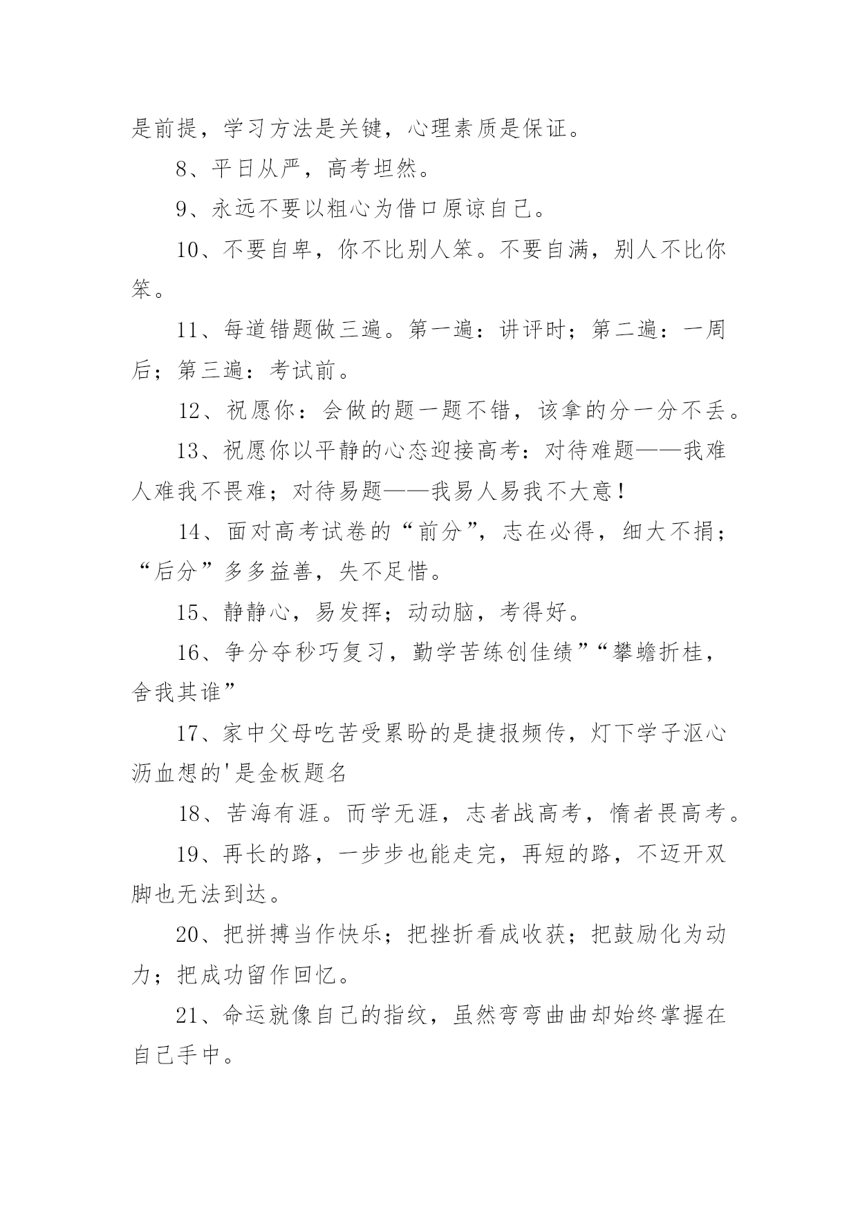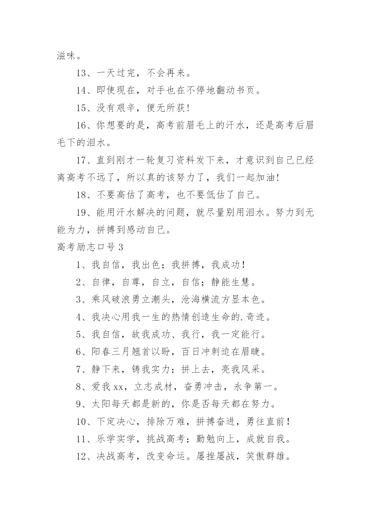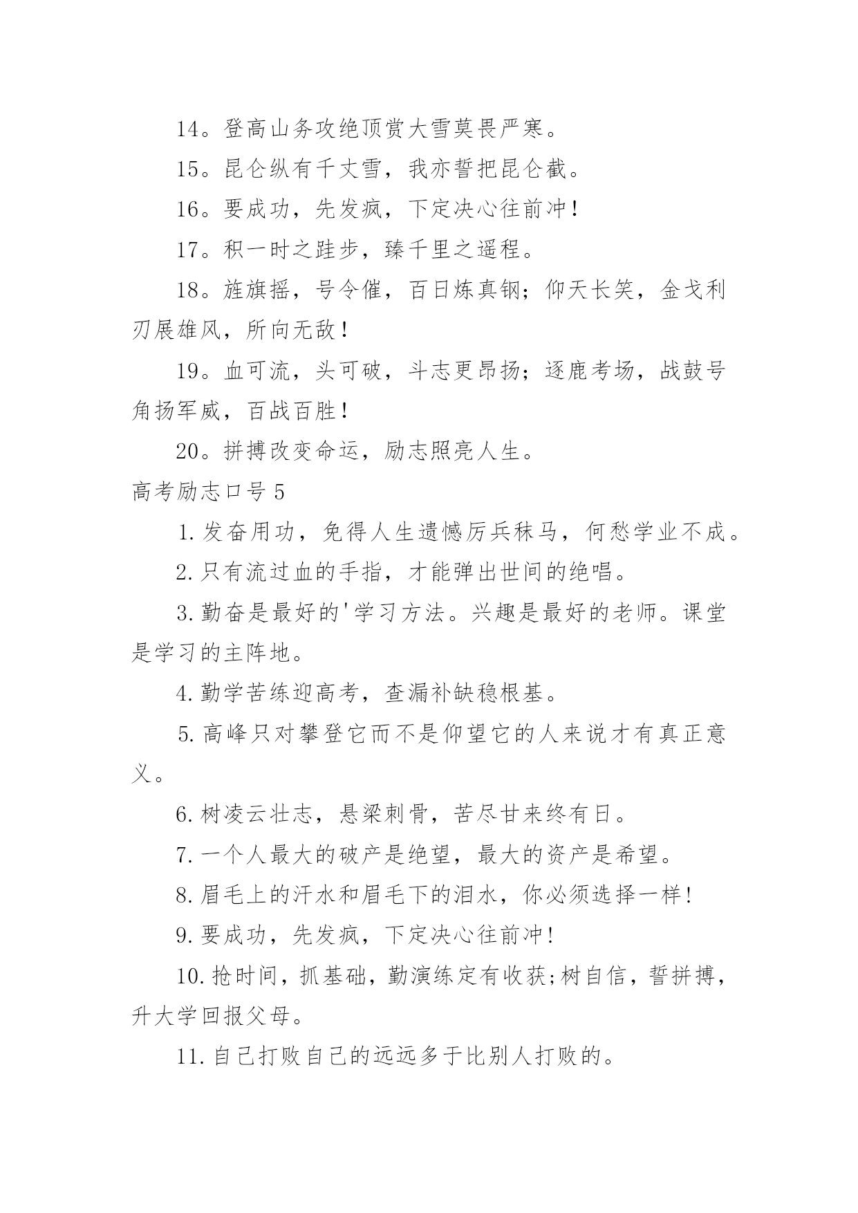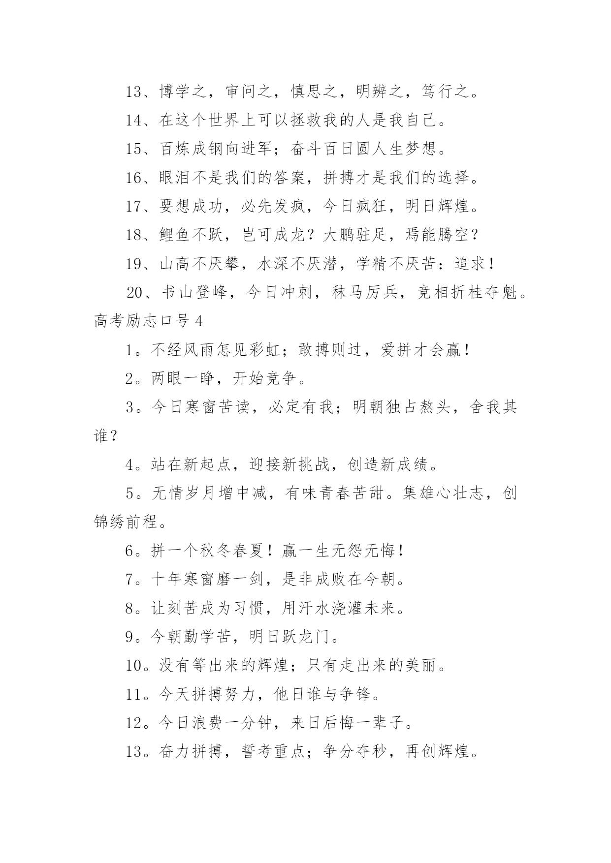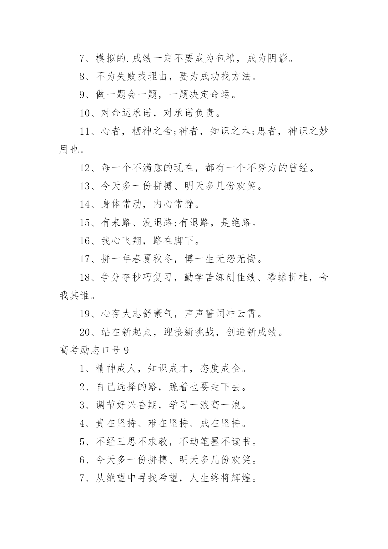 高考励志口号高考励志口号集合15篇在平时的学习、工作或生活中,许多人对一些广为流传的口号都不陌生吧,口号是指挥一个团队共同行为的指令。那么都有哪些类型的口号呢?以下是小编精心整理的高考励志口号,欢迎阅读与收藏。高考励志口号11、勤学乐思,奋发向上。2、自信自律,求实创新。3、勤奋乐学,团结拼搏。4、把握现在,决战今天。5、不到终点,永不放弃。6、愉快学习,健康成长。7、播种行为,收获命运。8、团结拼搏,争创佳绩。9、博学笃行,自强不息。10、开拓创新,争优进取。11、志在千里,壮心不已。12、分分秒秒,构筑辉煌。13、文明勤奋,竞争超越。14、文明友爱,求学拼搏。15、同舟共济,劈浪向前。16、英明神武,勇冠江山。17、千里之堤,溃于蚁穴。18、团结拼搏,展现自我。19、奋勇冲击,永争第一。20、船载千斤,掌舵一人。高考励志口号21、不经风雨,怎见彩虹?2、人的一生没有一帆风顺的坦途。3、生时何必久睡,死后自会长眠。4、静下来,铸我实力;拼上去,亮我风采。5、别以为父母等告诫你是“读书为自己啊”,你就可以轻松自如。既然你花着父母的钱,享受着父母给予的生命,那你也得为他们活。这,就是责任!6、别以为高三时间紧就不锻炼身体。不要在高中变成胖子,那样真是晕倒郁闷,经常生病得不偿失!7、成功不是将来才有的,而是从决定去做的那一刻起,持续累积而成。8、除了自己,任何人都无法给你力量。没有口水与汗水,就没有成功的泪水。9、身体常动,内心常静。10、学习时的痛苦是暂时的,未学到的痛11、学习并不是人生的`全部。但既然连人生的一部分---学习也无法征服,还能做什么?12、只有比别人更早、更勤奋地努力,才能尝到成功的滋味。13、一天过完,不会再来。14、即使现在,对手也在不停地翻动书页。15、没有艰辛,便无所获!16、你想要的是,高考前眉毛上的汗水,还是高考后眉毛下的泪水。17、直到刚才一轮复习资料发下来,才意识到自己已经离高考不远了,所以真的该努力了,我们一起加油!18、不要高估了高考,也不要低估了自己。19、能用汗水解决的问题,就尽量别用泪水。努力到无能为力,拼搏到感动自己。高考励志口号31、我自信,我出色;我拼搏,我成功!2、自律,自尊,自立,自信;静能生慧。3、乘风破浪勇立潮头,沧海横流方显本色。4、我决心用我一生的热情创造生命的.奇迹。5、我自信,故我成功、我行,我一定能行。6、阳春三月翘首以盼,百日冲刺迫在眉睫。7、静下来,铸我实力;拼上去,亮我风采。8、爱我xx,立志成材,奋勇冲击,永争第一。9、太阳每天都是新的,你是否每天都在努力。10、下定决心,排除万难,拼搏奋进,勇往直前!11、乐学实学,挑战高考;勤勉向上,成就自我。12、决战高考,改变命运。屡挫屡战,笑傲群雄。13、博学之,审问之,慎思之,明辨之,笃行之。14、在这个世界上可以拯救我的人是我自己。15、百炼成钢向进军;奋斗百日圆人生梦想。16、眼泪不是我们的答案,拼搏才是我们的选择。17、要想成功,必先发疯,今日疯狂,明日辉煌。18、鲤鱼不跃,岂可成龙?大鹏驻足,焉能腾空?19、山高不厌攀,水深不厌潜,学精不厌苦:追求!20、书山登峰,今日冲刺,秣马厉兵,竞相折桂夺魁。高考励志口号41。不经风雨怎见彩虹;敢搏则过,爱拼才会赢!2。两眼一睁,开始竞争。3。今日寒窗苦读,必定有我;明朝独占熬头,舍我其谁?4。站在新起点,迎接新挑战,创造新成绩。5。无情岁月增中减,有味青春苦甜。集雄心壮志,创锦绣前程。6。拼一个秋冬春夏!赢一生无怨无悔!7。十年寒窗磨一剑,是非成败在今朝。8。让刻苦成为习惯,用汗水浇灌未来。9。今朝勤学苦,明日跃龙门。10。没有等出来的辉煌;只有走出来的美丽。11。今天拼搏努力,他日谁与争锋。12。今日浪费一分钟,来日后悔一辈子。13。奋力拼搏,誓考重点;争分夺秒,再创辉煌。14。登高山务攻绝顶赏大雪莫畏严寒。15。昆仑纵有千丈雪,我亦誓把昆仑截。16。要成功,先发疯,下定决心往前冲!17。积一时之跬步,臻千里之遥程。18。旌旗摇,号令催,百日炼真钢;仰天长笑,金戈利刃展雄风,所向无敌!19。血可流,头可破,斗志更昂扬;逐鹿考场,战鼓号角扬军威,百战百胜!20。拼搏改变命运,励志照亮人生。高考励志口号51.发奋用功,免得人生遗憾厉兵秣马,何愁学业不成。2.只有流过血的手指,才能弹出世间的绝唱。3.勤奋是最好的'学习方法。兴趣是最好的老师。课堂是学习的主阵地。4.勤学苦练迎高考,查漏补缺稳根基。5.高峰只对攀登它而不是仰望它的人来说才有真正意义。6.树凌云壮志,悬梁刺骨,苦尽甘来终有日。7.一个人最大的破产是绝望,最大的资产是希望。8.眉毛上的汗水和眉毛下的泪水,你必须选择一样!9.要成功,先发疯,下定决心往前冲!10.抢时间,抓基础,勤演练定有收获;树自信