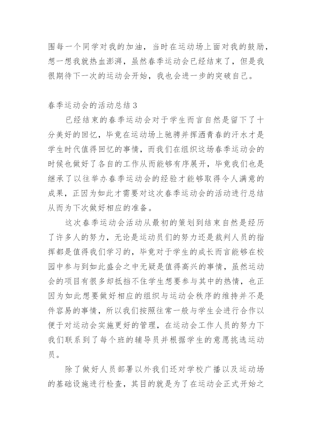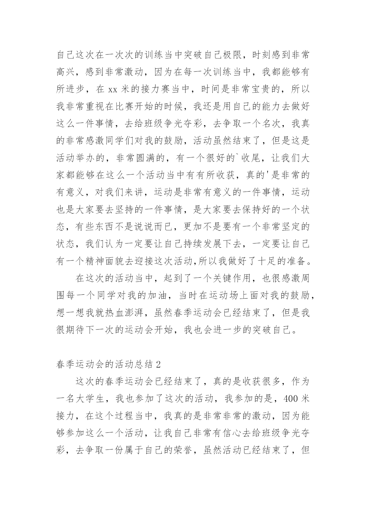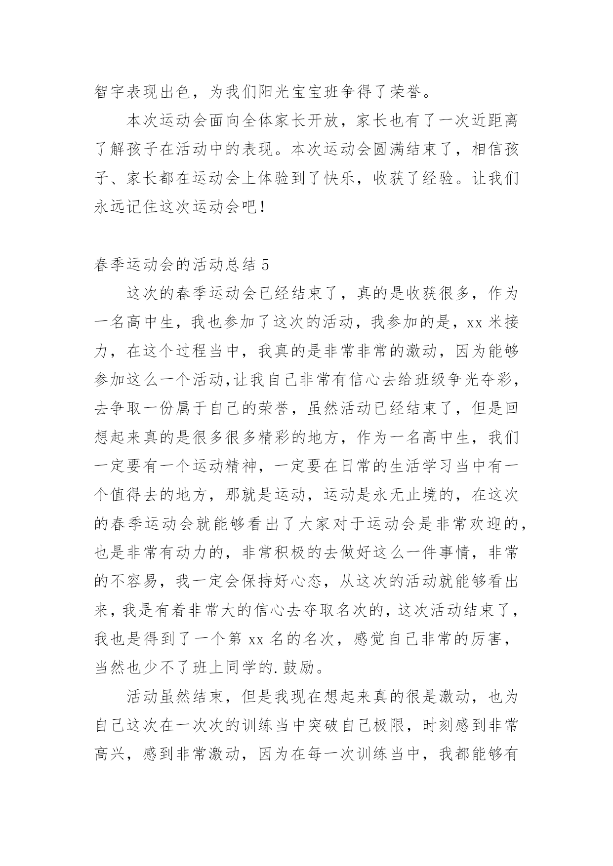 春季运动会的活动总结总结是事后对某一阶段的学习、工作或其完成情况加以回顾和分析的一种书面材料,它可以给我们下一阶段的学习和工作生活做指导,不妨坐下来好好写写总结吧。我们该怎么写总结呢?下面是小编帮大家整理的春季运动会的活动总结,希望能够帮助到大家。春季运动会的活动总结1这次的春季运动会已经结束了,真的是收获很多,作为一名大学生,我也参加了这次的活动,我参加的是,xx米接力,在这个过程当中,我真的是非常非常的激动,因为能够参加这么一个活动,让我自己非常有信心去给班级争光夺彩,去争取一份属于自己的荣誉,虽然活动已经结束了,但是回想起来真的是很多很多精彩的地方,作为一名大学生,我们一定要有一个运动精神,一定要在日常的生活学习当中有一个值得去的地方,那就是运动,运动是永无止境的,在这次的春季运动会就能够看出了大家对于运动会是非常欢迎的,也是非常有动力的,非常积极的去做好这么一件事情,非常的不容易,我一定会保持好心态,从这次的活动就能够看出来,我是有着非常大的信心去夺取名次的,这次活动结束了,我也是得到了一个第二名的名次,感觉自己非常的厉害,当然也少不了班上同学的鼓励。活动虽然结束,但是我现在想起来真的很是激动,也为自己这次在一次次的训练当中突破自己极限,时刻感到非常高兴,感到非常激动,因为在每一次训练当中,我都能够有所进步,在xx米的接力赛当中,时间是非常宝贵的,所以我非常重视在比赛开始的时候,我还是用自己的能力去做好这么一件事情,去给班级争光夺彩,去争取一个名次,我真的非常感激同学们对我的鼓励,活动虽然结束了,但是这是活动举办的,非常圆满的,有一个很好的`收尾,让我们大家都能够在这么一个活动当中有有所收获,真的'是非常的有意义,对我们来讲,运动是非常有意义的一件事情,运动也是大家要去坚持的一件事情,是大家要去保持好的一个状态,有些东西不是说说而已,更加不是要有一个非常坚定的状态,我们认为一定要让自己持续发展下去,一定要让自己有一个精神面貌去迎接这次活动,所以我做好了十足的准备。在这次的活动当中,起到了一个关键作用,也很感激周围每一个同学对我的加油,当时在运动场上面对我的鼓励,想一想我就热血澎湃,虽然春季运动会已经结束了,但是我很期待下一次的运动会开始,我也会进一步的突破自己。春季运动会的活动总结2这次的春季运动会已经结束了,真的是收获很多,作为一名大学生,我也参加了这次的活动,我参加的是,400米接力,在这个过程当中,我真的是非常非常的激动,因为能够参加这么一个活动,让我自己非常有信心去给班级争光夺彩,去争取一份属于自己的荣誉,虽然活动已经结束了,但是回想起来真的是很多很多精彩的地方,作为一名大学生,我们一定要有一个运动精神,一定要在日常的生活学习当中有一个值得去的地方,那就是运动,运动是永无止境的,在这次的春季运动会就能够看出了大家对于运动会是非常欢迎的,也是非常有动力的,非常积极的'去做好这么一件事情,非常的不容易,我一定会保持好心态,从这次的活动就能够看出来,我是有着非常大的信心去夺取名次的,这次活动结束了,我也是得到了一个第二名的名次,感觉自己非常的厉害,当然也少不了班上同学的鼓励。活动虽然结束,但是我现在想起来真的很是激动,也为自己这次在一次次的训练当中突破自己极限,时刻感到非常高兴,感到非常激动,因为在每一次训练当中,我都能够有所进步,在400米的接力赛当中,时间是非常宝贵的,所以我非常重视在比赛开始的时候,我还是用自己最大的能力去做好这么一件事情,去给班级争光夺彩,去争取一个名次,我真的非常感激同学们对我的鼓励,活动虽然结束了,但是这是活动举办的,非常圆满的,有一个很好的收尾,让我们大家都能够在这么一个活动当中有有所收获,真的是非常的有意义,对我们来讲,运动是非常有意义的一件事情,运动也是大家要去坚持的一件事情,是大家要去保持好的一个状态,有些东西不是说说而已,更加不是要有一个非常坚定的状态,我们认为一定要让自己持续发展下去,一定要让自己有一个精神面貌去迎接这次活动,所以我做好了十足的准备。在这次的活动当中,起到了一个关键作用,也很感激周围每一个同学对我的加油,当时在运动场上面对我的鼓励,想一想我就热血澎湃,虽然春季运动会已经结束了,但是我很期待下一次的运动会开始,我也会进一步的突破自己。春季运动会的活动总结3已经结束的春季运动会对于学生而言自然是留下了十分美好的回忆,毕竟在运动场上驰骋并挥洒青春的汗水才是学生时代值得回忆的事情,而我们在组织这场春季运动会的时候也做好了各自的工作从而能够有序展开,毕竟我们也是继承了以往举办春季运动会的经验才能够取得令人满意的成果,正因为如此才需要对这次春季运动会的活动进行总结从而为下次做好相应的准备。这次春季运动会活动从最初的策划到结束自然是经历了许多人的努力,无论是运动员们的努力