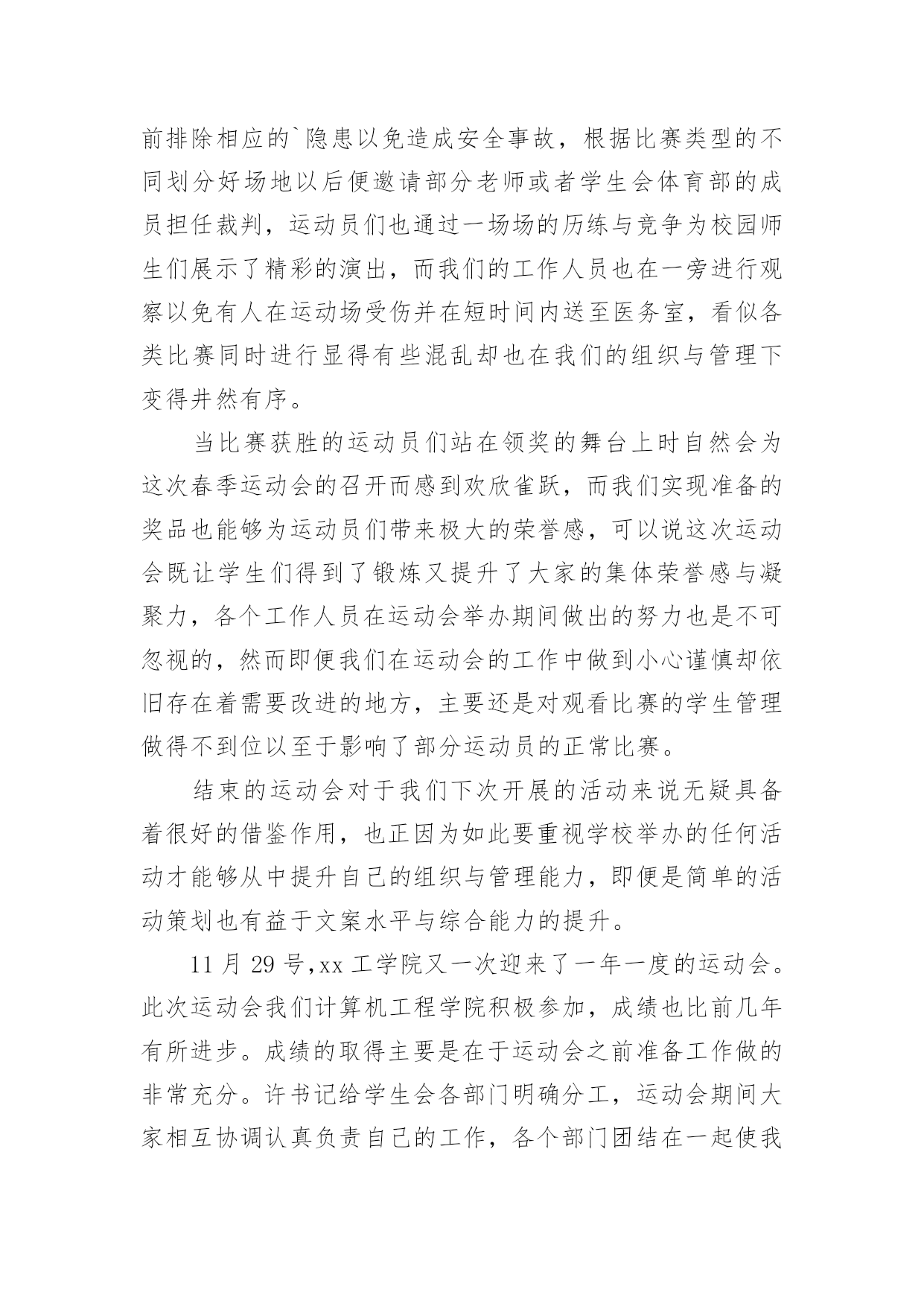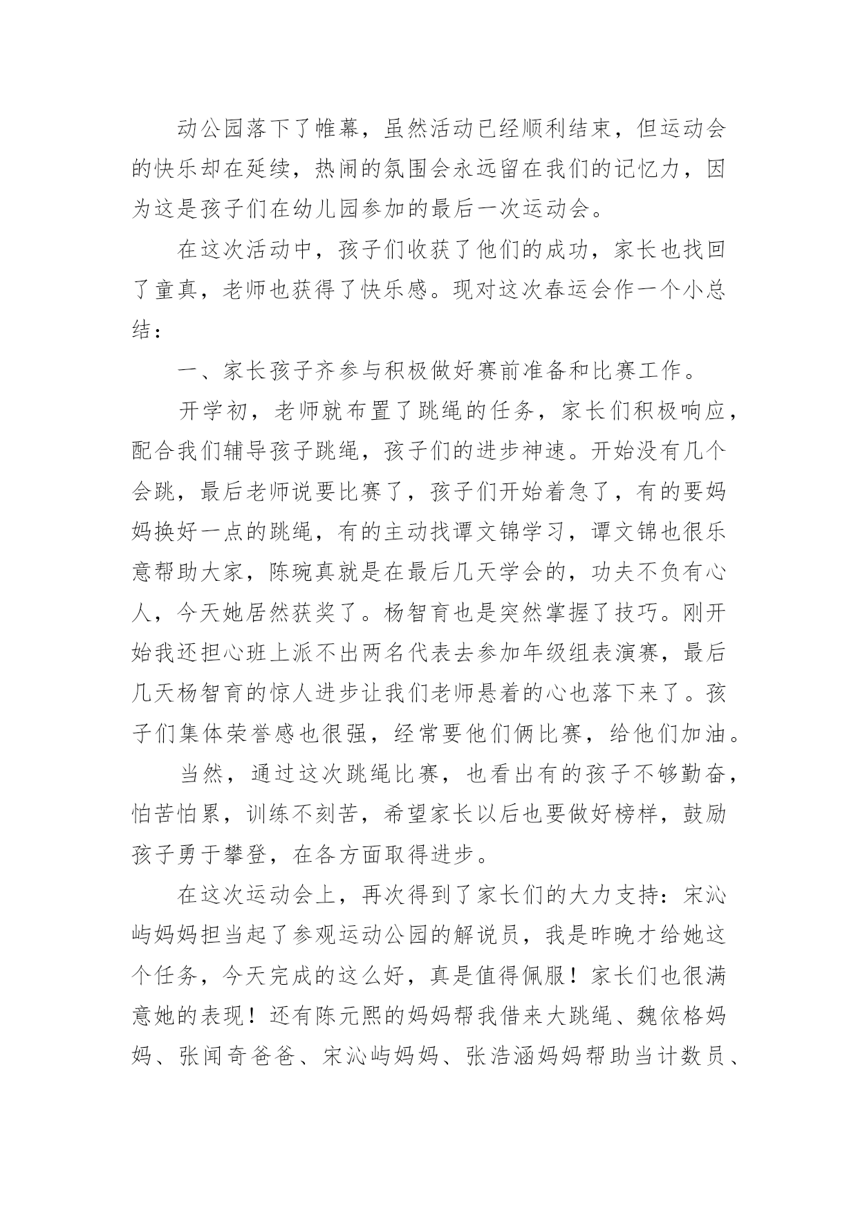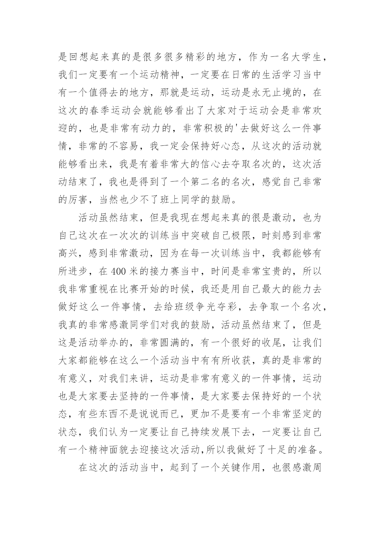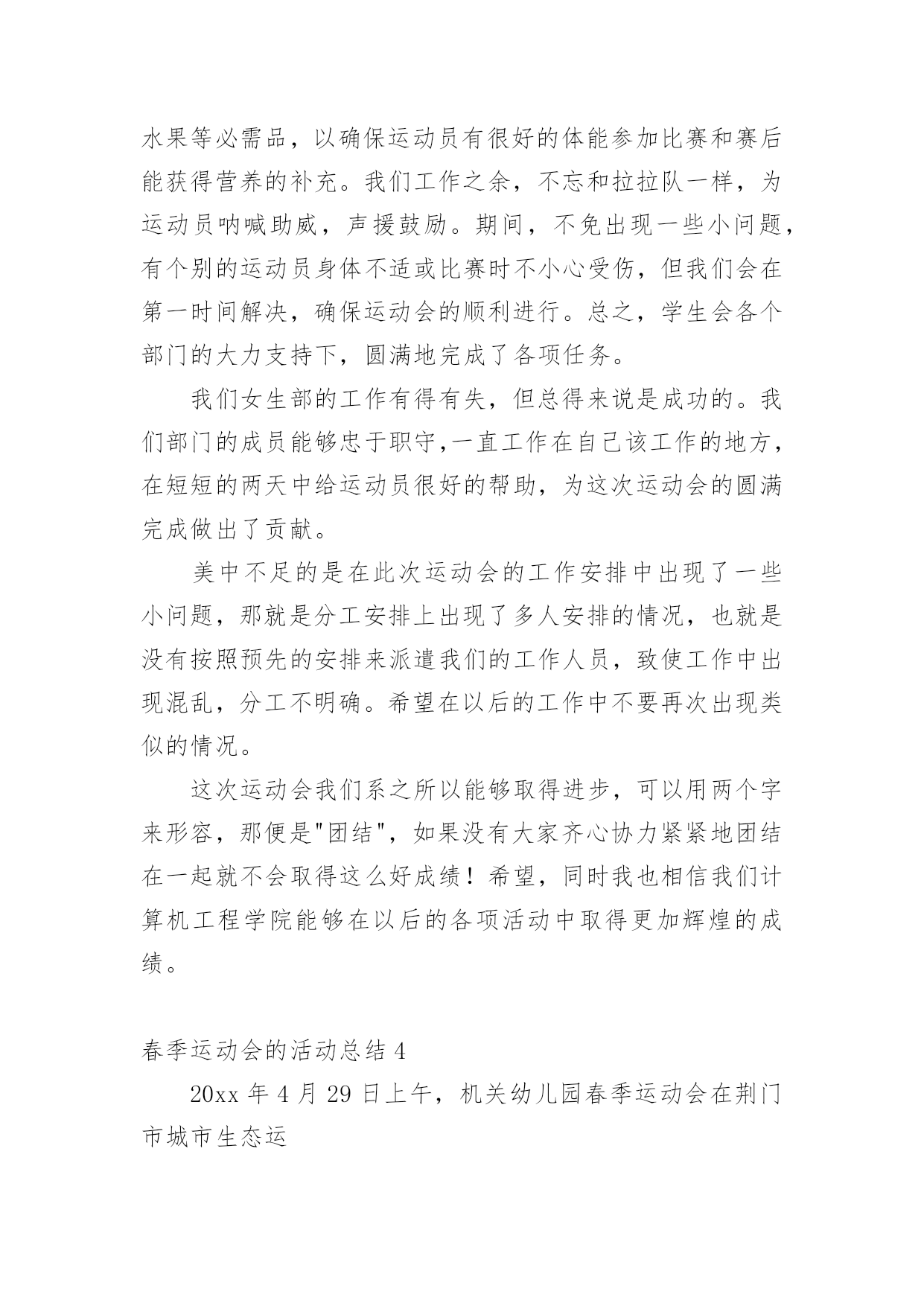春季运动会的活动总结总结是事后对某一阶段的学习、工作或其完成情况加以回顾和分析的一种书面材料,它可以给我们下一阶段的学习和工作生活做指导,不妨坐下来好好写写总结吧。我们该怎么写总结呢?下面是小编帮大家整理的春季运动会的活动总结,希望能够帮助到大家。春季运动会的活动总结1这次的春季运动会已经结束了,真的是收获很多,作为一名大学生,我也参加了这次的活动,我参加的是,xx米接力,在这个过程当中,我真的是非常非常的激动,因为能够参加这么一个活动,让我自己非常有信心去给班级争光夺彩,去争取一份属于自己的荣誉,虽然活动已经结束了,但是回想起来真的是很多很多精彩的地方,作为一名大学生,我们一定要有一个运动精神,一定要在日常的生活学习当中有一个值得去的地方,那就是运动,运动是永无止境的,在这次的春季运动会就能够看出了大家对于运动会是非常欢迎的,也是非常有动力的,非常积极的去做好这么一件事情,非常的不容易,我一定会保持好心态,从这次的活动就能够看出来,我是有着非常大的信心去夺取名次的,这次活动结束了,我也是得到了一个第二名的名次,感觉自己非常的厉害,当然也少不了班上同学的鼓励。活动虽然结束,但是我现在想起来真的很是激动,也为自己这次在一次次的训练当中突破自己极限,时刻感到非常高兴,感到非常激动,因为在每一次训练当中,我都能够有所进步,在xx米的接力赛当中,时间是非常宝贵的,所以我非常重视在比赛开始的时候,我还是用自己的能力去做好这么一件事情,去给班级争光夺彩,去争取一个名次,我真的非常感激同学们对我的鼓励,活动虽然结束了,但是这是活动举办的,非常圆满的,有一个很好的`收尾,让我们大家都能够在这么一个活动当中有有所收获,真的'是非常的有意义,对我们来讲,运动是非常有意义的一件事情,运动也是大家要去坚持的一件事情,是大家要去保持好的一个状态,有些东西不是说说而已,更加不是要有一个非常坚定的状态,我们认为一定要让自己持续发展下去,一定要让自己有一个精神面貌去迎接这次活动,所以我做好了十足的准备。在这次的活动当中,起到了一个关键作用,也很感激周围每一个同学对我的加油,当时在运动场上面对我的鼓励,想一想我就热血澎湃,虽然春季运动会已经结束了,但是我很期待下一次的运动会开始,我也会进一步的突破自己。春季运动会的活动总结2这次的春季运动会已经结束了,真的是收获很多,作为一名大学生,我也参加了这次的活动,我参加的是,400米接力,在这个过程当中,我真的是非常非常的激动,因为能够参加这么一个活动,让我自己非常有信心去给班级争光夺彩,去争取一份属于自己的荣誉,虽然活动已经结束了,但是回想起来真的是很多很多精彩的地方,作为一名大学生,我们一定要有一个运动精神,一定要在日常的生活学习当中有一个值得去的地方,那就是运动,运动是永无止境的,在这次的春季运动会就能够看出了大家对于运动会是非常欢迎的,也是非常有动力的,非常积极的'去做好这么一件事情,非常的不容易,我一定会保持好心态,从这次的活动就能够看出来,我是有着非常大的信心去夺取名次的,这次活动结束了,我也是得到了一个第二名的名次,感觉自己非常的厉害,当然也少不了班上同学的鼓励。活动虽然结束,但是我现在想起来真的很是激动,也为自己这次在一次次的训练当中突破自己极限,时刻感到非常高兴,感到非常激动,因为在每一次训练当中,我都能够有所进步,在400米的接力赛当中,时间是非常宝贵的,所以我非常重视在比赛开始的时候,我还是用自己最大的能力去做好这么一件事情,去给班级争光夺彩,去争取一个名次,我真的非常感激同学们对我的鼓励,活动虽然结束了,但是这是活动举办的,非常圆满的,有一个很好的收尾,让我们大家都能够在这么一个活动当中有有所收获,真的是非常的有意义,对我们来讲,运动是非常有意义的一件事情,运动也是大家要去坚持的一件事情,是大家要去保持好的一个状态,有些东西不是说说而已,更加不是要有一个非常坚定的状态,我们认为一定要让自己持续发展下去,一定要让自己有一个精神面貌去迎接这次活动,所以我做好了十足的准备。在这次的活动当中,起到了一个关键作用,也很感激周围每一个同学对我的加油,当时在运动场上面对我的鼓励,想一想我就热血澎湃,虽然春季运动会已经结束了,但是我很期待下一次的运动会开始,我也会进一步的突破自己。春季运动会的活动总结3已经结束的春季运动会对于学生而言自然是留下了十分美好的回忆,毕竟在运动场上驰骋并挥洒青春的汗水才是学生时代值得回忆的事情,而我们在组织这场春季运动会的时候也做好了各自的工作从而能够有序展开,毕竟我们也是继承了以往举办春季运动会的经验才能够取得令人满意的成果,正因为如此才需要对这次春季运动会的活动进行总结从而为下次做好相应的准备。这次春季运动会活动从最初的策划到结束自然是经历了许多人的努力,无论是运动员们的努力