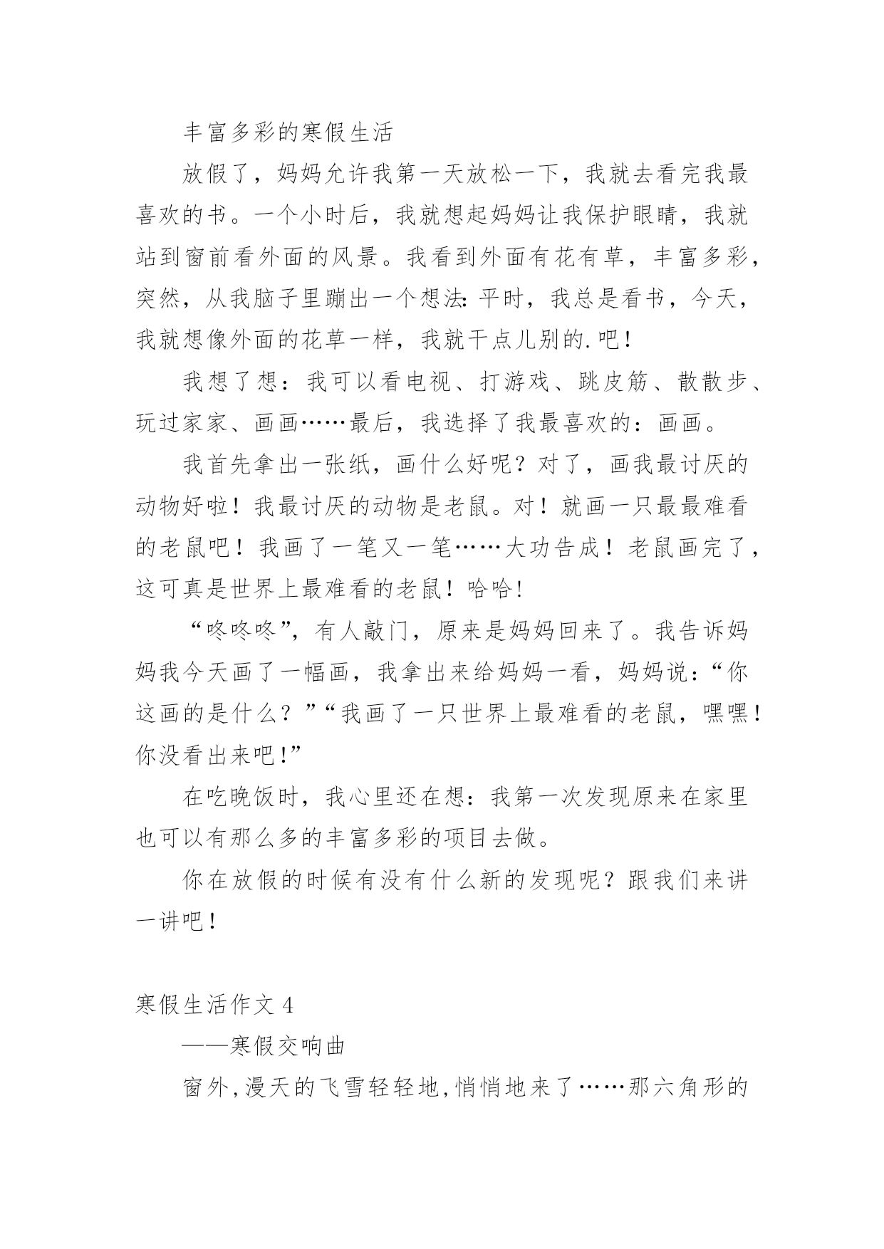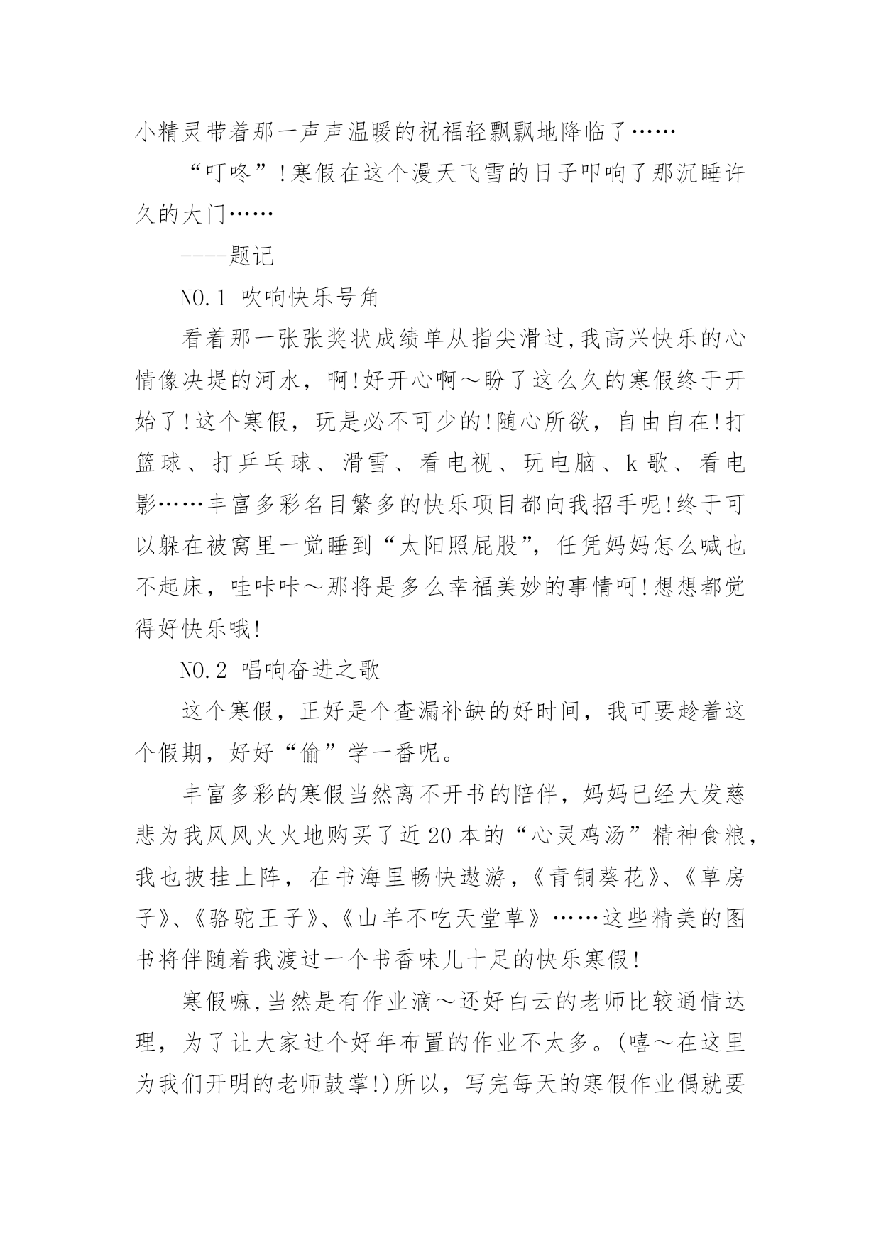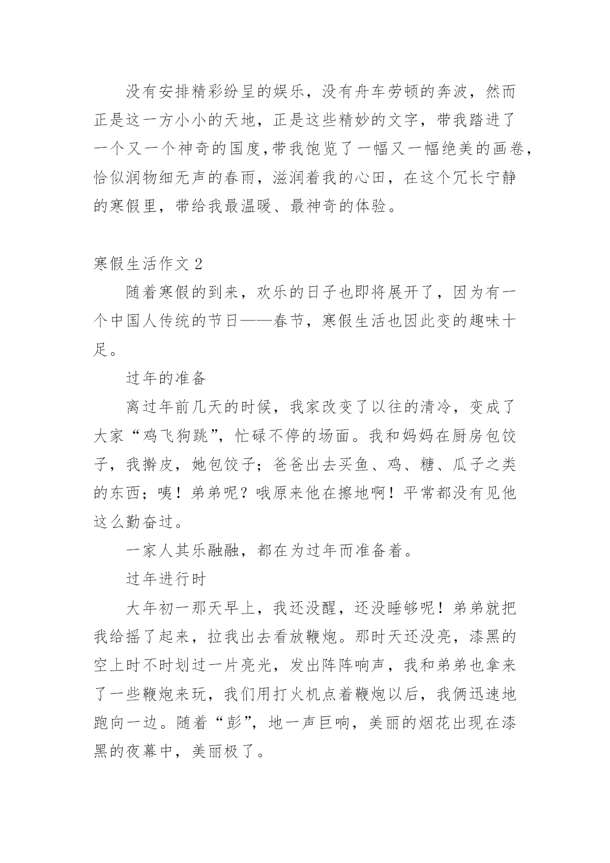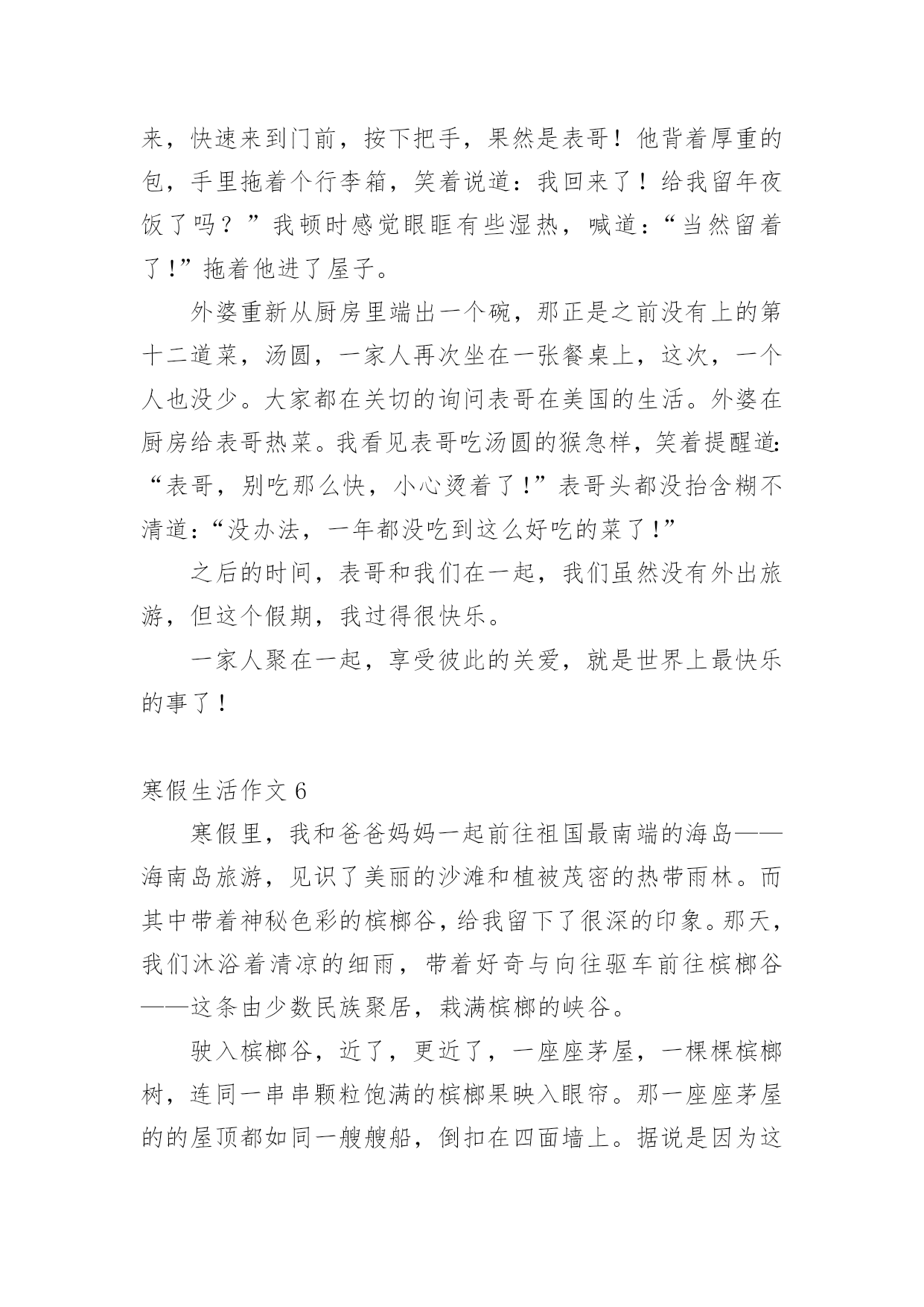 寒假生活作文寒假生活作文(精)在现实生活或工作学习中,大家都写过作文吧,作文是从内部言语向外部言语的过渡,即从经过压缩的简要的、自己能明白的语言,向开展的、具有规范语法结构的、能为他人所理解的外部语言形式的转化。为了让您在写作文时更加简单方便,下面是小编收集整理的寒假生活作文,仅供参考,欢迎大家阅读。寒假生活作文1未能亲身一览祖国大好河山,也没有精彩纷呈的娱乐活动,然而这个寒假,我却待在我家的书房里,在无数本书堆砌的那一方天地中尽情地神游了一番,获得了从未有过的新鲜体验。一、穿越不是当今人们热议的话题“穿越”,而是一本名为《穿越》的人文旅行杂志。详尽的游记、精彩的照片、独特的视角,让我足不出户也能饱览外面的'世界。在书中,我来到了朝鲜平壤,尝试了被监视、无网络的生活,瞻仰了“伟大的主席”、“永远的领袖”---金家三代领导人,记者在大街上偷拍的几张照片,让我仿佛回到了上世纪五、六十年代的中国,那还在按票领取供给的日子;我来到爱尔兰边境小城戈尔威,在黄昏的阳光下喝一杯爱尔兰咖啡,让时光在慵懒中就此凝固;我来到英国伦敦泰晤士河畔,在树里小屋吃女王蓝色天鹅绒帽子形状的夹里奶油饼,享用真正的英式皇家下午茶……我好似“穿越”到了一个又一个地方,与当地人亲切交谈。在《中国国家地理》中,我目睹记者在轮船上颠簸二、三十小时后到达三沙市,在南沙西沙北沙的礁岛周围冒着生命危险潜水取材,为海南省椰子的低产及高达70﹪的进口量而担忧……一来一去的“穿越”带给我的是无数新奇的经历。二、神交这个寒假,我阅读了由林语堂先生所著的中文版《京华烟云》,认识了林语堂心目中“中国旧社会最完美的女性”——姚木兰。她知书达理温文尔雅,却又敢爱敢恨勇于革新。透过字里行间,我仿佛在与她对话,了解到在那个动乱年代里,中国旧社会与新社会交替下人们动荡的生活。三、梦回古诗词永远都是人们品不完的美酒。“君不见黄河之水天上来,奔流到海不复回;君不见高堂明镜悲白发,朝如青丝暮成雪”,我仿佛梦回唐朝,看见李大诗人劝酒的情形;“日暮酒醒人已远,满天风雨下西楼”,我恍若听到许浑解行舟后的感慨;我又仿佛梦回清朝,看荣国府宁国府的兴衰盛败,“秋容浅淡映重门,七节攒成雪满盆”,与迎、探、惜春等人一起,押“门盆痕魂昏”的韵吟诗作对,“偷来梨蕊三分白,借得梅花一缕魂”,看蘅芜潇湘吟出七言律诗,哪还记得开篇的“满纸荒唐言,一把辛酸泪”!……没有安排精彩纷呈的娱乐,没有舟车劳顿的奔波,然而正是这一方小小的天地,正是这些精妙的文字,带我踏进了一个又一个神奇的国度,带我饱览了一幅又一幅绝美的画卷,恰似润物细无声的春雨,滋润着我的心田,在这个冗长宁静的寒假里,带给我最温暖、最神奇的体验。寒假生活作文2随着寒假的到来,欢乐的日子也即将展开了,因为有一个中国人传统的节日——春节,寒假生活也因此变的趣味十足。过年的准备离过年前几天的时候,我家改变了以往的清冷,变成了大家“鸡飞狗跳”,忙碌不停的场面。我和妈妈在厨房包饺子,我擀皮,她包饺子;爸爸出去买鱼、鸡、糖、瓜子之类的东西;咦!弟弟呢?哦原来他在擦地啊!平常都没有见他这么勤奋过。一家人其乐融融,都在为过年而准备着。过年进行时大年初一那天早上,我还没醒,还没睡够呢!弟弟就把我给摇了起来,拉我出去看放鞭炮。那时天还没亮,漆黑的空上时不时划过一片亮光,发出阵阵响声,我和弟弟也拿来了一些鞭炮来玩,我们用打火机点着鞭炮以后,我俩迅速地跑向一边。随着“彭”,地一声巨响,美丽的烟花出现在漆黑的夜幕中,美丽极了。过了一会儿,我的姑姑婶婶们都来了,这时天已经大亮了,但也依稀有鞭炮声的存在。爸爸妈妈让我们去给长辈们拜年,我和所有的孩子们一起跑向大人,但是人太多了,我们就大声唱“新年好呀!新年好呀!祝福大家新年好。”在歌声快结束时,我们又大喊了一声“恭喜发财,红包拿来”,大人们看我们这样子也笑开了……在欢声笑语中我们迎接新的一年的到来,当然自己的钱包也鼓了起来。美好的.结尾这一天是大年初五,新年的最后一天。我们一家人去了河滨公园玩,进去的时候,眼前的场景使人震撼,人山人海,耳边到处都是此起彼伏的叫卖声。爸爸妈妈紧紧拉着我们,生怕我们走丢了。我们一起玩了过山车,大摆锤和碰碰车。当中最刺激的是大摆锤,当我们上到处时,我甚至可以触摸到旁边大树的枝叶了,我感到非常害怕。“啊!”乘客们都发出了叫声,摆锤急速下降了,我更是乱叫着,闭上眼,什么都想不起来了,直到停下的时候我才醒过来。醒来的时候,我急忙地拉起他们就走了,爸妈在后面不停的笑我。在欢声笑语中,我们迎来了新的一年,又是在欢声笑语中,我们送走了新年的最后一天。在欢度新年的时候,家里是多么的快乐,希望新的一年可以带给我们新的收获,忘记烦恼,快乐的过着每一天。寒假生活作文3世界有七彩之色,生活有五颜六色。但在绚烂色彩中匆匆忙忙的我们,眼前却是一