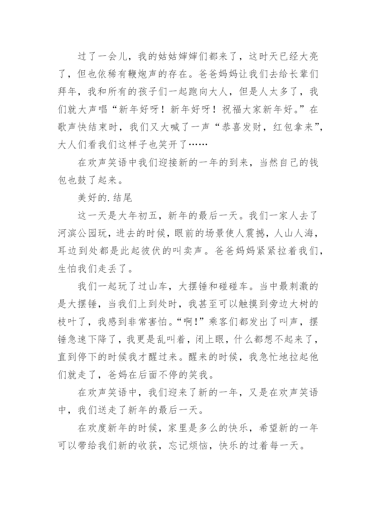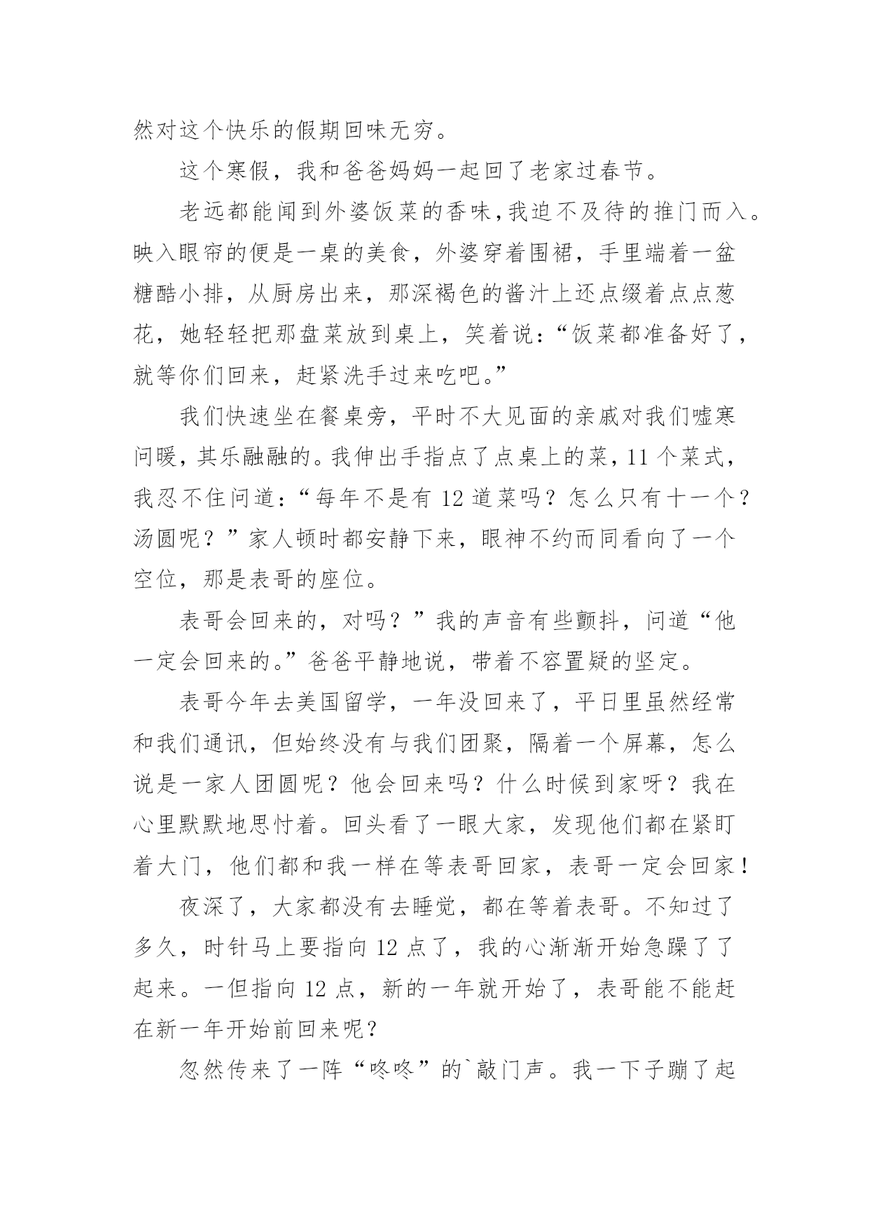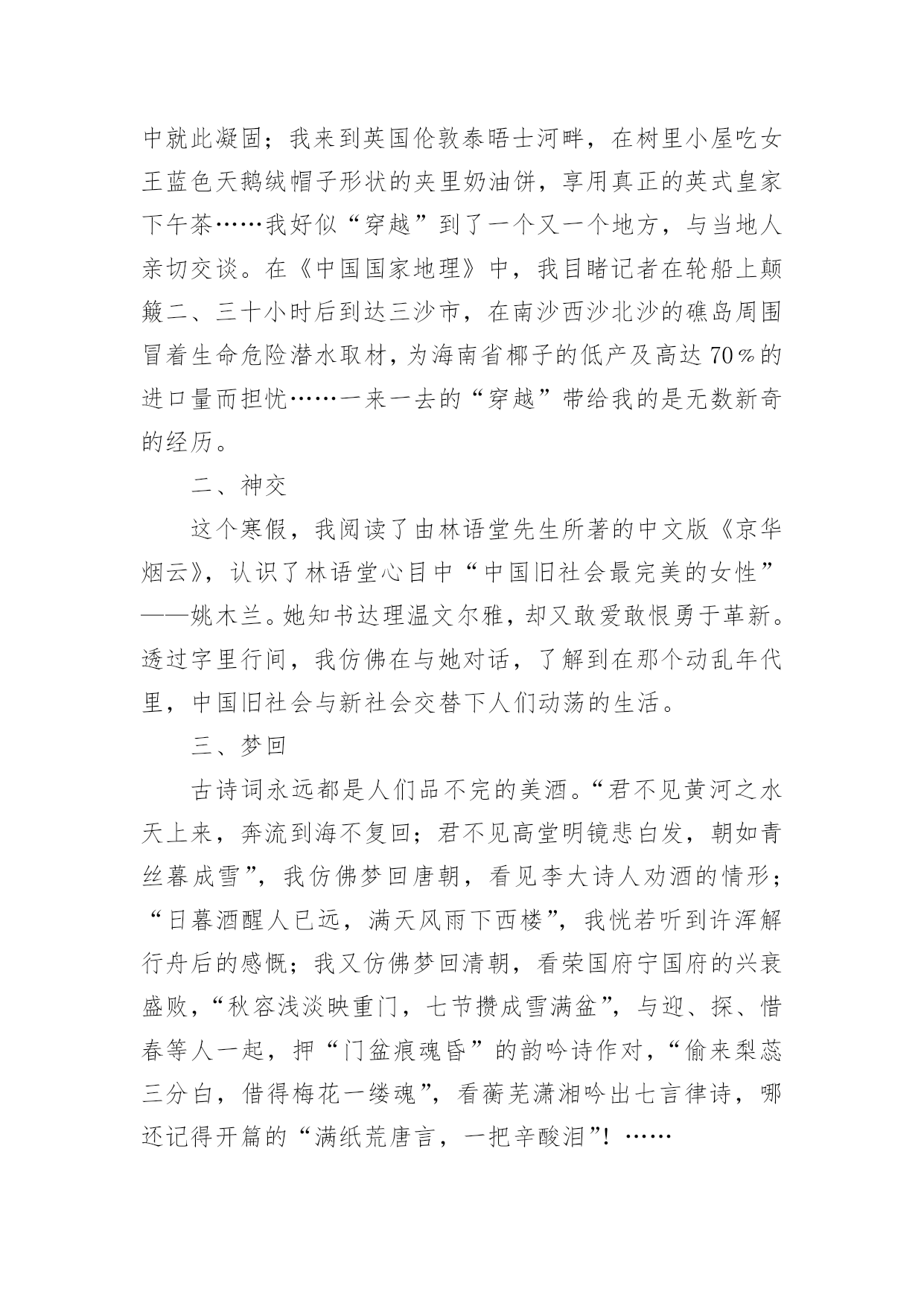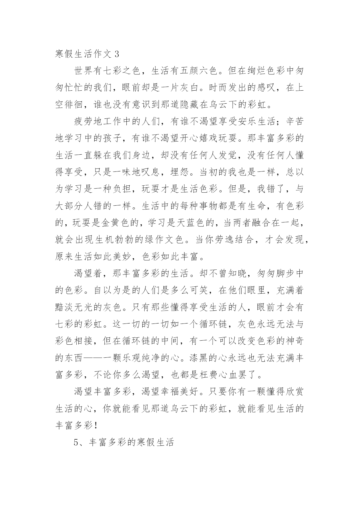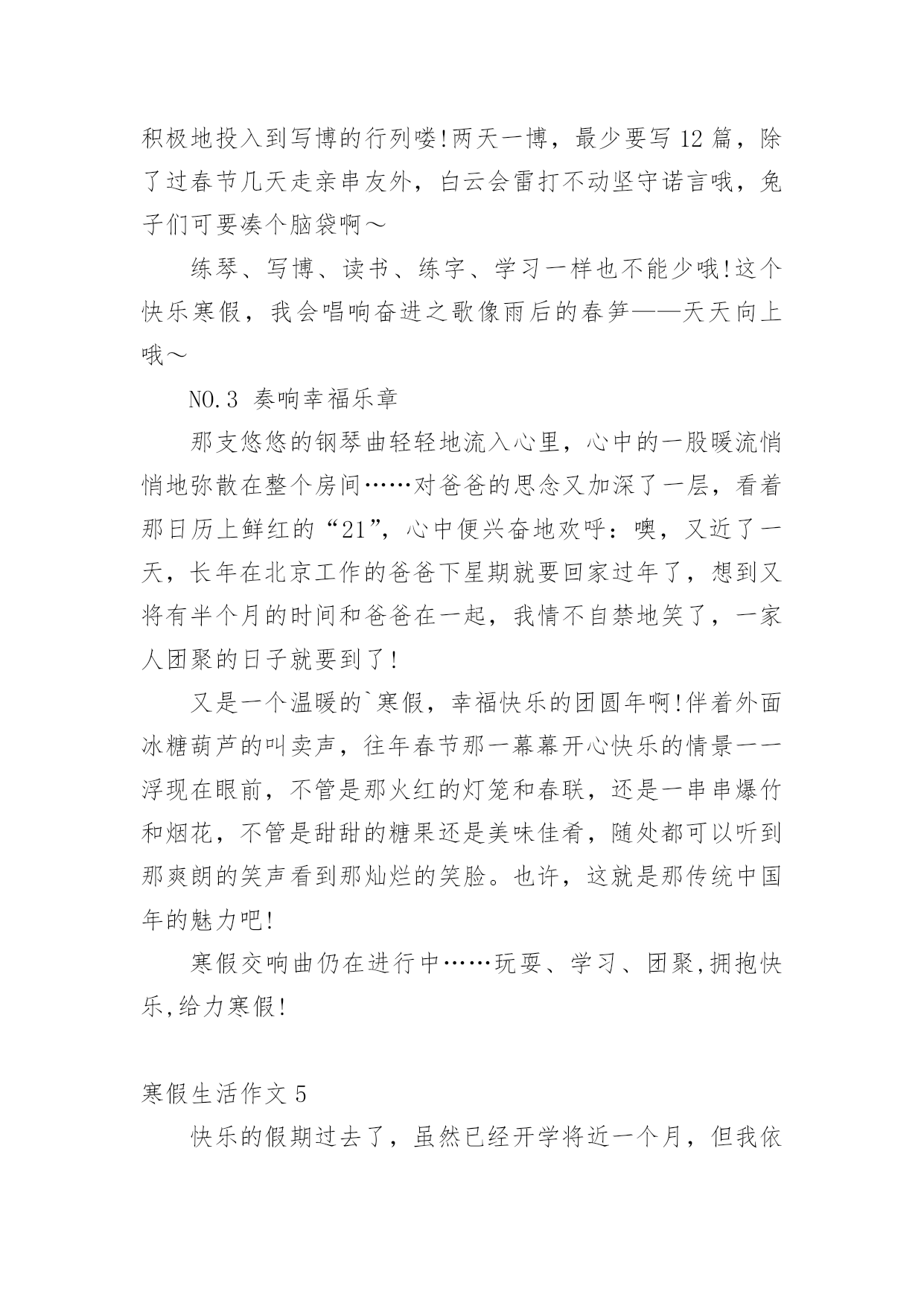 寒假生活作文寒假生活作文(精)在现实生活或工作学习中,大家都写过作文吧,作文是从内部言语向外部言语的过渡,即从经过压缩的简要的、自己能明白的语言,向开展的、具有规范语法结构的、能为他人所理解的外部语言形式的转化。为了让您在写作文时更加简单方便,下面是小编收集整理的寒假生活作文,仅供参考,欢迎大家阅读。寒假生活作文1未能亲身一览祖国大好河山,也没有精彩纷呈的娱乐活动,然而这个寒假,我却待在我家的书房里,在无数本书堆砌的那一方天地中尽情地神游了一番,获得了从未有过的新鲜体验。一、穿越不是当今人们热议的话题“穿越”,而是一本名为《穿越》的人文旅行杂志。详尽的游记、精彩的照片、独特的视角,让我足不出户也能饱览外面的'世界。在书中,我来到了朝鲜平壤,尝试了被监视、无网络的生活,瞻仰了“伟大的主席”、“永远的领袖”---金家三代领导人,记者在大街上偷拍的几张照片,让我仿佛回到了上世纪五、六十年代的中国,那还在按票领取供给的日子;我来到爱尔兰边境小城戈尔威,在黄昏的阳光下喝一杯爱尔兰咖啡,让时光在慵懒中就此凝固;我来到英国伦敦泰晤士河畔,在树里小屋吃女王蓝色天鹅绒帽子形状的夹里奶油饼,享用真正的英式皇家下午茶……我好似“穿越”到了一个又一个地方,与当地人亲切交谈。在《中国国家地理》中,我目睹记者在轮船上颠簸二、三十小时后到达三沙市,在南沙西沙北沙的礁岛周围冒着生命危险潜水取材,为海南省椰子的低产及高达70﹪的进口量而担忧……一来一去的“穿越”带给我的是无数新奇的经历。二、神交这个寒假,我阅读了由林语堂先生所著的中文版《京华烟云》,认识了林语堂心目中“中国旧社会最完美的女性”——姚木兰。她知书达理温文尔雅,却又敢爱敢恨勇于革新。透过字里行间,我仿佛在与她对话,了解到在那个动乱年代里,中国旧社会与新社会交替下人们动荡的生活。三、梦回古诗词永远都是人们品不完的美酒。“君不见黄河之水天上来,奔流到海不复回;君不见高堂明镜悲白发,朝如青丝暮成雪”,我仿佛梦回唐朝,看见李大诗人劝酒的情形;“日暮酒醒人已远,满天风雨下西楼”,我恍若听到许浑解行舟后的感慨;我又仿佛梦回清朝,看荣国府宁国府的兴衰盛败,“秋容浅淡映重门,七节攒成雪满盆”,与迎、探、惜春等人一起,押“门盆痕魂昏”的韵吟诗作对,“偷来梨蕊三分白,借得梅花一缕魂”,看蘅芜潇湘吟出七言律诗,哪还记得开篇的“满纸荒唐言,一把辛酸泪”!……没有安排精彩纷呈的娱乐,没有舟车劳顿的奔波,然而正是这一方小小的天地,正是这些精妙的文字,带我踏进了一个又一个神奇的国度,带我饱览了一幅又一幅绝美的画卷,恰似润物细无声的春雨,滋润着我的心田,在这个冗长宁静的寒假里,带给我最温暖、最神奇的体验。寒假生活作文2随着寒假的到来,欢乐的日子也即将展开了,因为有一个中国人传统的节日——春节,寒假生活也因此变的趣味十足。过年的准备离过年前几天的时候,我家改变了以往的清冷,变成了大家“鸡飞狗跳”,忙碌不停的场面。我和妈妈在厨房包饺子,我擀皮,她包饺子;爸爸出去买鱼、鸡、糖、瓜子之类的东西;咦!弟弟呢?哦原来他在擦地啊!平常都没有见他这么勤奋过。一家人其乐融融,都在为过年而准备着。过年进行时大年初一那天早上,我还没醒,还没睡够呢!弟弟就把我给摇了起来,拉我出去看放鞭炮。那时天还没亮,漆黑的空上时不时划过一片亮光,发出阵阵响声,我和弟弟也拿来了一些鞭炮来玩,我们用打火机点着鞭炮以后,我俩迅速地跑向一边。随着“彭”,地一声巨响,美丽的烟花出现在漆黑的夜幕中,美丽极了。过了一会儿,我的姑姑婶婶们都来了,这时天已经大亮了,但也依稀有鞭炮声的存在。爸爸妈妈让我们去给长辈们拜年,我和所有的孩子们一起跑向大人,但是人太多了,我们就大声唱“新年好呀!新年好呀!祝福大家新年好。”在歌声快结束时,我们又大喊了一声“恭喜发财,红包拿来”,大人们看我们这样子也笑开了……在欢声笑语中我们迎接新的一年的到来,当然自己的钱包也鼓了起来。美好的.结尾这一天是大年初五,新年的最后一天。我们一家人去了河滨公园玩,进去的时候,眼前的场景使人震撼,人山人海,耳边到处都是此起彼伏的叫卖声。爸爸妈妈紧紧拉着我们,生怕我们走丢了。我们一起玩了过山车,大摆锤和碰碰车。当中最刺激的是大摆锤,当我们上到处时,我甚至可以触摸到旁边大树的枝叶了,我感到非常害怕。“啊!”乘客们都发出了叫声,摆锤急速下降了,我更是乱叫着,闭上眼,什么都想不起来了,直到停下的时候我才醒过来。醒来的时候,我急忙地拉起他们就走了,爸妈在后面不停的笑我。在欢声笑语中,我们迎来了新的一年,又是在欢声笑语中,我们送走了新年的最后一天。在欢度新年的时候,家里是多么的快乐,希望新的一年可以带给我们新的收获,忘记烦恼,快乐的过着每一天。寒假生活作文3世界有七彩之色,生活有五颜六色。但在绚烂色彩中匆匆忙忙的我们,眼前却是一
