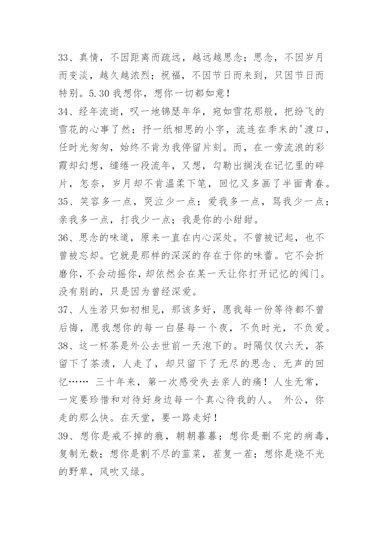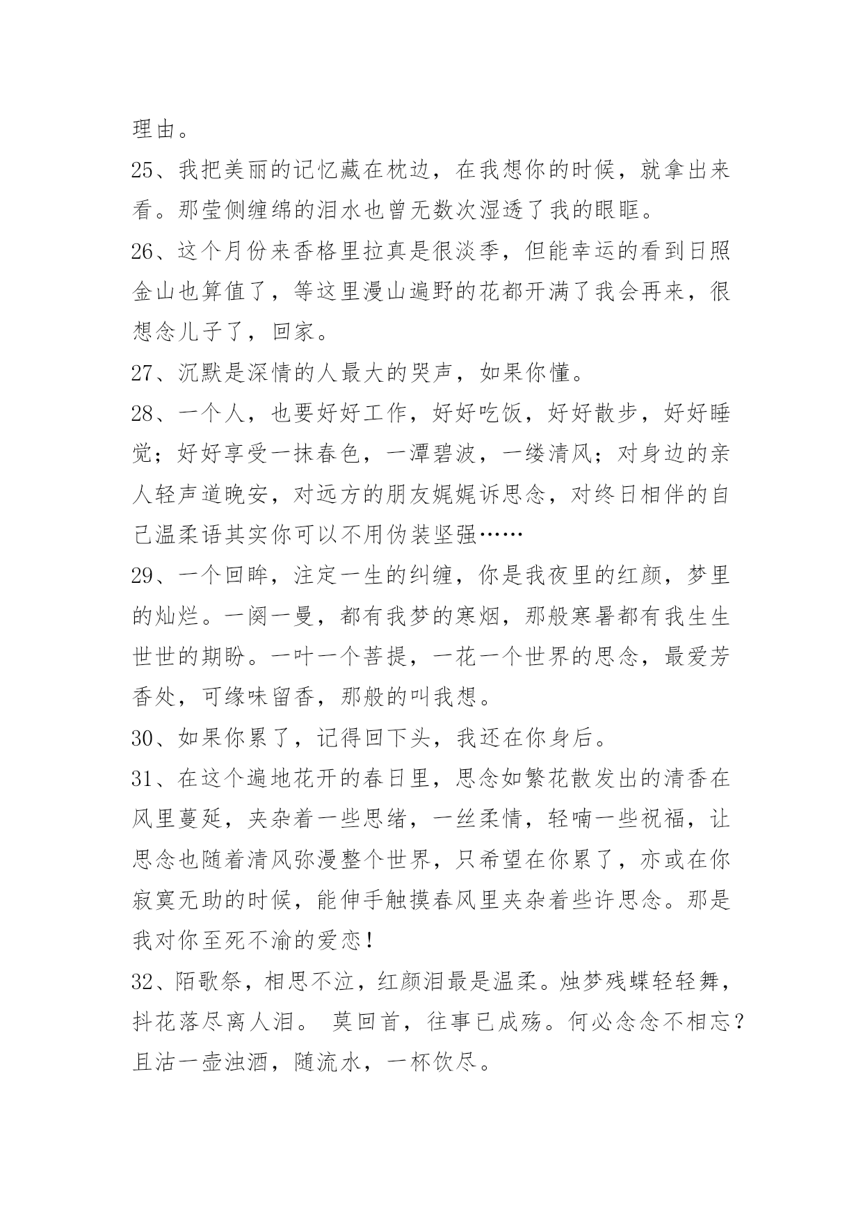 经典思念朋友圈文案句子经典思念朋友圈文案句子40句精选今朝风日好,或恐故人来。以下这篇文章是小编为大家准备的思念朋友圈文案句子,欢迎参考。1、思念,漂浮在脑子的灵魂丶离不开,割舍不掉。2、思念的距离,是因为不唯美。3、于是,我将思念牵挂在风筝的的顶端,放飞在你的天空。4、有一种思念叫做望眼欲穿。5、忘不掉的人就不要忘了,心里有个人思念至少不会空荡。6、想念变成怀念,思念被时间揉成了碎屑。7、思念却停止了脚步,悲伤却一直在继续。8、夕阳把我的影子拉的很长很长,犹如我长长的思念。9、借问此时何所思,思念不见欲断魂。10、没了你的我这世界,你能否体会对你所有的思念。11、兴许我很疼痛很无助很孤单很想哭,然而我不能怒不能诉不能输不能哭。12、是从什么时候起,一开始执着于一个背影,一开始思念起一个声音。是从什么时候起,一开始执着于一个背影,一开始思念起一个声音。13、一个相爱的日子里,都在思念中度过,思念让自己的内心如此丰满,用思念在寒冷的冬日里为自己取暖,用思念在心中秀出一个春天。14、你带着我的思念承载着我的期盼,我不想你成为我最美的稀罕,某一天的某一刻我希望你出现我眼前,不再消失不见。15、530我想你,我的思念,在你身边,"时时出现";我的挂念,在你心田,"秒秒弥漫";我的眷恋,在你梦里,"天天作伴";我的真心,在你身旁,"永远陪伴"!16、短信一条,收到就行;有我祝福,知道就行;今天的你,顺利就行;记得想我,偶尔也行;看完以后,笑笑就行。新的一周,记得快乐就行!17、美好的你就像是值得一生观望的烟火,只不过不属于我。18、如果我没有遇见你,我就不会知道,有一种情感,痛着流泪,笑着思念,碎碎念,念碎碎,如痴如醉!19、思念是一种苦,苦累也充实。20、今晚你可有收到我今天对你的思念,想起我们曾经去过的地方,想着我们一起走过的日子,一切都好像昨天发生一样,让我脑子里想的全是你。21、当夜深人静时,你轻轻捧起这些文字,那些美丽,便如潮水一样将你淹没,那是我对你无尽的爱与思念。22、思念是一粒种子,种在心田,蔓延一生!有生根的喜悦与苦痛,也有花开的美丽与芬芳,更有收获的期盼与憧憬。23、相思成风,追逐思念的羽翼,声声呢喃字里字外,默默相惜着,脉脉落笔,在一纸水墨里,涟漪心事。24、人生在世,一个情字,缠绵一生,因爱而生,因情而活。纵然再怎么孤单无助,也总有一个让我们不得不坚持下去的理由。25、我把美丽的记忆藏在枕边,在我想你的时候,就拿出来看。那莹侧缠绵的泪水也曾无数次湿透了我的眼眶。26、这个月份来香格里拉真是很淡季,但能幸运的看到日照金山也算值了,等这里漫山遍野的花都开满了我会再来,很想念儿子了,回家。27、沉默是深情的人最大的哭声,如果你懂。28、一个人,也要好好工作,好好吃饭,好好散步,好好睡觉;好好享受一抹春色,一潭碧波,一缕清风;对身边的亲人轻声道晚安,对远方的朋友娓娓诉思念,对终日相伴的自己温柔语其实你可以不用伪装坚强……29、一个回眸,注定一生的纠缠,你是我夜里的红颜,梦里的灿烂。一阕一曼,都有我梦的寒烟,那般寒暑都有我生生世世的期盼。一叶一个菩提,一花一个世界的思念,最爱芳香处,可缘味留香,那般的叫我想。30、如果你累了,记得回下头,我还在你身后。31、在这个遍地花开的春日里,思念如繁花散发出的清香在风里蔓延,夹杂着一些思绪,一丝柔情,轻喃一些祝福,让思念也随着清风弥漫整个世界,只希望在你累了,亦或在你寂寞无助的时候,能伸手触摸春风里夹杂着些许思念。那是我对你至死不渝的爱恋!32、陌歌祭,相思不泣,红颜泪最是温柔。烛梦残蝶轻轻舞,抖花落尽离人泪。莫回首,往事已成殇。何必念念不相忘?且沽一壶浊酒,随流水,一杯饮尽。33、真情,不因距离而疏远,越远越思念;思念,不因岁月而变淡,越久越浓烈;祝福,不因节日而来到,只因节日而特别。5.30我想你,想你一切都如意!34、经年流逝,叹一地锦瑟年华,宛如雪花那般,把纷飞的雪花的心事了然;抒一纸相思的小字,流连在季末的'渡口,任时光匆匆,始终不肯为我停留片刻。而,在一旁流浪的彩霞却幻想,缱绻一段流年,又想,勾勒出搁浅在记忆里的碎片,怎奈,岁月却不肯温柔下笔,回忆又多画了半面青春。35、笑容多一点,哭泣少一点;爱我多一点,骂我少一点;亲我多一点,打我少一点;我是你的小甜甜。36、思念的味道,原来一直在内心深处。不曾被记起,也不曾被忘却。它就是那样的深深的存在于你的味蕾。它不会折磨你,不会动摇你,却依然会在某一天让你打开记忆的阀门。没有别的,只是因为曾经深爱。37、人生若只如初相见,那该多好,愿我每一份等待都不曾后悔,愿我想你的每一白昼每一个夜,不负时光,不负爱。38、这一杯茶是外公去世前一天泡下的。时隔仅仅六天,茶留下了茶渍,人走了,却只留下了无尽的思念、无声的回忆……三十年来,第一