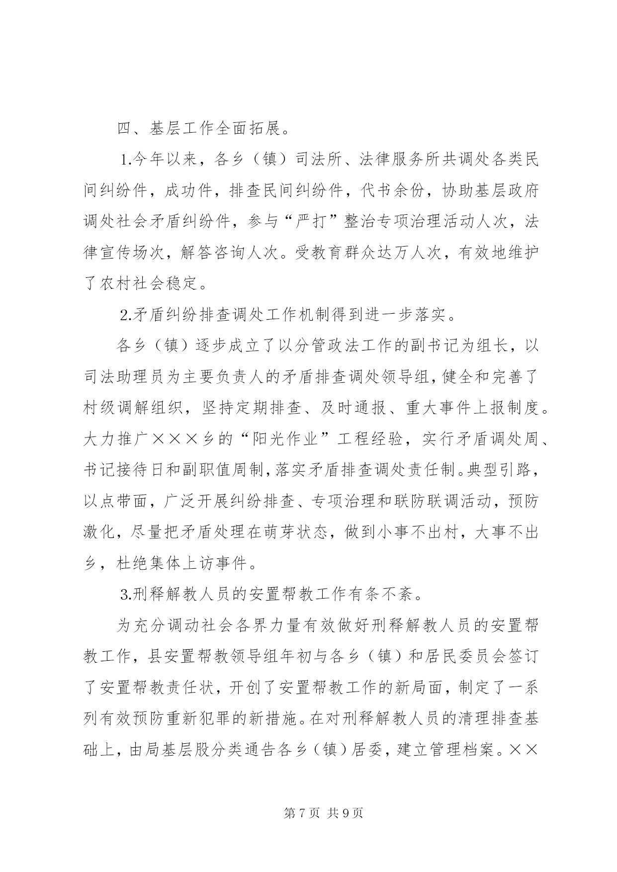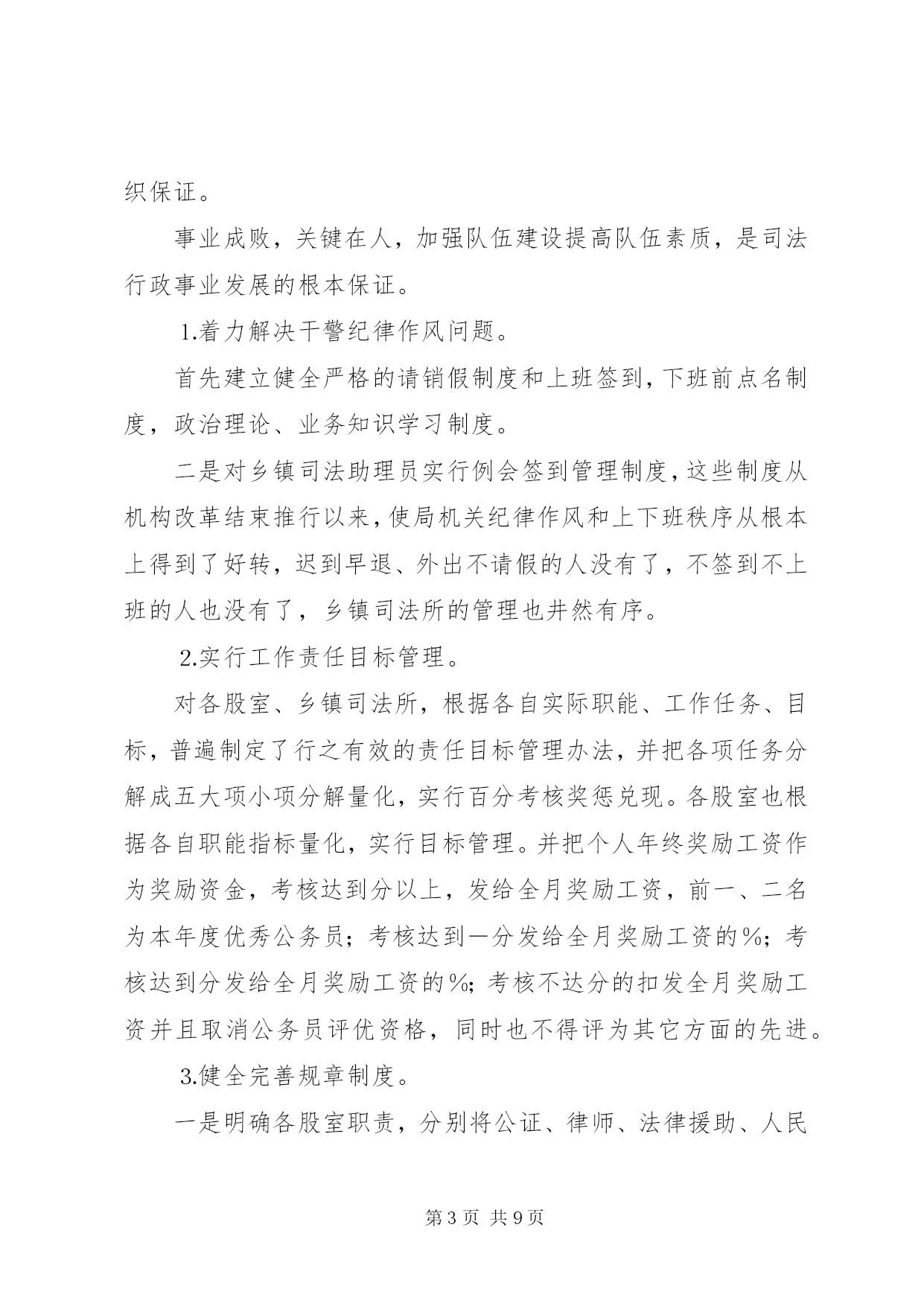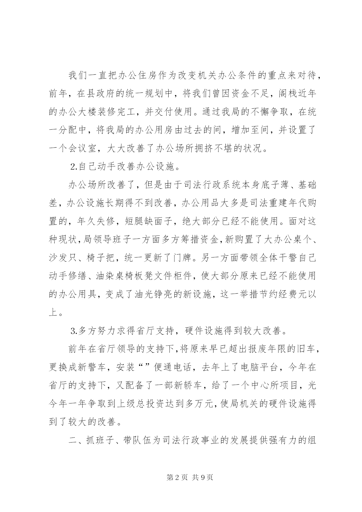第PAGE\*Arabic\*MERGEFORMAT9页共NUMPAGES\*MERGEFORMAT9页县司法局加强文明建设典型材料文明之花永绽司法工作常青×县司法局共有在编人员人,其中党员人。前年,在县政府的统一规划中,将我们曾因资金不足,阁栈近年的办公大楼装修完工,并交付使用,通过我局的不懈争取,在统一分配中,将我局的办公用房由过去的间,增加至间,并设置了一个会议室,大大改善了办公场所拥挤不堪的状况。××县司法局主要承担的业务工作有:法律宣传、法学教育、法律援助、人民调解、公证、律师、安置帮教、普法依法治理、行政执法检查。在这几项工作中,我们力争在咨询、代书、代理、公证、律师、顾问、法律援助、社会有偿服务方面有所突破,在取得较好的社会效益的同时,有相应的经济效益,以补充司法行政工作严重的资金不足,减轻财政负担,面对这脆弱的自然条件和经济基础,全局干警在局领导一班人的带领下,凭着无畏困苦甘于奉献,不辱使命开拓进取的坚定信念,在县委、政府的领导下,在省厅的关怀下,抓基础求发展,增活力见实效,夯实了基层司法行政工作基础,拓展了基层司法行政工作业务,打开了崭新的局面,收获了可喜的成绩,为新时代谱写了一曲文明之歌。一、艰苦奋斗,群策群力,改善基础设施建设,为开创司法行政工作新局面创造良好的工作环境。⒈政府支持办公场所得到了改善。我们一直把办公住房作为改变机关办公条件的重点来对待,前年,在县政府的统一规划中,将我们曾因资金不足,阁栈近年的办公大楼装修完工,并交付使用。通过我局的不懈争取,在统一分配中,将我局的办公用房由过去的间,增加至间,并设置了一个会议室,大大改善了办公场所拥挤不堪的状况。⒉自己动手改善办公设施。办公场所改善了,但是由于司法行政系统本身底子薄、基础差,办公设施长期得不到改善,办公用品大多是司法重建年代购置的,年久失修,短腿缺面子,绝大部分已经不能使用。面对这种现状,局领导班子一方面多方筹措资金,新购置了大办公桌个、沙发只、椅子把,统一更新了门牌。另一方面带领全体干警自己动手修缮、油染桌椅板凳文件柜件,使大部分原来已经不能使用的办公用具,变成了油光铮亮的新设施,这一举措节约经费元以上。⒊多方努力求得省厅支持,硬件设施得到较大改善。前年在省厅领导的支持下,将原来早已超出报废年限的旧车,更换成新警车,安装“”便通电话,去年上了电脑平台,今年在省厅的支持下,又配备了一部新轿车,给了一个中心所项目,光今年一年争取到上级总投资达到多万元,使局机关的硬件设施得到了较大的改善。二、抓班子、带队伍为司法行政事业的发展提供强有力的组织保证。事业成败,关键在人,加强队伍建设提高队伍素质,是司法行政事业发展的根本保证。⒈着力解决干警纪律作风问题。首先建立健全严格的请销假制度和上班签到,下班前点名制度,政治理论、业务知识学习制度。二是对乡镇司法助理员实行例会签到管理制度,这些制度从机构改革结束推行以来,使局机关纪律作风和上下班秩序从根本上得到了好转,迟到早退、外出不请假的人没有了,不签到不上班的人也没有了,乡镇司法所的管理也井然有序。⒉实行工作责任目标管理。对各股室、乡镇司法所,根据各自实际职能、工作任务、目标,普遍制定了行之有效的责任目标管理办法,并把各项任务分解成五大项小项分解量化,实行百分考核奖惩兑现。各股室也根据各自职能指标量化,实行目标管理。并把个人年终奖励工资作为奖励资金,考核达到分以上,发给全月奖励工资,前一、二名为本年度优秀公务员;考核达到-分发给全月奖励工资的%;考核达到分发给全月奖励工资的%;考核不达分的扣发全月奖励工资并且取消公务员评优资格,同时也不得评为其它方面的先进。⒊健全完善规章制度。一是明确各股室职责,分别将公证、律师、法律援助、人民调解、普法依法治理的余种目标职责、工作制度、办案程序装框上墙,以此起到督促作用。二是明确了党员“一课三会”制度、请销假制度、上下班签到制度、班前一小时学习制度、助理员例会制度、会议制度、财务管理制度、党风廉政建设等九项制度,进一步规范了全局干警言行。三是根据司法行政工作职能要求,完善了首访责任制、重大事件报告制、社会综合治理责任制、矛盾纠纷排查调处工作制、年度评查制、错案追究制、信访接待制、政治业务学习等八种制度,以此保证各项工作的顺利进行。⒋规范管理,健档立案,完善各项工作资料。春节过后,我们本着早行动早部署,于元月日召开了司法行政工作会议,对全年工作进行了具体安排部署,并与各司法所、股室签订了目标管理责任状,统一了十二个司法所的文书格式、办案程序、卷宗管理,要求各司法所各种组织领导机构目标任务、工作制度有条件的要制作图版,条件差的也要有墙报,上墙公示,并做到图、版、表、册相一致。二是各种业务活动都要建立完整的文字资料,并归档管理,以此来体现、总结各项工作