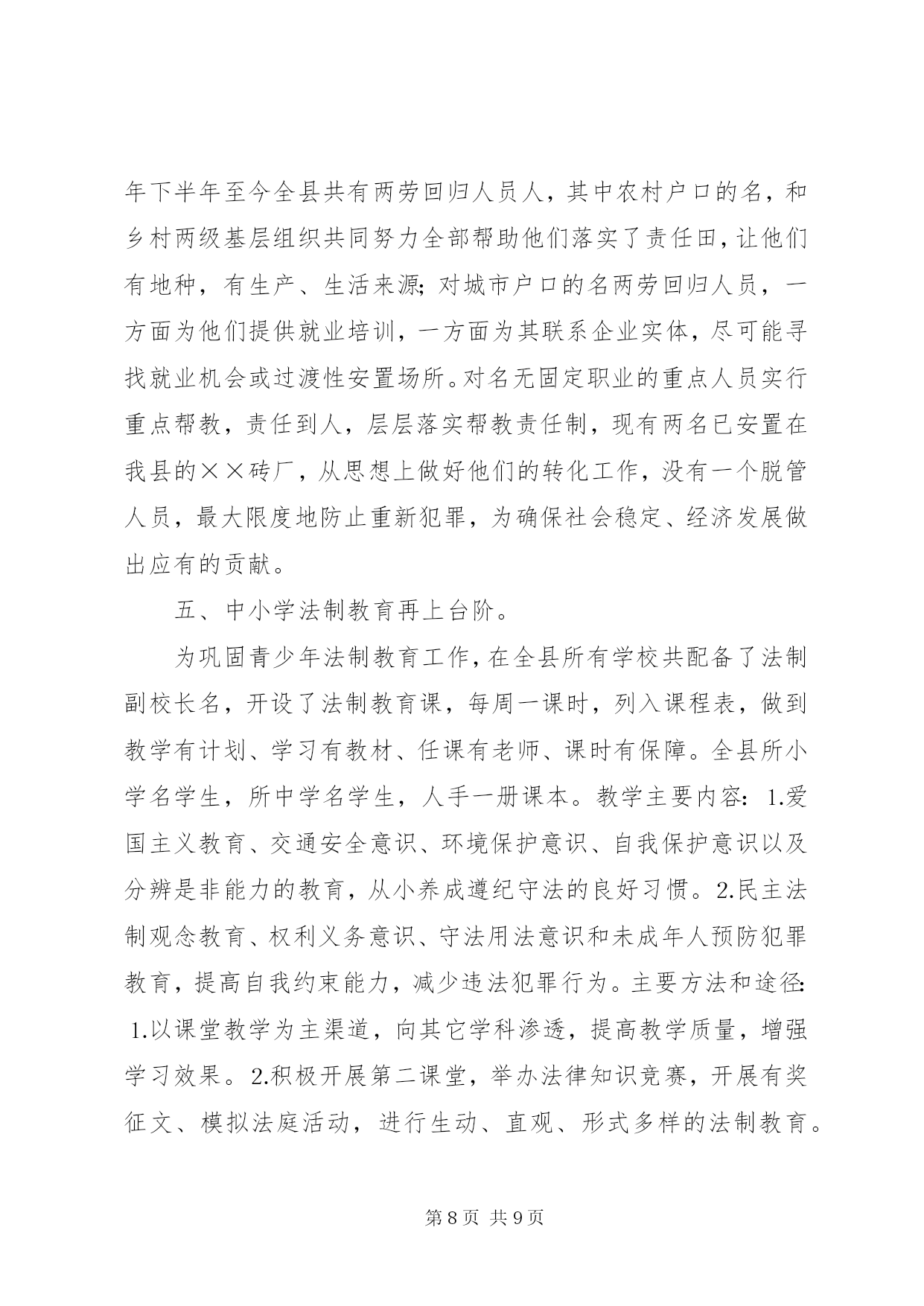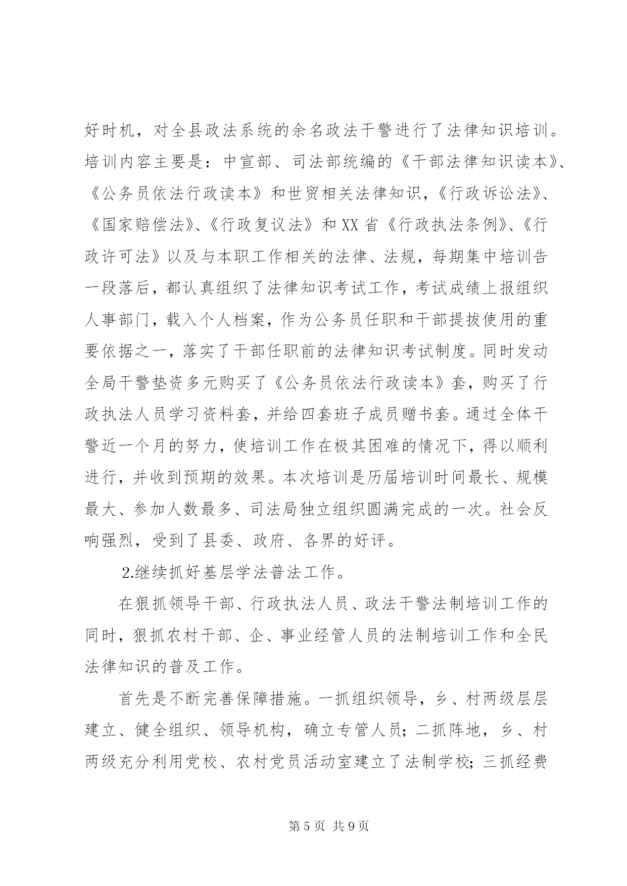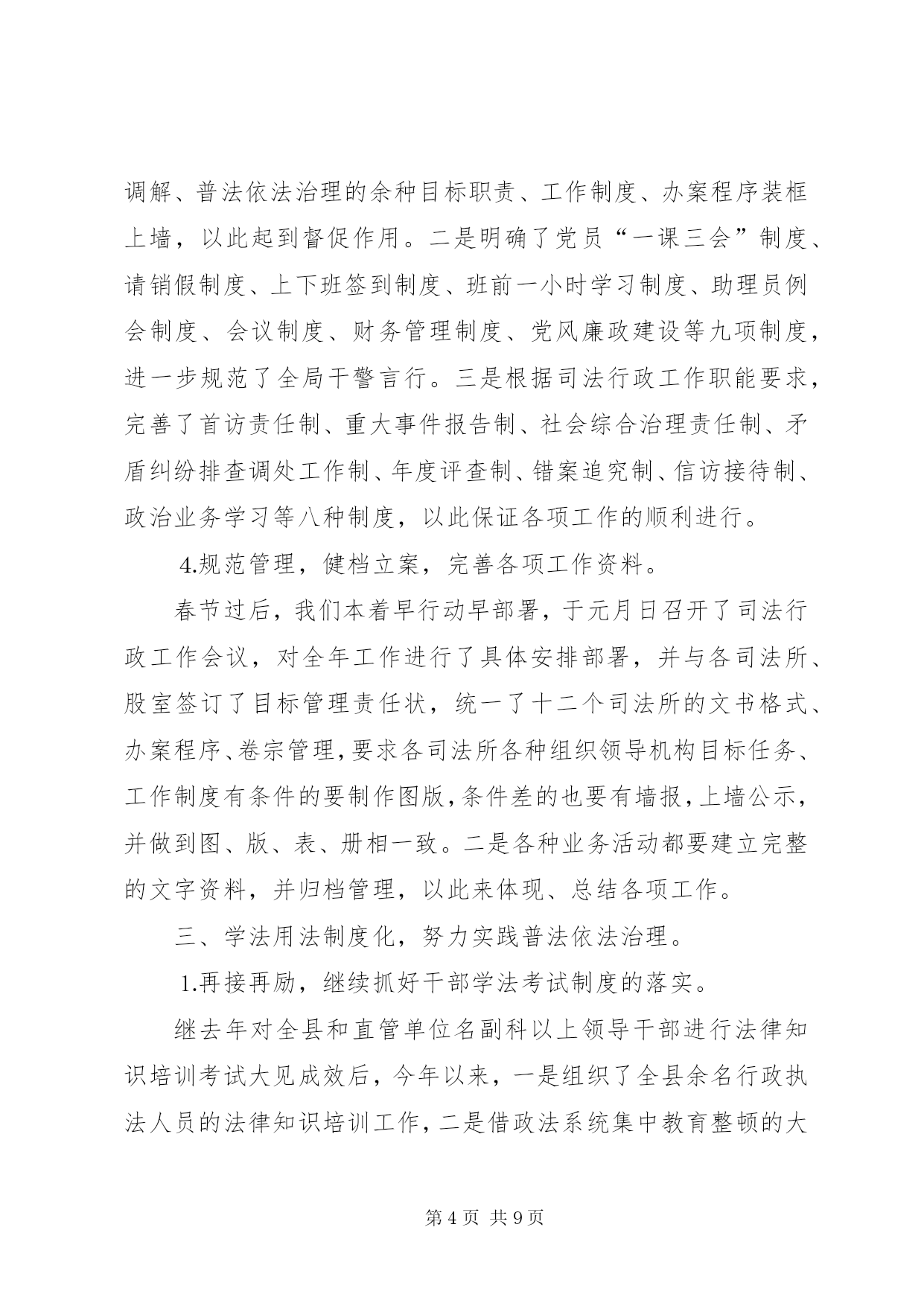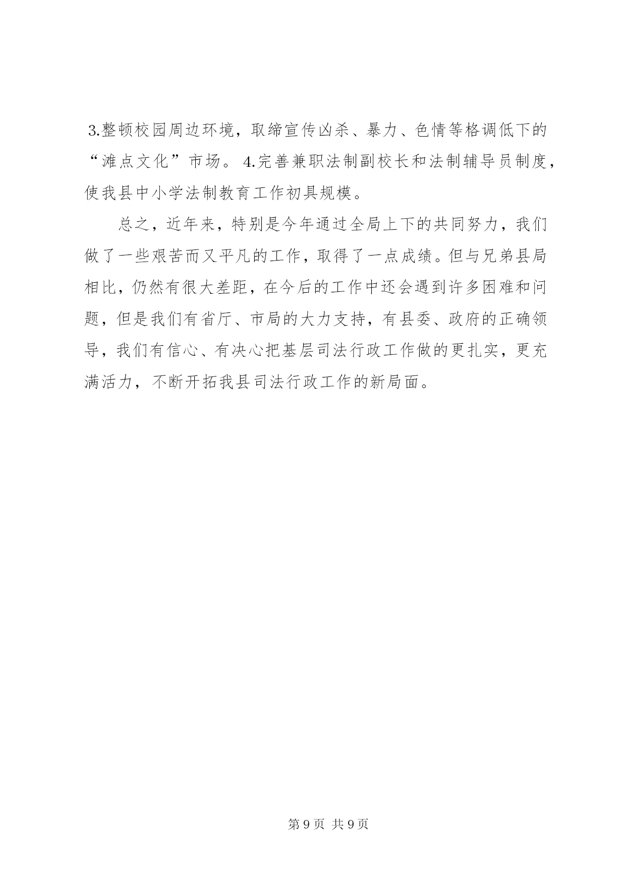 第PAGE\*Arabic\*MERGEFORMAT9页共NUMPAGES\*MERGEFORMAT9页县司法局加强文明建设典型材料文明之花永绽司法工作常青×县司法局共有在编人员人,其中党员人。前年,在县政府的统一规划中,将我们曾因资金不足,阁栈近年的办公大楼装修完工,并交付使用,通过我局的不懈争取,在统一分配中,将我局的办公用房由过去的间,增加至间,并设置了一个会议室,大大改善了办公场所拥挤不堪的状况。××县司法局主要承担的业务工作有:法律宣传、法学教育、法律援助、人民调解、公证、律师、安置帮教、普法依法治理、行政执法检查。在这几项工作中,我们力争在咨询、代书、代理、公证、律师、顾问、法律援助、社会有偿服务方面有所突破,在取得较好的社会效益的同时,有相应的经济效益,以补充司法行政工作严重的资金不足,减轻财政负担,面对这脆弱的自然条件和经济基础,全局干警在局领导一班人的带领下,凭着无畏困苦甘于奉献,不辱使命开拓进取的坚定信念,在县委、政府的领导下,在省厅的关怀下,抓基础求发展,增活力见实效,夯实了基层司法行政工作基础,拓展了基层司法行政工作业务,打开了崭新的局面,收获了可喜的成绩,为新时代谱写了一曲文明之歌。一、艰苦奋斗,群策群力,改善基础设施建设,为开创司法行政工作新局面创造良好的工作环境。⒈政府支持办公场所得到了改善。我们一直把办公住房作为改变机关办公条件的重点来对待,前年,在县政府的统一规划中,将我们曾因资金不足,阁栈近年的办公大楼装修完工,并交付使用。通过我局的不懈争取,在统一分配中,将我局的办公用房由过去的间,增加至间,并设置了一个会议室,大大改善了办公场所拥挤不堪的状况。⒉自己动手改善办公设施。办公场所改善了,但是由于司法行政系统本身底子薄、基础差,办公设施长期得不到改善,办公用品大多是司法重建年代购置的,年久失修,短腿缺面子,绝大部分已经不能使用。面对这种现状,局领导班子一方面多方筹措资金,新购置了大办公桌个、沙发只、椅子把,统一更新了门牌。另一方面带领全体干警自己动手修缮、油染桌椅板凳文件柜件,使大部分原来已经不能使用的办公用具,变成了油光铮亮的新设施,这一举措节约经费元以上。⒊多方努力求得省厅支持,硬件设施得到较大改善。前年在省厅领导的支持下,将原来早已超出报废年限的旧车,更换成新警车,安装“”便通电话,去年上了电脑平台,今年在省厅的支持下,又配备了一部新轿车,给了一个中心所项目,光今年一年争取到上级总投资达到多万元,使局机关的硬件设施得到了较大的改善。二、抓班子、带队伍为司法行政事业的发展提供强有力的组织保证。事业成败,关键在人,加强队伍建设提高队伍素质,是司法行政事业发展的根本保证。⒈着力解决干警纪律作风问题。首先建立健全严格的请销假制度和上班签到,下班前点名制度,政治理论、业务知识学习制度。二是对乡镇司法助理员实行例会签到管理制度,这些制度从机构改革结束推行以来,使局机关纪律作风和上下班秩序从根本上得到了好转,迟到早退、外出不请假的人没有了,不签到不上班的人也没有了,乡镇司法所的管理也井然有序。⒉实行工作责任目标管理。对各股室、乡镇司法所,根据各自实际职能、工作任务、目标,普遍制定了行之有效的责任目标管理办法,并把各项任务分解成五大项小项分解量化,实行百分考核奖惩兑现。各股室也根据各自职能指标量化,实行目标管理。并把个人年终奖励工资作为奖励资金,考核达到分以上,发给全月奖励工资,前一、二名为本年度优秀公务员;考核达到-分发给全月奖励工资的%;考核达到分发给全月奖励工资的%;考核不达分的扣发全月奖励工资并且取消公务员评优资格,同时也不得评为其它方面的先进。⒊健全完善规章制度。一是明确各股室职责,分别将公证、律师、法律援助、人民调解、普法依法治理的余种目标职责、工作制度、办案程序装框上墙,以此起到督促作用。二是明确了党员“一课三会”制度、请销假制度、上下班签到制度、班前一小时学习制度、助理员例会制度、会议制度、财务管理制度、党风廉政建设等九项制度,进一步规范了全局干警言行。三是根据司法行政工作职能要求,完善了首访责任制、重大事件报告制、社会综合治理责任制、矛盾纠纷排查调处工作制、年度评查制、错案追究制、信访接待制、政治业务学习等八种制度,以此保证各项工作的顺利进行。⒋规范管理,健档立案,完善各项工作资料。春节过后,我们本着早行动早部署,于元月日召开了司法行政工作会议,对全年工作进行了具体安排部署,并与各司法所、股室签订了目标管理责任状,统一了十二个司法所的文书格式、办案程序、卷宗管理,要求各司法所各种组织领导机构目标任务、工作制度有条件的要制作图版,条件差的也要有墙报,上墙公示,并做到图、版、表、册相一致。二是各种业务活动都要建立完整的文字资料,并归档管理,以此来体现、总结各项工作