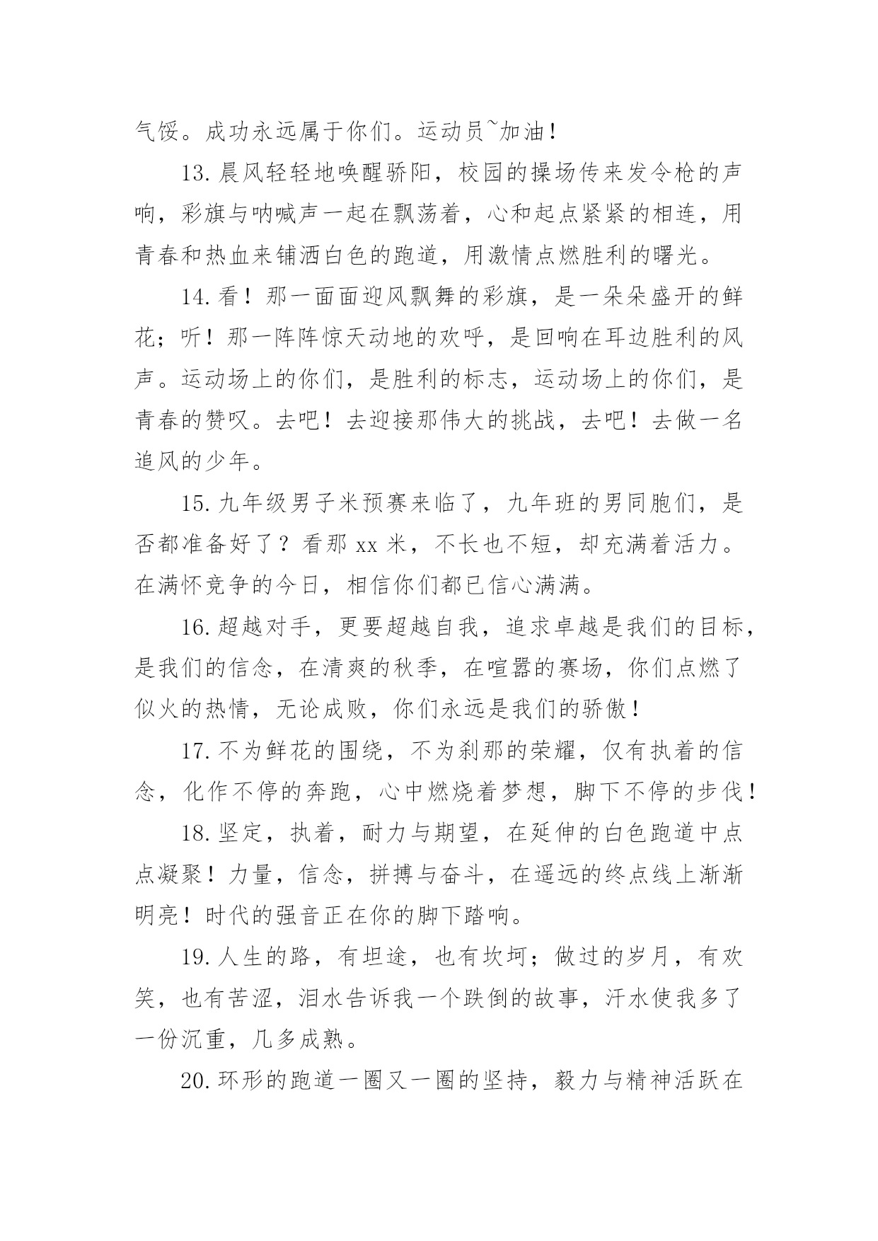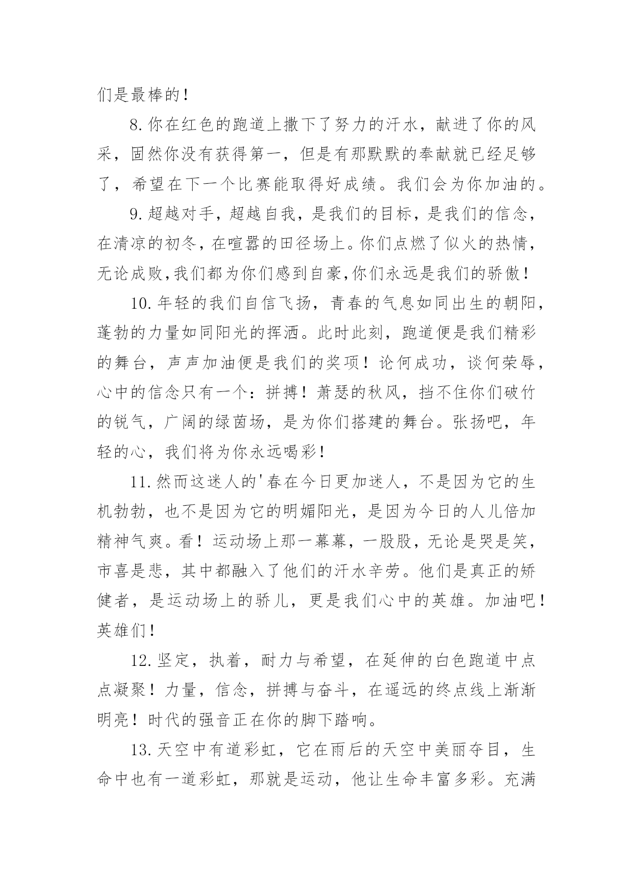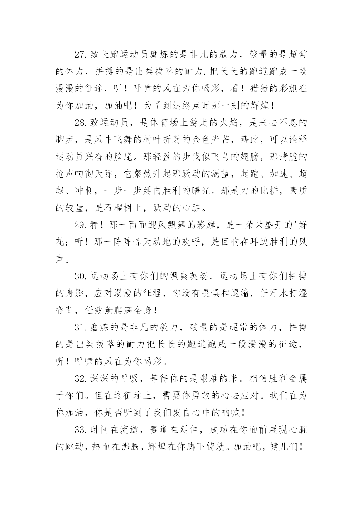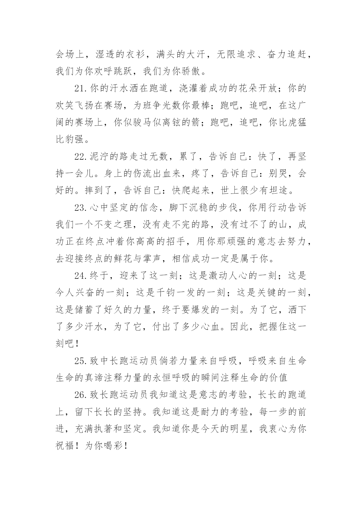 运动会加油稿运动会加油稿[必备]在现在社会,能够利用到加油稿的场合越来越多,加油稿可以强化人们的自我认知,给予人正向的激励作用。相信许多人会觉得加油稿很难写吧,下面是小编精心整理的运动会加油稿,希望能够帮助到大家。运动会加油稿11.泰戈尔在诗中说,天空没有翅膀的影子,但我已飞过;艾青对朋友说,也许有人到达不了彼岸,但我们共同拥有大海。也许你们没有显赫的成绩,但运动场上留下了你们的足迹。也许你们没有奖品,但我们心中留下了你们拼搏的身影。所有的努力都是为了迎接这一刹那,所有的拼搏都是为了这一声令下。2.赞三千米坚持者:漫漫长路,你愿一人独撑,忍受着孤独与寂寞,承受着体力与精神的压迫,只任汗水溶于泪水,可脚步却从不停歇。好样的,纵然得不了桂冠,可坚持的你,定会赢得最后的掌声。3.看台上,千百只眼睛充满希望的望着你。人生拼搏的机会能有几何?把握机会,一定成功!4.马上就要进行高一女子400米预赛了,伍月莹,黄海花加油!希望你们在赛场上能够赛出自己的风采,没有你们的拼搏奋进,就没有赛场上的即激烈,呐喊声,加油!你们永远是最棒的想雄鹰展翅一般,勇向终点,我们等着你的加油!5.昨天的辉煌与失败已成为过去,今天又是一个崭新的看似是,高二(xx)班的同学们,你们个个朝气蓬勃,英姿煞爽,加油!让我们一齐偶写出关于青春青春的赞歌,展示青春的活力和风采!许一个美好的心愿,祝你快乐连连没送一份美妙的感觉祝万事圆圆,写一句股东的话语,祝你胜利!6.踏上跑道,是一种选择。离开起点,是一种勇气。驰骋赛场,是一种胜利。7.看,终点就在眼前;听,同学为你呼喊。鼓起勇气奋力向前,用你的荣誉带给我们希望。8.运动健将们,用你的实力,用你的精神,去开拓出,一片属于你的长跑天地!9.不为掌声的注释,不为刻意的征服,不为失败的痛苦,只有辛勤的汗水,化作成功的脚步!10.不为鲜花的围绕,不为刹那的荣耀,只有执着的信念,化作不停的奔跑,心中燃烧着梦想,脚下不停的步伐!11.1500米既是对你实力的考验,又是对你耐力的考察,经过1500米之后,及将变得更强,xx,我们的xx,我们的开心过,向前冲吧!1500米虽漫长。但我们的情谊更长,xx加油!12.今天的你们英姿飒爽,今天的你们朝气蓬勃,今天的你们一马当先。相信自己,你是最棒的!不要放弃,不要气馁。成功永远属于你们。运动员~加油!13.晨风轻轻地唤醒骄阳,校园的操场传来发令枪的声响,彩旗与呐喊声一起在飘荡着,心和起点紧紧的相连,用青春和热血来铺洒白色的跑道,用激情点燃胜利的曙光。14.看!那一面面迎风飘舞的彩旗,是一朵朵盛开的鲜花;听!那一阵阵惊天动地的欢呼,是回响在耳边胜利的风声。运动场上的你们,是胜利的标志,运动场上的你们,是青春的赞叹。去吧!去迎接那伟大的挑战,去吧!去做一名追风的少年。15.九年级男子米预赛来临了,九年班的男同胞们,是否都准备好了?看那xx米,不长也不短,却充满着活力。在满怀竞争的今日,相信你们都已信心满满。16.超越对手,更要超越自我,追求卓越是我们的目标,是我们的信念,在清爽的秋季,在喧嚣的赛场,你们点燃了似火的热情,无论成败,你们永远是我们的骄傲!17.不为鲜花的围绕,不为刹那的荣耀,仅有执着的信念,化作不停的奔跑,心中燃烧着梦想,脚下不停的步伐!18.坚定,执着,耐力与期望,在延伸的白色跑道中点点凝聚!力量,信念,拼搏与奋斗,在遥远的终点线上渐渐明亮!时代的强音正在你的脚下踏响。19.人生的路,有坦途,也有坎坷;做过的岁月,有欢笑,也有苦涩,泪水告诉我一个跌倒的故事,汗水使我多了一份沉重,几多成熟。20.环形的跑道一圈又一圈的坚持,毅力与精神活跃在会场上,湿透的衣衫,满头的大汗,无限追求、奋力追赶,我们为你欢呼跳跃,我们为你骄傲。21.你的汗水洒在跑道,浇灌着成功的花朵开放;你的欢笑飞扬在赛场,为班争光数你最棒;跑吧,追吧,在这广阔的赛场上,你似骏马似离铉的箭;跑吧,追吧,你比虎猛比豹强。22.泥泞的路走过无数,累了,告诉自己:快了,再坚持一会儿。身上的伤流出血来,疼了,告诉自己:别哭,会好的。摔到了,告诉自己:快爬起来,世上很少有坦途。23.心中坚定的信念,脚下沉稳的步伐,你用行动告诉我们一个不变之理,没有走不完的路,没有过不了的山,成功正在终点冲着你高高的招手,用你那顽强的意志去努力,去迎接终点的鲜花与掌声,相信成功一定是属于你。24.终于,迎来了这一刻;这是激动人心的一刻;这是今人兴奋的一刻;这是千钧一发的一刻;这是关键的一刻,这是储蓄了好久的力量,终于要爆发的一刻。为了它,洒下了多少汗水,为了它,付出了多少心血。因此,把握住这一刻吧!25.致中长跑运动员倘若力量来自呼吸,呼吸来自生命生命的真谛注释力量的永恒呼吸的瞬间注释生命的价值26.致长跑运动员我知道这是意志的考验,长长的跑道上,
