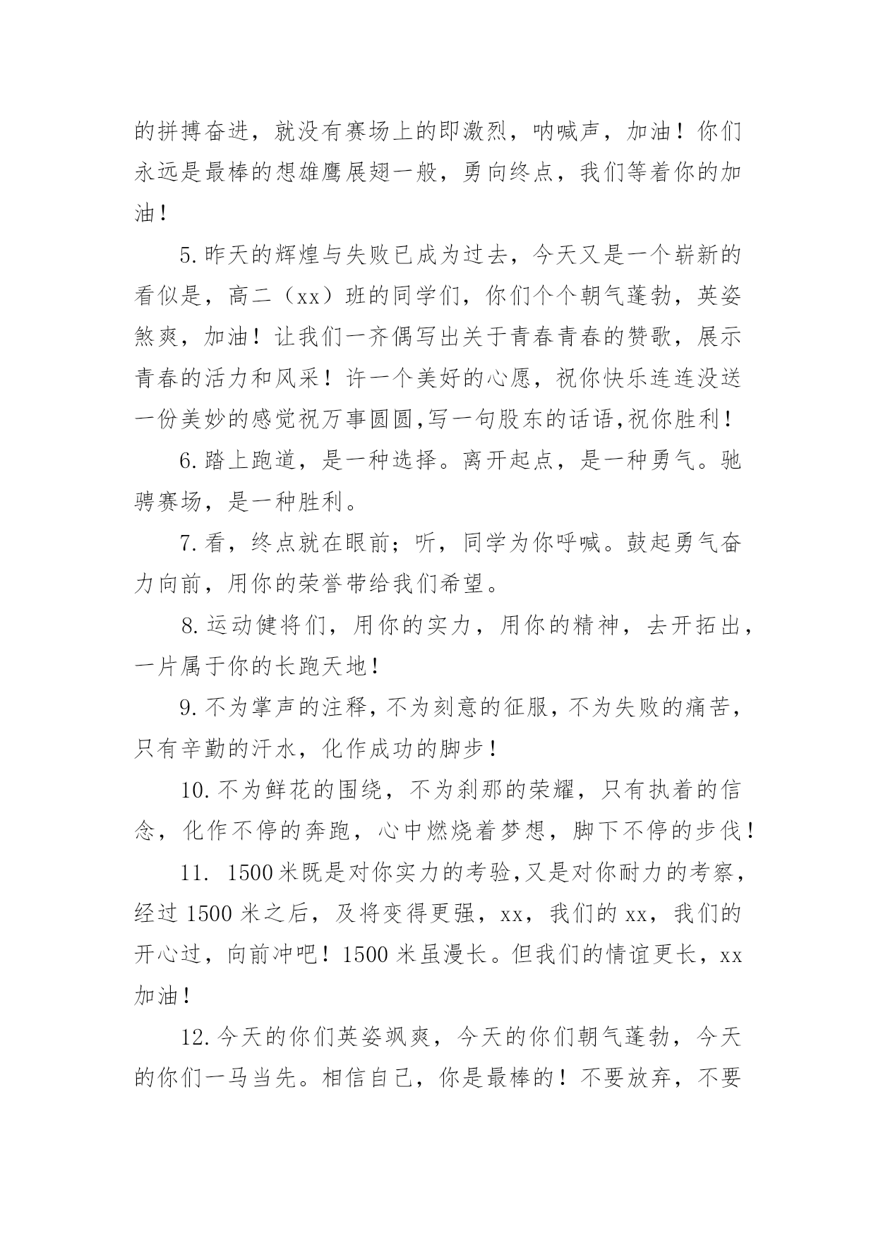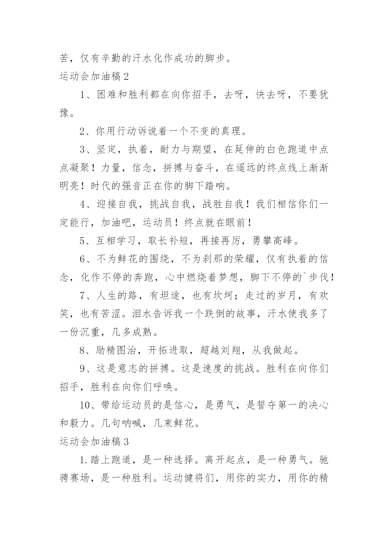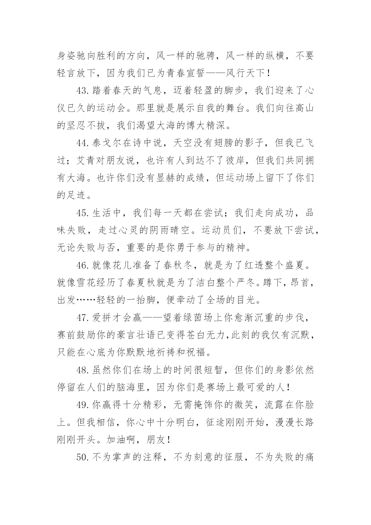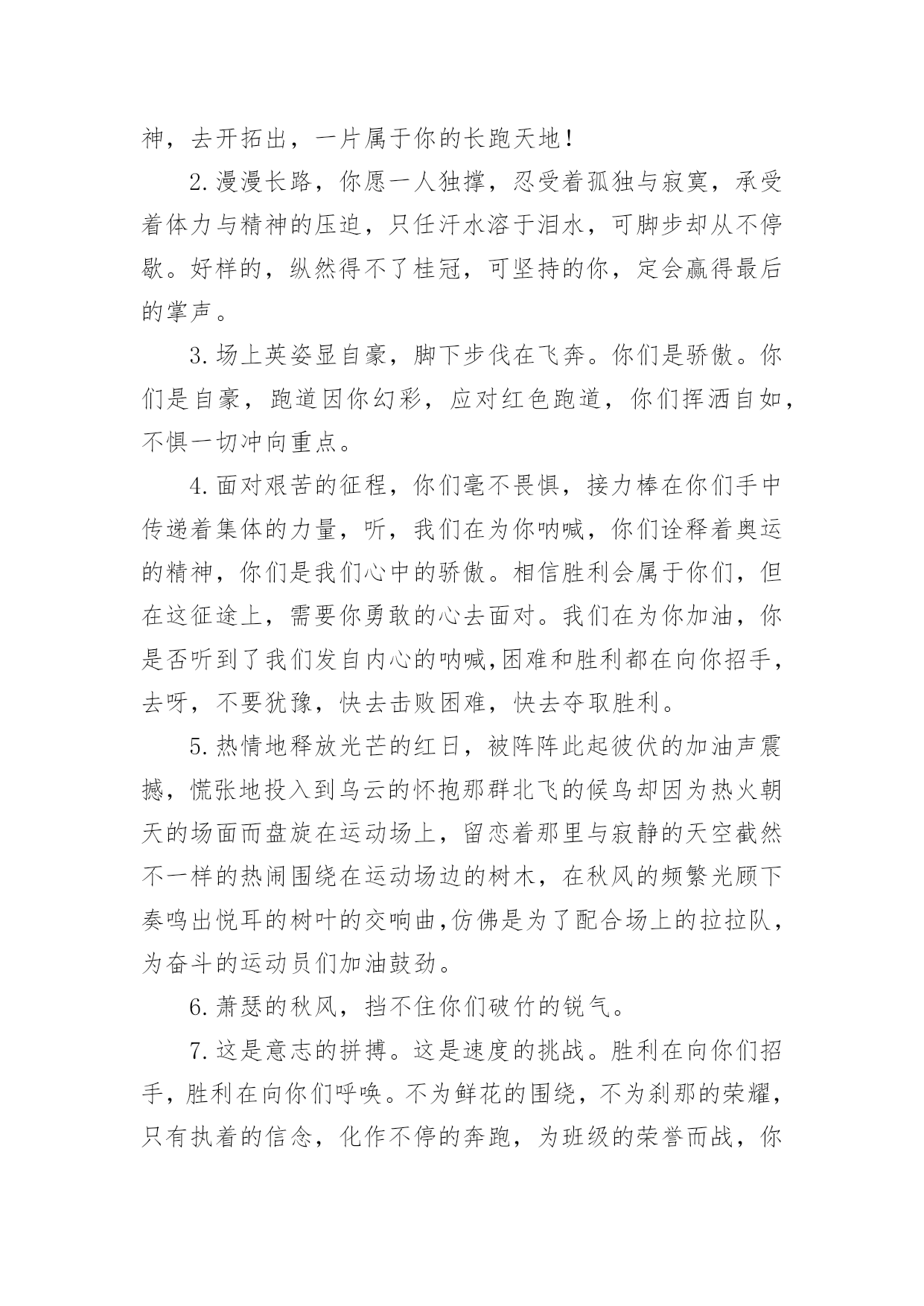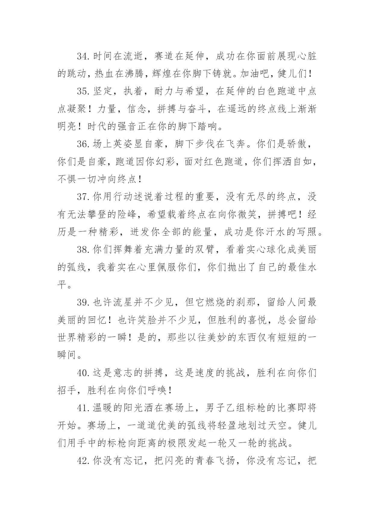 运动会加油稿运动会加油稿[必备]在现在社会,能够利用到加油稿的场合越来越多,加油稿可以强化人们的自我认知,给予人正向的激励作用。相信许多人会觉得加油稿很难写吧,下面是小编精心整理的运动会加油稿,希望能够帮助到大家。运动会加油稿11.泰戈尔在诗中说,天空没有翅膀的影子,但我已飞过;艾青对朋友说,也许有人到达不了彼岸,但我们共同拥有大海。也许你们没有显赫的成绩,但运动场上留下了你们的足迹。也许你们没有奖品,但我们心中留下了你们拼搏的身影。所有的努力都是为了迎接这一刹那,所有的拼搏都是为了这一声令下。2.赞三千米坚持者:漫漫长路,你愿一人独撑,忍受着孤独与寂寞,承受着体力与精神的压迫,只任汗水溶于泪水,可脚步却从不停歇。好样的,纵然得不了桂冠,可坚持的你,定会赢得最后的掌声。3.看台上,千百只眼睛充满希望的望着你。人生拼搏的机会能有几何?把握机会,一定成功!4.马上就要进行高一女子400米预赛了,伍月莹,黄海花加油!希望你们在赛场上能够赛出自己的风采,没有你们的拼搏奋进,就没有赛场上的即激烈,呐喊声,加油!你们永远是最棒的想雄鹰展翅一般,勇向终点,我们等着你的加油!5.昨天的辉煌与失败已成为过去,今天又是一个崭新的看似是,高二(xx)班的同学们,你们个个朝气蓬勃,英姿煞爽,加油!让我们一齐偶写出关于青春青春的赞歌,展示青春的活力和风采!许一个美好的心愿,祝你快乐连连没送一份美妙的感觉祝万事圆圆,写一句股东的话语,祝你胜利!6.踏上跑道,是一种选择。离开起点,是一种勇气。驰骋赛场,是一种胜利。7.看,终点就在眼前;听,同学为你呼喊。鼓起勇气奋力向前,用你的荣誉带给我们希望。8.运动健将们,用你的实力,用你的精神,去开拓出,一片属于你的长跑天地!9.不为掌声的注释,不为刻意的征服,不为失败的痛苦,只有辛勤的汗水,化作成功的脚步!10.不为鲜花的围绕,不为刹那的荣耀,只有执着的信念,化作不停的奔跑,心中燃烧着梦想,脚下不停的步伐!11.1500米既是对你实力的考验,又是对你耐力的考察,经过1500米之后,及将变得更强,xx,我们的xx,我们的开心过,向前冲吧!1500米虽漫长。但我们的情谊更长,xx加油!12.今天的你们英姿飒爽,今天的你们朝气蓬勃,今天的你们一马当先。相信自己,你是最棒的!不要放弃,不要气馁。成功永远属于你们。运动员~加油!13.晨风轻轻地唤醒骄阳,校园的操场传来发令枪的声响,彩旗与呐喊声一起在飘荡着,心和起点紧紧的相连,用青春和热血来铺洒白色的跑道,用激情点燃胜利的曙光。14.看!那一面面迎风飘舞的彩旗,是一朵朵盛开的鲜花;听!那一阵阵惊天动地的欢呼,是回响在耳边胜利的风声。运动场上的你们,是胜利的标志,运动场上的你们,是青春的赞叹。去吧!去迎接那伟大的挑战,去吧!去做一名追风的少年。15.九年级男子米预赛来临了,九年班的男同胞们,是否都准备好了?看那xx米,不长也不短,却充满着活力。在满怀竞争的今日,相信你们都已信心满满。16.超越对手,更要超越自我,追求卓越是我们的目标,是我们的信念,在清爽的秋季,在喧嚣的赛场,你们点燃了似火的热情,无论成败,你们永远是我们的骄傲!17.不为鲜花的围绕,不为刹那的荣耀,仅有执着的信念,化作不停的奔跑,心中燃烧着梦想,脚下不停的步伐!18.坚定,执着,耐力与期望,在延伸的白色跑道中点点凝聚!力量,信念,拼搏与奋斗,在遥远的终点线上渐渐明亮!时代的强音正在你的脚下踏响。19.人生的路,有坦途,也有坎坷;做过的岁月,有欢笑,也有苦涩,泪水告诉我一个跌倒的故事,汗水使我多了一份沉重,几多成熟。20.环形的跑道一圈又一圈的坚持,毅力与精神活跃在会场上,湿透的衣衫,满头的大汗,无限追求、奋力追赶,我们为你欢呼跳跃,我们为你骄傲。21.你的汗水洒在跑道,浇灌着成功的花朵开放;你的欢笑飞扬在赛场,为班争光数你最棒;跑吧,追吧,在这广阔的赛场上,你似骏马似离铉的箭;跑吧,追吧,你比虎猛比豹强。22.泥泞的路走过无数,累了,告诉自己:快了,再坚持一会儿。身上的伤流出血来,疼了,告诉自己:别哭,会好的。摔到了,告诉自己:快爬起来,世上很少有坦途。23.心中坚定的信念,脚下沉稳的步伐,你用行动告诉我们一个不变之理,没有走不完的路,没有过不了的山,成功正在终点冲着你高高的招手,用你那顽强的意志去努力,去迎接终点的鲜花与掌声,相信成功一定是属于你。24.终于,迎来了这一刻;这是激动人心的一刻;这是今人兴奋的一刻;这是千钧一发的一刻;这是关键的一刻,这是储蓄了好久的力量,终于要爆发的一刻。为了它,洒下了多少汗水,为了它,付出了多少心血。因此,把握住这一刻吧!25.致中长跑运动员倘若力量来自呼吸,呼吸来自生命生命的真谛注释力量的永恒呼吸的瞬间注释生命的价值26.致长跑运动员我知道这是意志的考验,长长的跑道上,