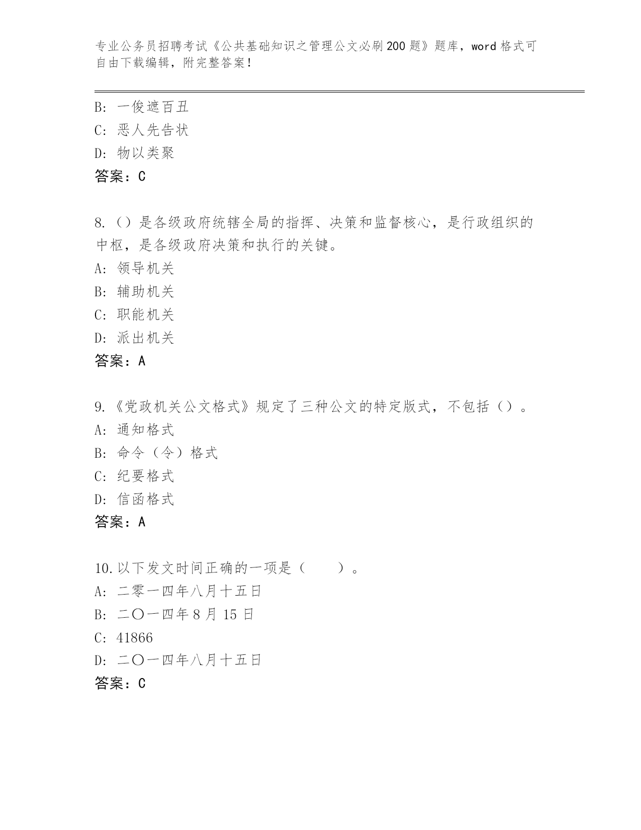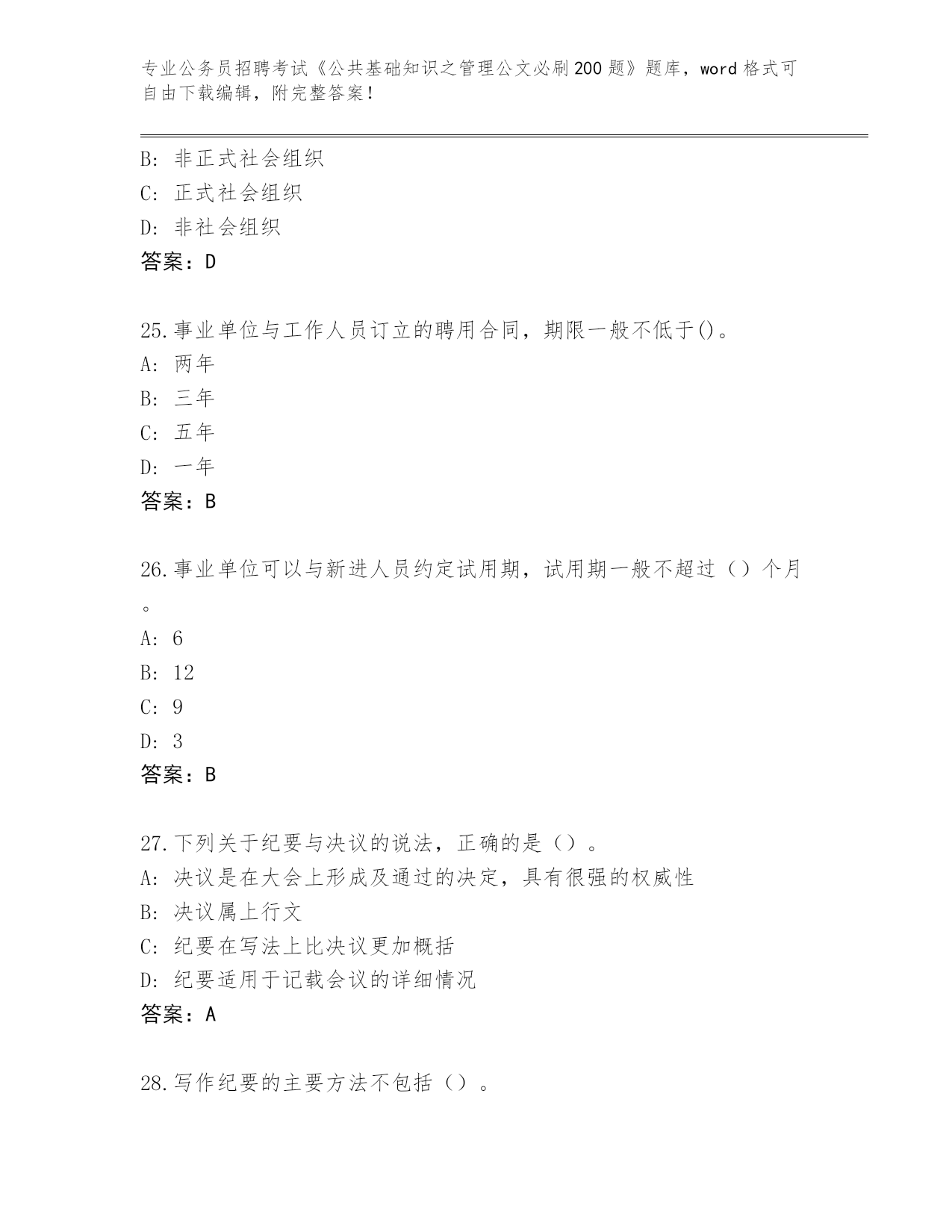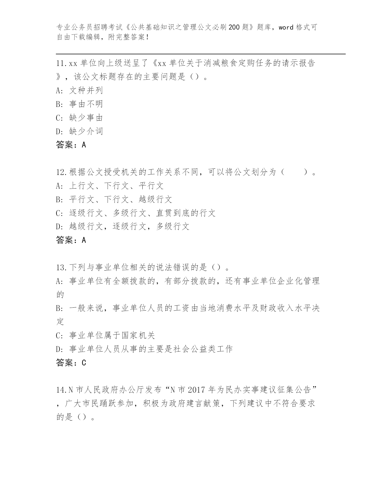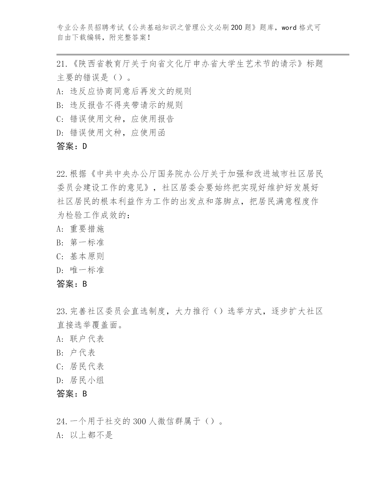 江苏省2024年公务员招聘考试《公共基础知识之管理公文必刷200题》完整题库含答案(A卷)