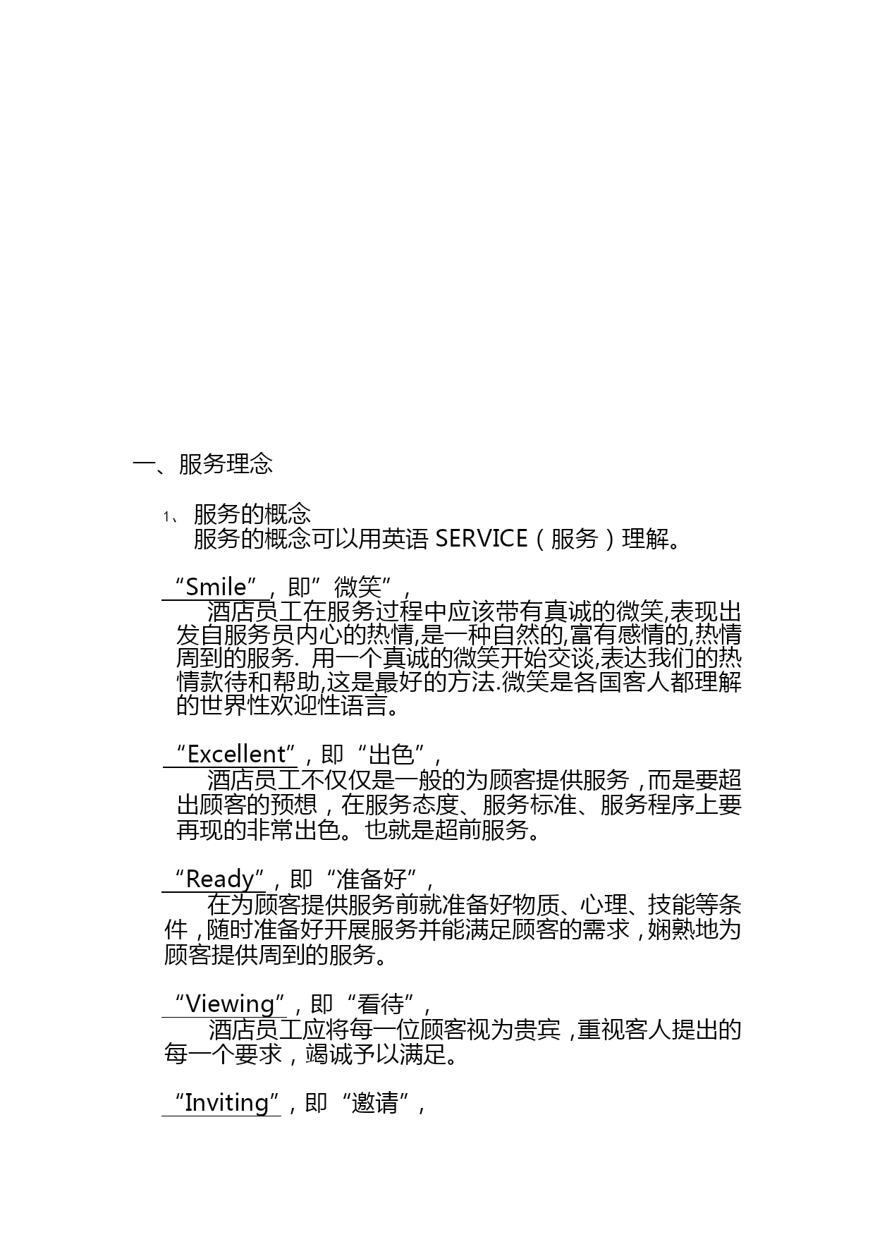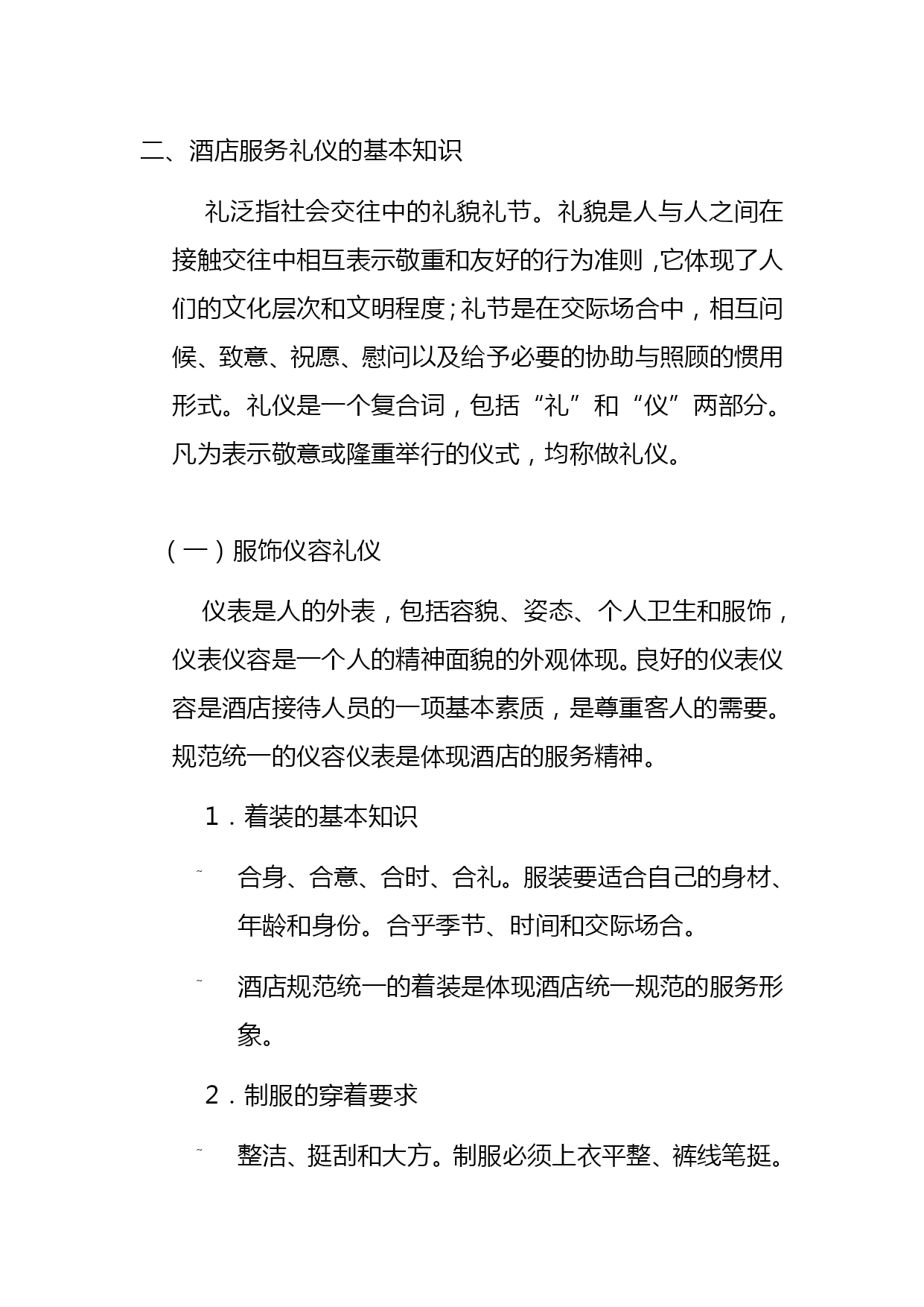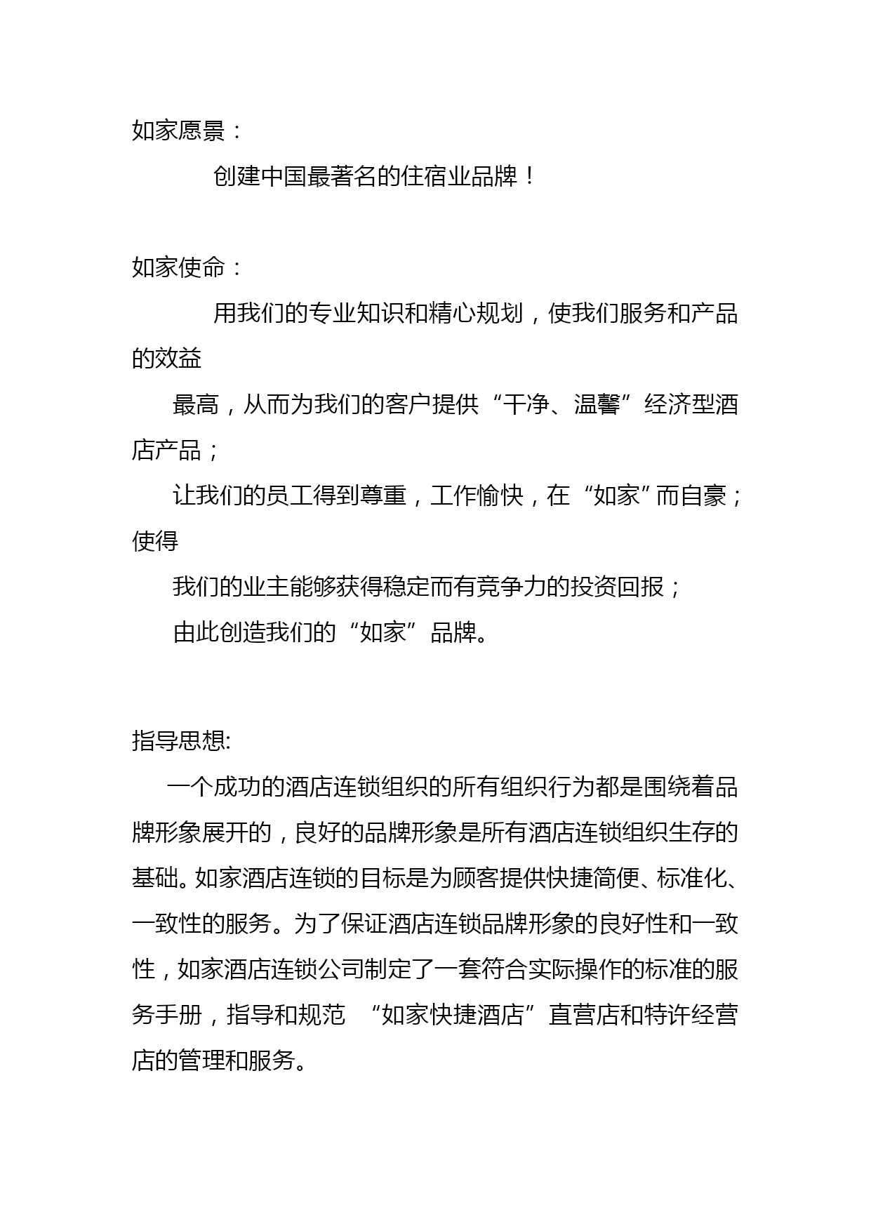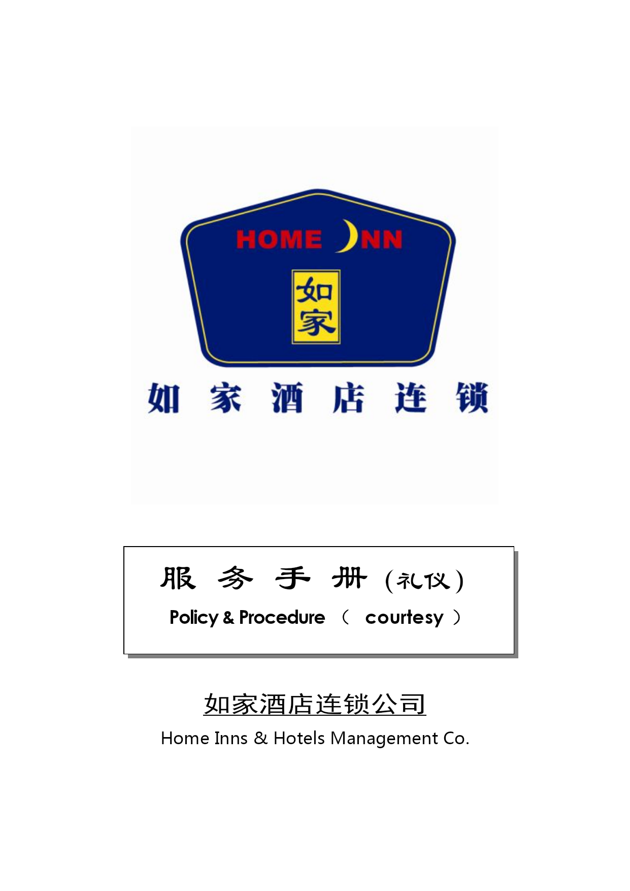 如家酒店连锁礼仪培训手册汇编(完整版)资料(可以直接使用,可编辑优秀版资料,欢迎下载)服务手册(礼仪)Policy&Procedure(courtesy)如家酒店连锁公司HomeInns&HotelsManagementCo.如家愿景:创建中国最著名的住宿业品牌!如家使命:用我们的专业知识和精心规划,使我们服务和产品的效益最高,从而为我们的客户提供“干净、温馨”经济型酒店产品;让我们的员工得到尊重,工作愉快,在“如家”而自豪;使得我们的业主能够获得稳定而有竞争力的投资回报;由此创造我们的“如家”品牌。指导思想:一个成功的酒店连锁组织的所有组织行为都是围绕着品牌形象展开的,良好的品牌形象是所有酒店连锁组织生存的基础。如家酒店连锁的目标是为顾客提供快捷简便、标准化、一致性的服务。为了保证酒店连锁品牌形象的良好性和一致性,如家酒店连锁公司制定了一套符合实际操作的标准的服务手册,指导和规范“如家快捷酒店”直营店和特许经营店的管理和服务。目录一、酒店服务理念………………………………………P.4二、酒店服务礼仪基本知识…………………………………P.6三、如家酒店接待服务礼仪……………………………………P.11四、如家酒店服务规范“十要、十不要”……………………P.19一、服务理念服务的概念服务的概念可以用英语SERVICE(服务)理解。“Smile”,即”微笑”,酒店员工在服务过程中应该带有真诚的微笑,表现出发自服务员内心的热情,是一种自然的,富有感情的,热情周到的服务.用一个真诚的微笑开始交谈,表达我们的热情款待和帮助,这是最好的方法.微笑是各国客人都理解的世界性欢迎性语言。“Excellent”,即“出色”,酒店员工不仅仅是一般的为顾客提供服务,而是要超出顾客的预想,在服务态度、服务标准、服务程序上要再现的非常出色。也就是超前服务。“Ready”,即“准备好”,在为顾客提供服务前就准备好物质、心理、技能等条件,随时准备好开展服务并能满足顾客的需求,娴熟地为顾客提供周到的服务。“Viewing”,即“看待”,酒店员工应将每一位顾客视为贵宾,重视客人提出的每一个要求,竭诚予以满足。“Inviting”,即“邀请”,酒店员工在每一位顾客接受了一次完整的服务后,都应当礼貌地向顾客发出“欢迎再次光临”的邀请,或者向客人主动推荐酒店的服务项目,邀请顾客在酒店享受更多的服务项目。“Creating”,即“创造”,酒店员工在为顾客提供服务的过程中,除了遵守既定的服务程序外,还应当发挥自己的主观能动性,针对顾客的特点和顾客的需求,创造性地满足顾客,为顾客营造一个舒适愉快的氛围。“Eye”,即“眼光”,酒店员工在服务过程中,应当注意自己眼睛的神态和指向,不应当漫无目的、左顾右盼,而应当随时注视顾客,预测顾客需求,及时提供有效的服务,让顾客感觉到酒店员工对自己的关注和重视。2、优质服务的10把金钥匙:一流的服务员,一流的服务标准。微笑。客人至上的信条,给予顾客宾至如归的感受。热情、快速、准确的服务。干净、温馨的客房,怡人的环境。真诚、诚实和友好。注重仪表和行为举止。具有团队精神和沟通能力。用尊称来问候客人。熟悉自己的工作、熟悉酒店、熟悉有关信息。3、优质服务的三个步骤真挚热诚的问好。尽可能用姓氏称呼客人。照顾客人所需,应做好充分准备,并须遵从客人意愿办事。欢欣的道别。跟客人亲切地说再见,尽可能用姓氏称呼客人。4、服务准则简——工作程序尽量简化,工作指令尽可能简单明了,意见反馈要做到简明扼要;便——要让客人从进店到离店,处处感受到方便;快——客人的需求要以最快的速度得到满足;捷——服务反应敏捷,对客人的言谈举止能灵敏迅捷地理解并作出服务行动好——客人接受服务后,要有“物”超所值的感受。5、温馨服务——“十五规范(10.5FL)”在距离客人10步时,用目光关注客人。在距离客人5步时,向客人问候。与客人接触时,第一句话永远是你说的。与客人交流后,最后一句话永远是你讲的。二、酒店服务礼仪的基本知识礼泛指社会交往中的礼貌礼节。礼貌是人与人之间在接触交往中相互表示敬重和友好的行为准则,它体现了人们的文化层次和文明程度;礼节是在交际场合中,相互问候、致意、祝愿、慰问以及给予必要的协助与照顾的惯用形式。礼仪是一个复合词,包括“礼”和“仪”两部分。凡为表示敬意或隆重举行的仪式,均称做礼仪。(一)服饰仪容礼仪仪表是人的外表,包括容貌、姿态、个人卫生和服饰,仪表仪容是一个人的精神面貌的外观体现。良好的仪表仪容是酒店接待人