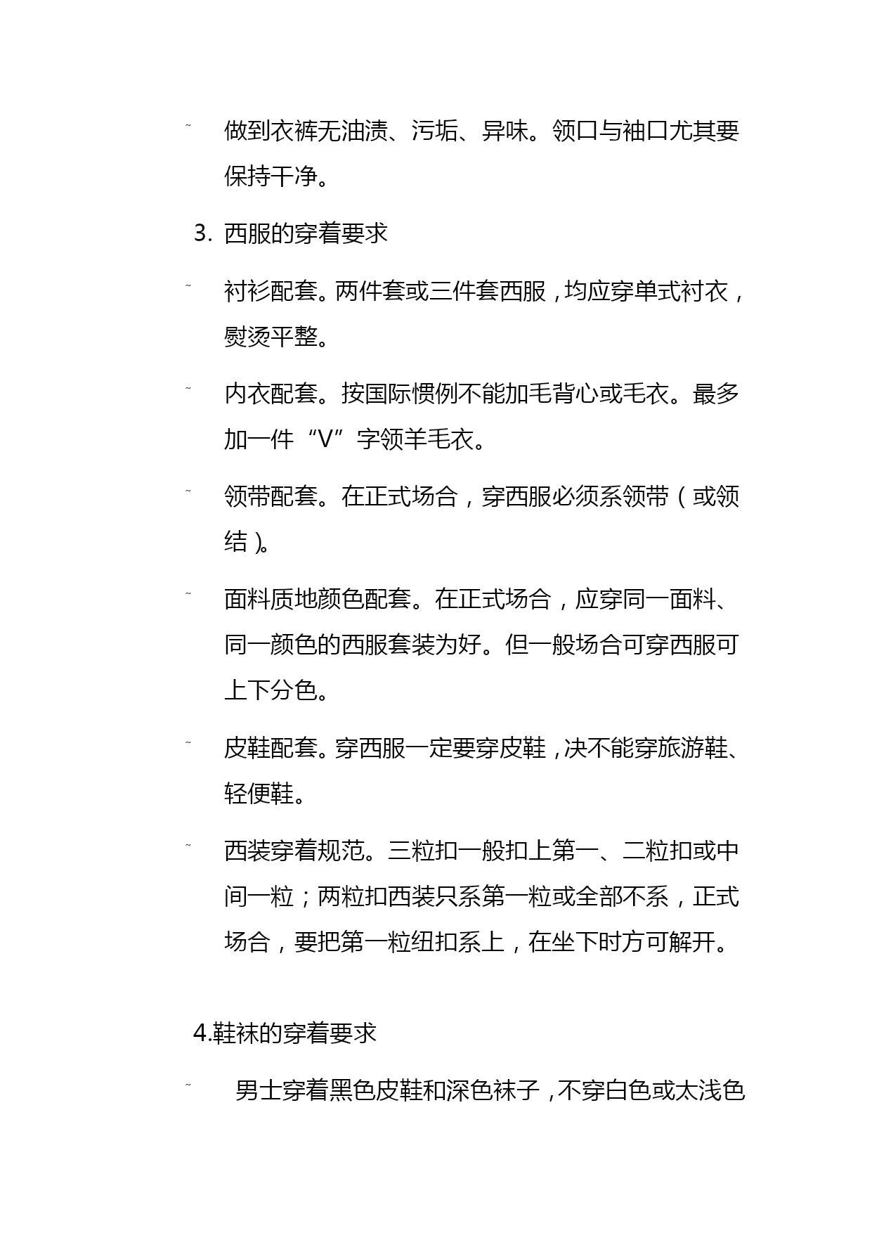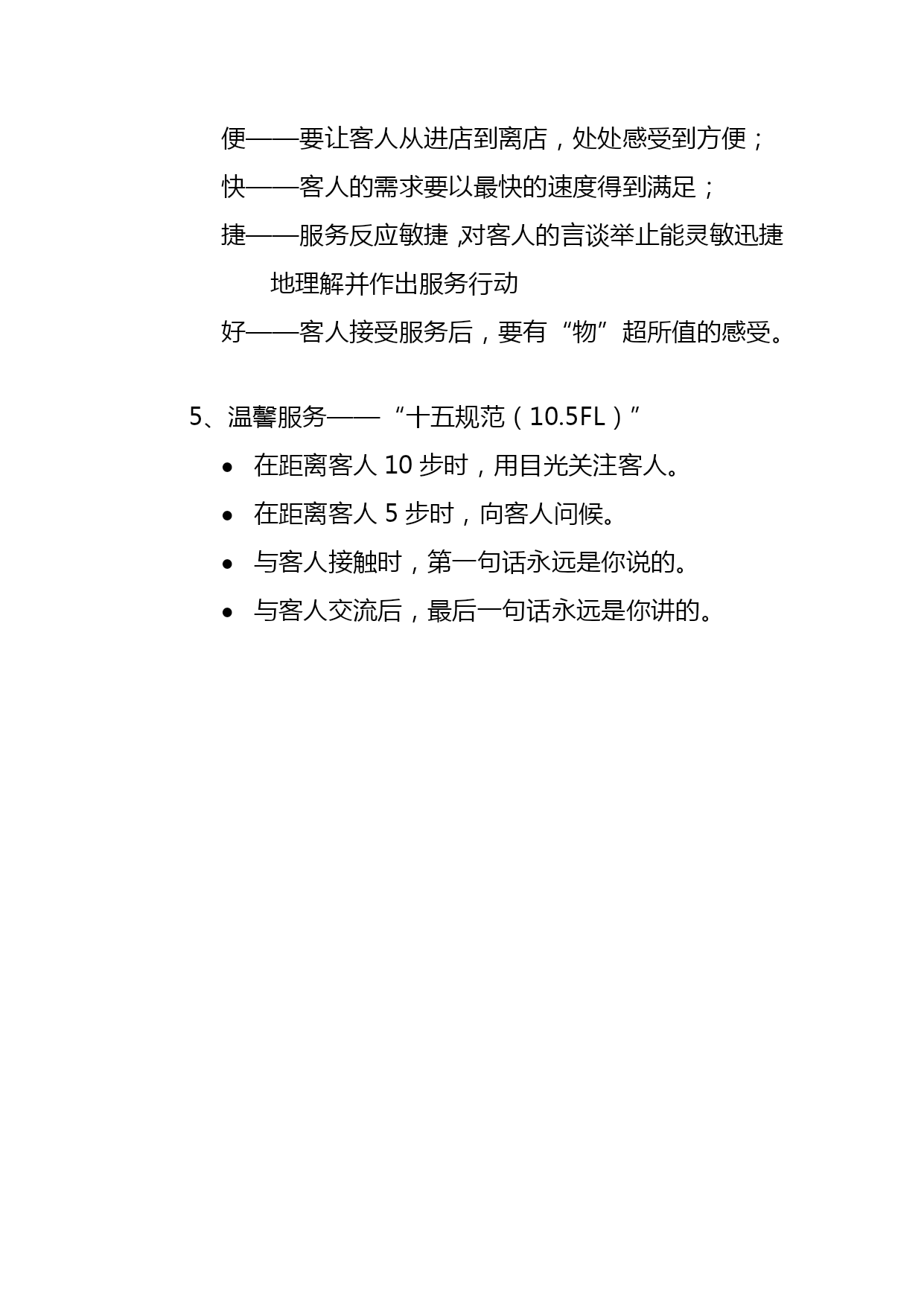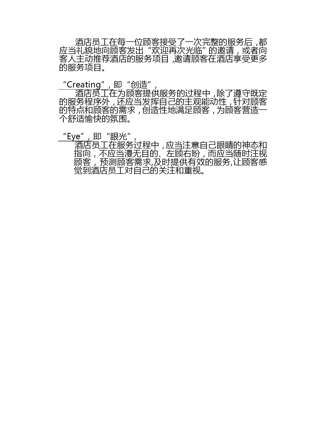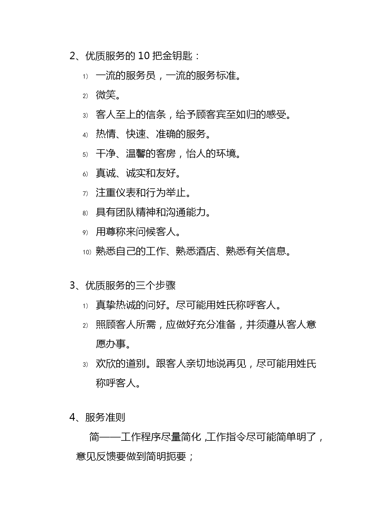 如家酒店连锁礼仪培训手册汇编(完整版)资料(可以直接使用,可编辑优秀版资料,欢迎下载)服务手册(礼仪)Policy&Procedure(courtesy)如家酒店连锁公司HomeInns&HotelsManagementCo.如家愿景:创建中国最著名的住宿业品牌!如家使命:用我们的专业知识和精心规划,使我们服务和产品的效益最高,从而为我们的客户提供“干净、温馨”经济型酒店产品;让我们的员工得到尊重,工作愉快,在“如家”而自豪;使得我们的业主能够获得稳定而有竞争力的投资回报;由此创造我们的“如家”品牌。指导思想:一个成功的酒店连锁组织的所有组织行为都是围绕着品牌形象展开的,良好的品牌形象是所有酒店连锁组织生存的基础。如家酒店连锁的目标是为顾客提供快捷简便、标准化、一致性的服务。为了保证酒店连锁品牌形象的良好性和一致性,如家酒店连锁公司制定了一套符合实际操作的标准的服务手册,指导和规范“如家快捷酒店”直营店和特许经营店的管理和服务。目录一、酒店服务理念………………………………………P.4二、酒店服务礼仪基本知识…………………………………P.6三、如家酒店接待服务礼仪……………………………………P.11四、如家酒店服务规范“十要、十不要”……………………P.19一、服务理念服务的概念服务的概念可以用英语SERVICE(服务)理解。“Smile”,即”微笑”,酒店员工在服务过程中应该带有真诚的微笑,表现出发自服务员内心的热情,是一种自然的,富有感情的,热情周到的服务.用一个真诚的微笑开始交谈,表达我们的热情款待和帮助,这是最好的方法.微笑是各国客人都理解的世界性欢迎性语言。“Excellent”,即“出色”,酒店员工不仅仅是一般的为顾客提供服务,而是要超出顾客的预想,在服务态度、服务标准、服务程序上要再现的非常出色。也就是超前服务。“Ready”,即“准备好”,在为顾客提供服务前就准备好物质、心理、技能等条件,随时准备好开展服务并能满足顾客的需求,娴熟地为顾客提供周到的服务。“Viewing”,即“看待”,酒店员工应将每一位顾客视为贵宾,重视客人提出的每一个要求,竭诚予以满足。“Inviting”,即“邀请”,酒店员工在每一位顾客接受了一次完整的服务后,都应当礼貌地向顾客发出“欢迎再次光临”的邀请,或者向客人主动推荐酒店的服务项目,邀请顾客在酒店享受更多的服务项目。“Creating”,即“创造”,酒店员工在为顾客提供服务的过程中,除了遵守既定的服务程序外,还应当发挥自己的主观能动性,针对顾客的特点和顾客的需求,创造性地满足顾客,为顾客营造一个舒适愉快的氛围。“Eye”,即“眼光”,酒店员工在服务过程中,应当注意自己眼睛的神态和指向,不应当漫无目的、左顾右盼,而应当随时注视顾客,预测顾客需求,及时提供有效的服务,让顾客感觉到酒店员工对自己的关注和重视。2、优质服务的10把金钥匙:一流的服务员,一流的服务标准。微笑。客人至上的信条,给予顾客宾至如归的感受。热情、快速、准确的服务。干净、温馨的客房,怡人的环境。真诚、诚实和友好。注重仪表和行为举止。具有团队精神和沟通能力。用尊称来问候客人。熟悉自己的工作、熟悉酒店、熟悉有关信息。3、优质服务的三个步骤真挚热诚的问好。尽可能用姓氏称呼客人。照顾客人所需,应做好充分准备,并须遵从客人意愿办事。欢欣的道别。跟客人亲切地说再见,尽可能用姓氏称呼客人。4、服务准则简——工作程序尽量简化,工作指令尽可能简单明了,意见反馈要做到简明扼要;便——要让客人从进店到离店,处处感受到方便;快——客人的需求要以最快的速度得到满足;捷——服务反应敏捷,对客人的言谈举止能灵敏迅捷地理解并作出服务行动好——客人接受服务后,要有“物”超所值的感受。5、温馨服务——“十五规范(10.5FL)”在距离客人10步时,用目光关注客人。在距离客人5步时,向客人问候。与客人接触时,第一句话永远是你说的。与客人交流后,最后一句话永远是你讲的。二、酒店服务礼仪的基本知识礼泛指社会交往中的礼貌礼节。礼貌是人与人之间在接触交往中相互表示敬重和友好的行为准则,它体现了人们的文化层次和文明程度;礼节是在交际场合中,相互问候、致意、祝愿、慰问以及给予必要的协助与照顾的惯用形式。礼仪是一个复合词,包括“礼”和“仪”两部分。凡为表示敬意或隆重举行的仪式,均称做礼仪。(一)服饰仪容礼仪仪表是人的外表,包括容貌、姿态、个人卫生和服饰,仪表仪容是一个人的精神面貌的外观体现。良好的仪表仪容是酒店接待人